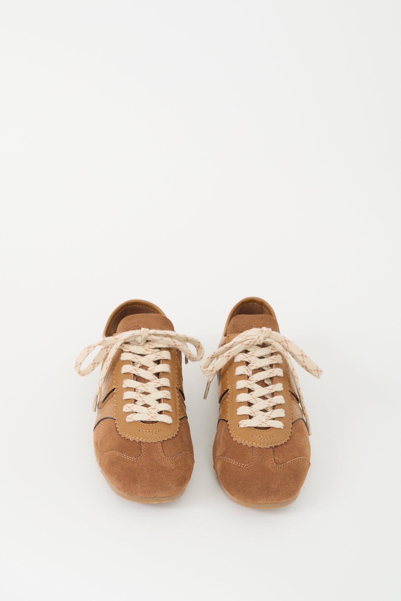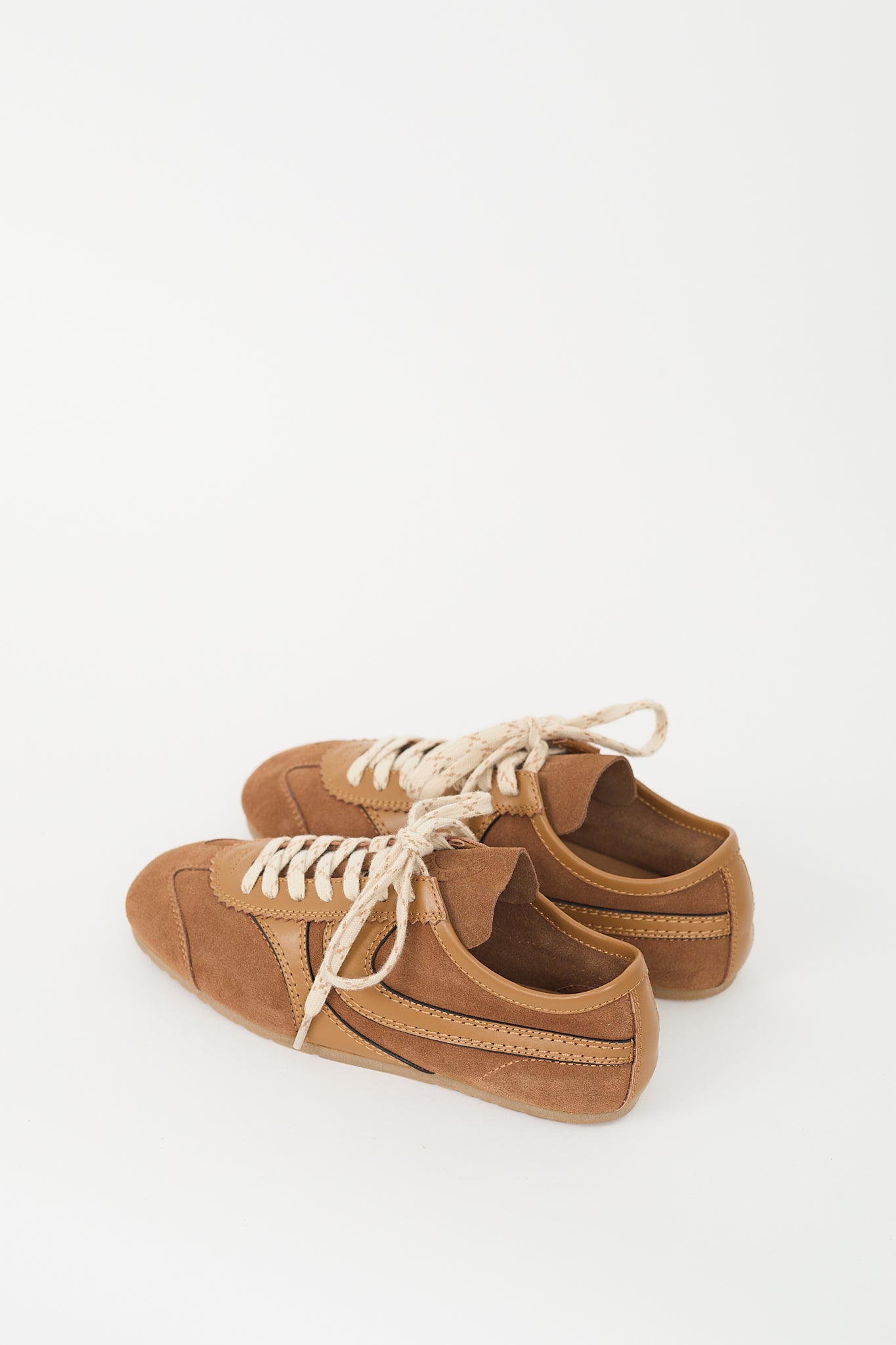 Pre-owned Dries Van Noten brown sneakers featuring rounded square toe, suede upper, leather panelling at sides, cream lace up front, debossed logo at tongue, and thin treaded outsole.
