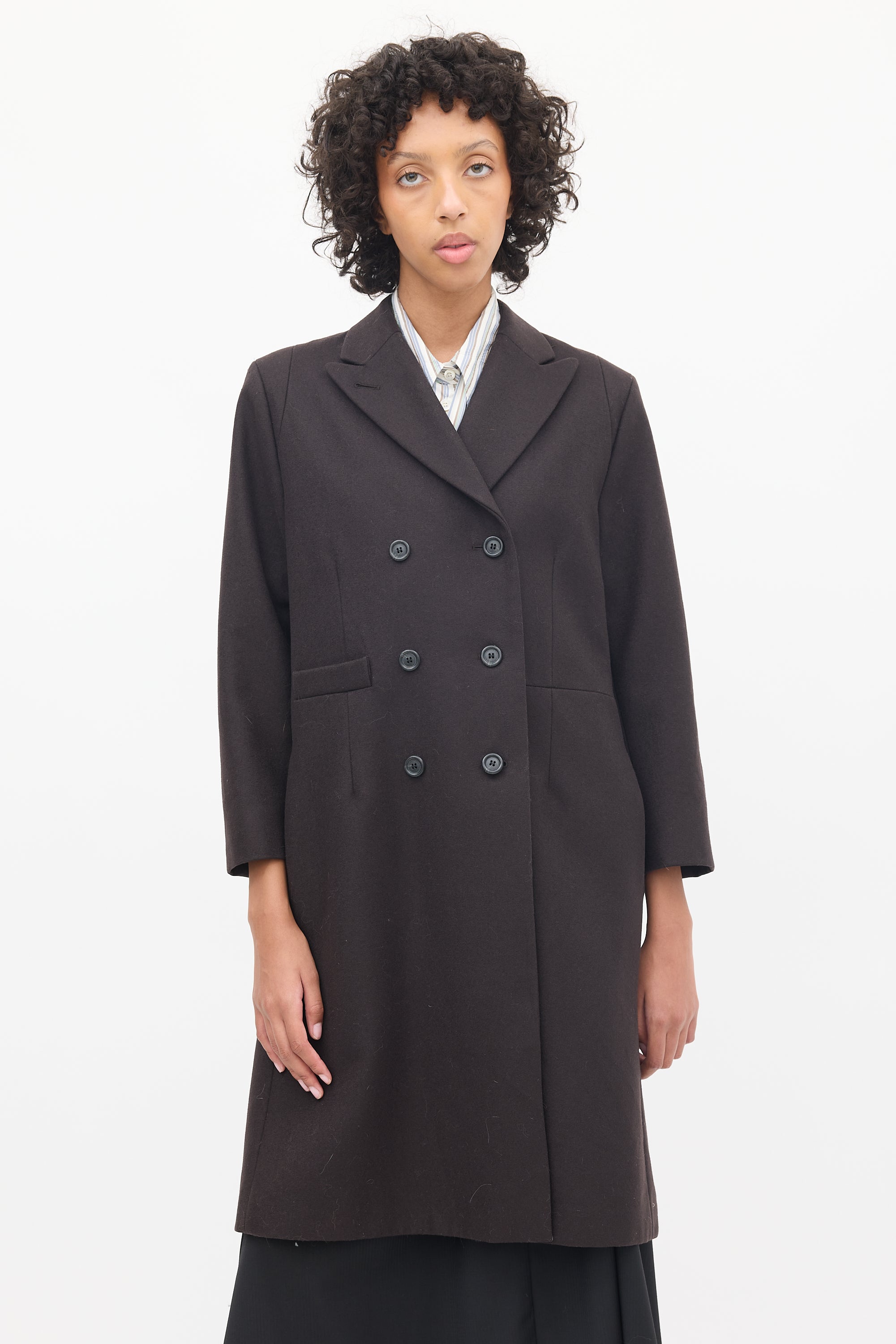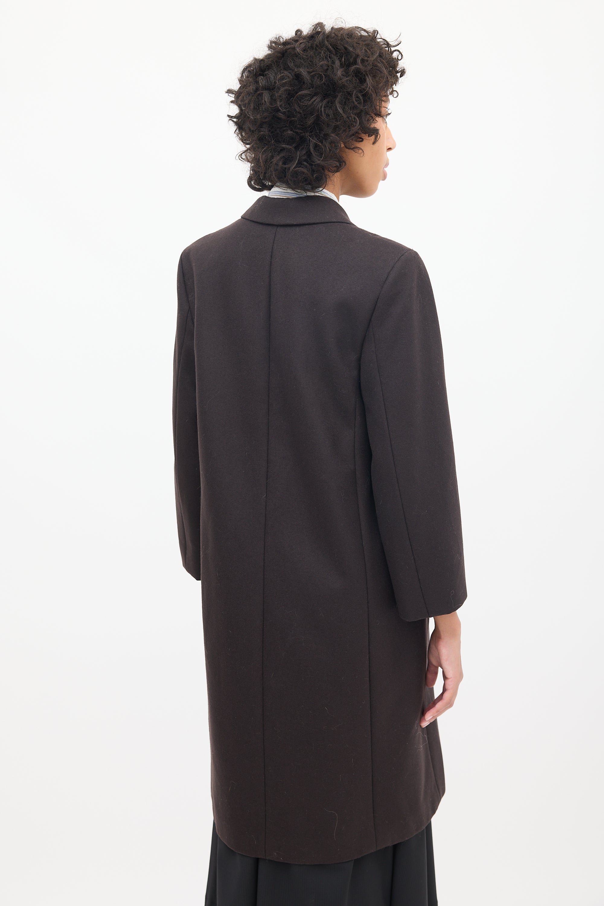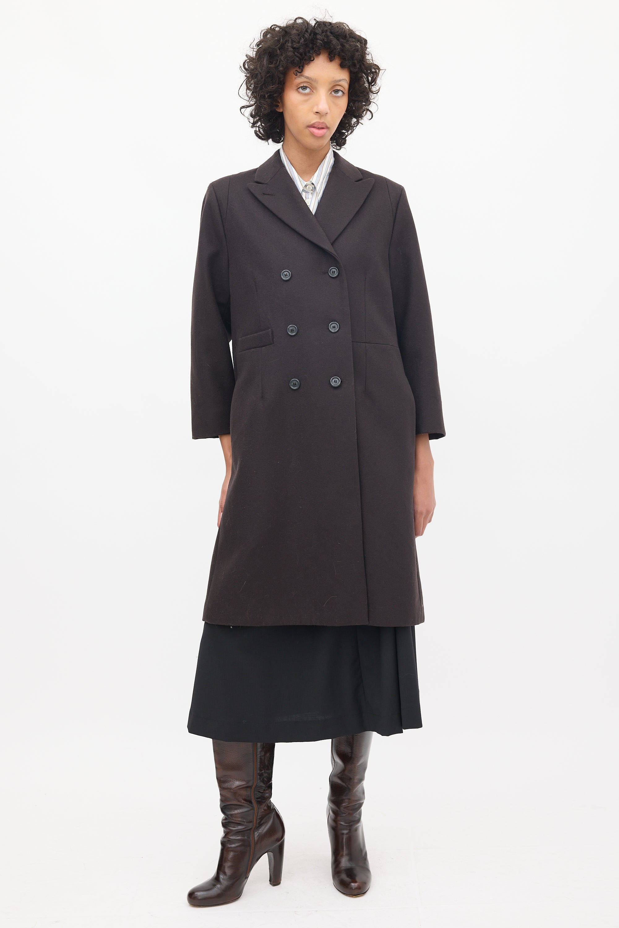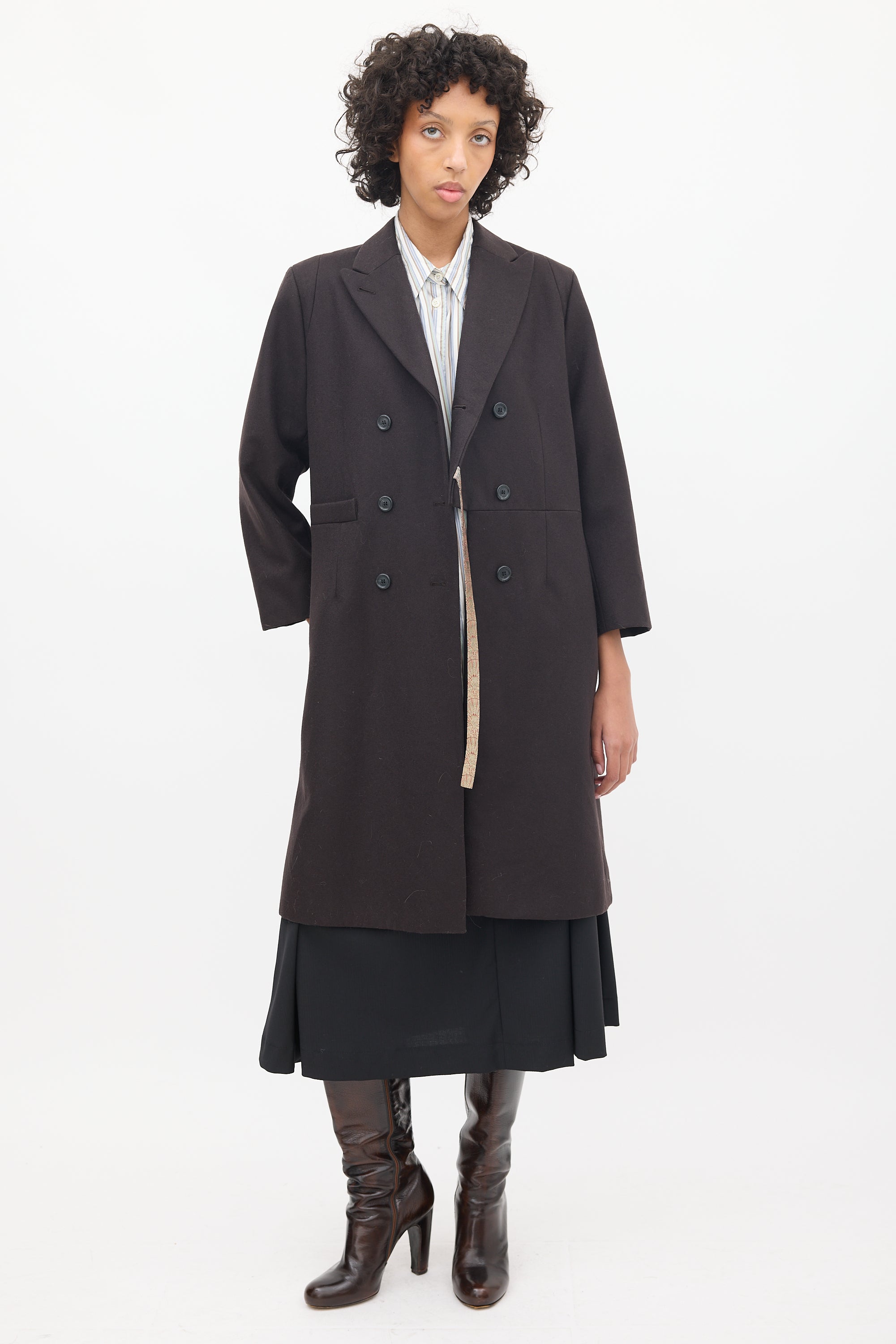 Pre-owned Dries Van Noten brown wool coat featuring a peak lapel, double breasted button up front, slip pocket at right waist, in seam pockets, interior tie waist, even hem, padded shoulders, and long sleeves. Lined.
