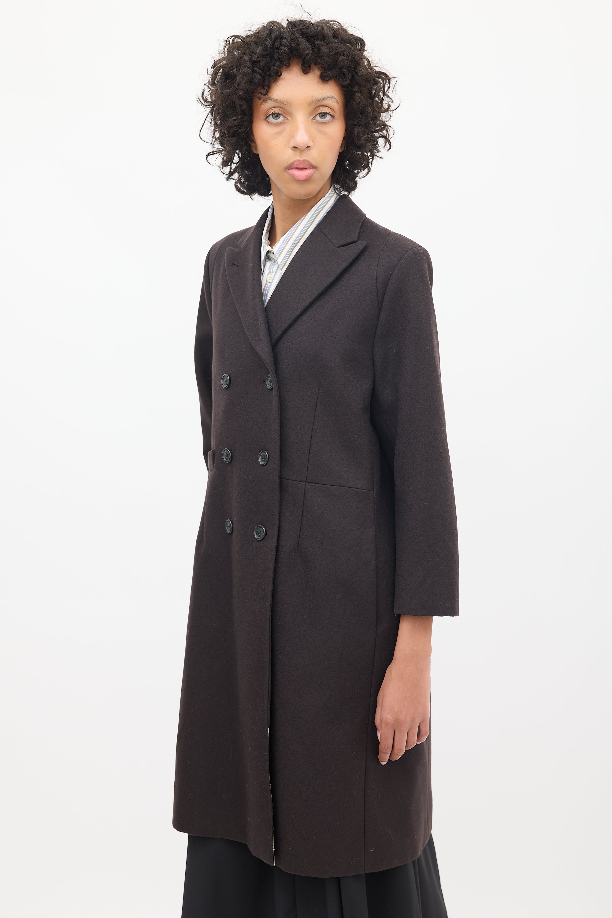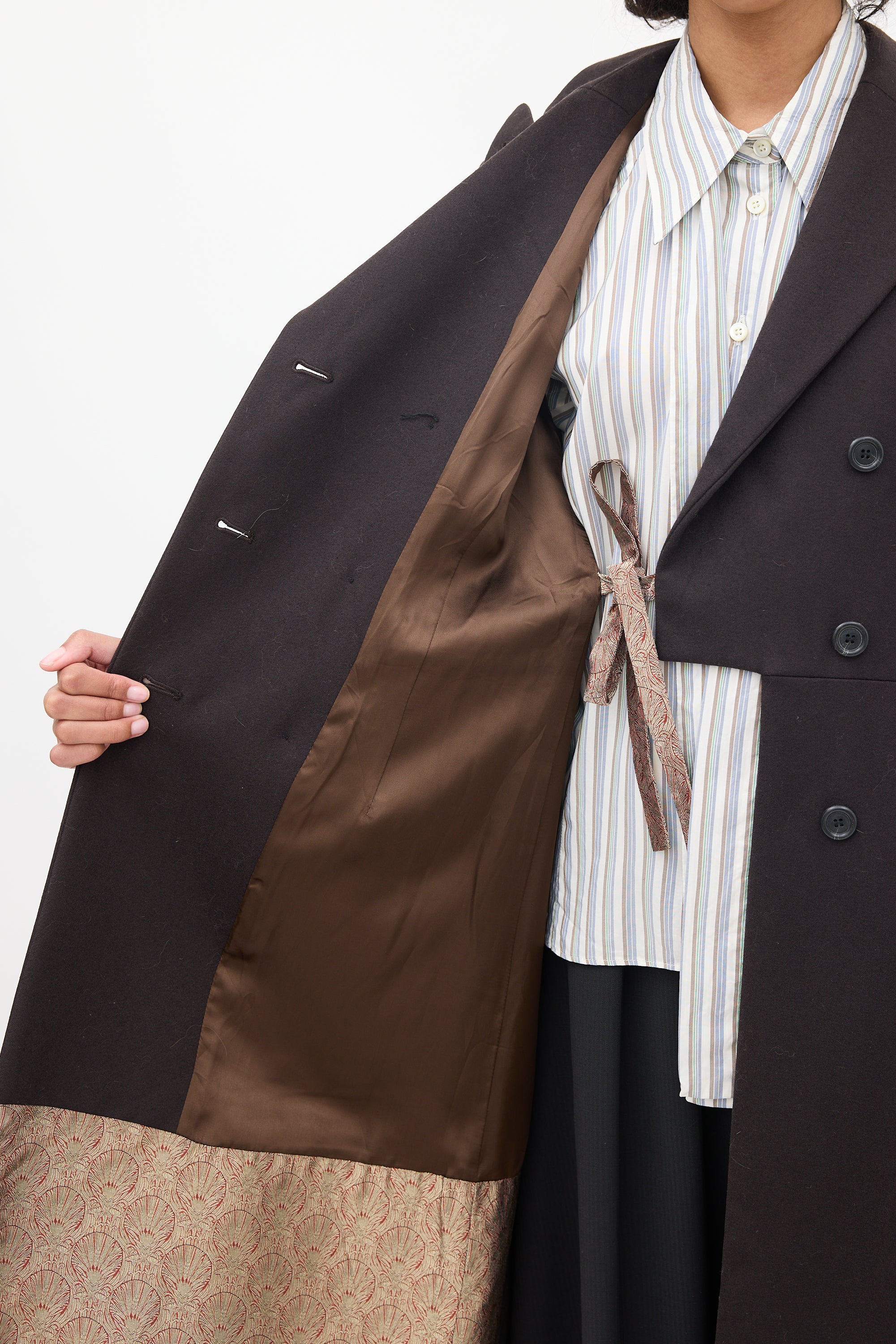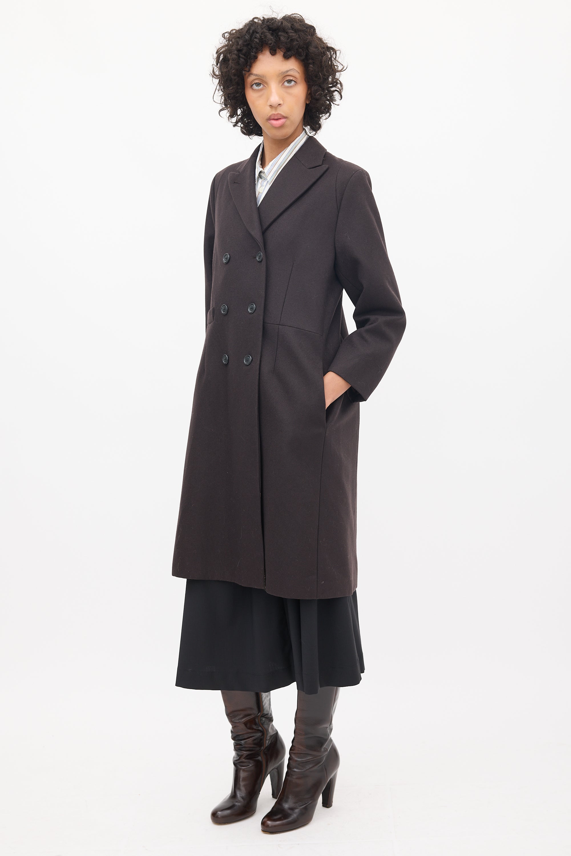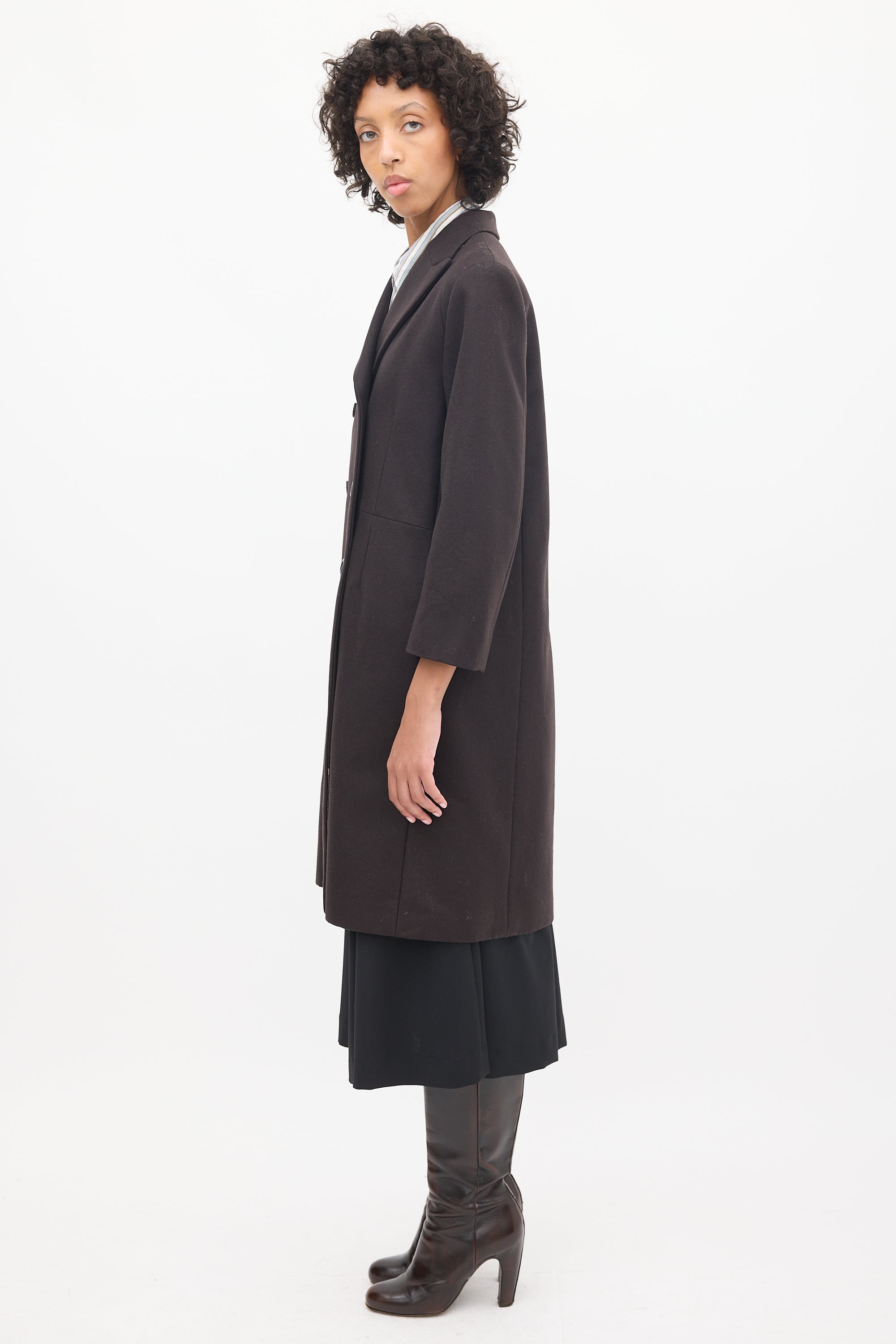 Pre-owned Dries Van Noten brown wool coat featuring a peak lapel, double breasted button up front, slip pocket at right waist, in seam pockets, interior tie waist, even hem, padded shoulders, and long sleeves. Lined.