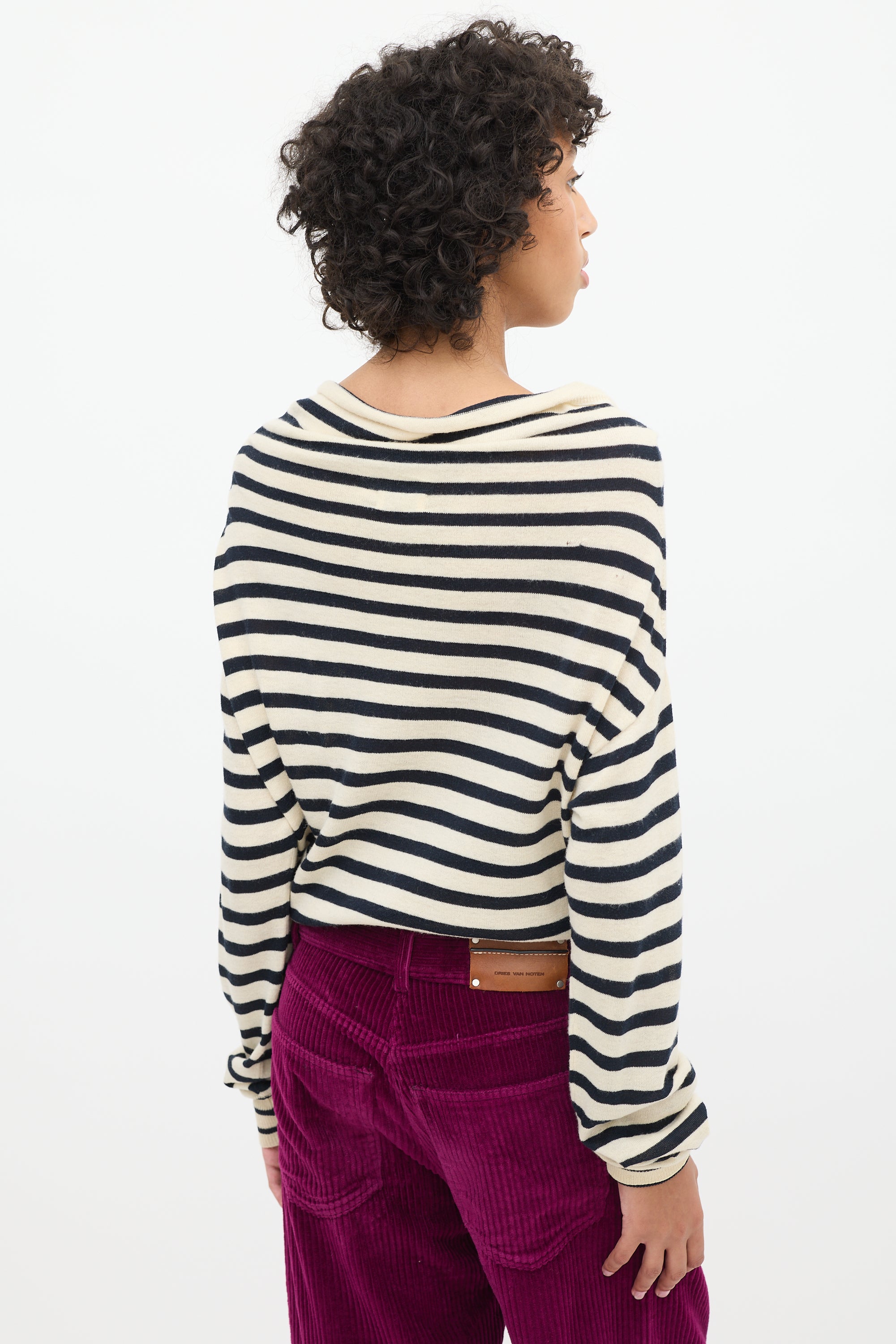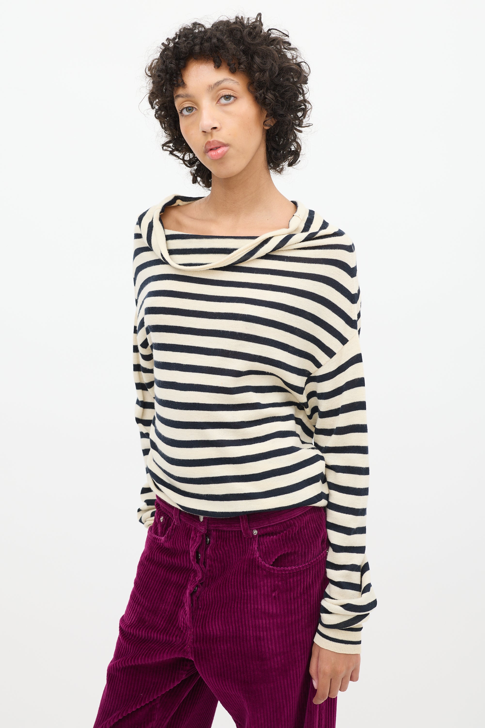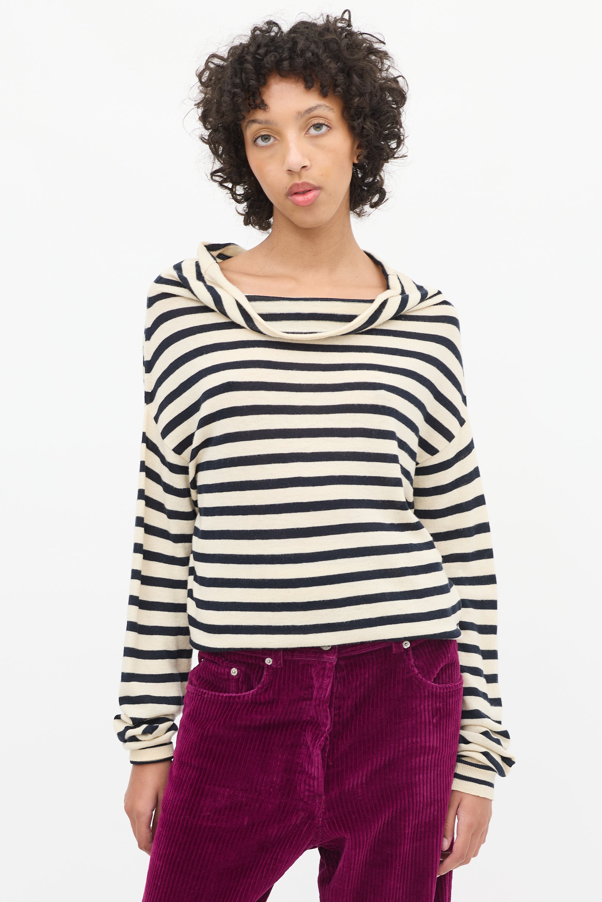 Pre-owned Dries Van Noten cream and black wool blend top featuring a cowl neck, horizontal stripes throughout, long sleeves, and ribbing at hem and cuffs.