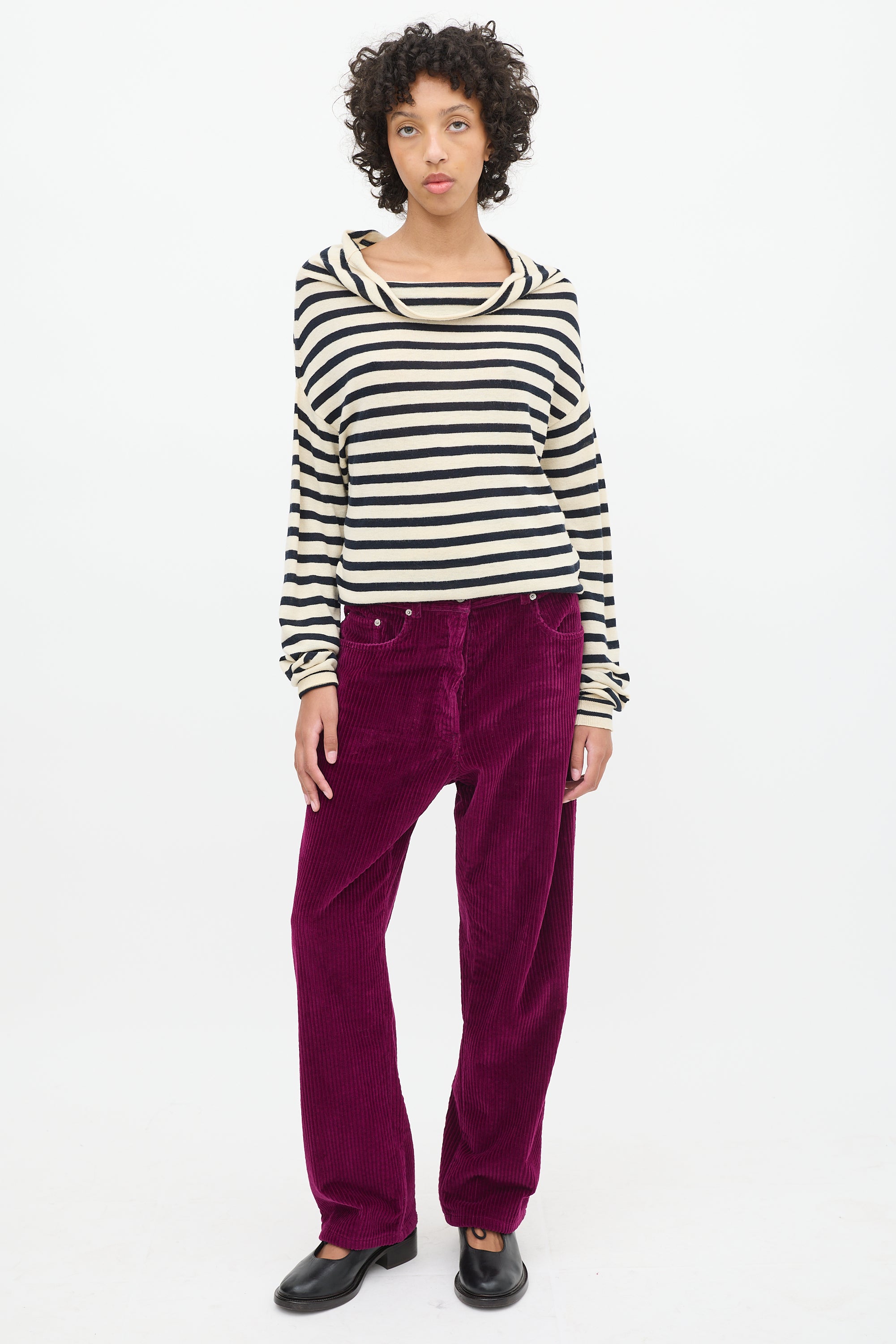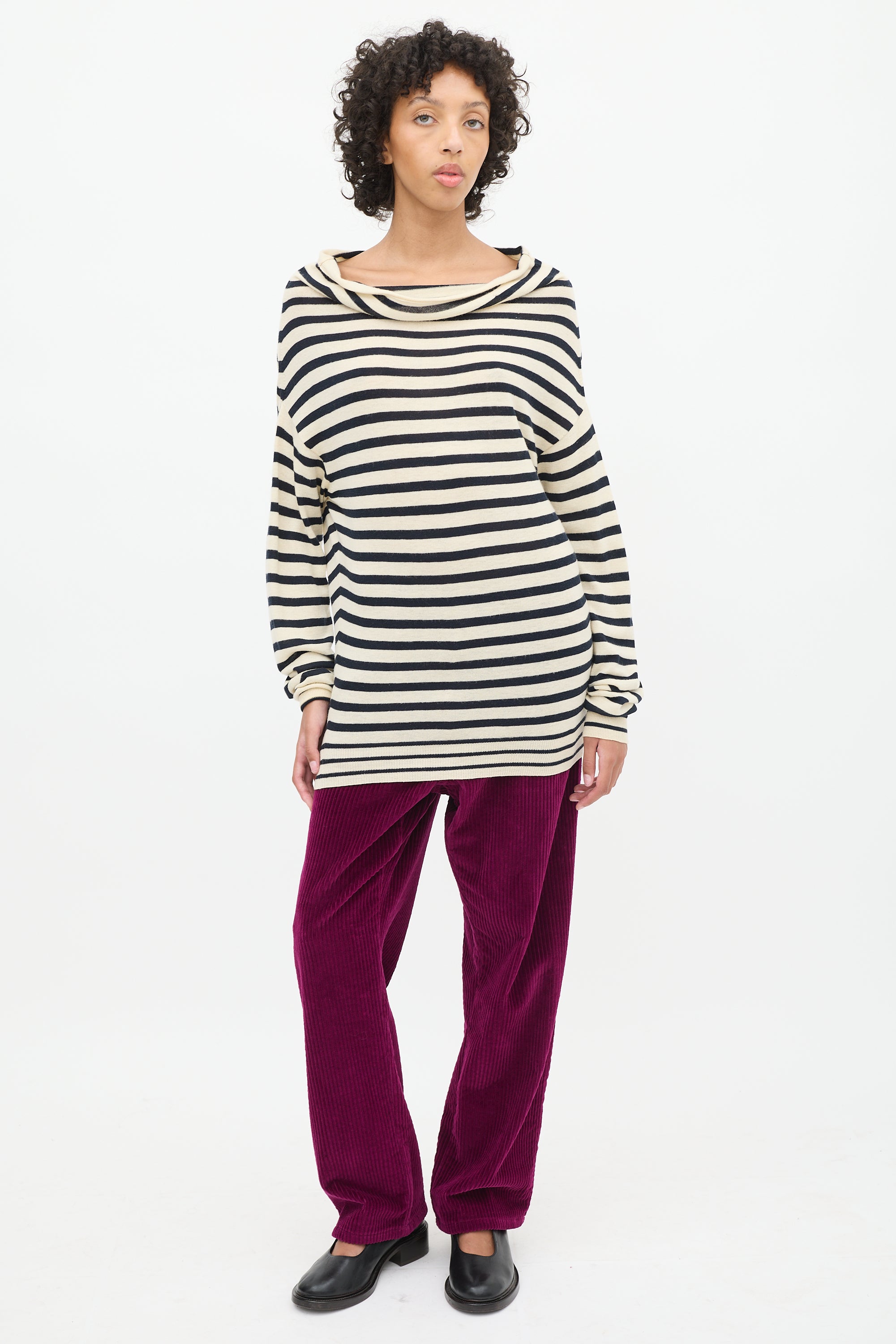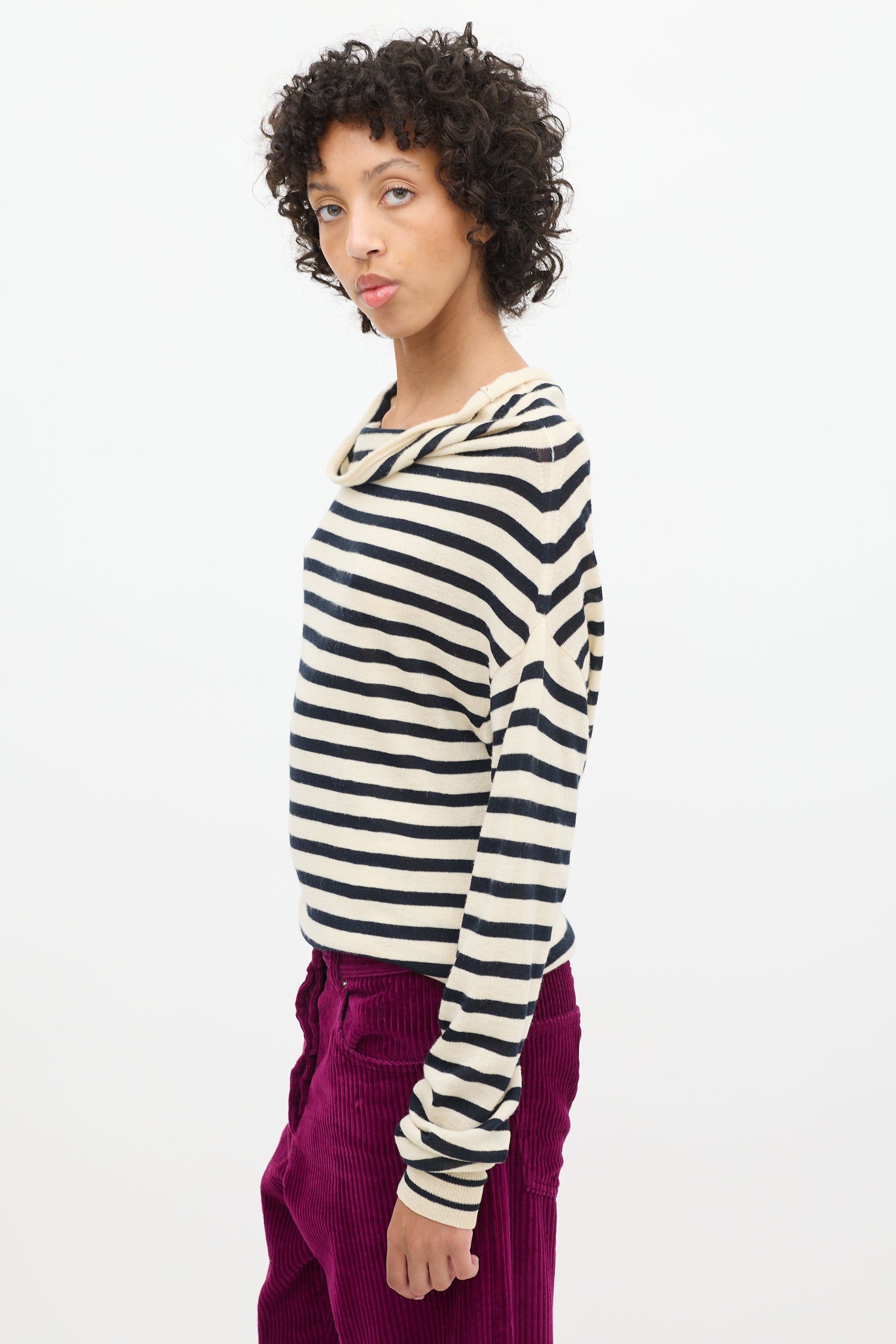 Pre-owned Dries Van Noten cream and black wool blend top featuring a cowl neck, horizontal stripes throughout, long sleeves, and ribbing at hem and cuffs.