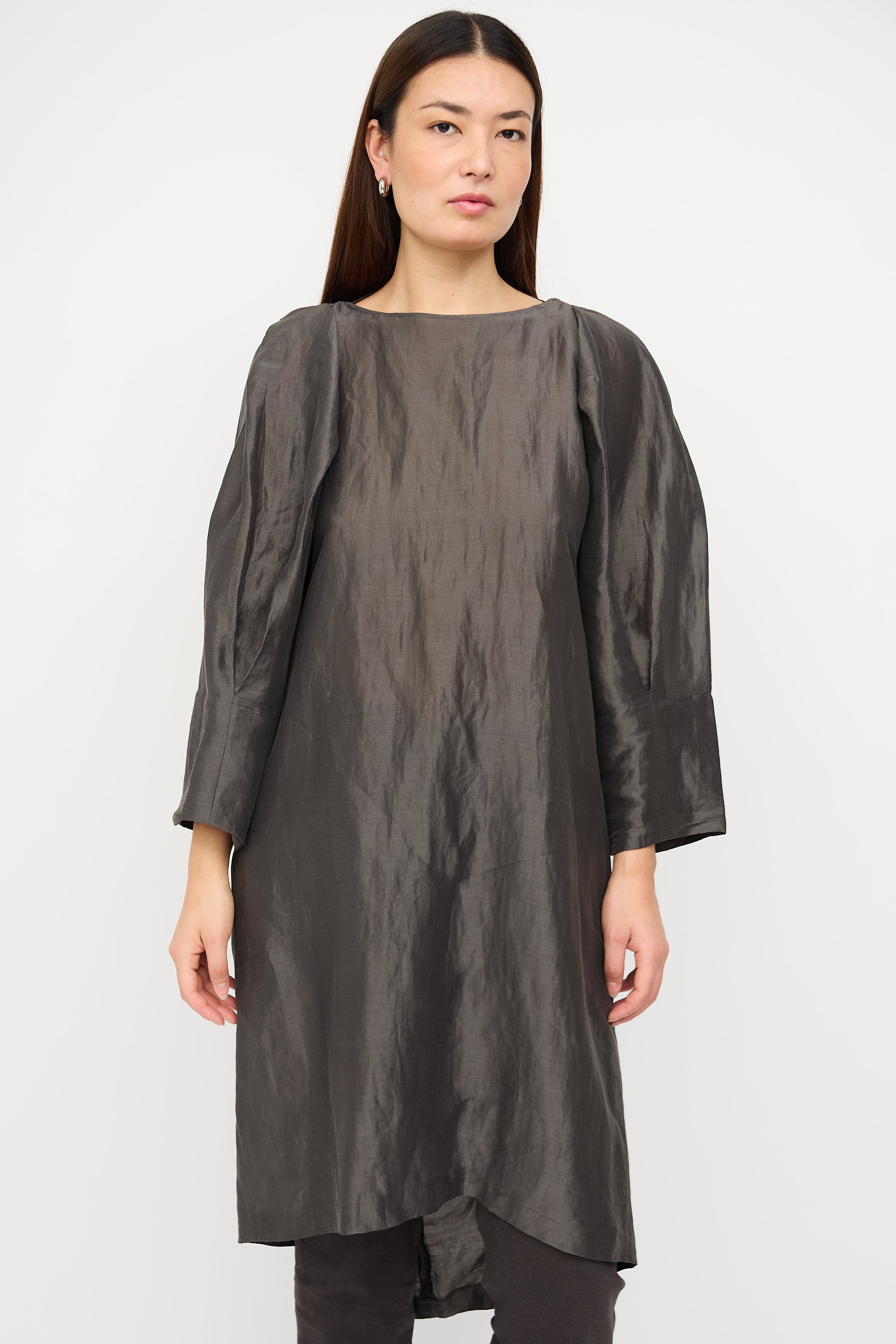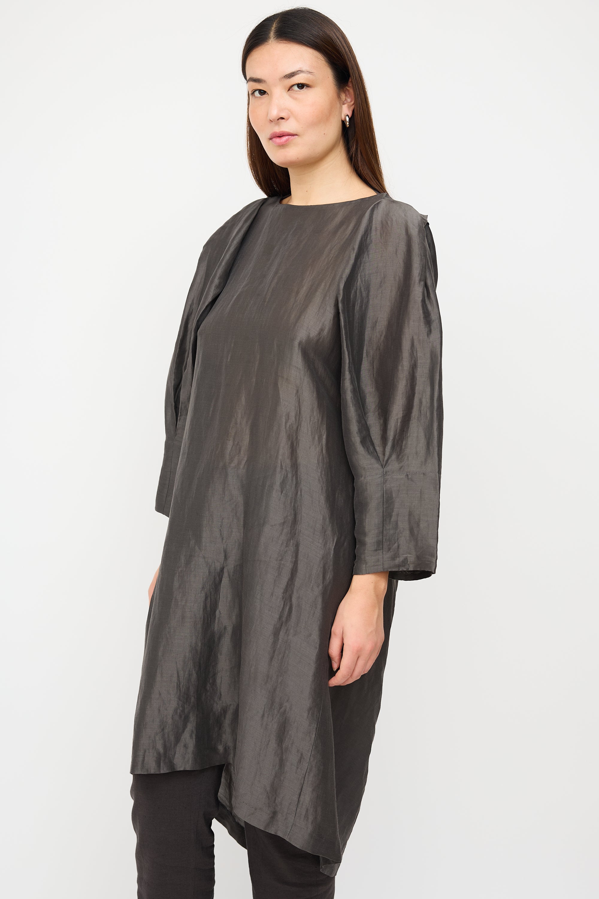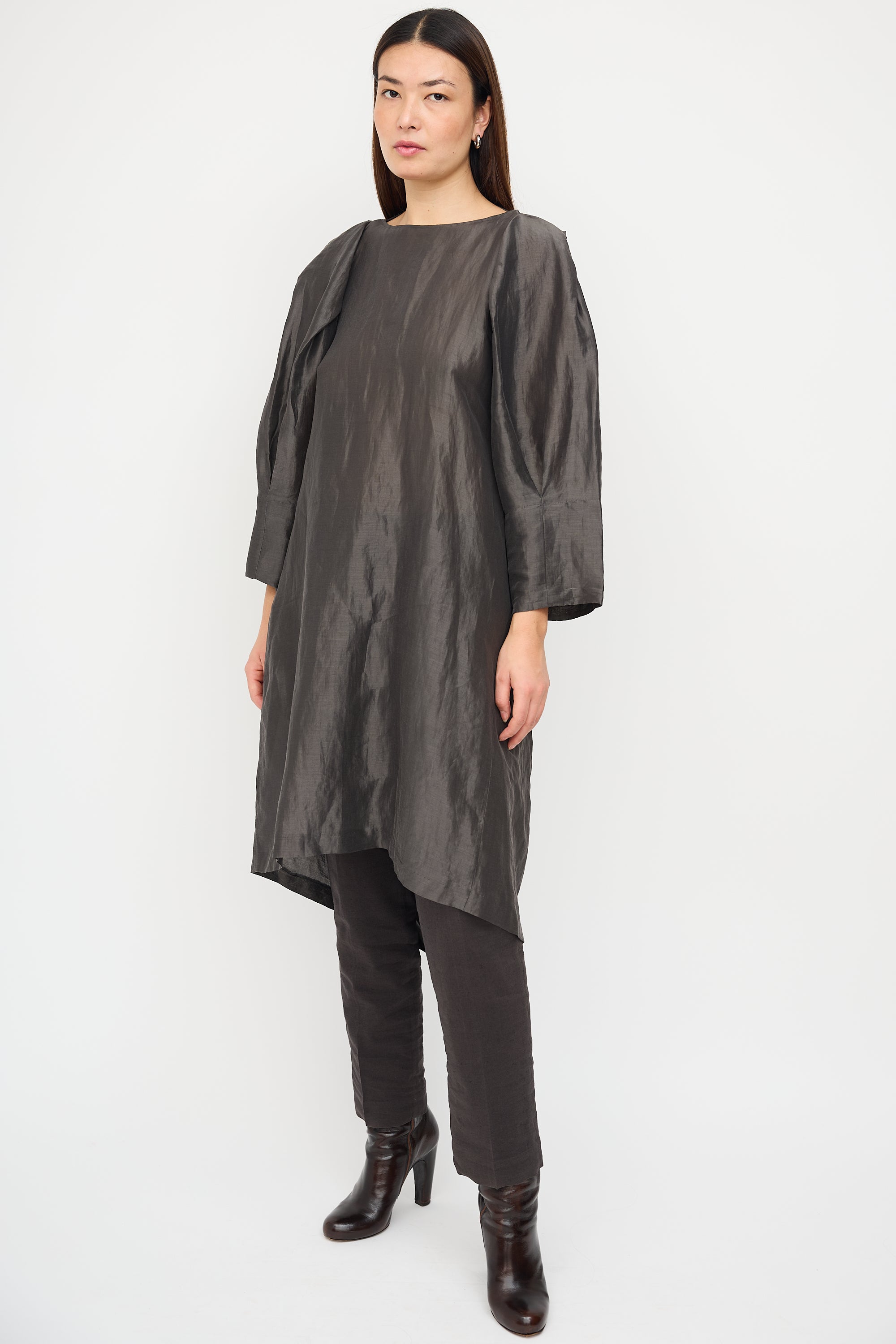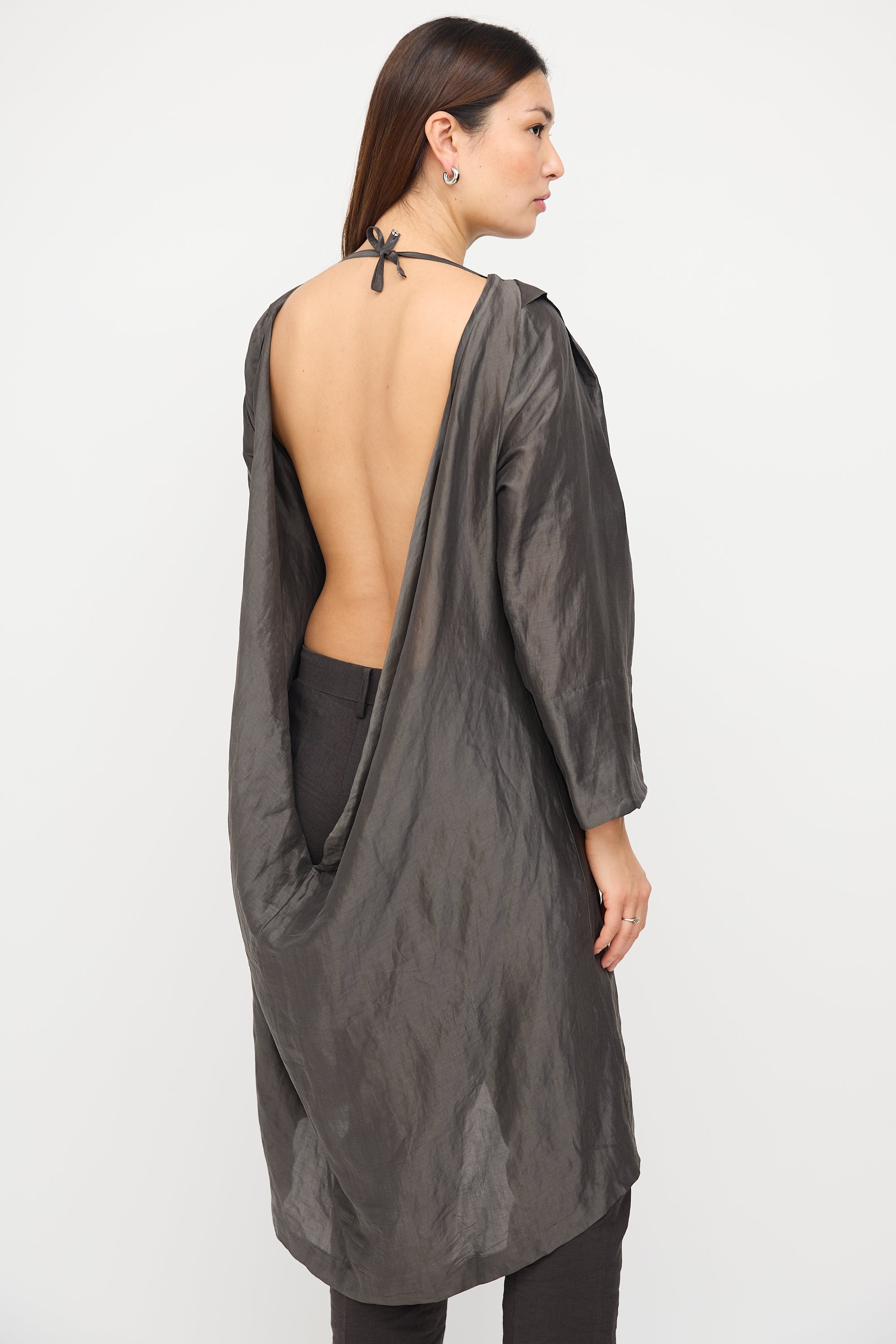 Pre-owned Dries Van Noten dark grey ramie and silk blend midi dress featuring a round neckline, open back with top tie fastening, high low hem, and long lantern sleeves. Unlined.