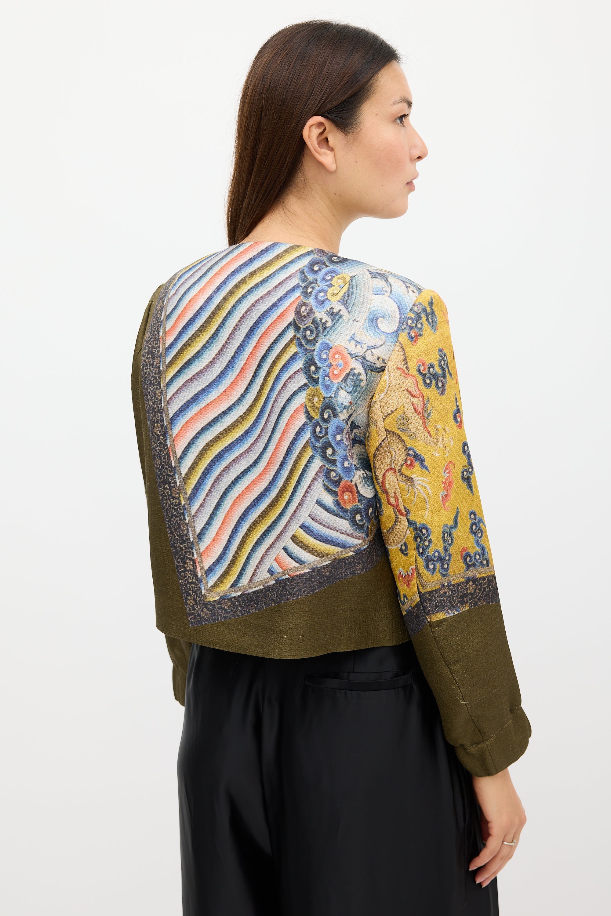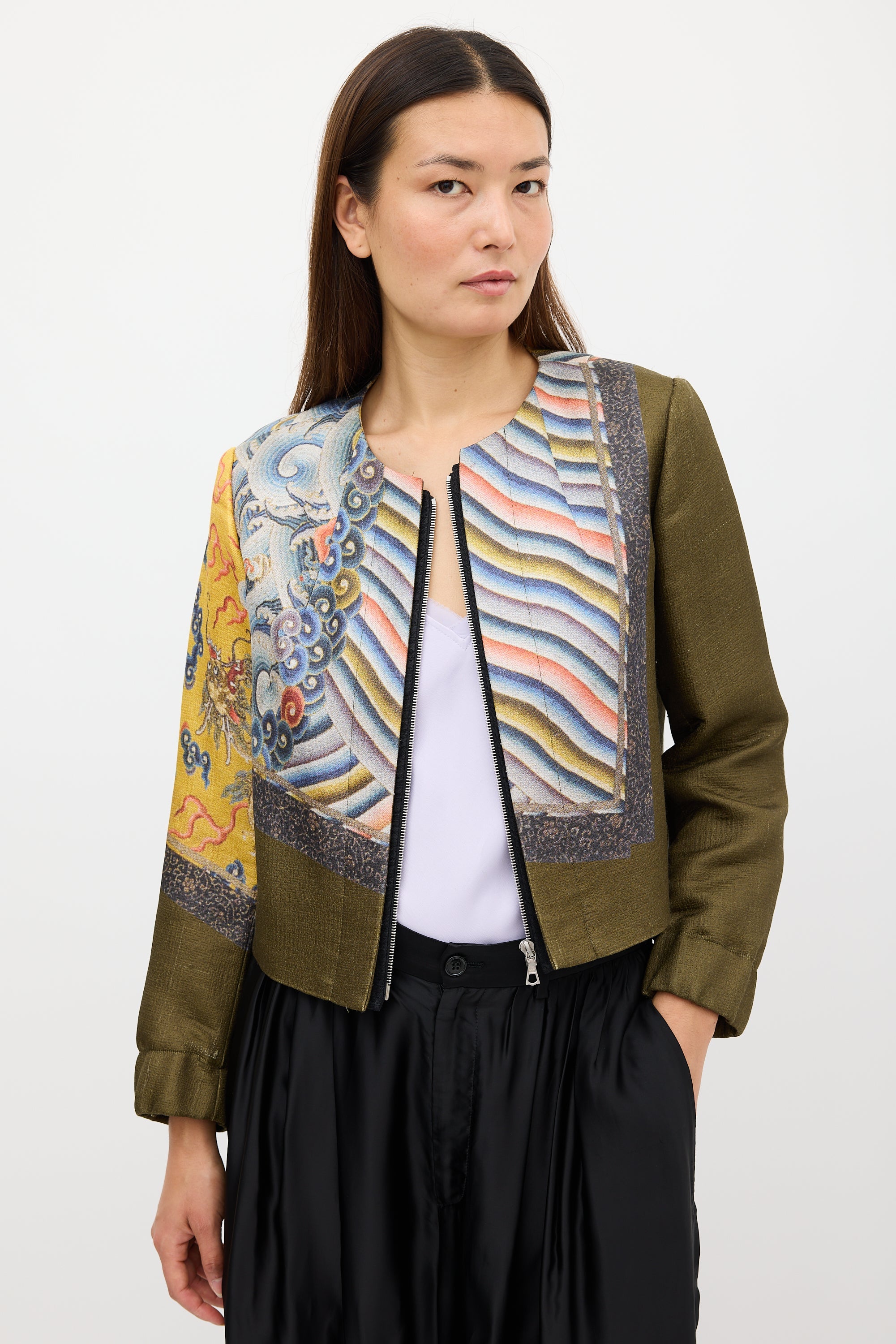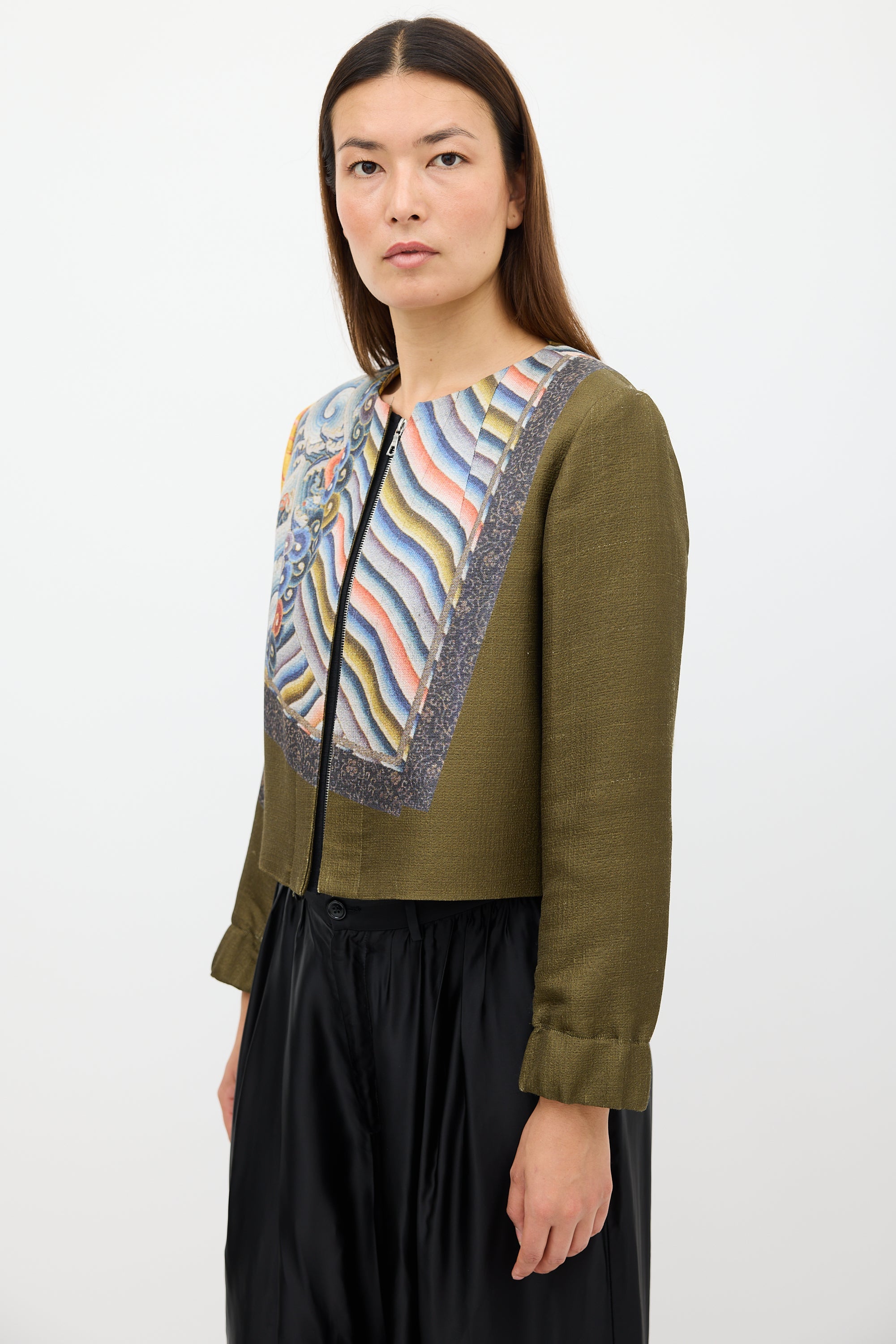 Pre-owned Dries Van Noten Fall 2012 green and multicolour silk jacket featuring round neckline, batik print, zip up front, and elasticized cuffs. Lined.