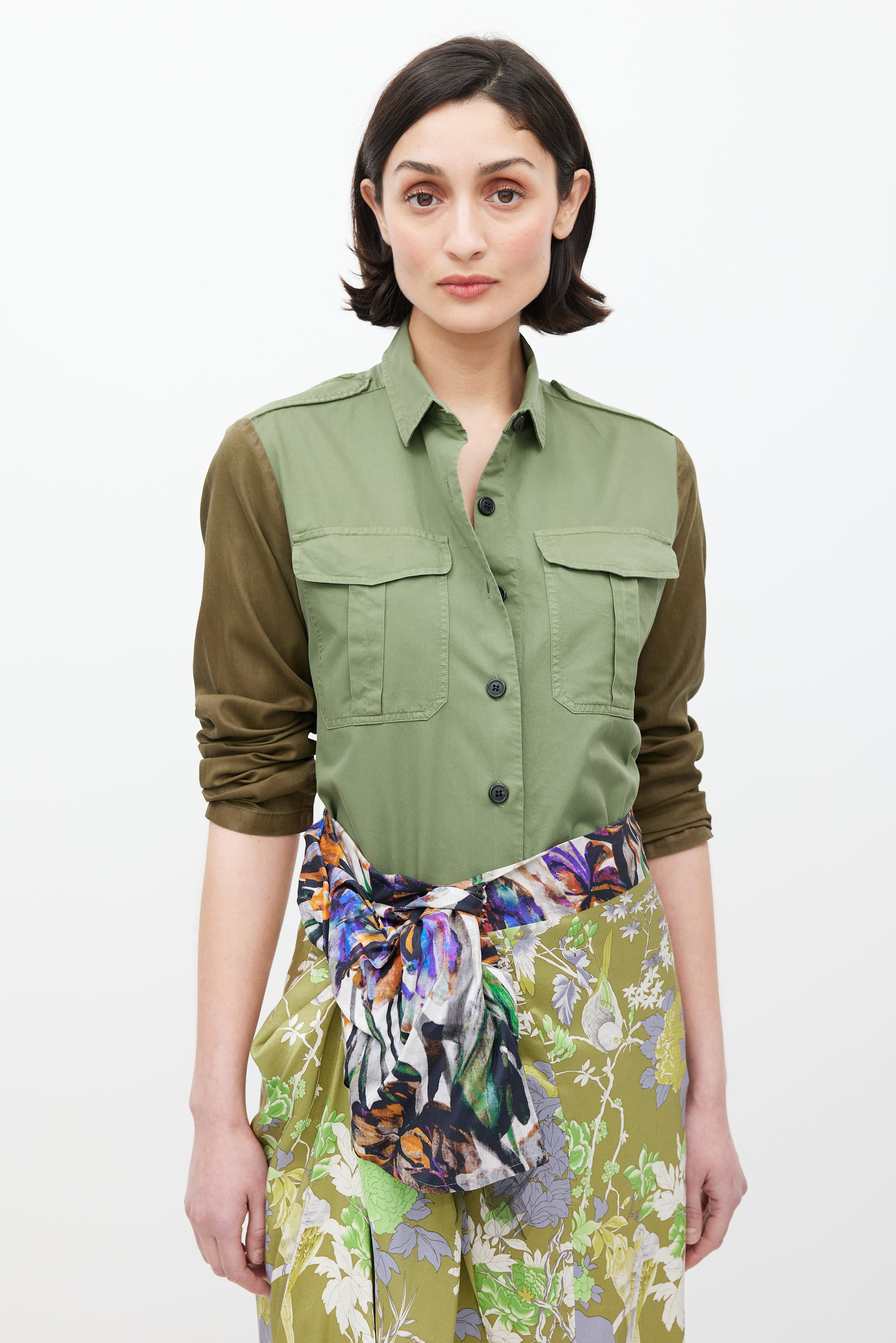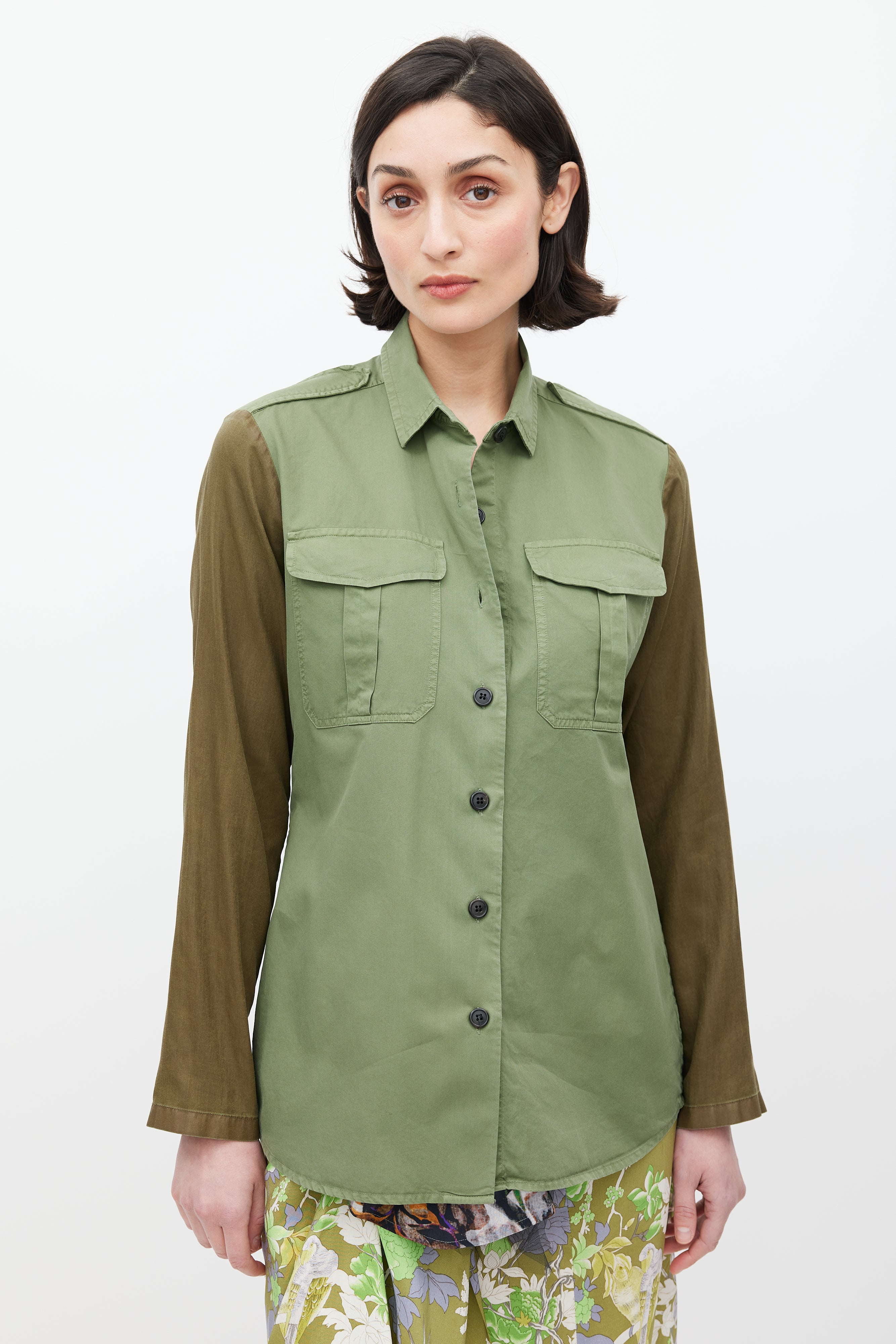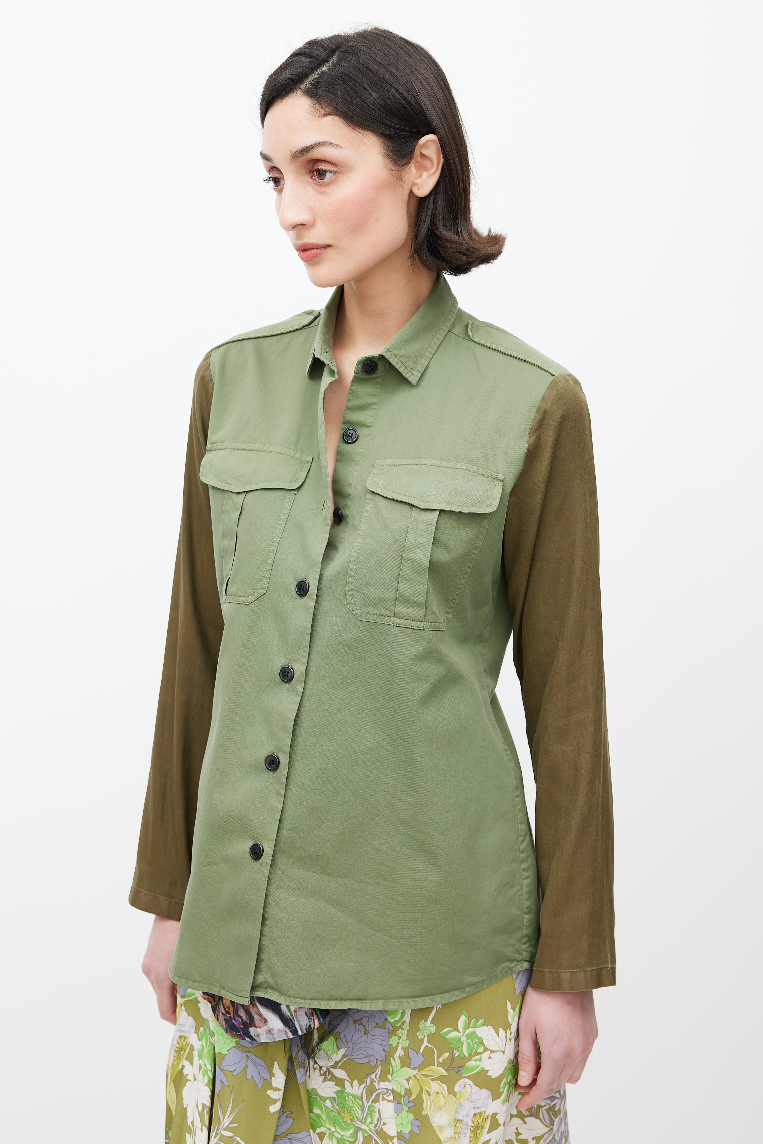 Pre-owned Dries Van Noten green shirt featuring a pointed collar, epaulettes at shoulder, two cargo pockets at chest, long sleeves with buttoned cuffs, and button up closure.