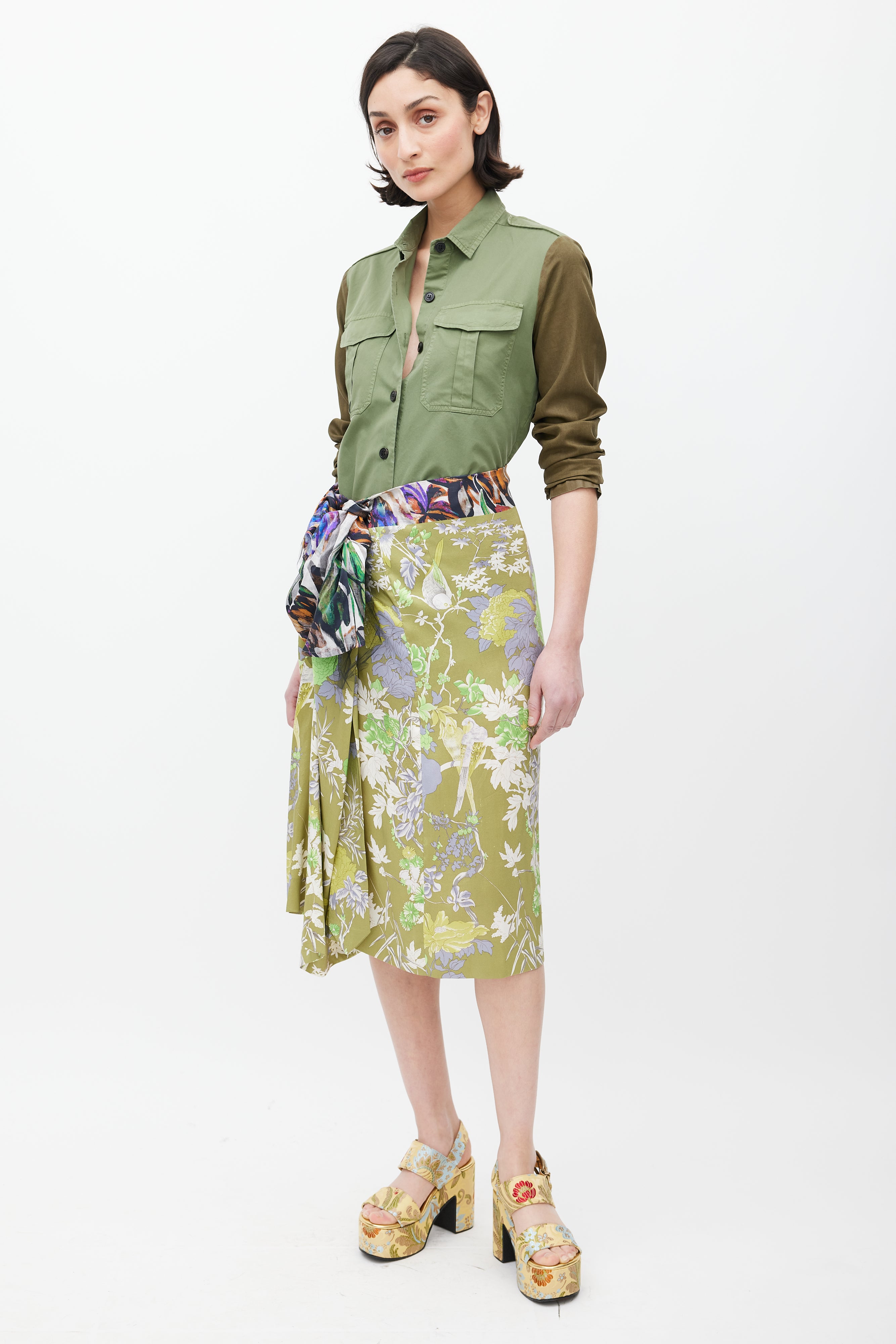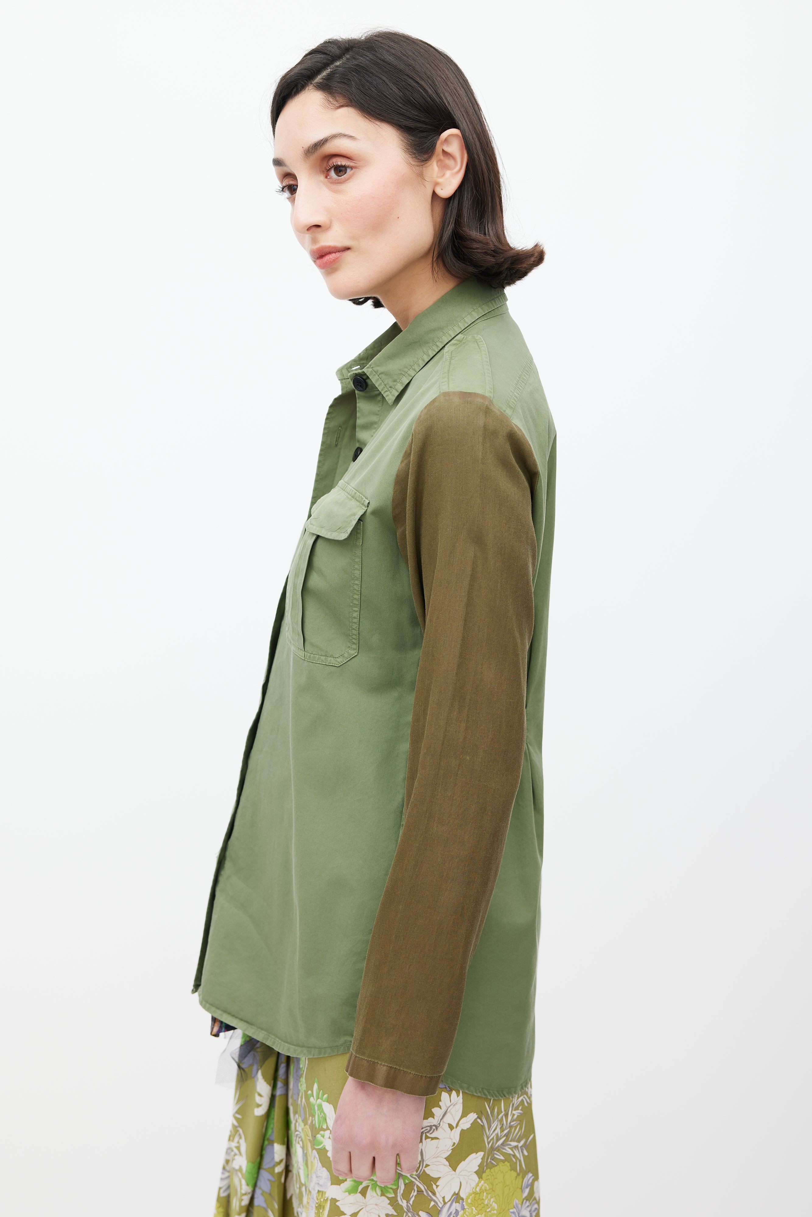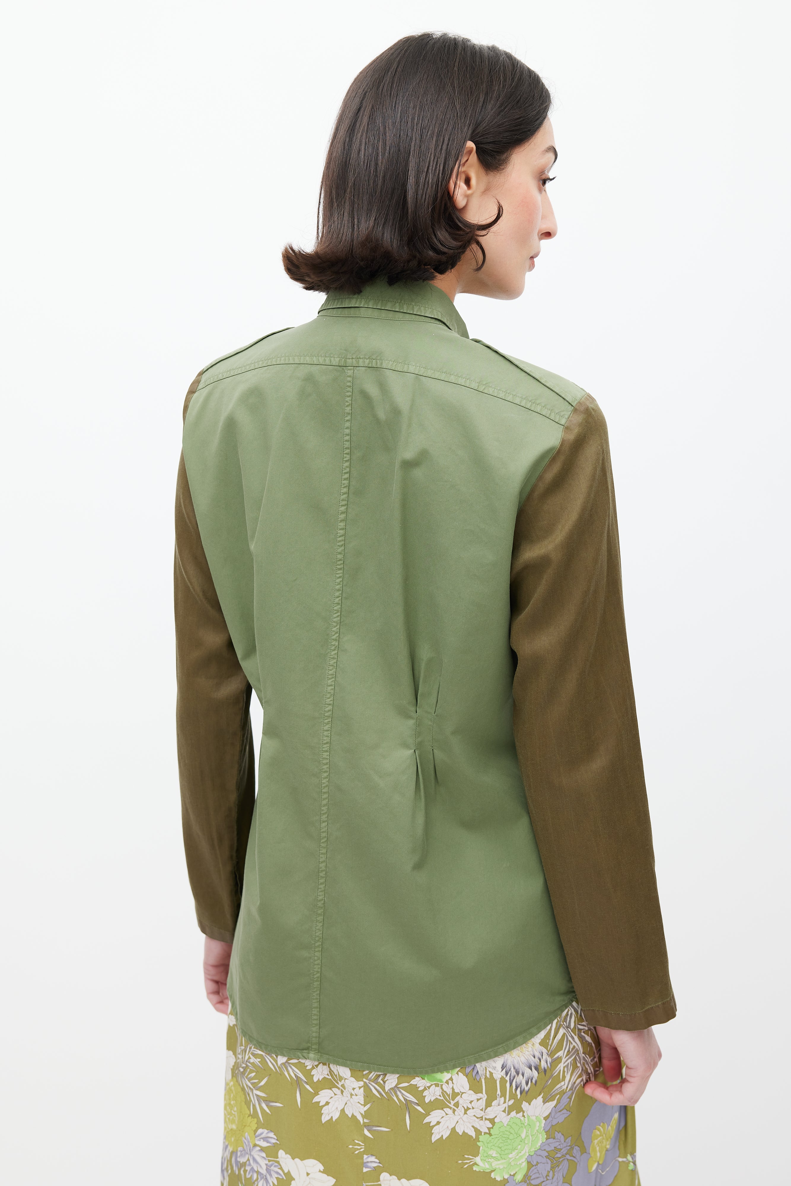 Pre-owned Dries Van Noten green shirt featuring a pointed collar, epaulettes at shoulder, two cargo pockets at chest, long sleeves with buttoned cuffs, and button up closure.