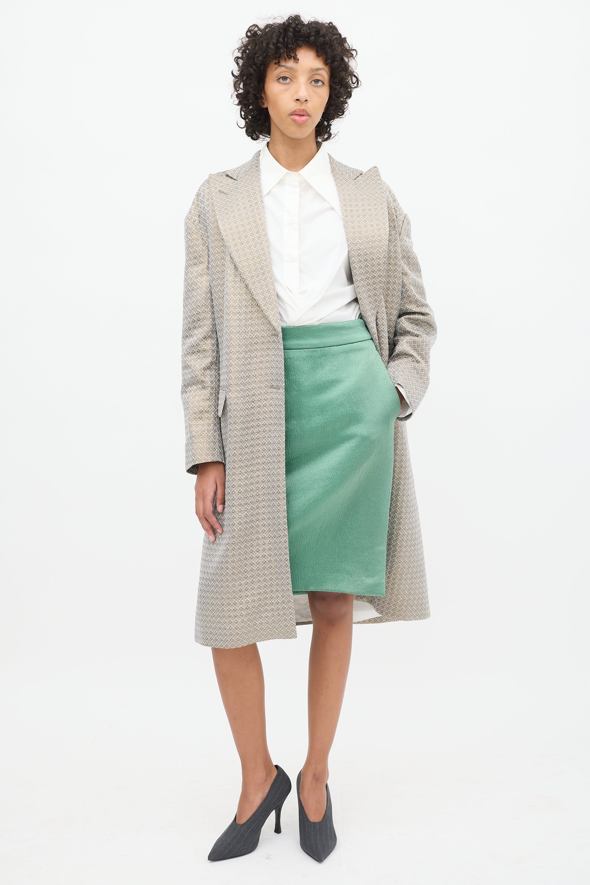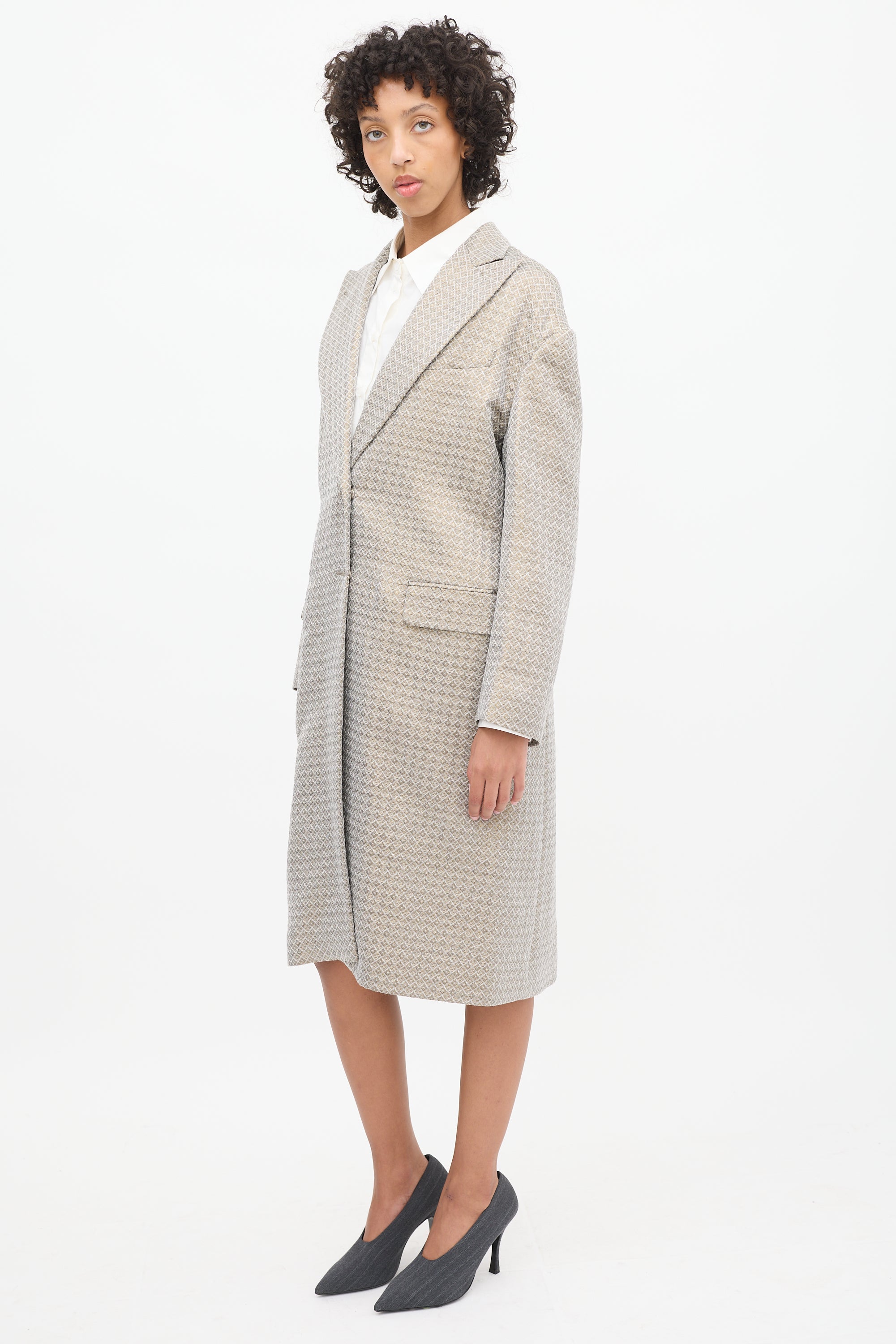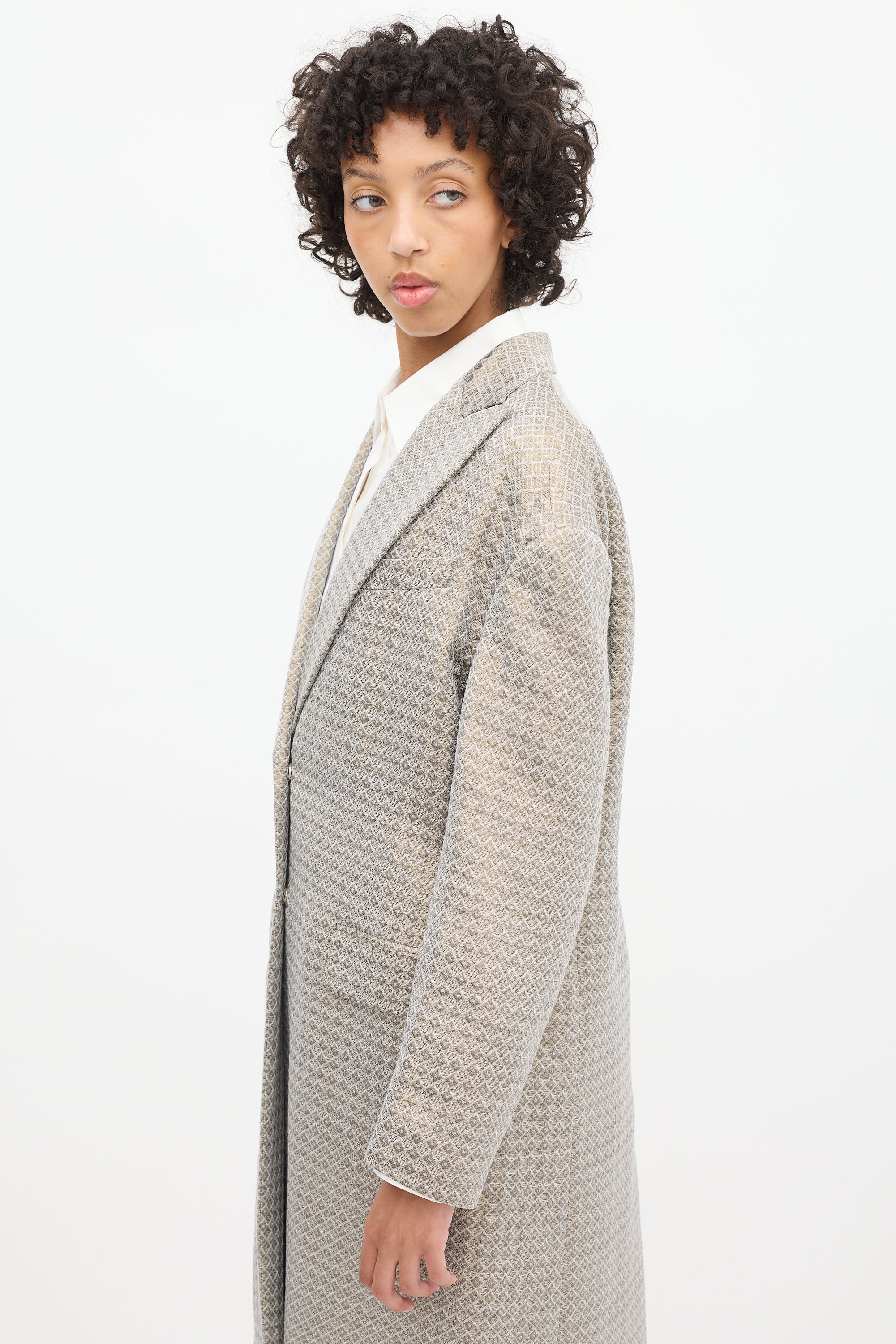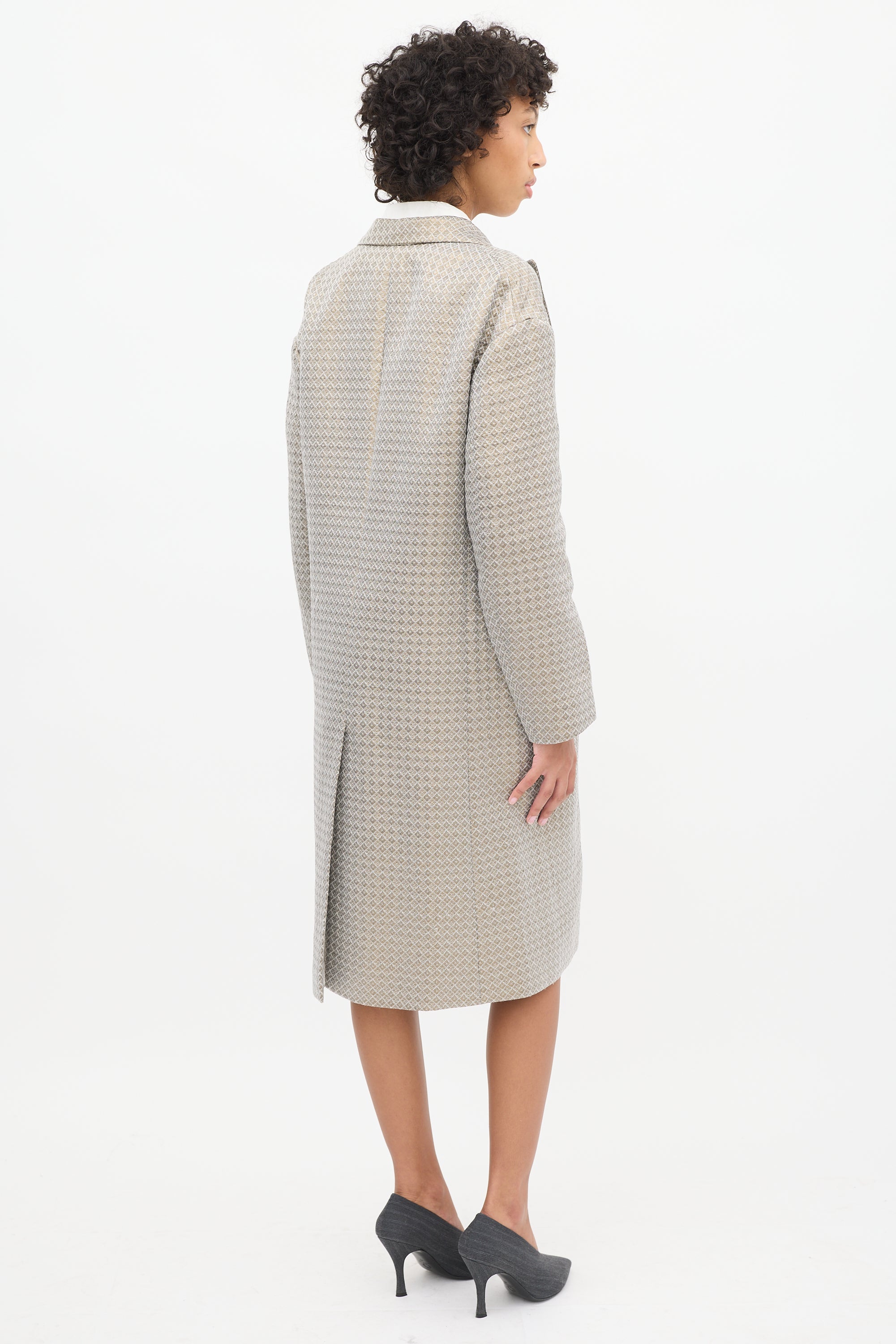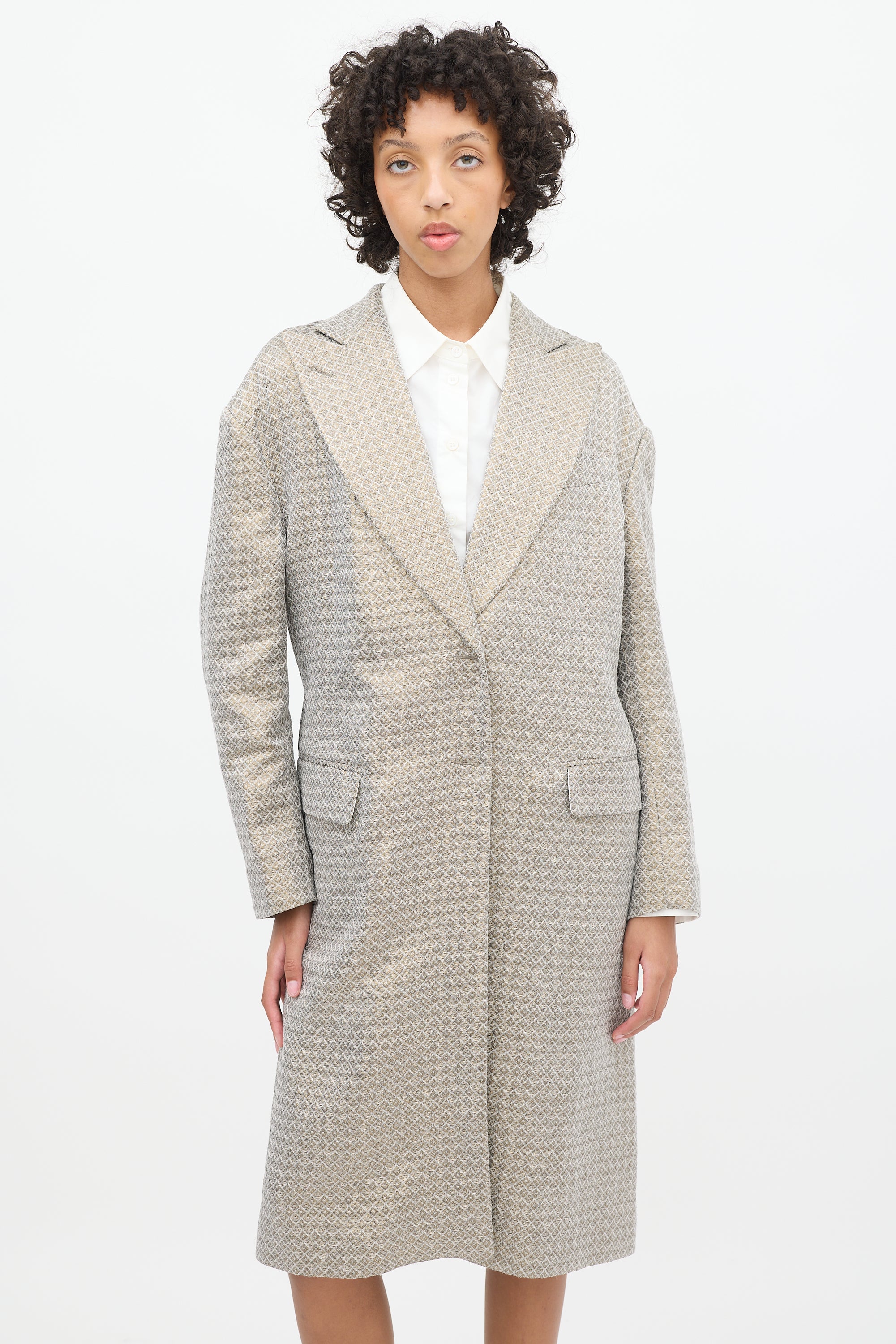 Pre-owned Dries Van Noten grey and gold tone coat featuring a peak lapel, concealed snap button up front, geometric jacquard throughout, slip pocket at left chest, two front flap pockets, back vent, darting at armholes, and long sleeves. Lined.