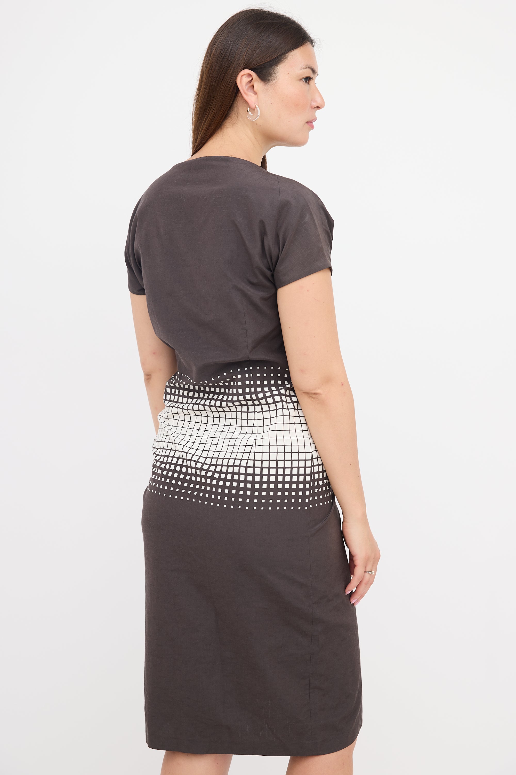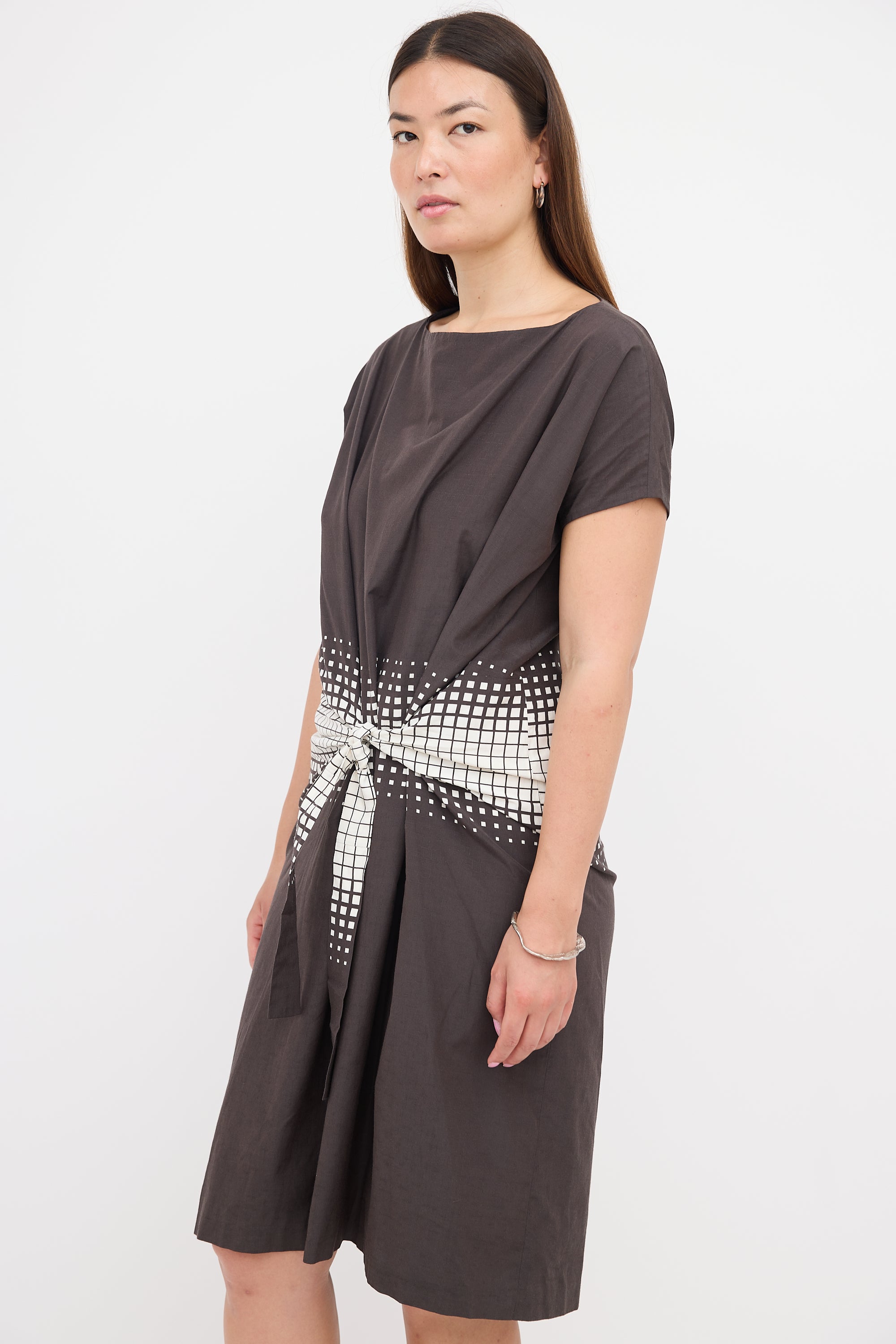 Pre-owned Dries Van Noten brown midi dress featuring bateau neckline, white grid print, and tie at midsection.