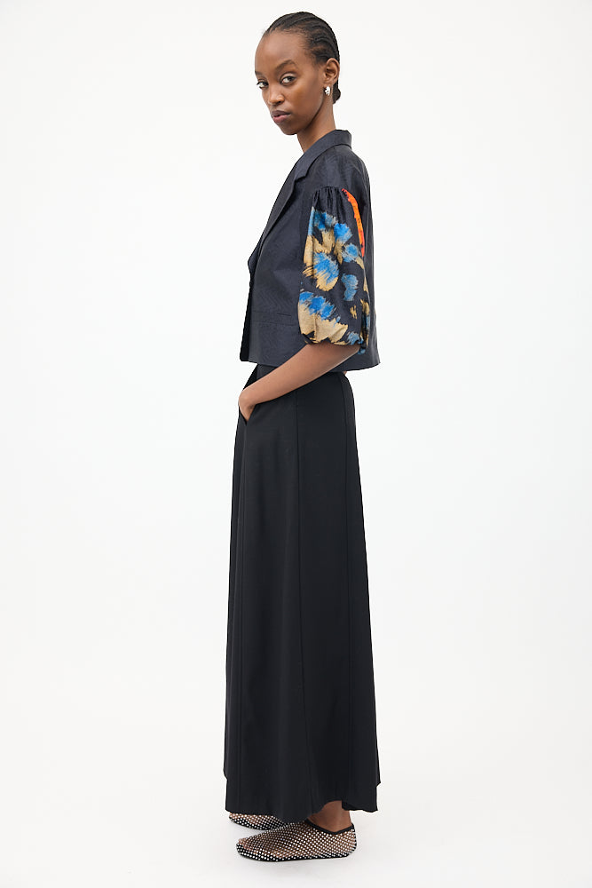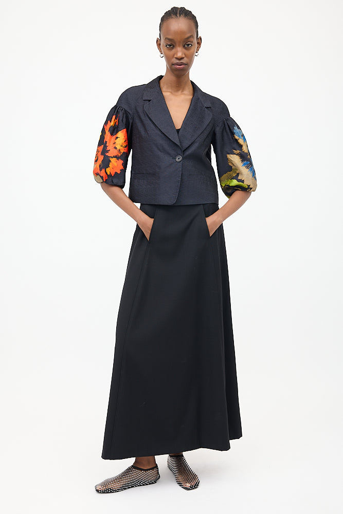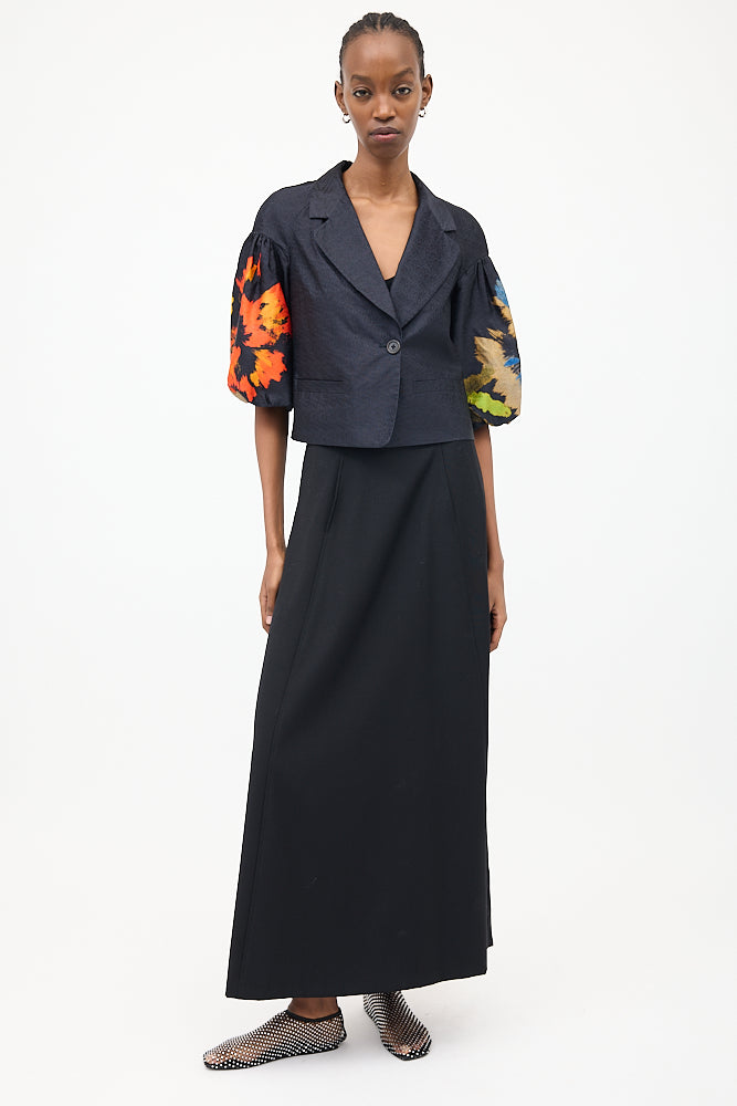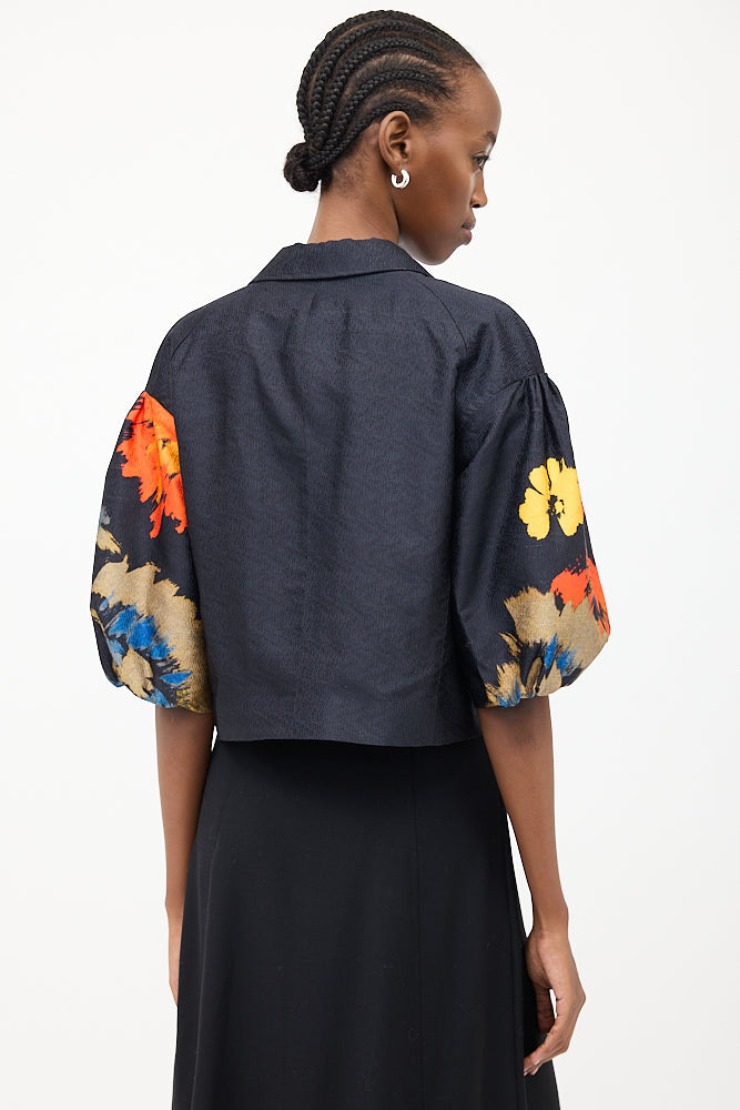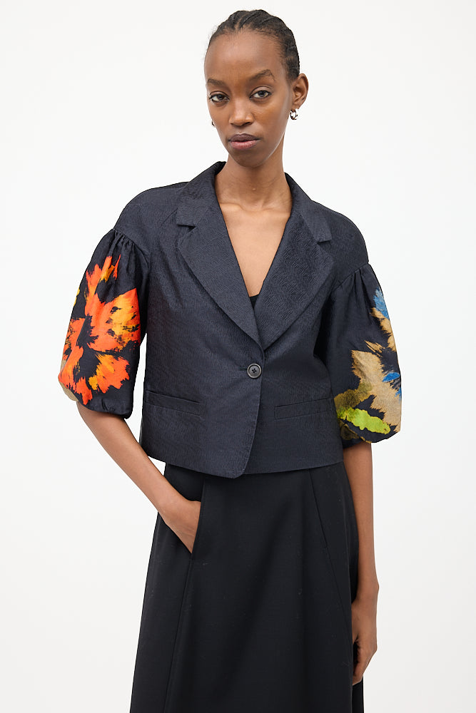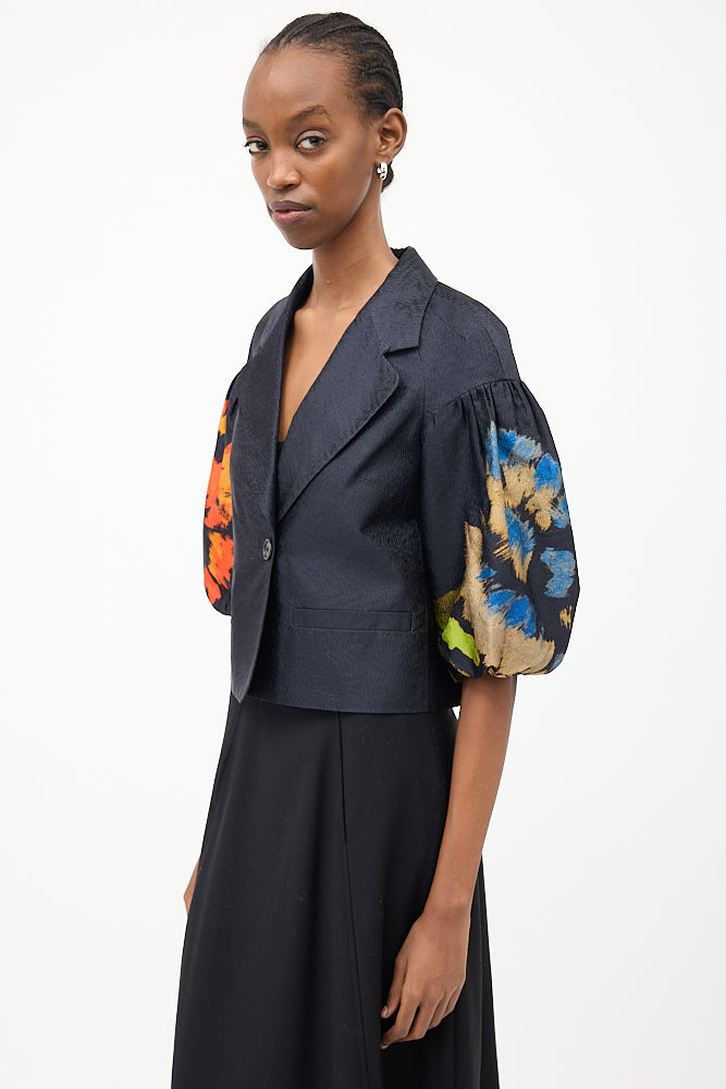 Pre-owned Dries Van Noten navy and multicolour silk blazer featuring a notched collar, two welt pockets at front waist, and half length puff sleeves with floral print throughout. Lined.