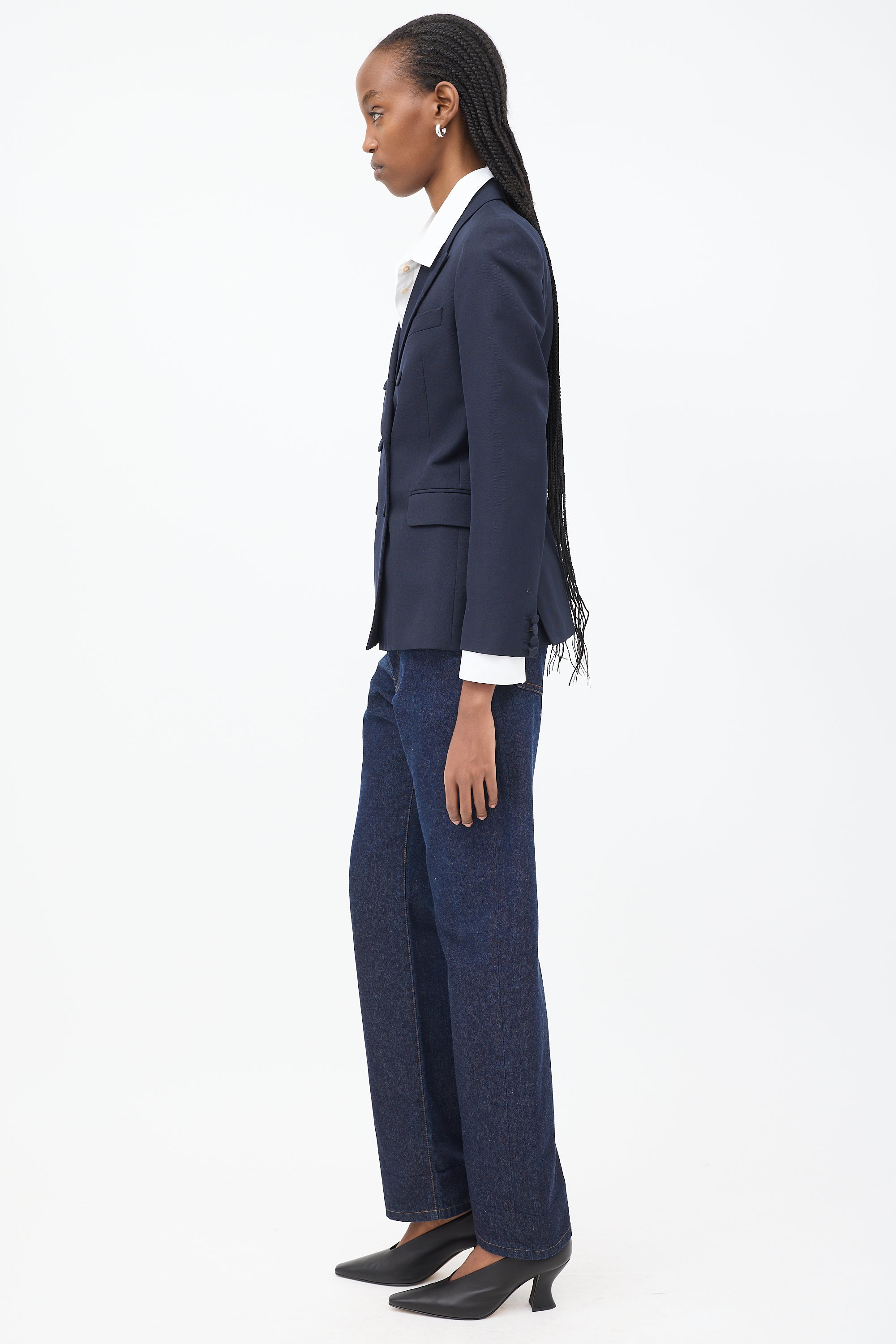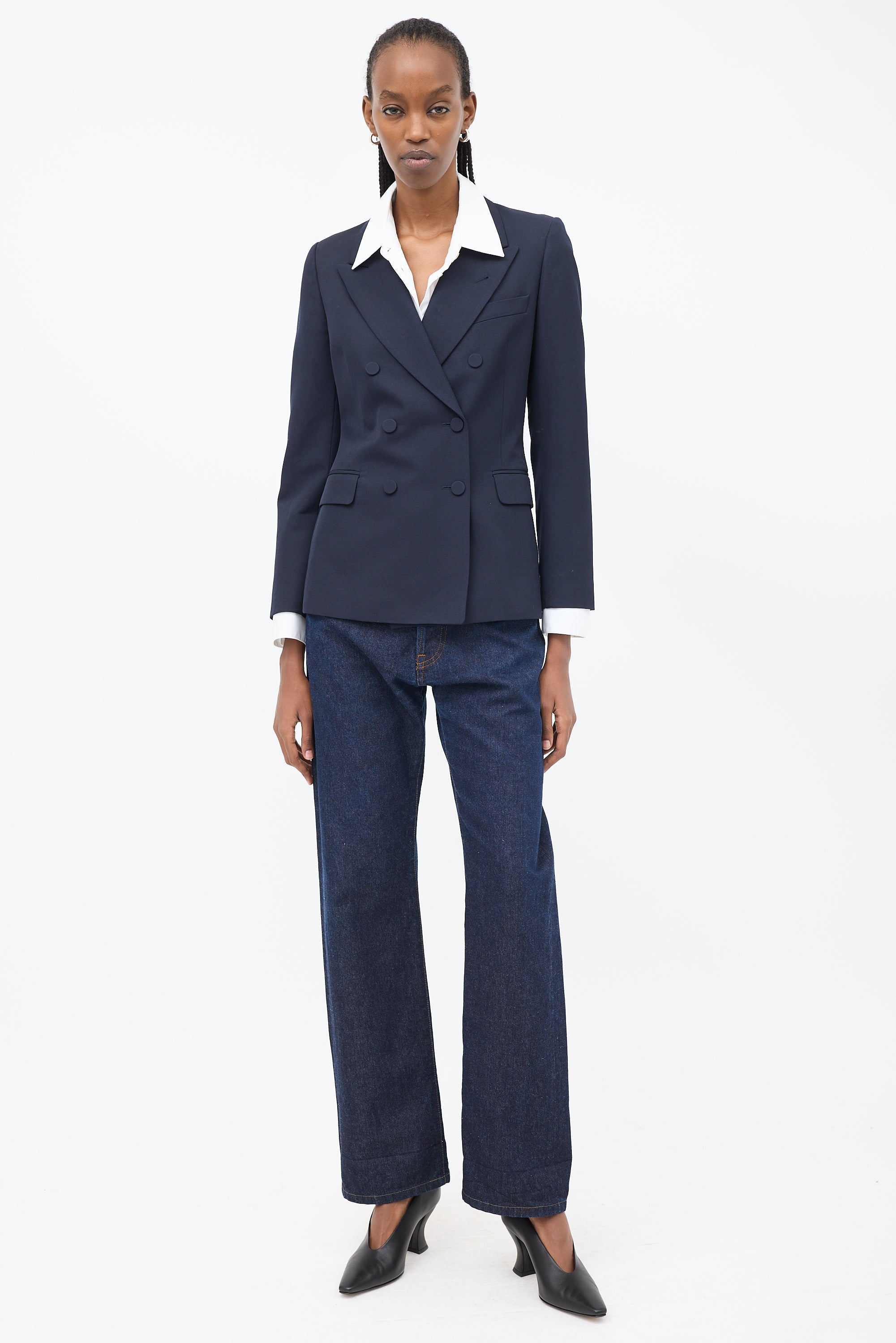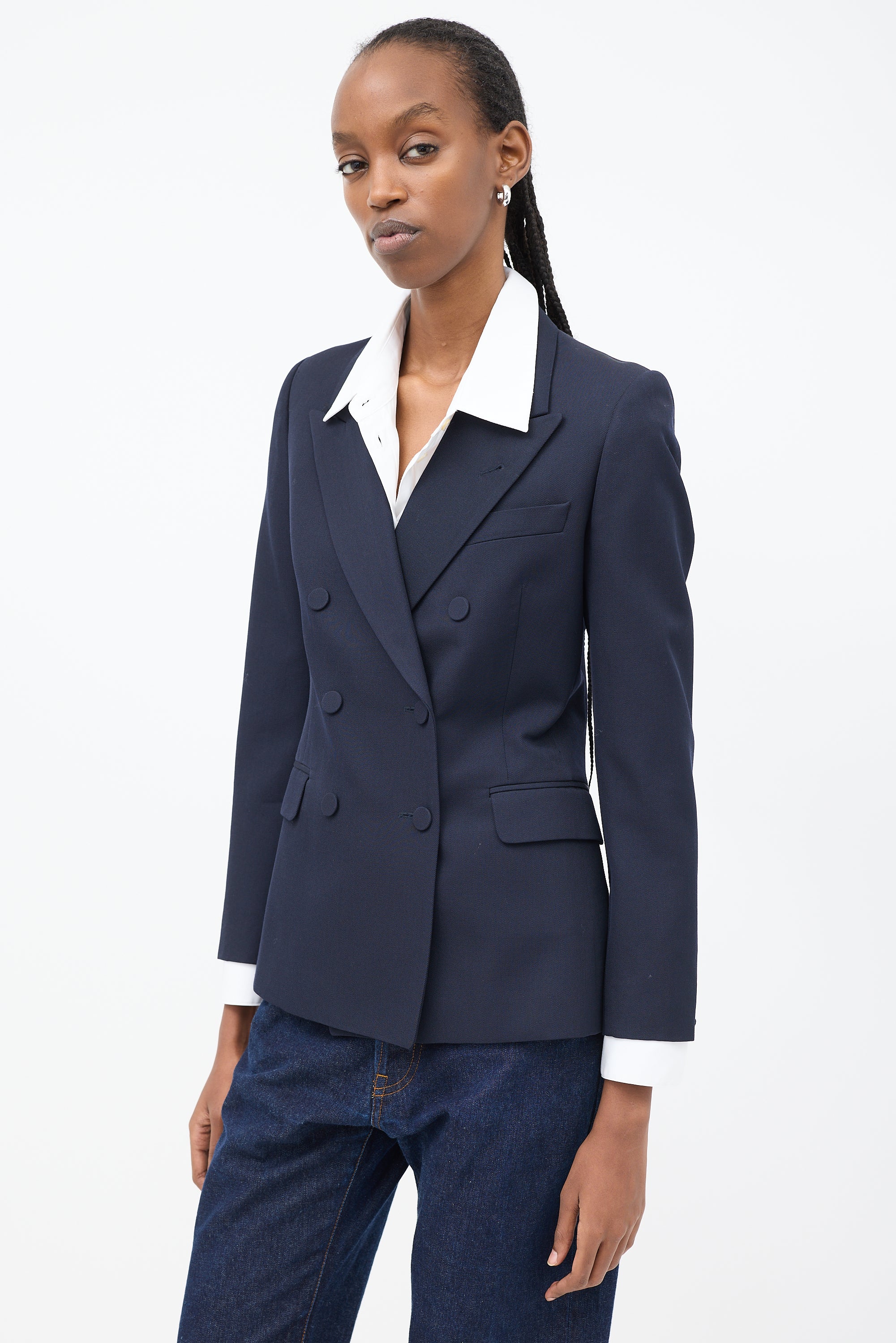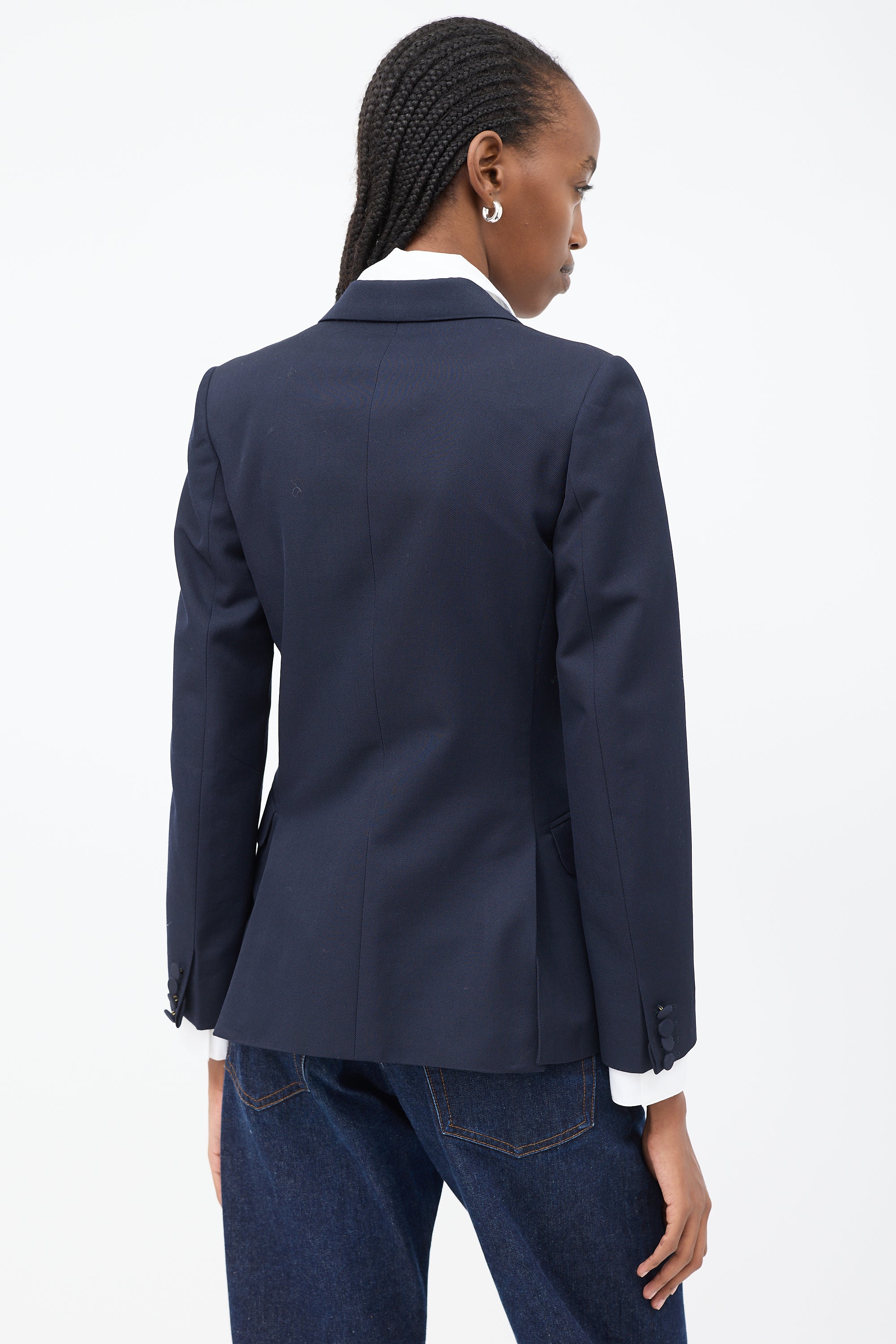Pre-owned Dries Van Noten navy wool blazer featuring a peak lapel, double breasted button up front, welt pocket at left chest, two flap welt pockets at front hip, back double vent, and long sleeves with decorative buttons. Lined.