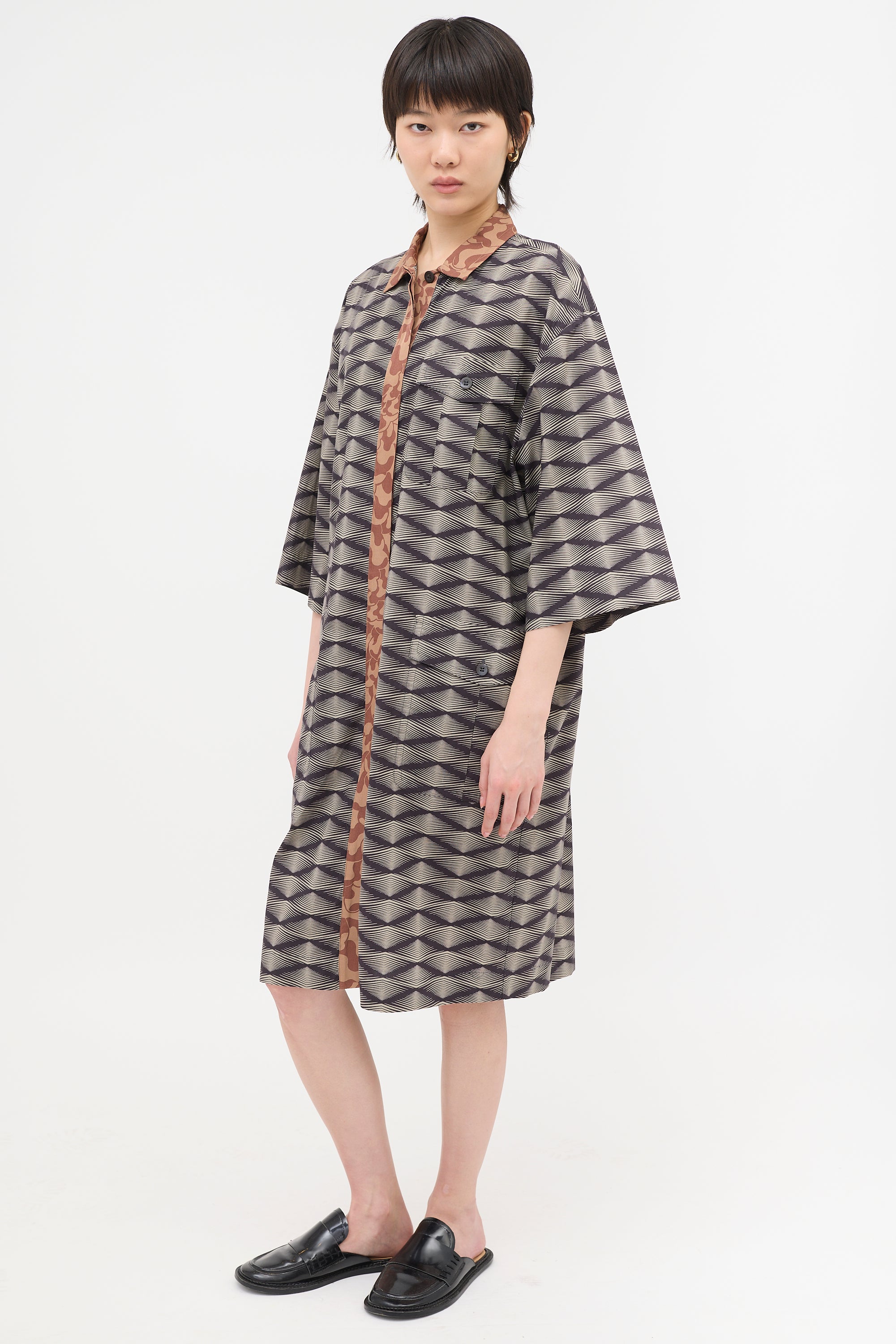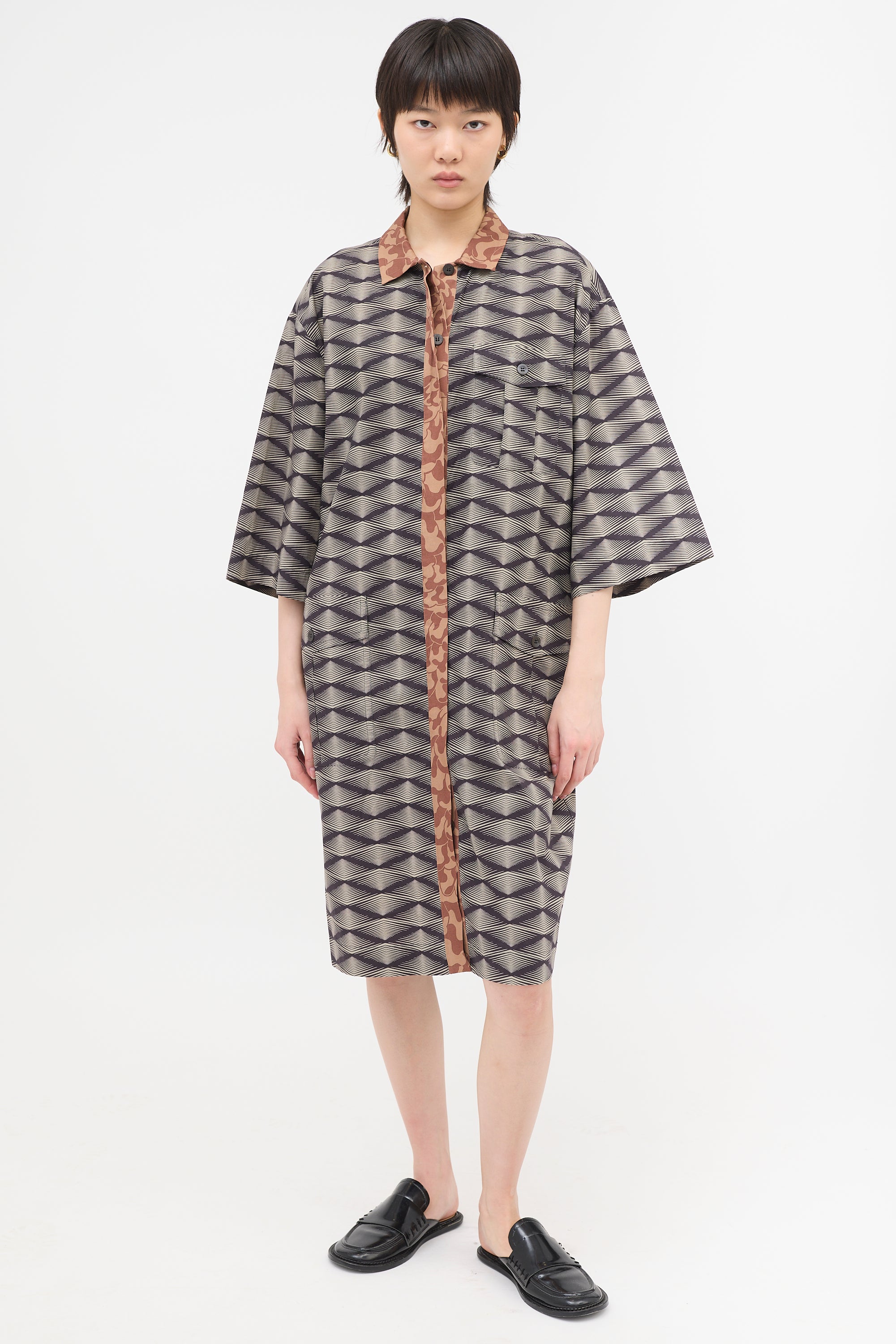 Pre-owned Dries Van Noten brown shirt dress featuring an abstract print throughout, point collar, concealed button up front, three buttoned flap pockets, and wide half sleeves.