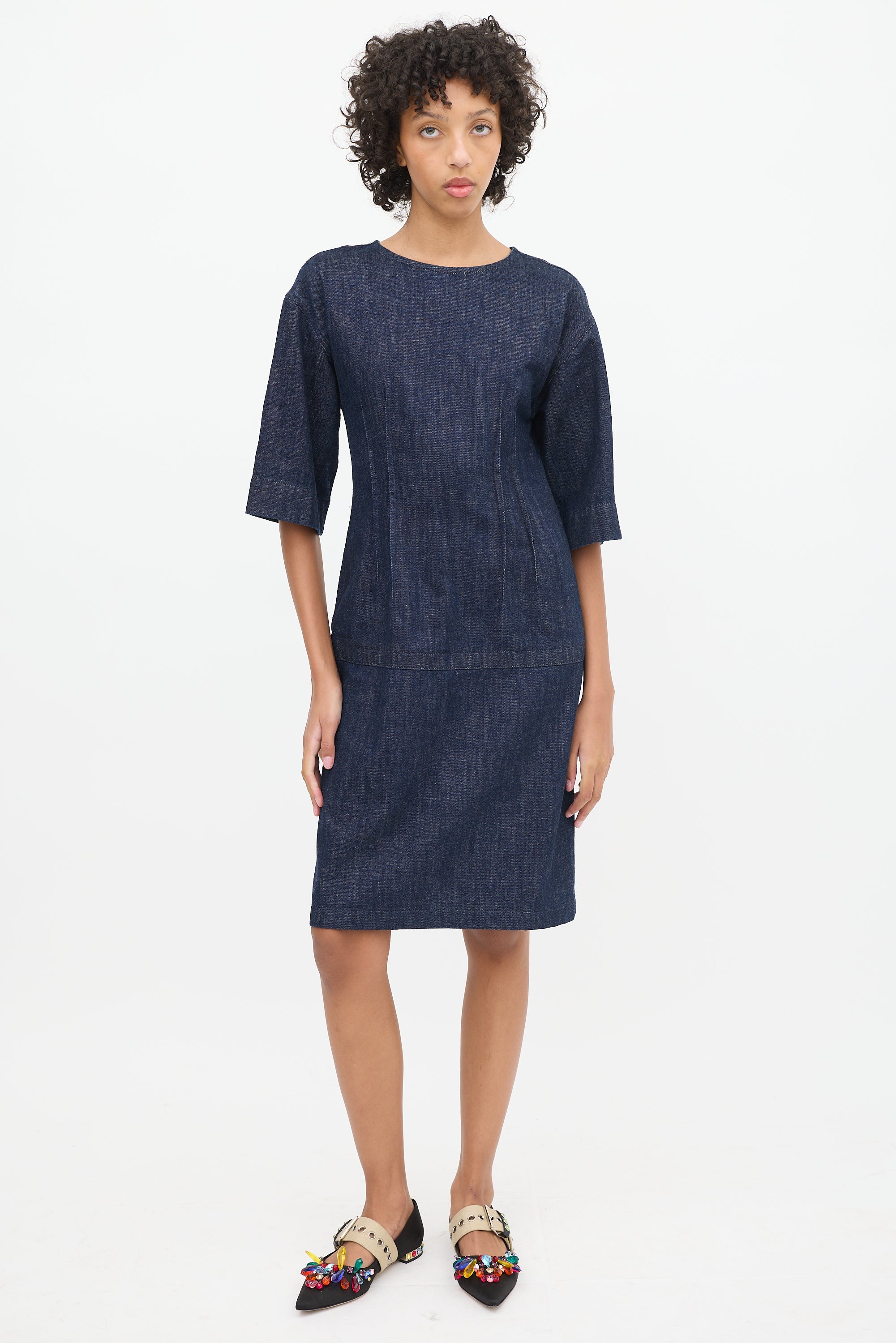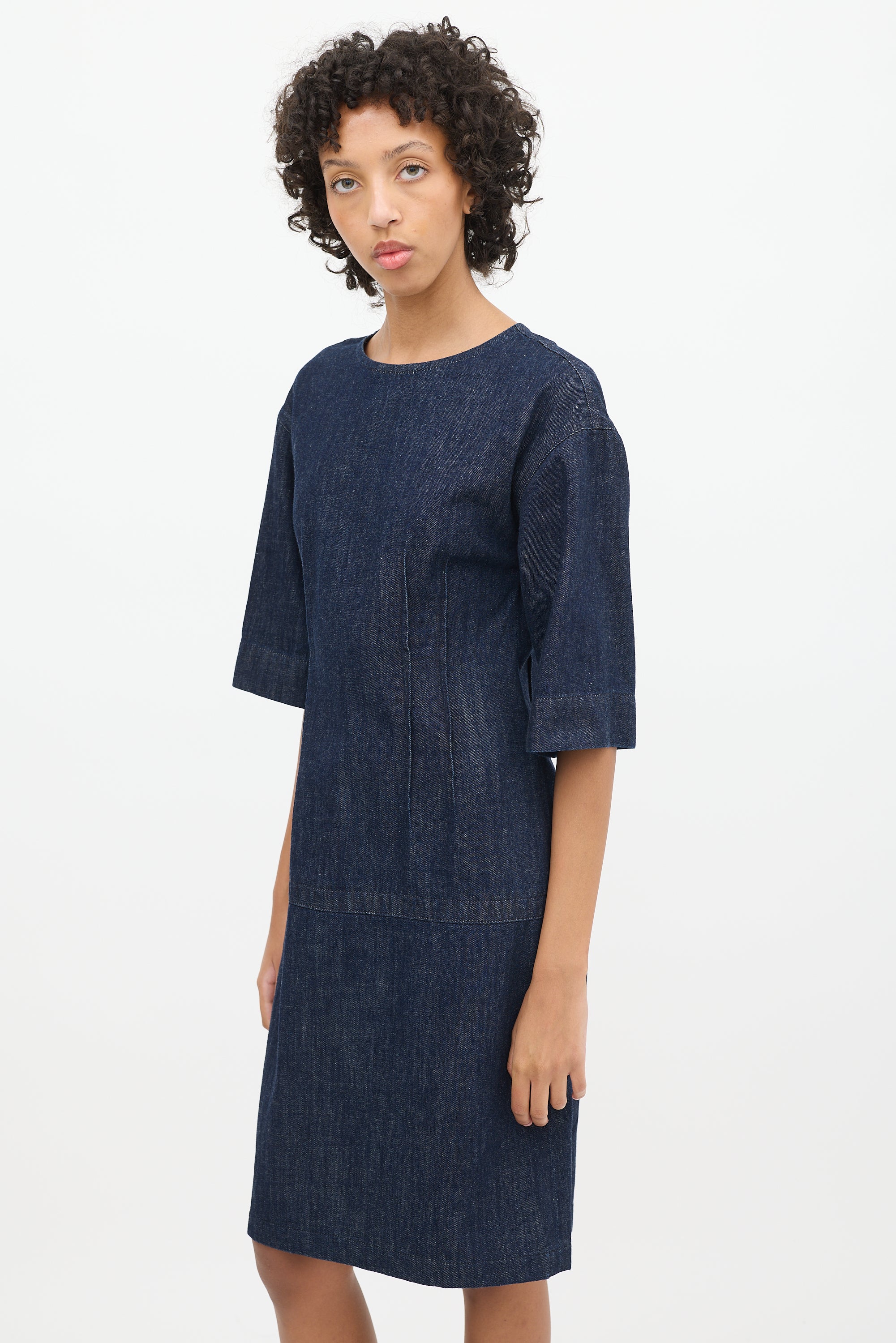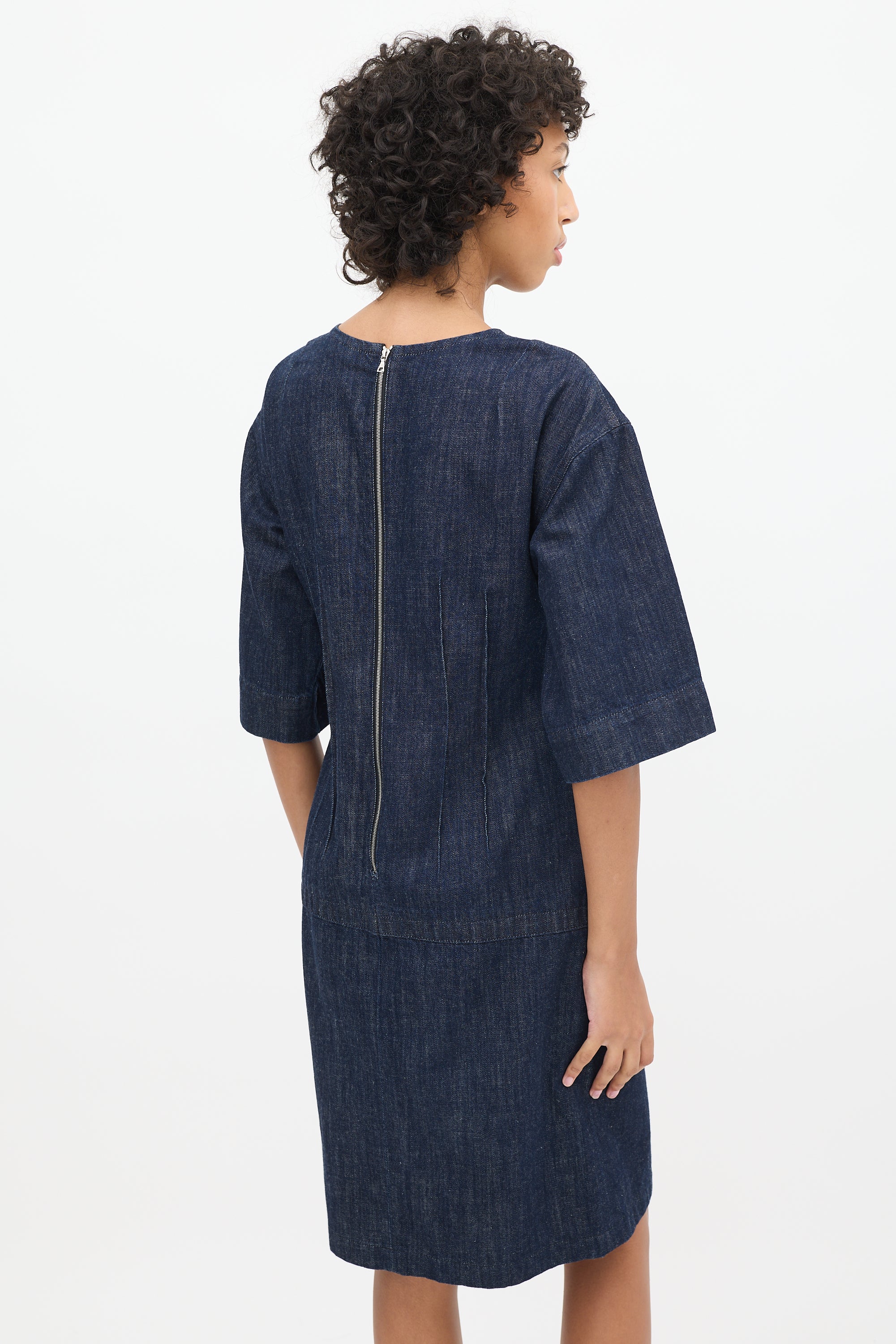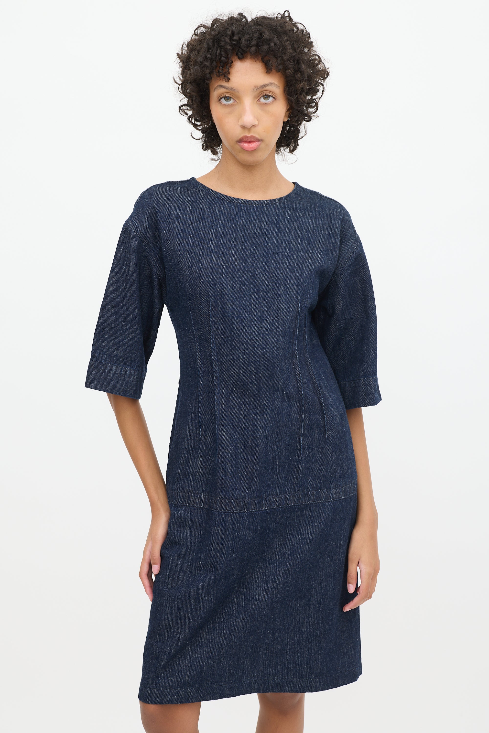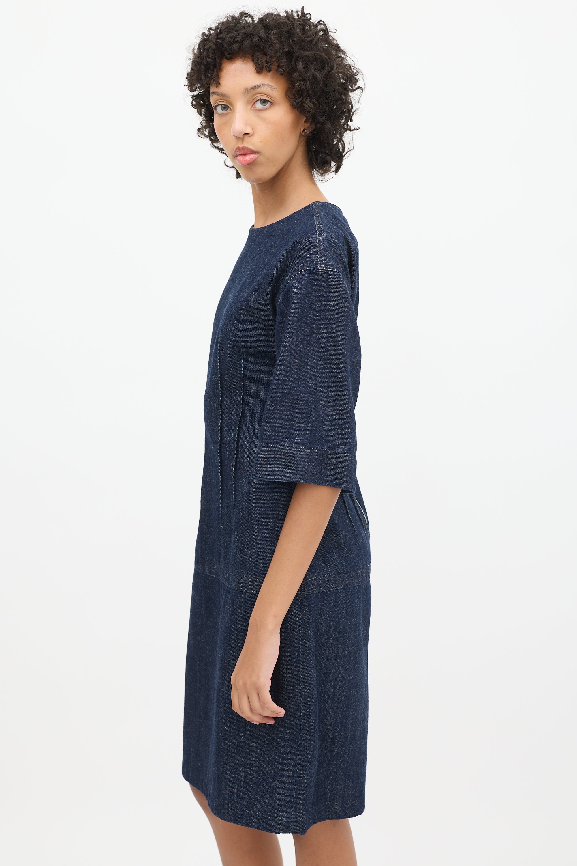 Pre-owned Dries Van Noten raw denim midi dress featuring a round neckline, tucks throughout bodice, dropped shoulders, half length sleeves, and back zip.