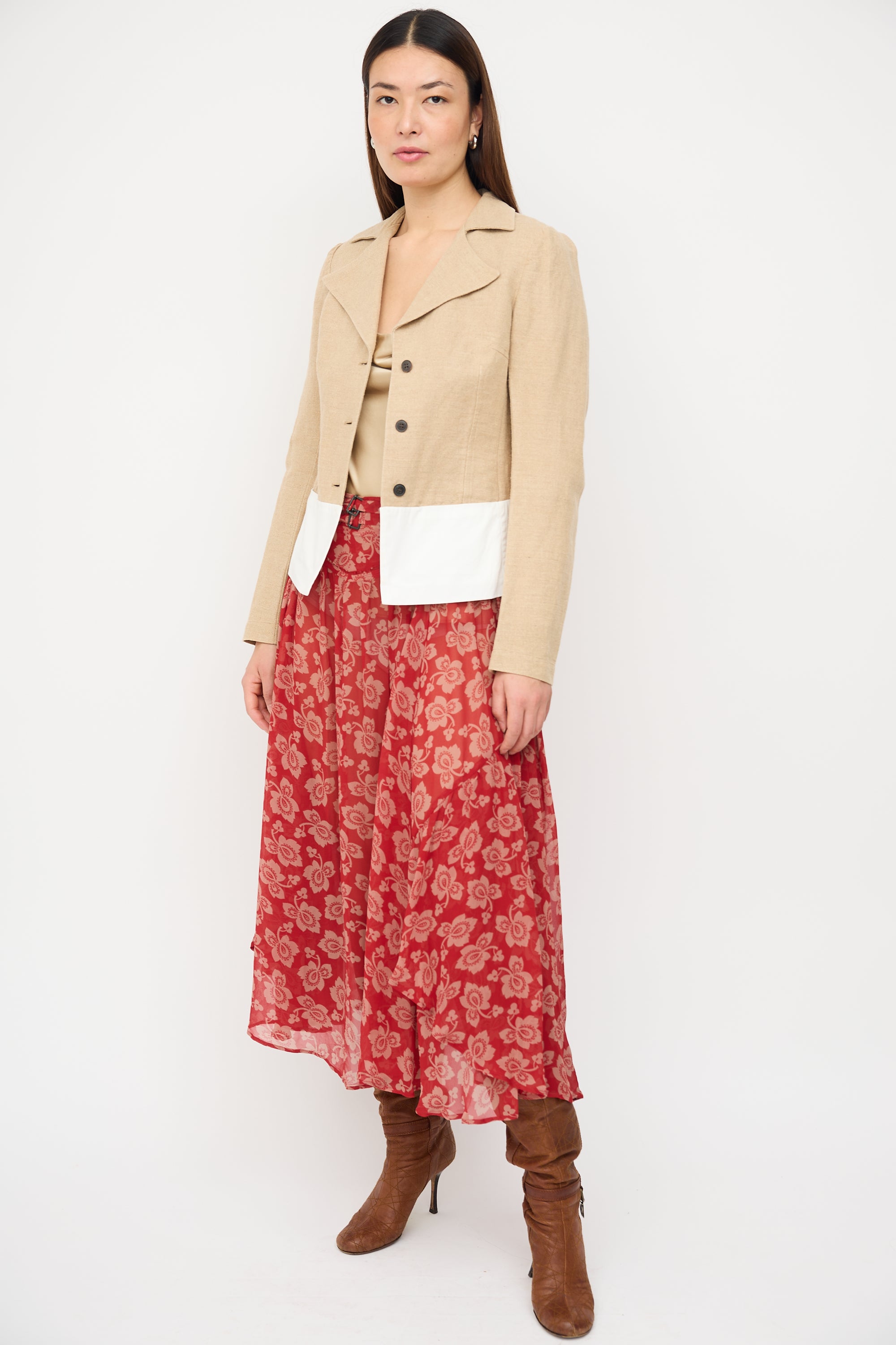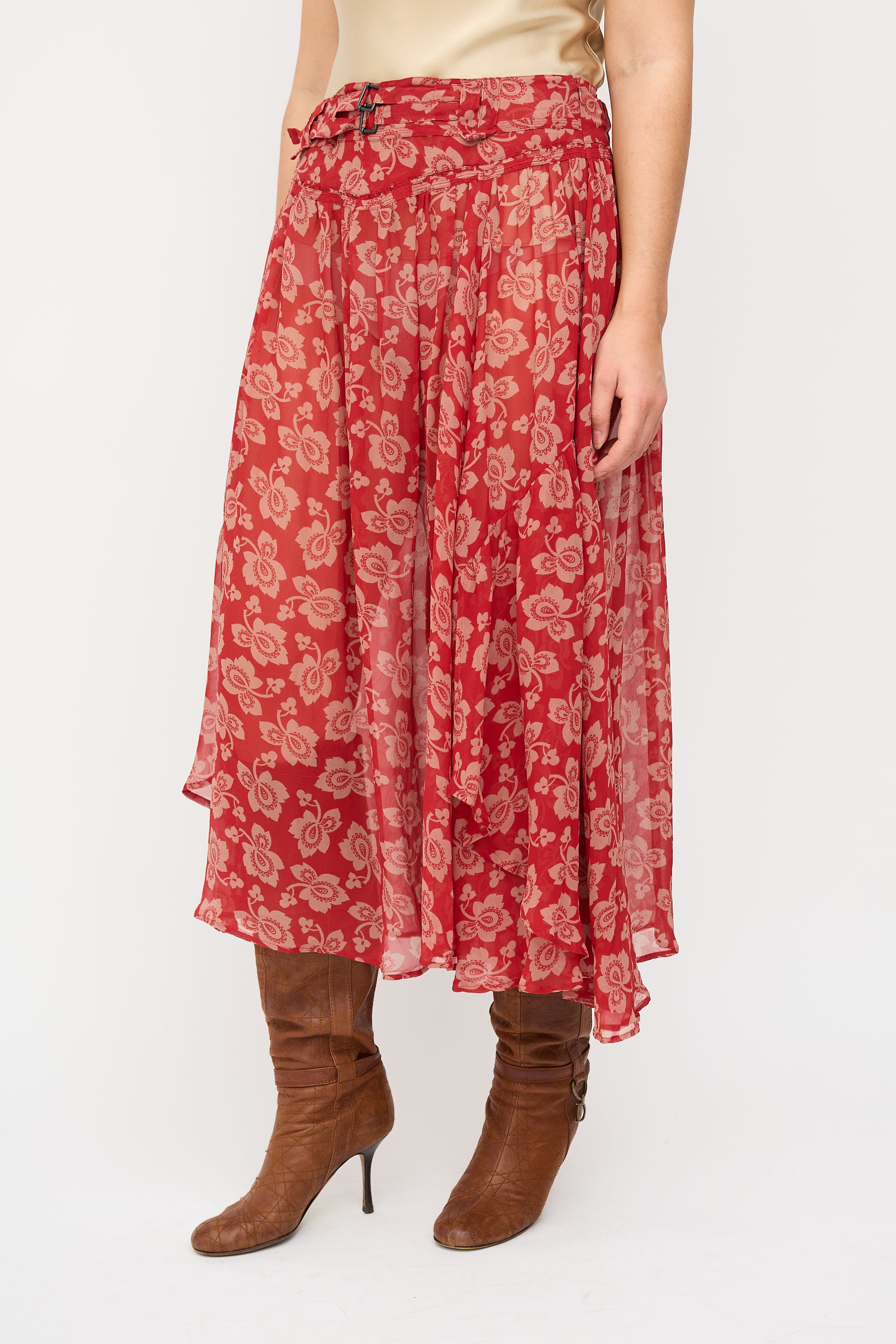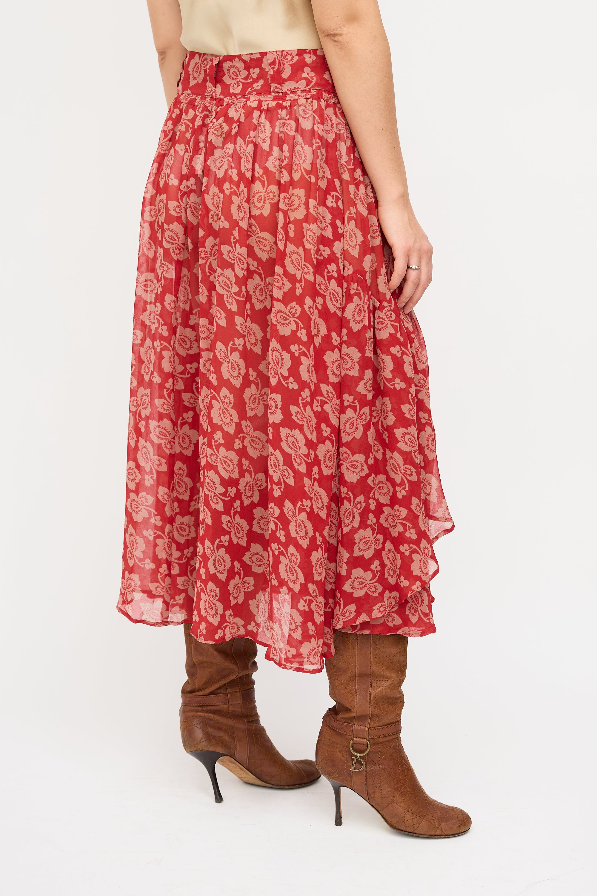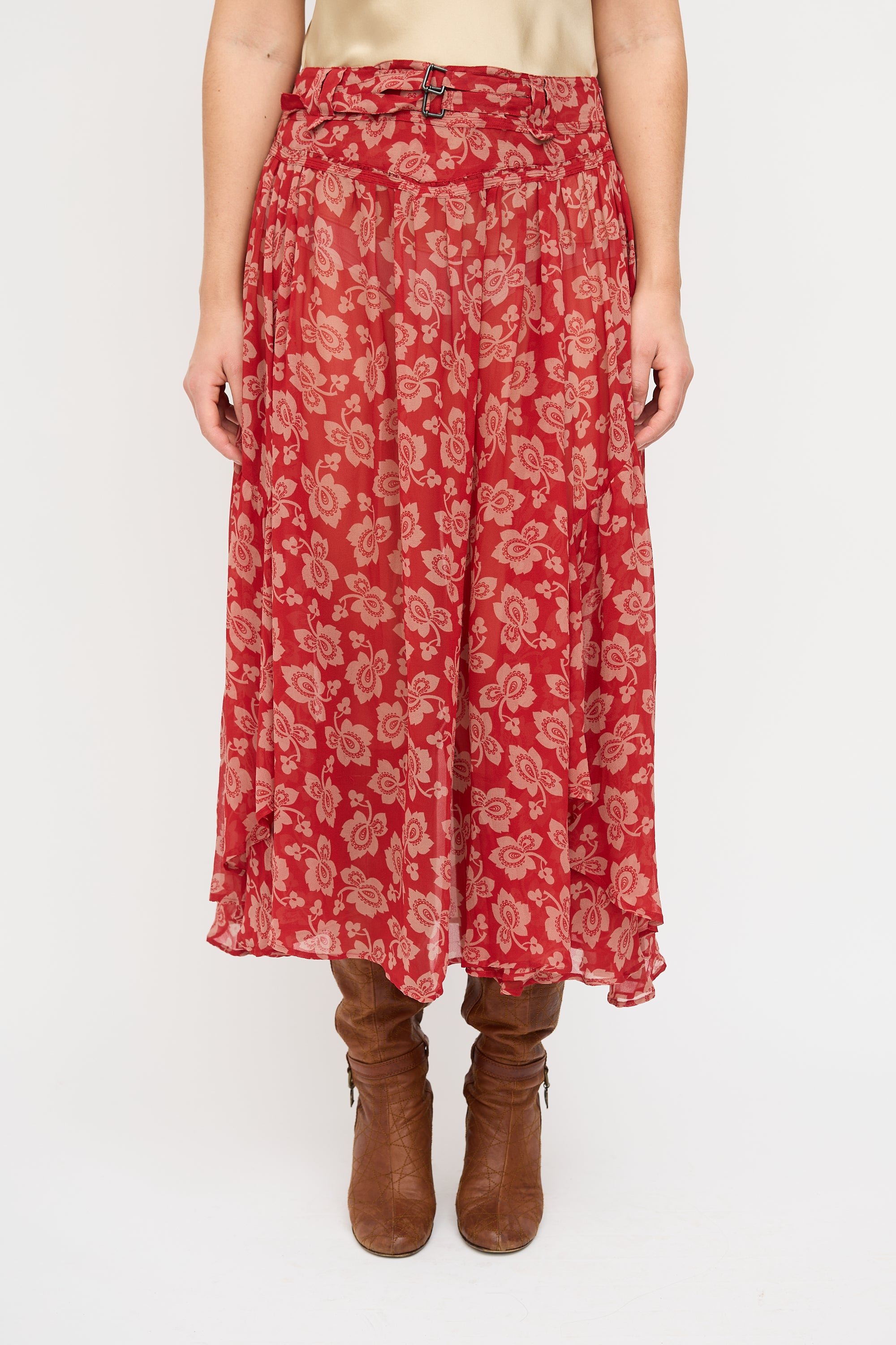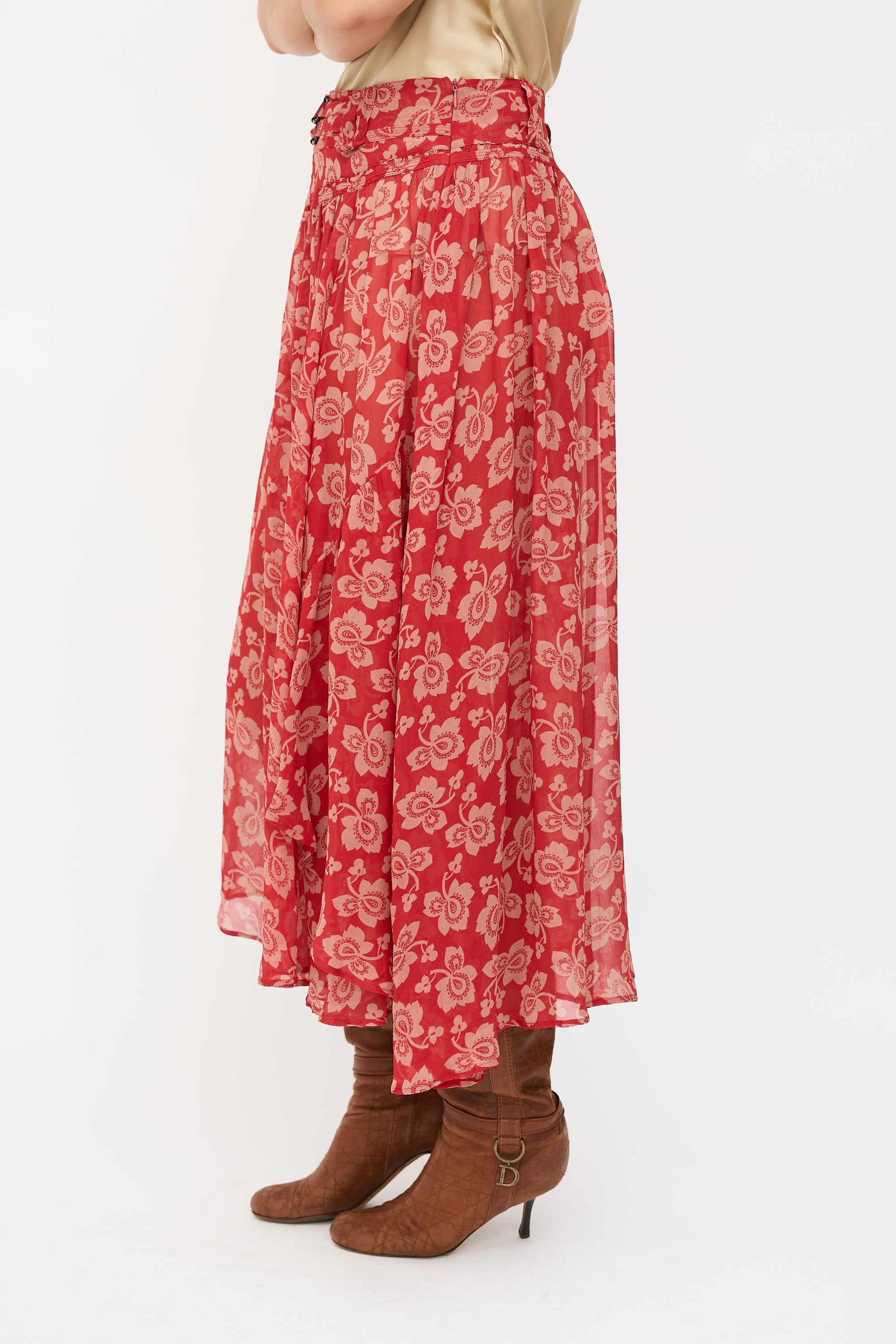 Pre-owned Dries Van Noten red and beige silk midi skirt featuring a floral print, gathered waist, front dual belt detail, gore design with gathered inserts, and concealed side zip closure. Unlined.