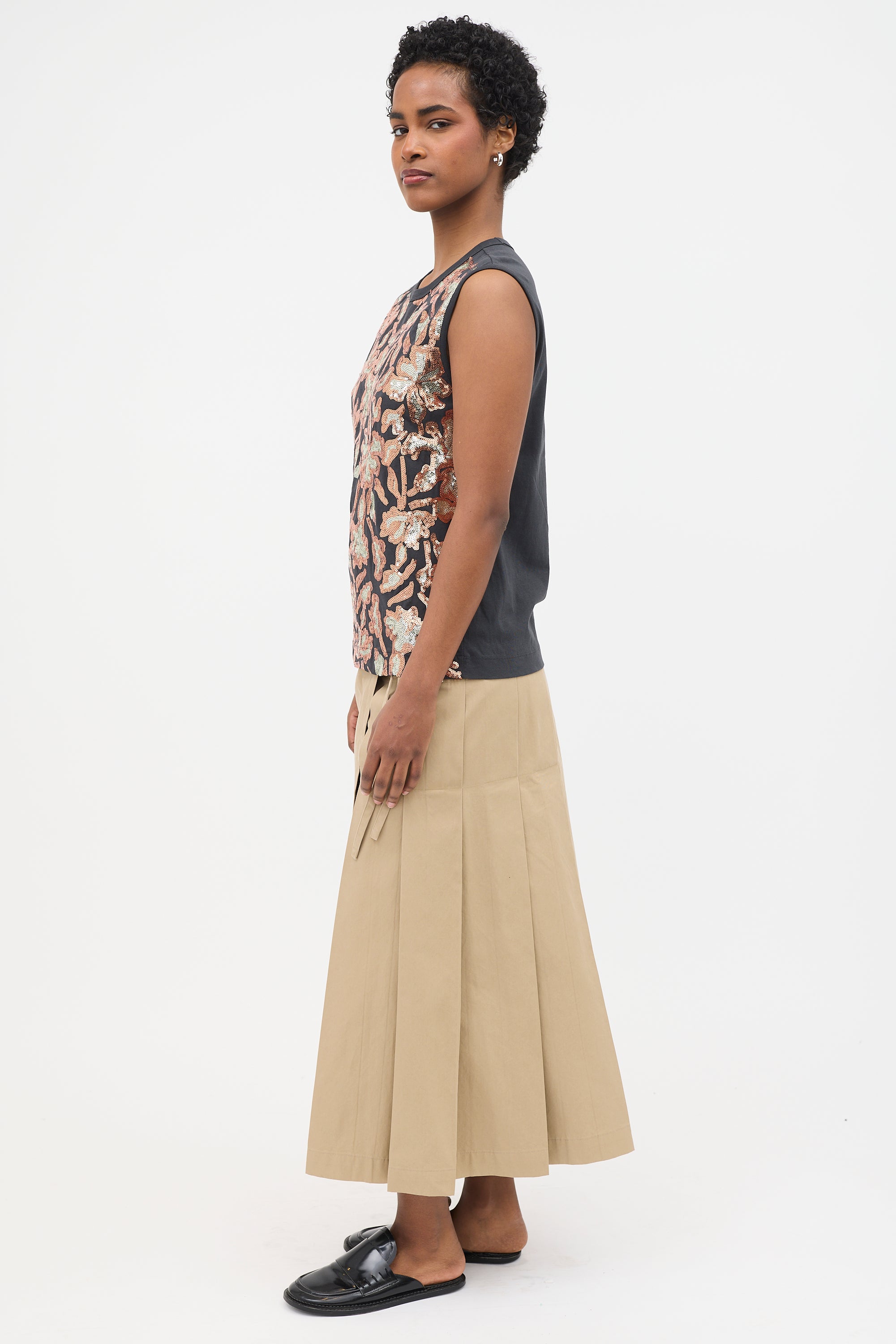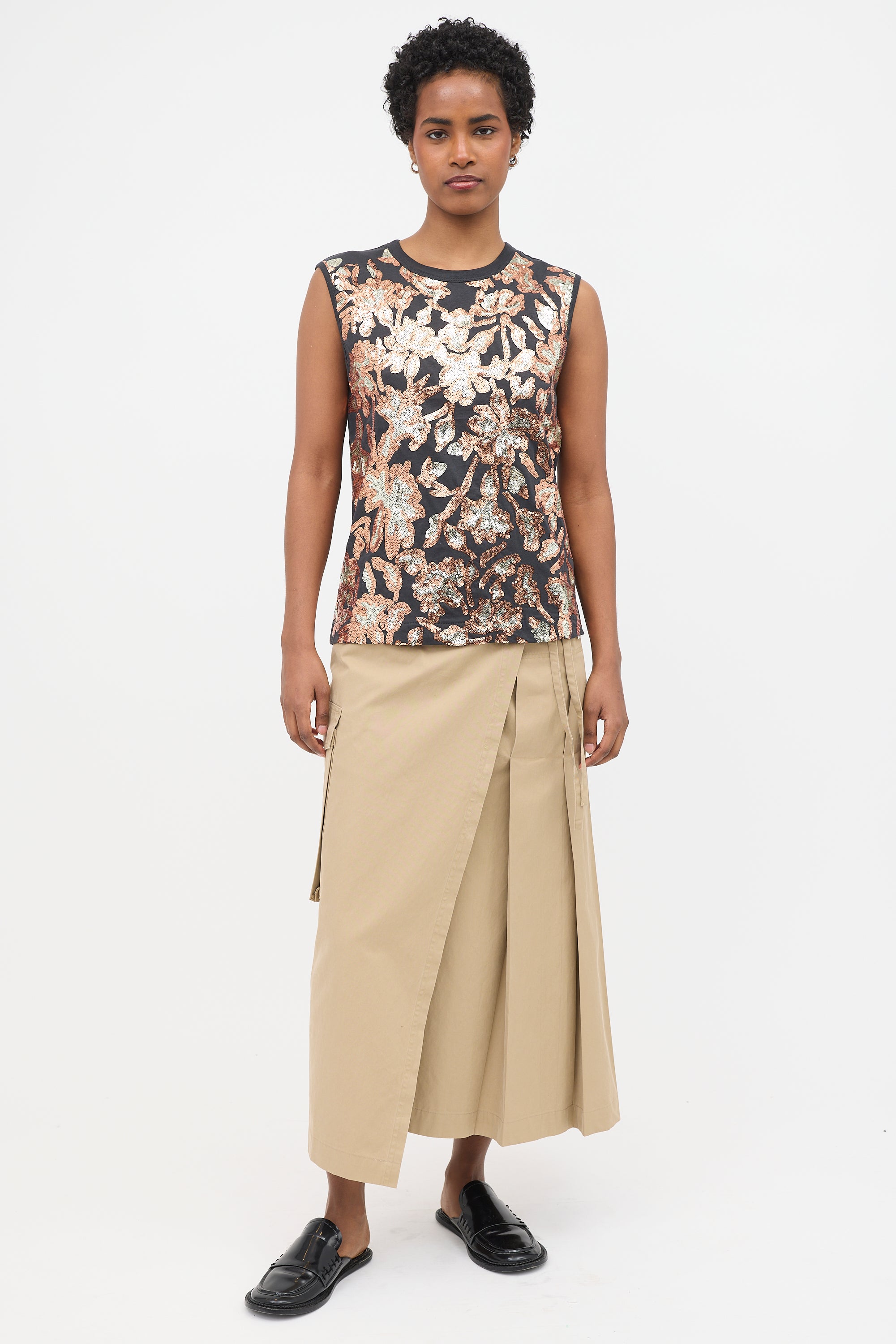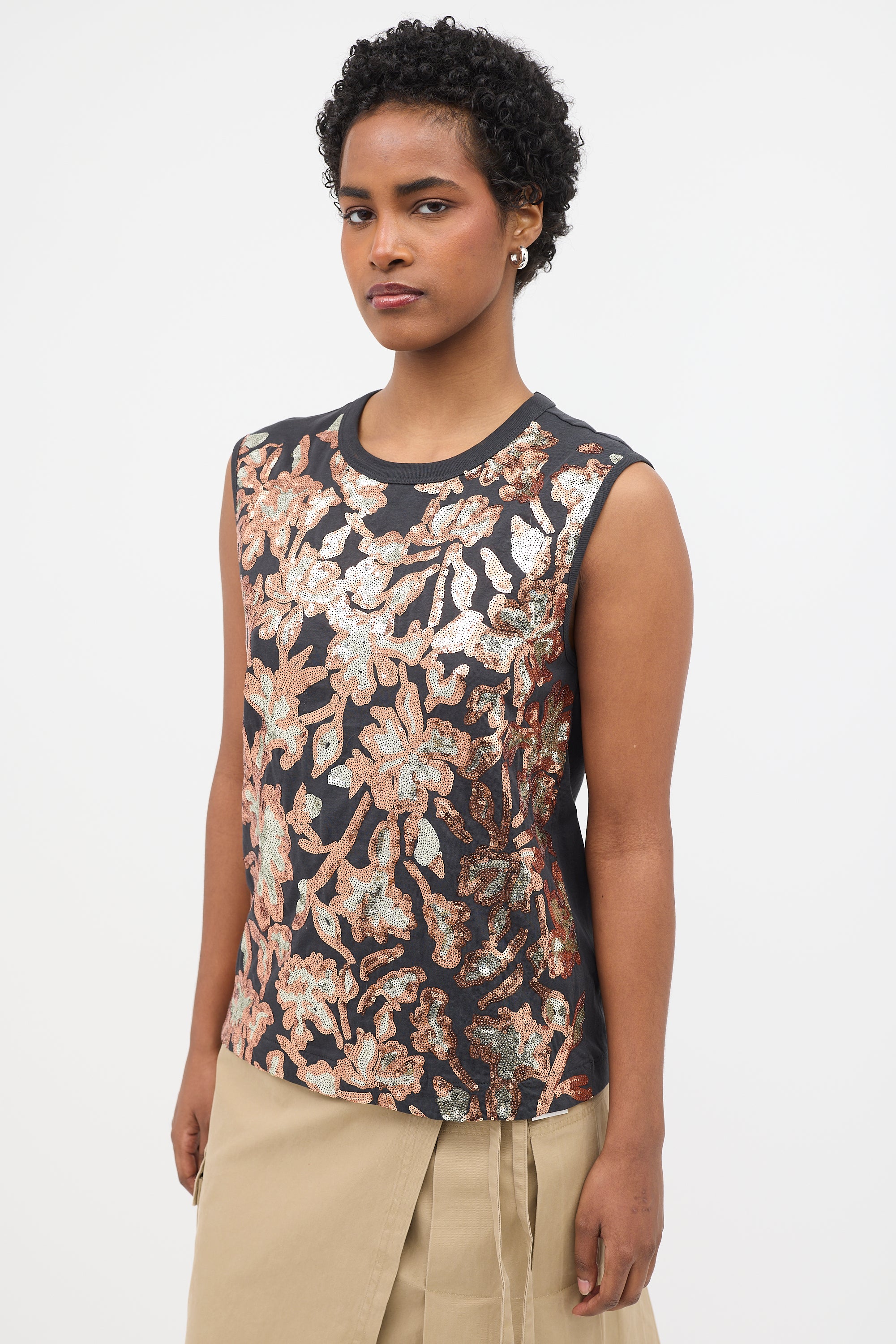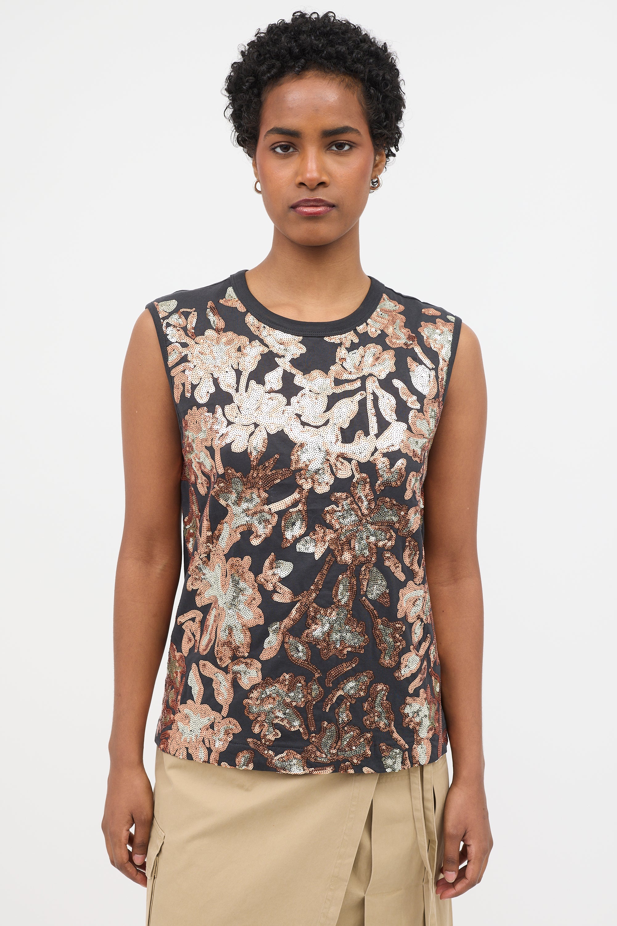 Pre-owned Dries Van Noten black tank top featuring round neck and two tone sequin floral motif.