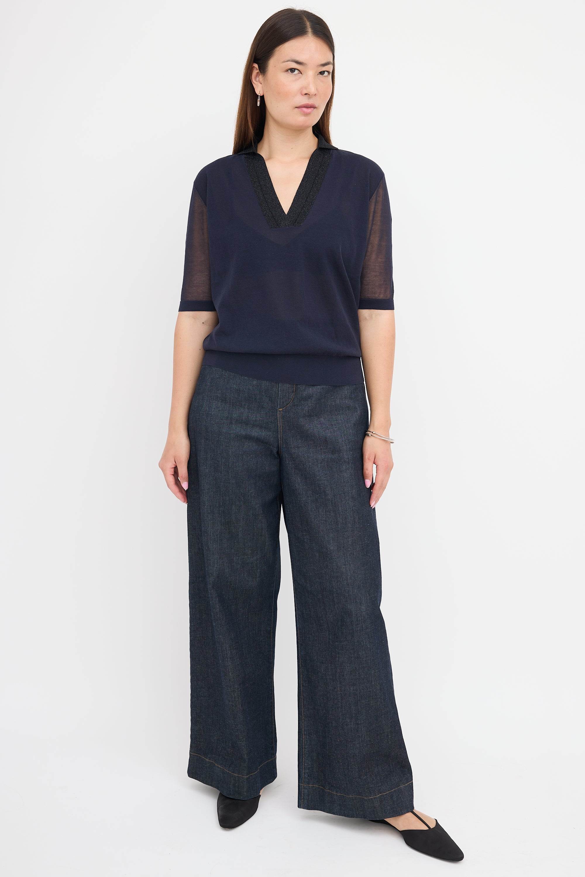 Pre-owned Dries Van Noten navy sheer polo featuring sparkly black collar and neckline and ribbed hem and cuffs.