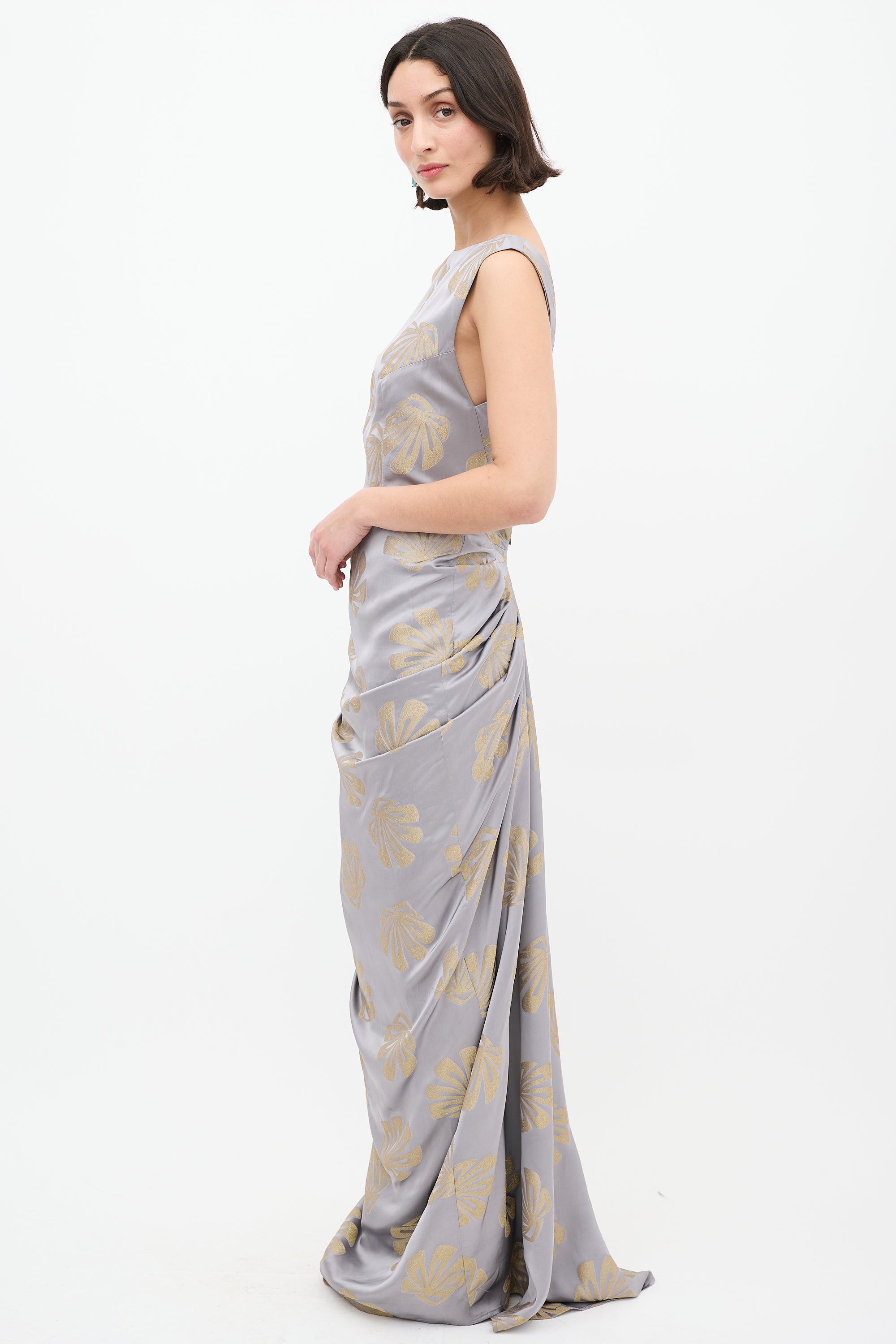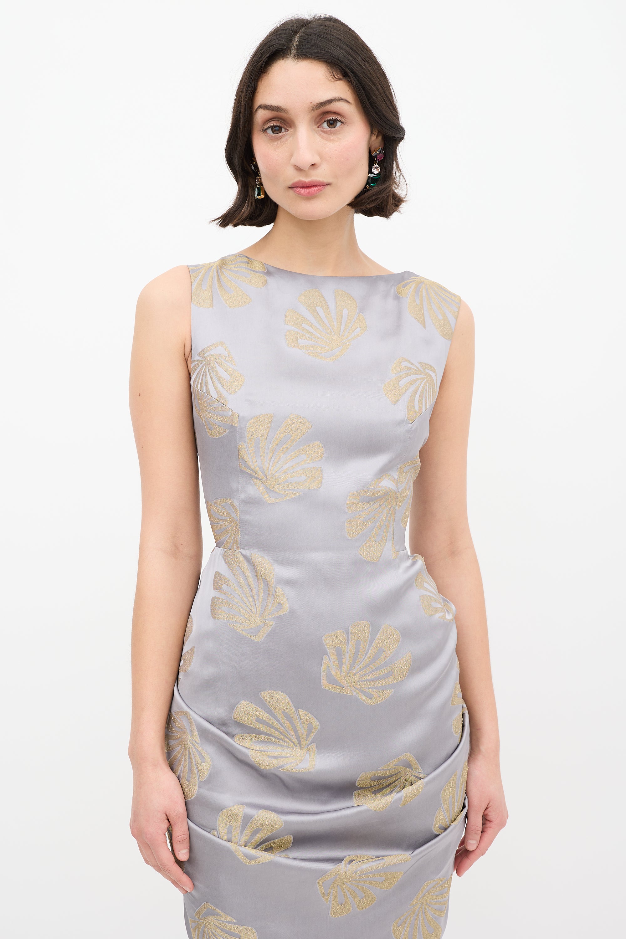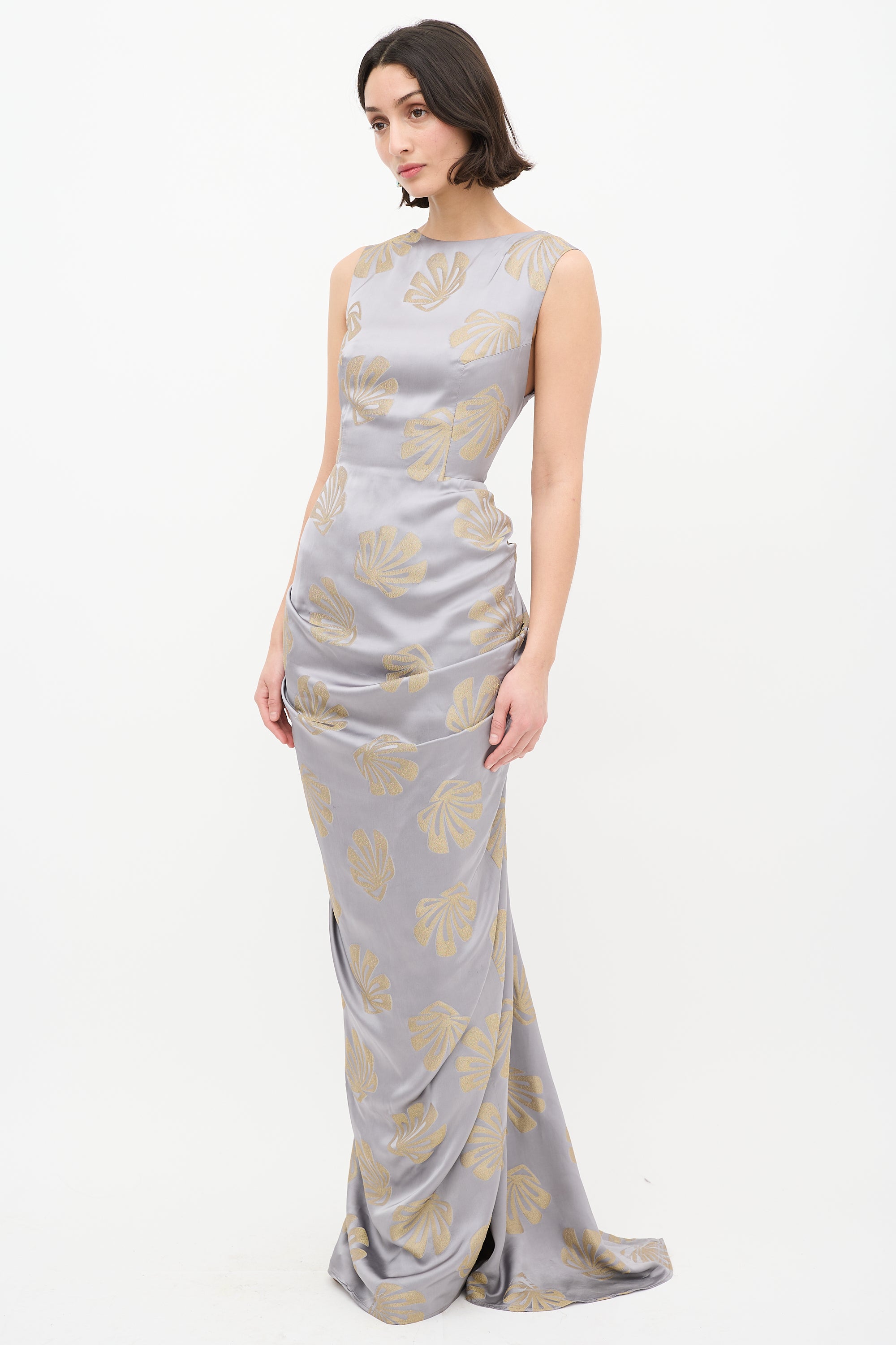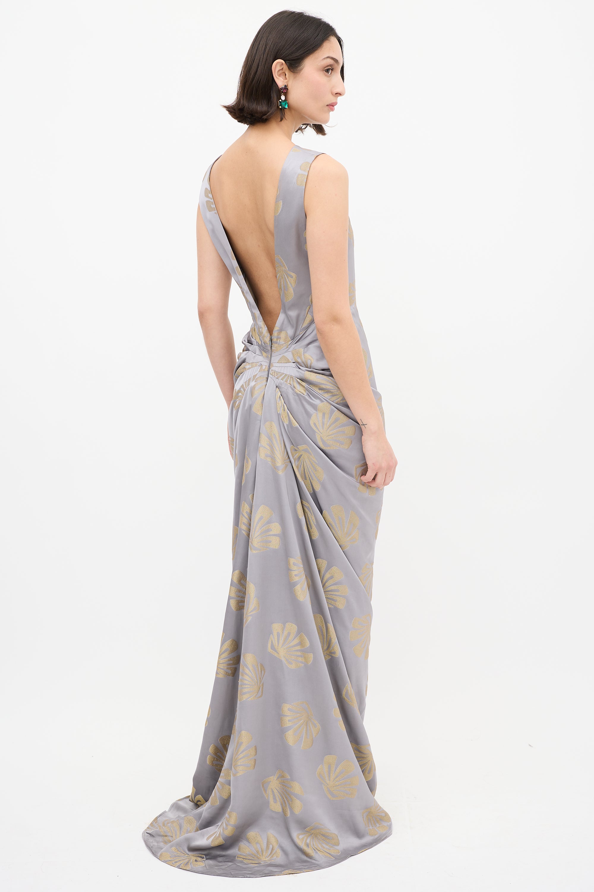 Pre-owned Dries Van Noten silver satin Danama sleeveless gown featuring a bateau neckline, low V-cut back, draped skirt design, pleating at centre back hip, gold tone metallic thread embroidered leaf motifs throughout, and concealed back zip closure. Lined.