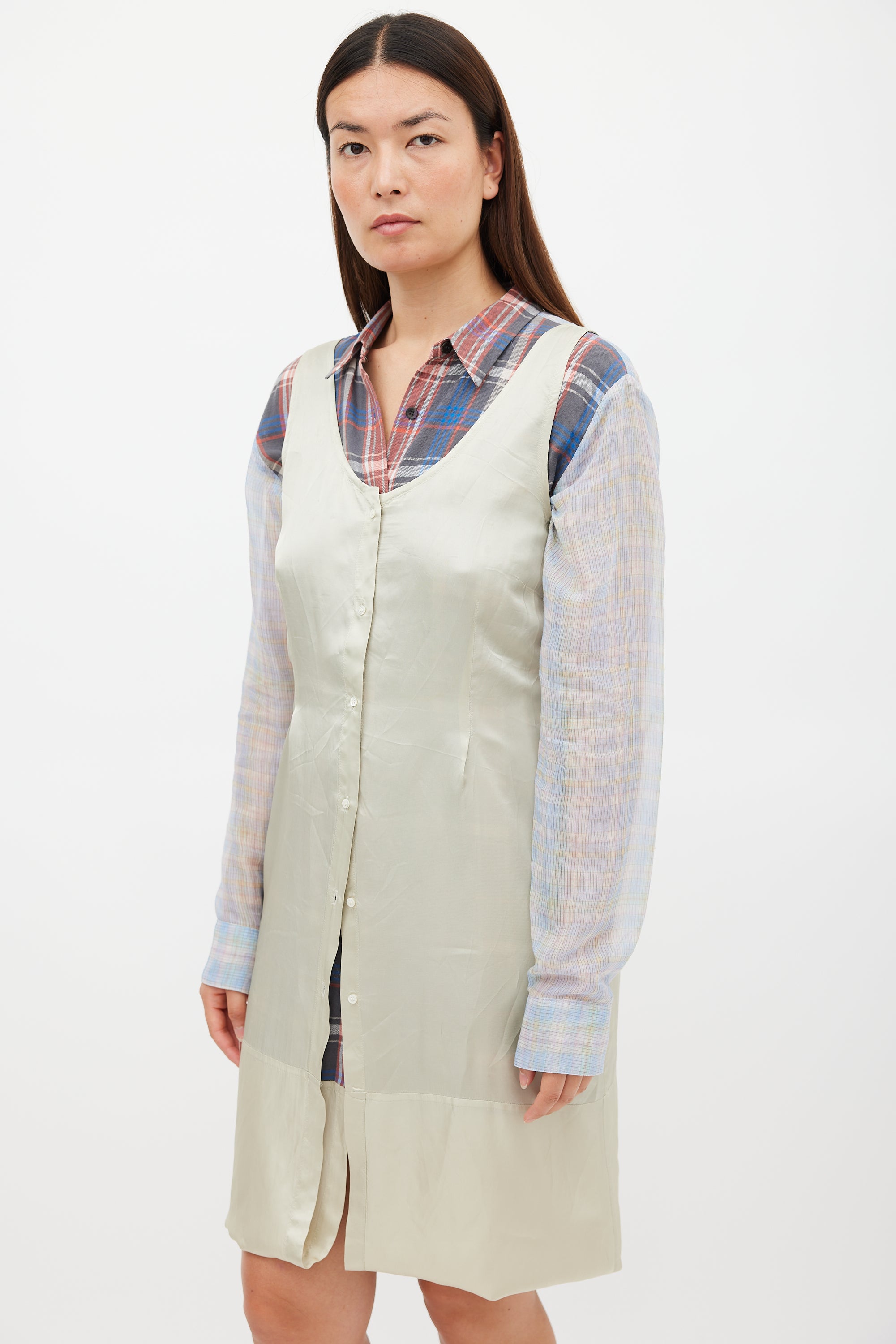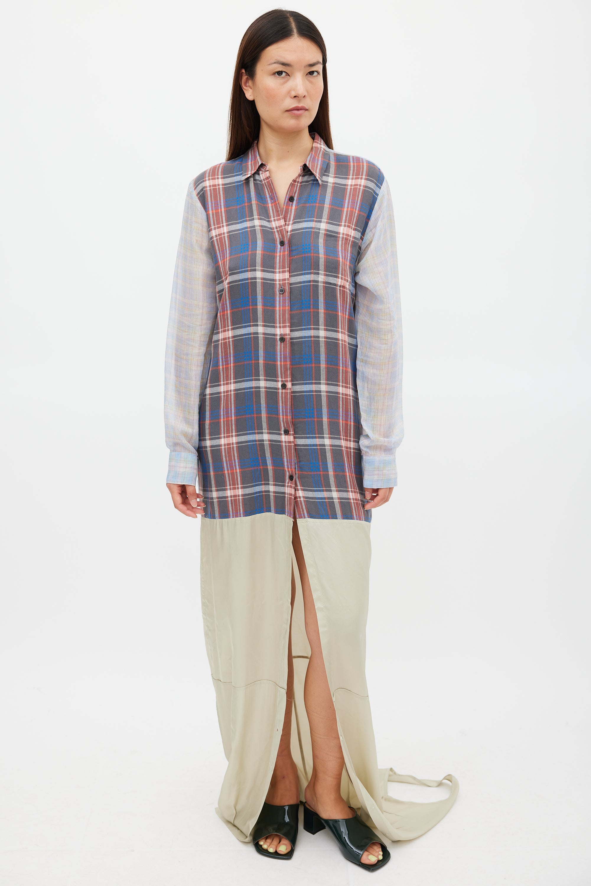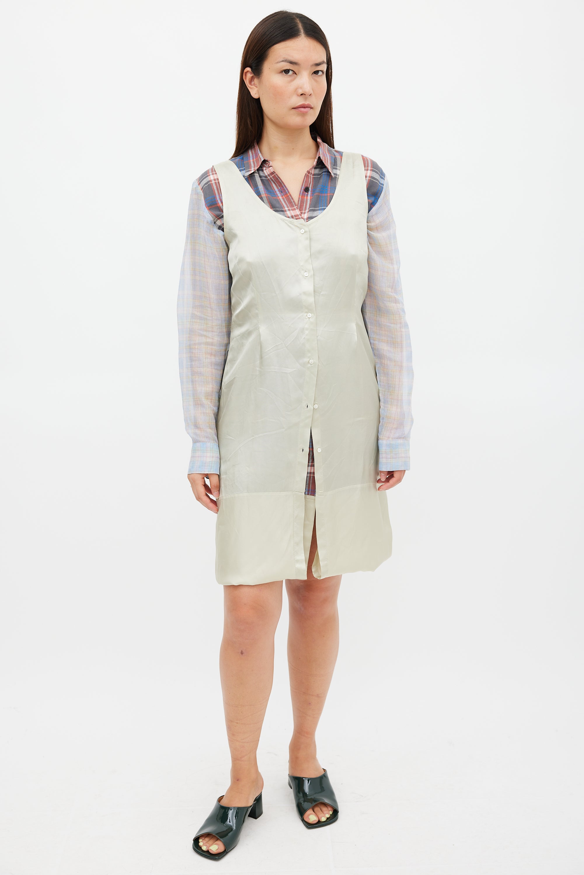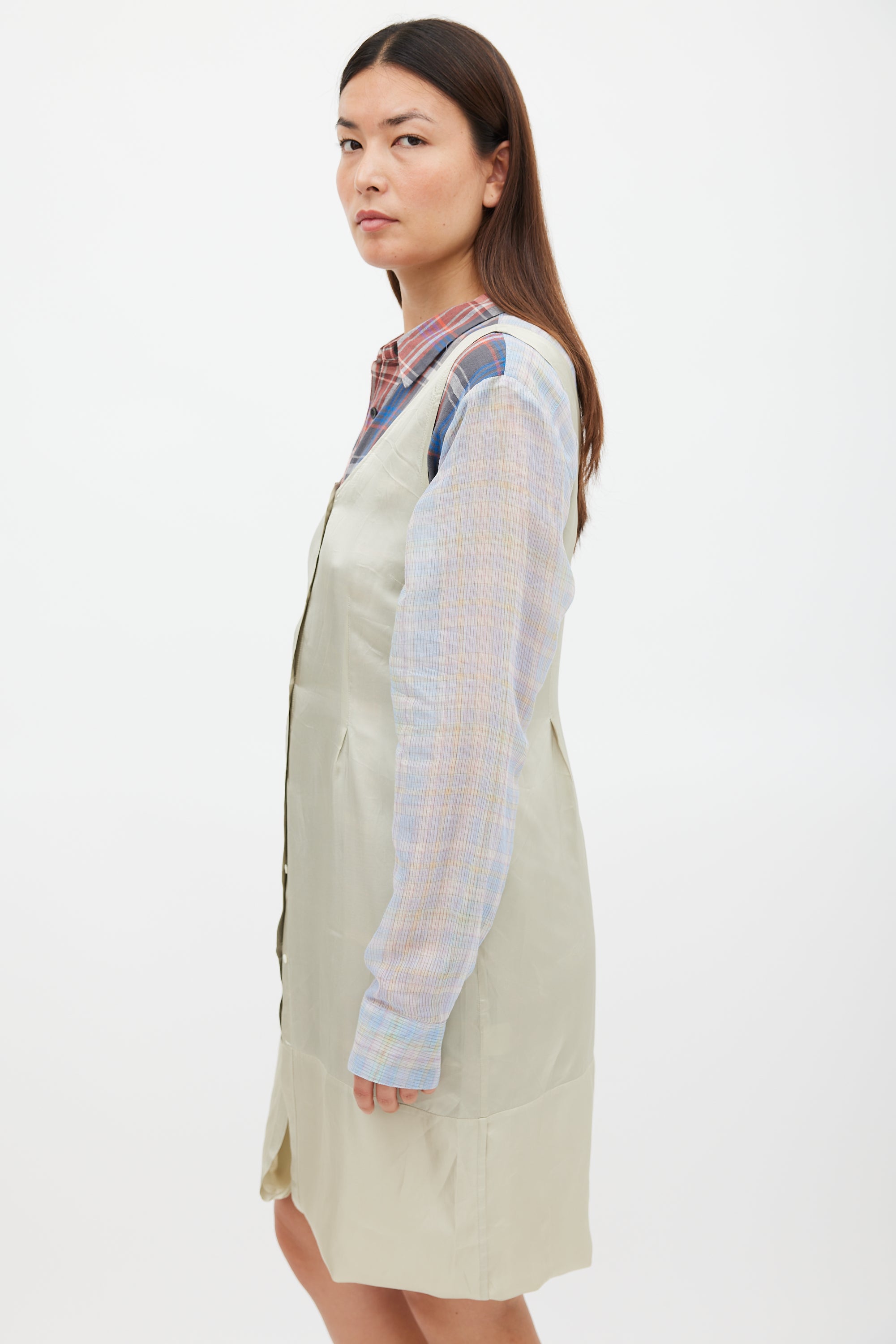 Pre-owned Dries Van Noten Spring/Summer 2013 blue and multicolour midi dress featuring modular layered design, plaid shirt underlayer with collared neck and long sleeves, light grey tank outer layer and button up front.