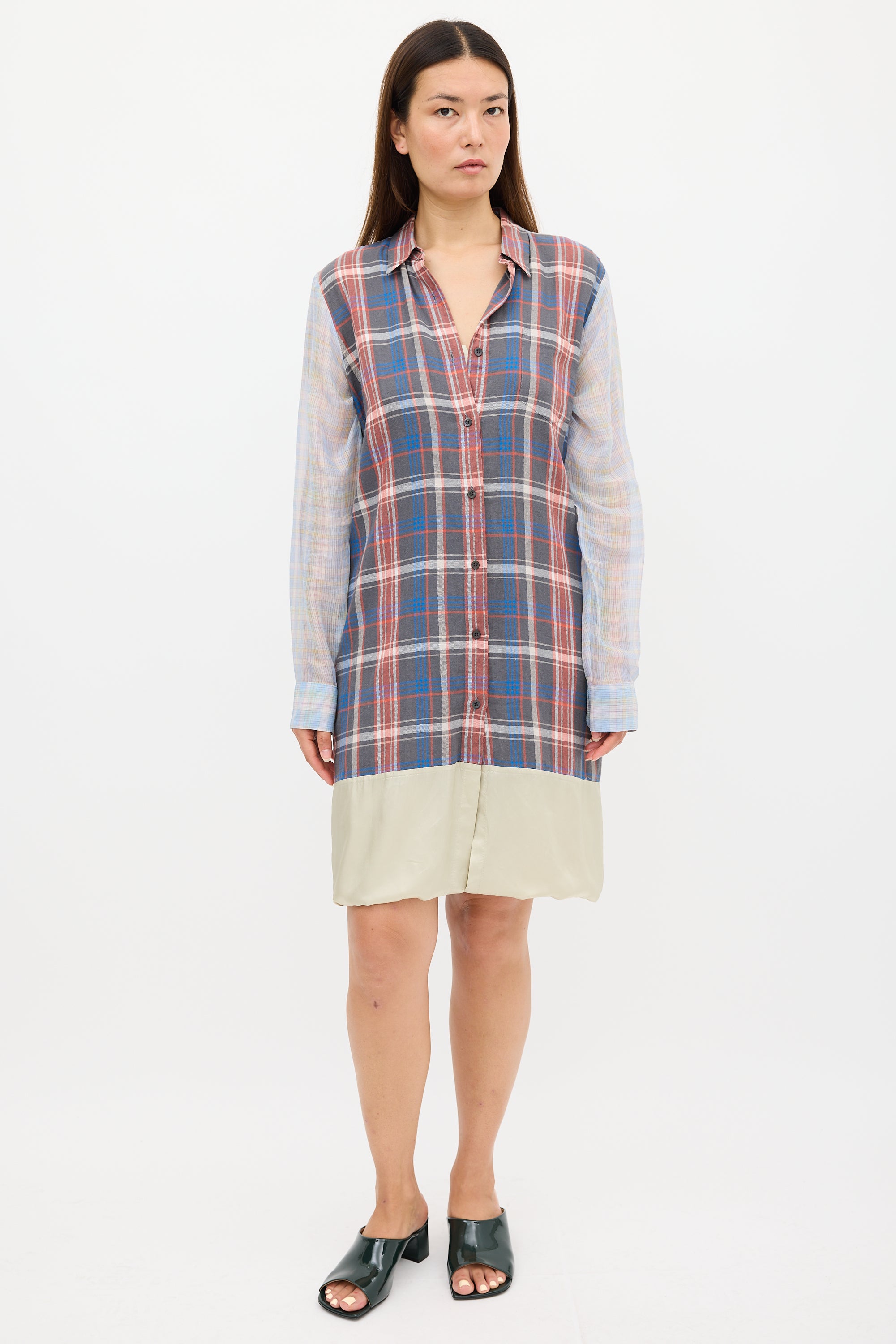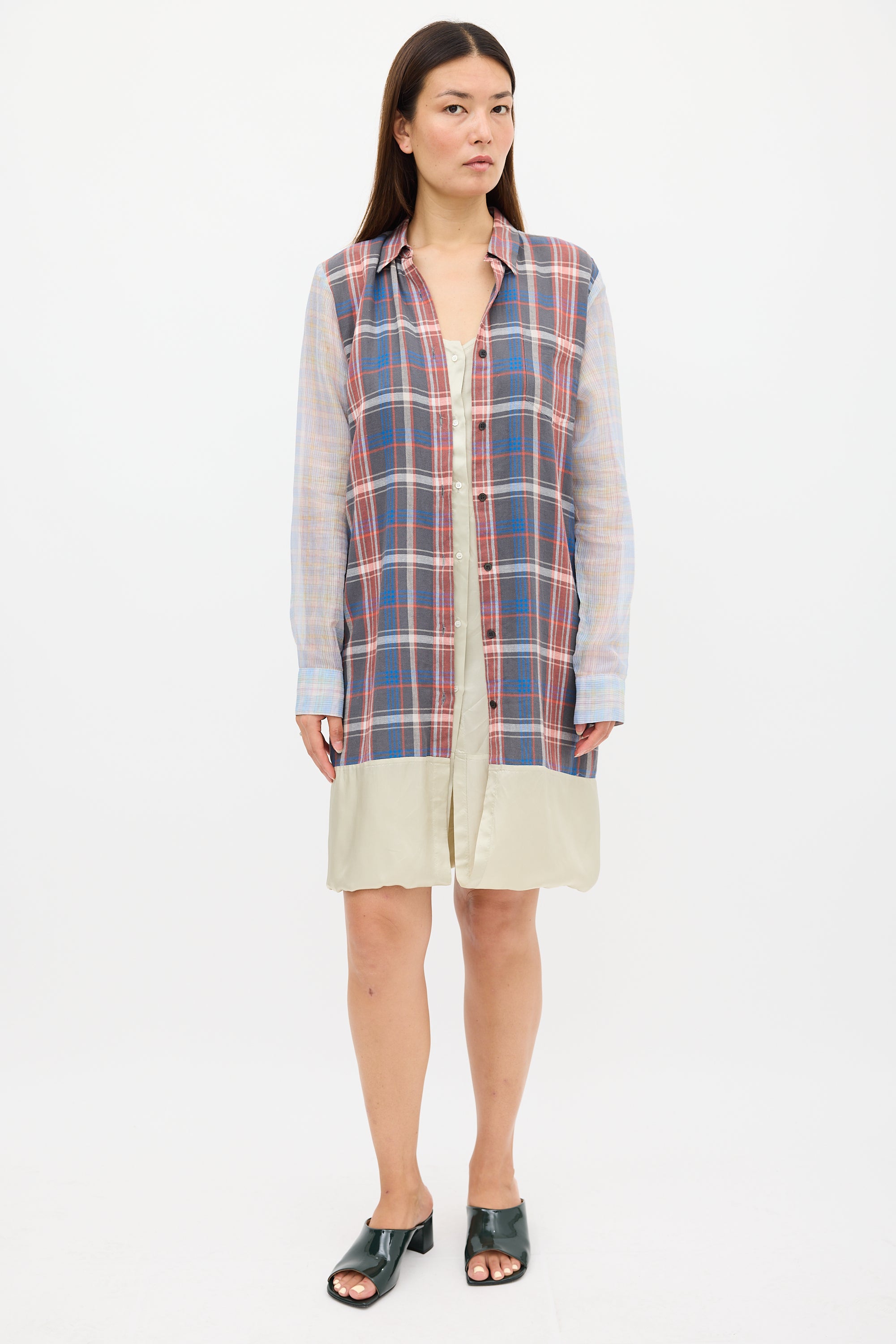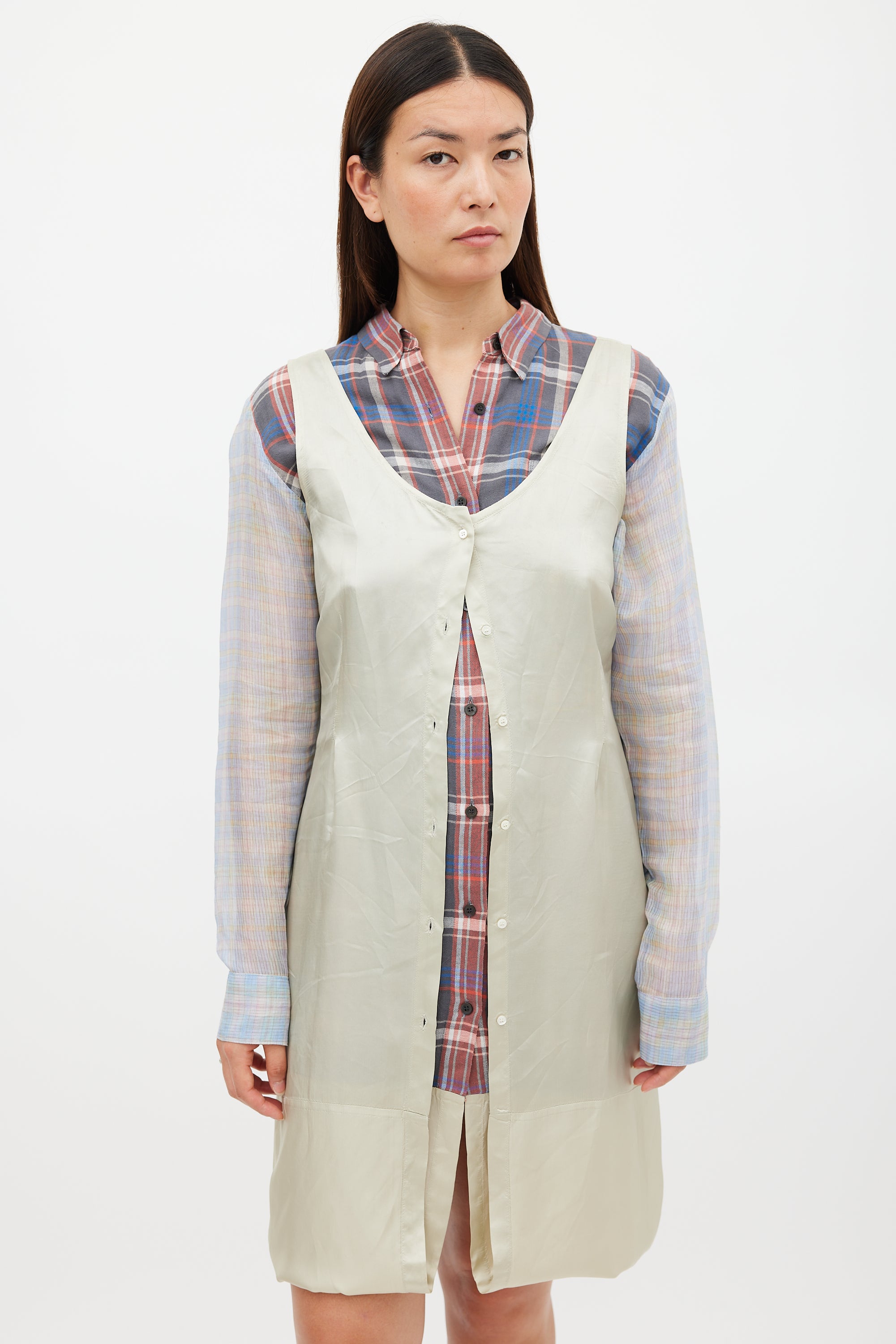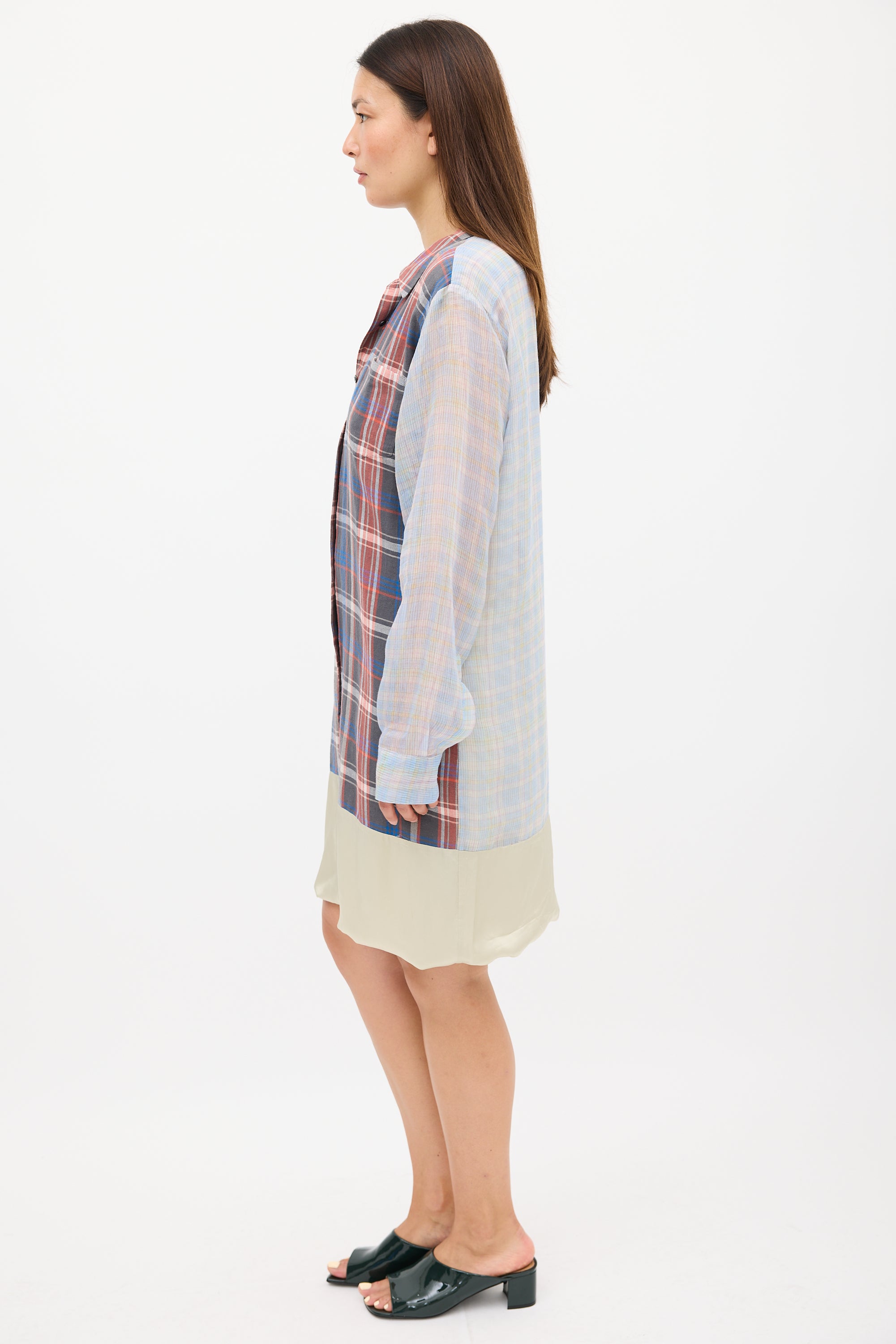 Pre-owned Dries Van Noten Spring/Summer 2013 blue and multicolour midi dress featuring modular layered design, plaid shirt underlayer with collared neck and long sleeves, light grey tank outer layer and button up front.