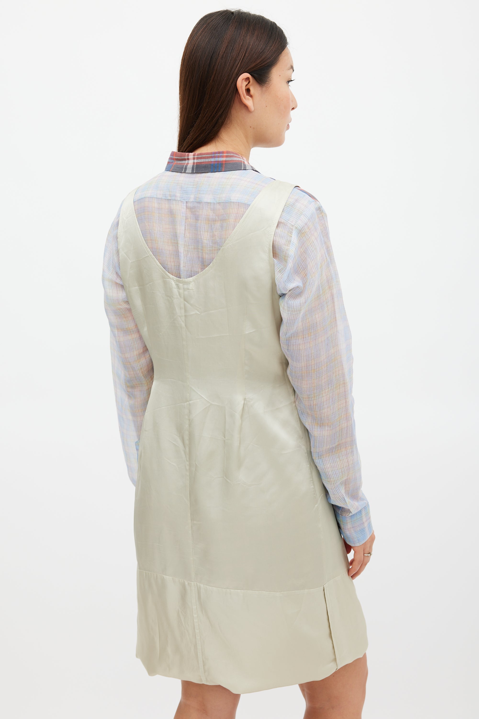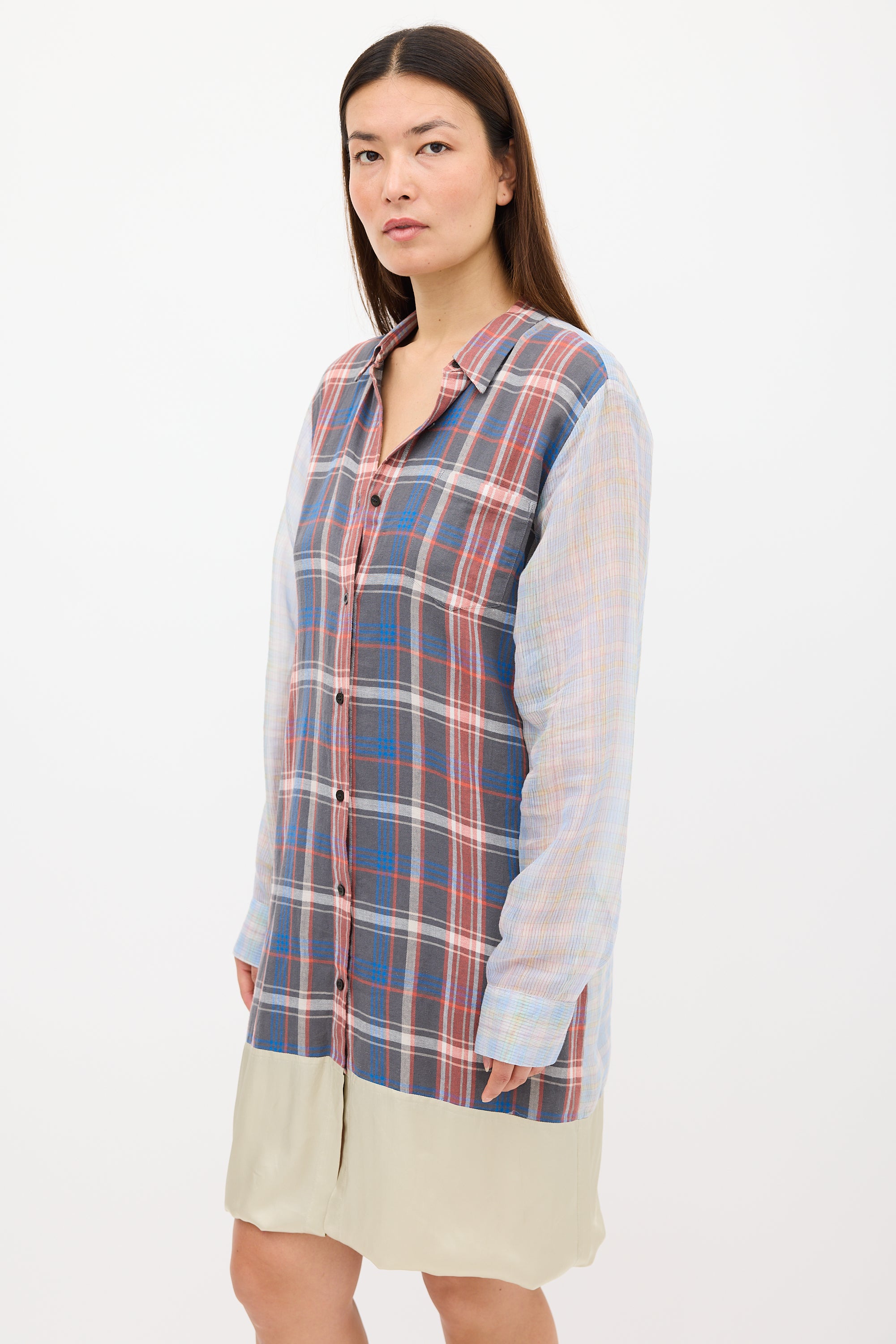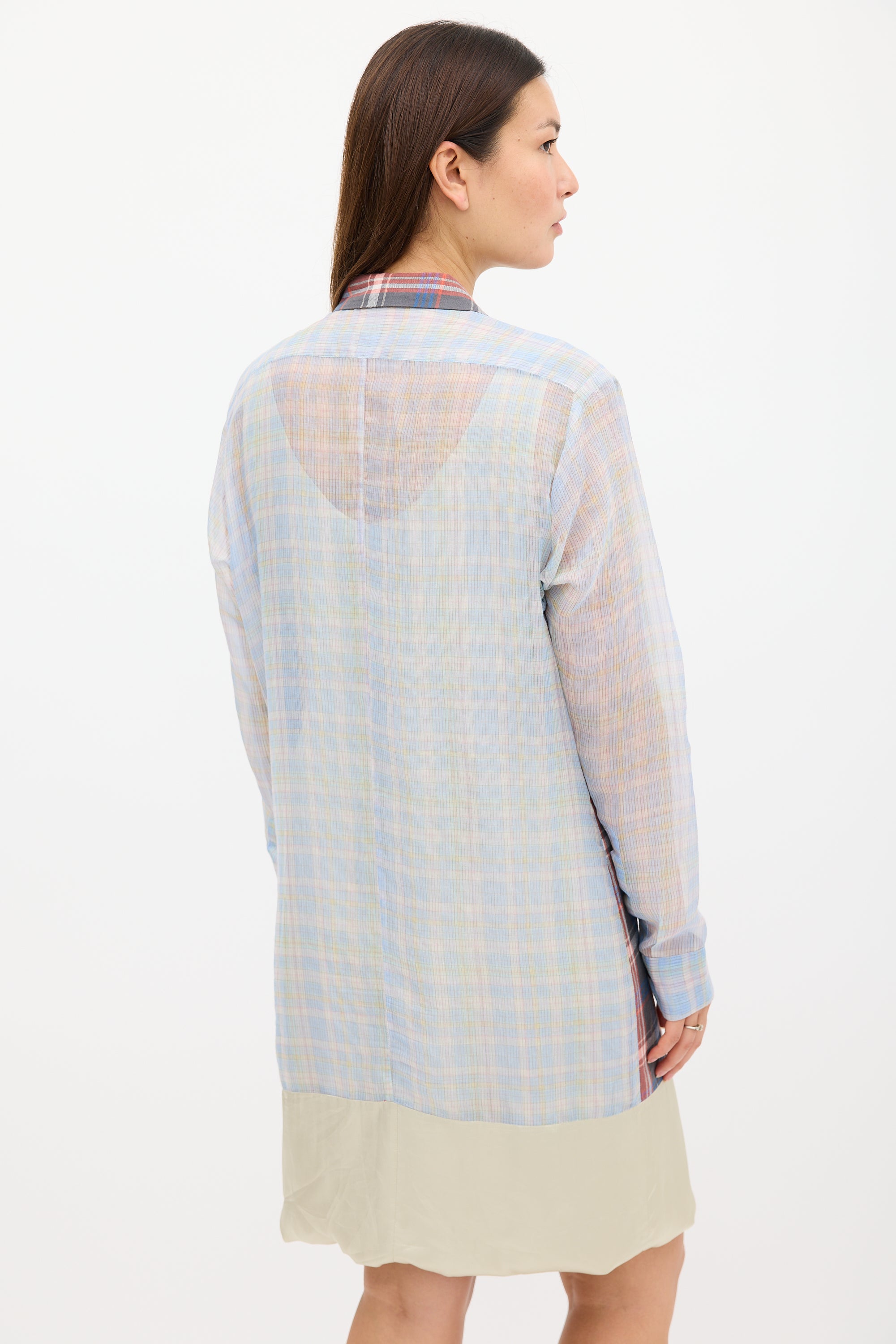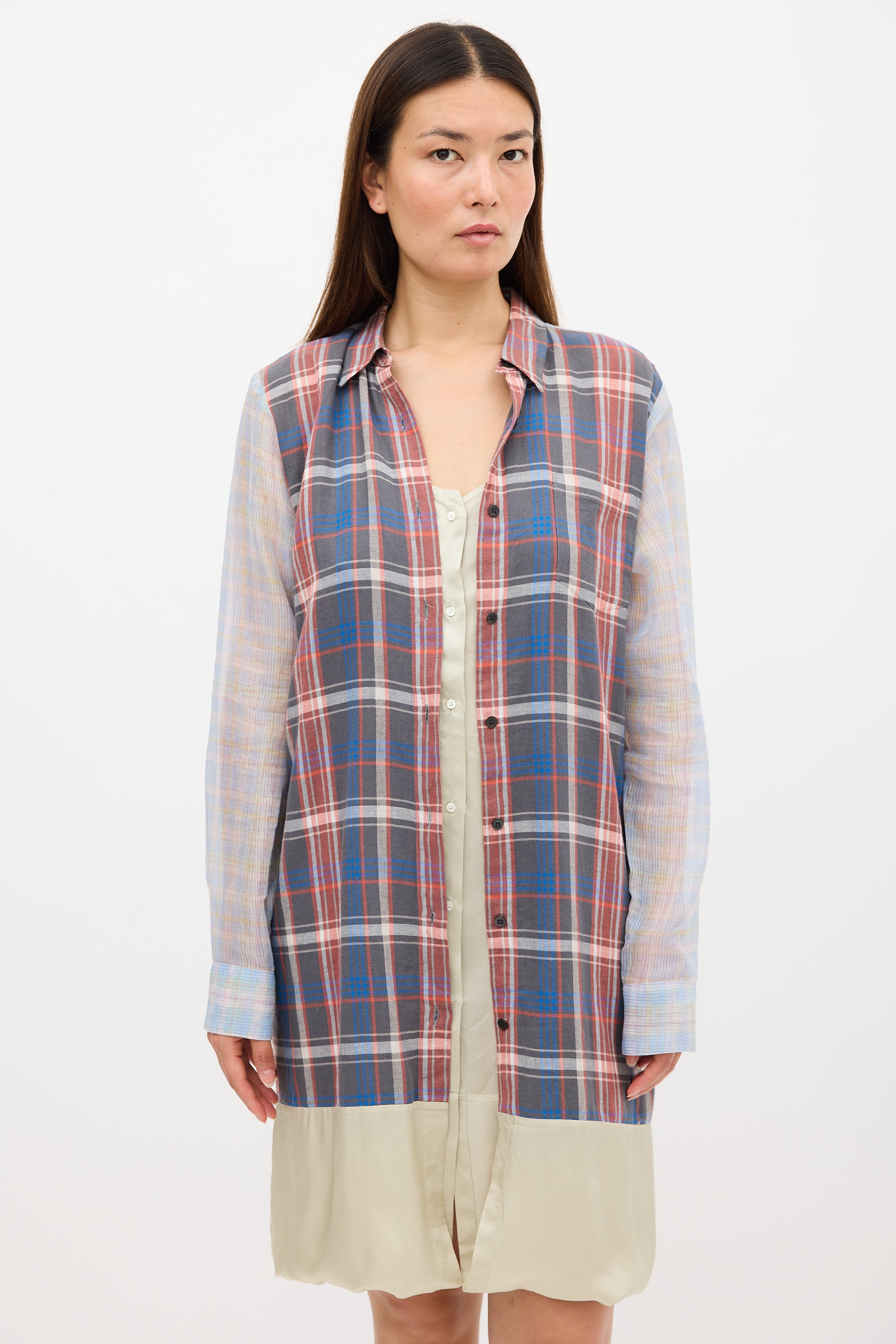 Pre-owned Dries Van Noten Spring/Summer 2013 blue and multicolour midi dress featuring modular layered design, plaid shirt underlayer with collared neck and long sleeves, light grey tank outer layer and button up front.