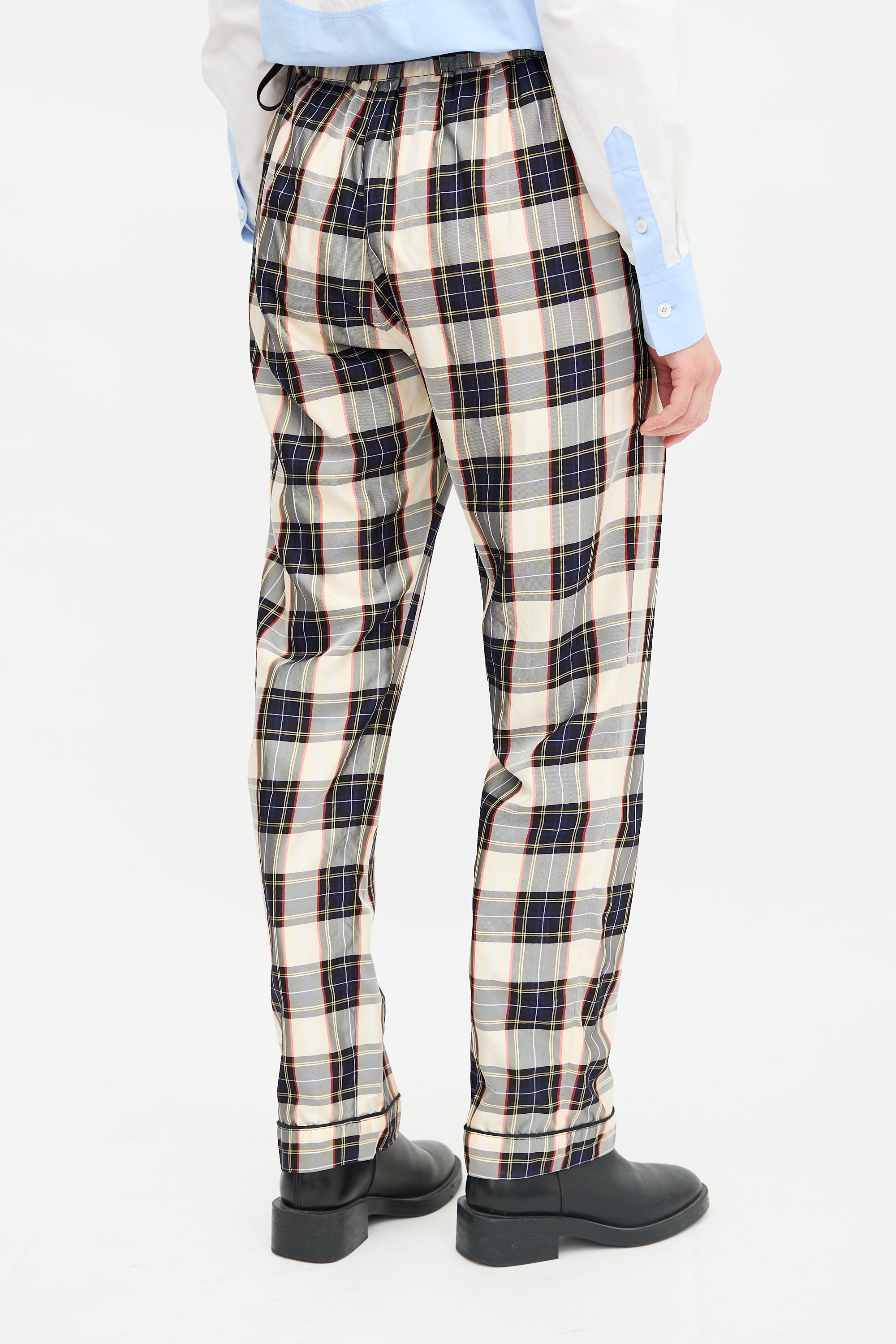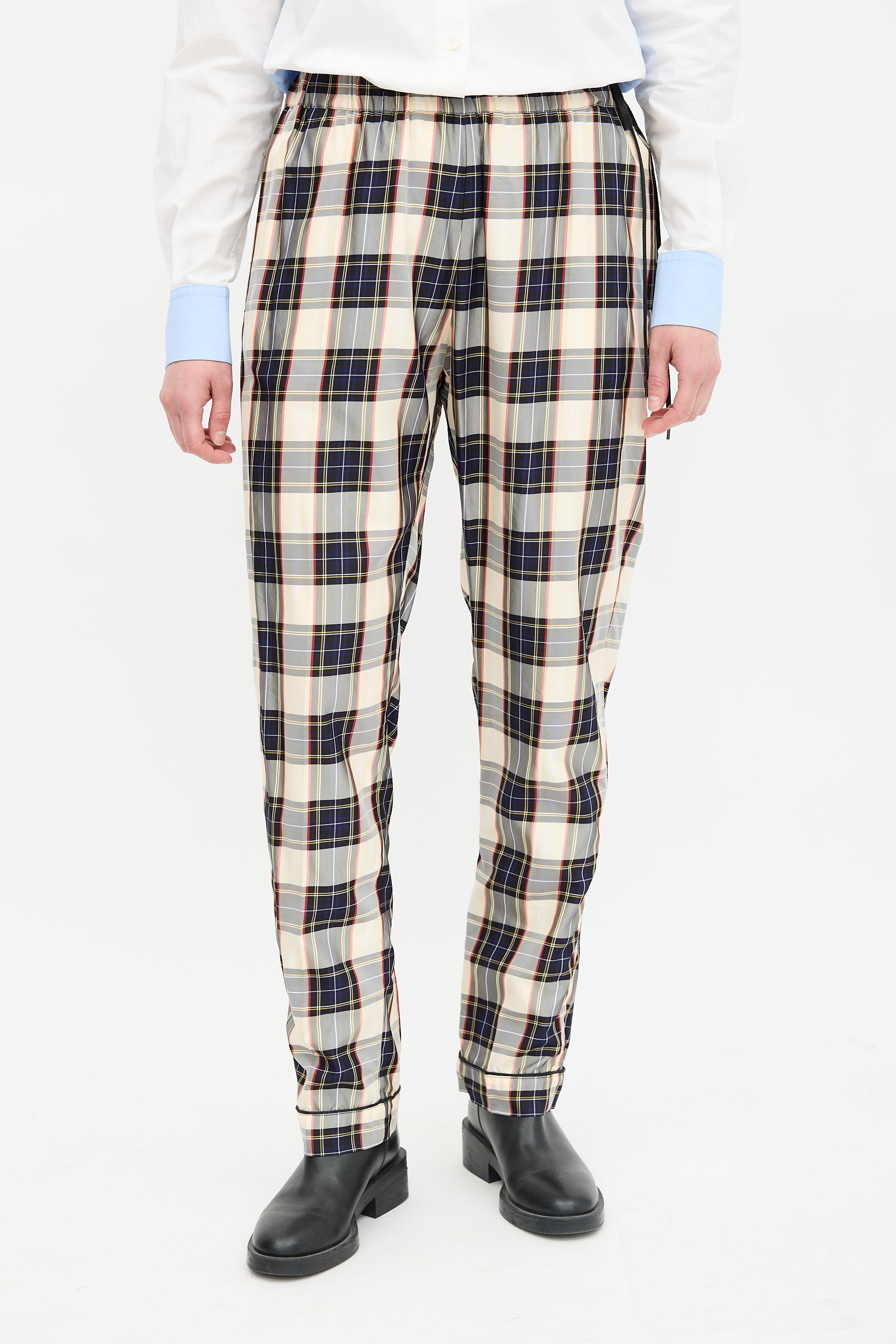 Pre-owned Dries Van Noten cream lounge pants featuring multicolour tartan pattern, elasticized drawstring waistband, two pocket styling, straight leg, and cuffed hem. Unlined.