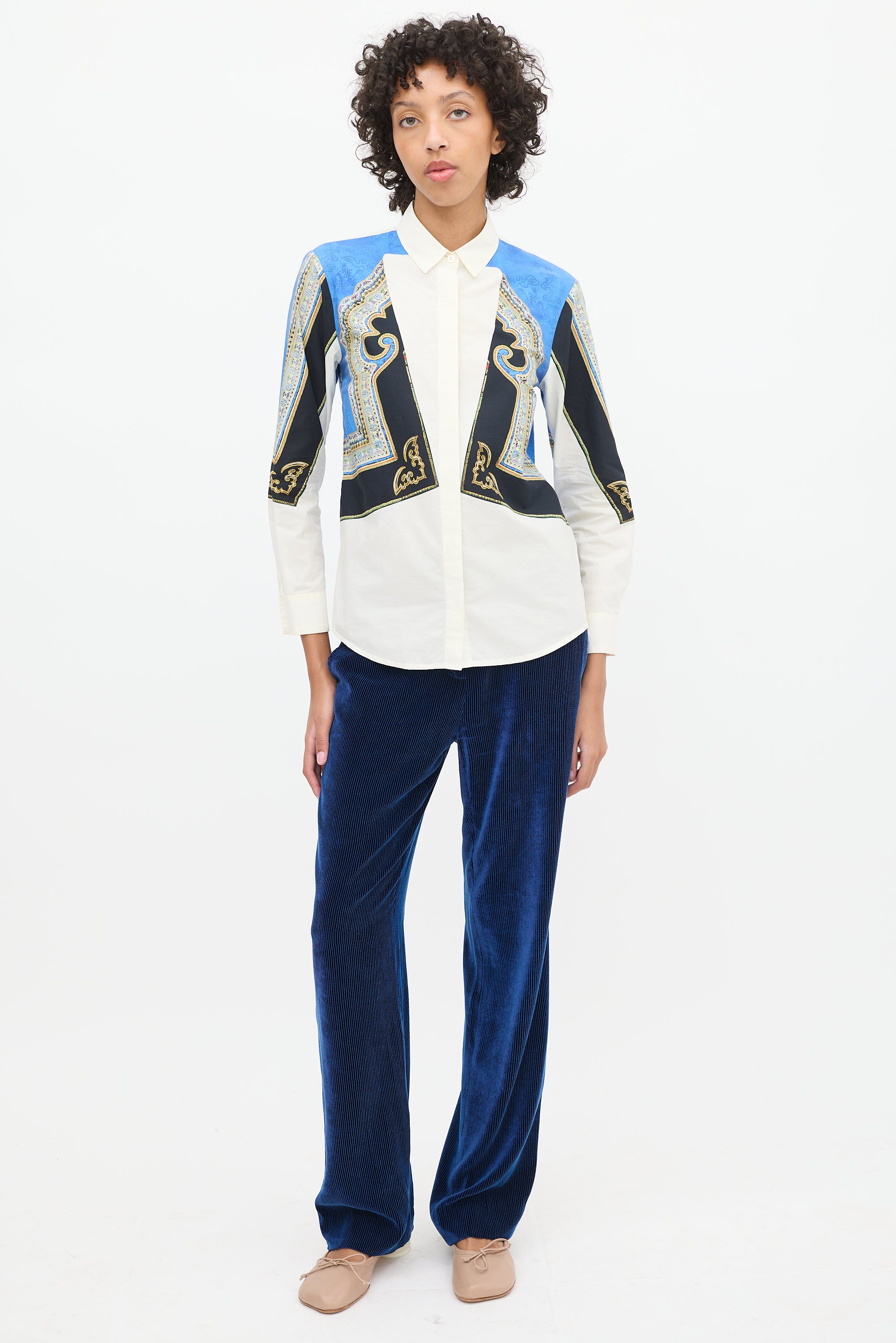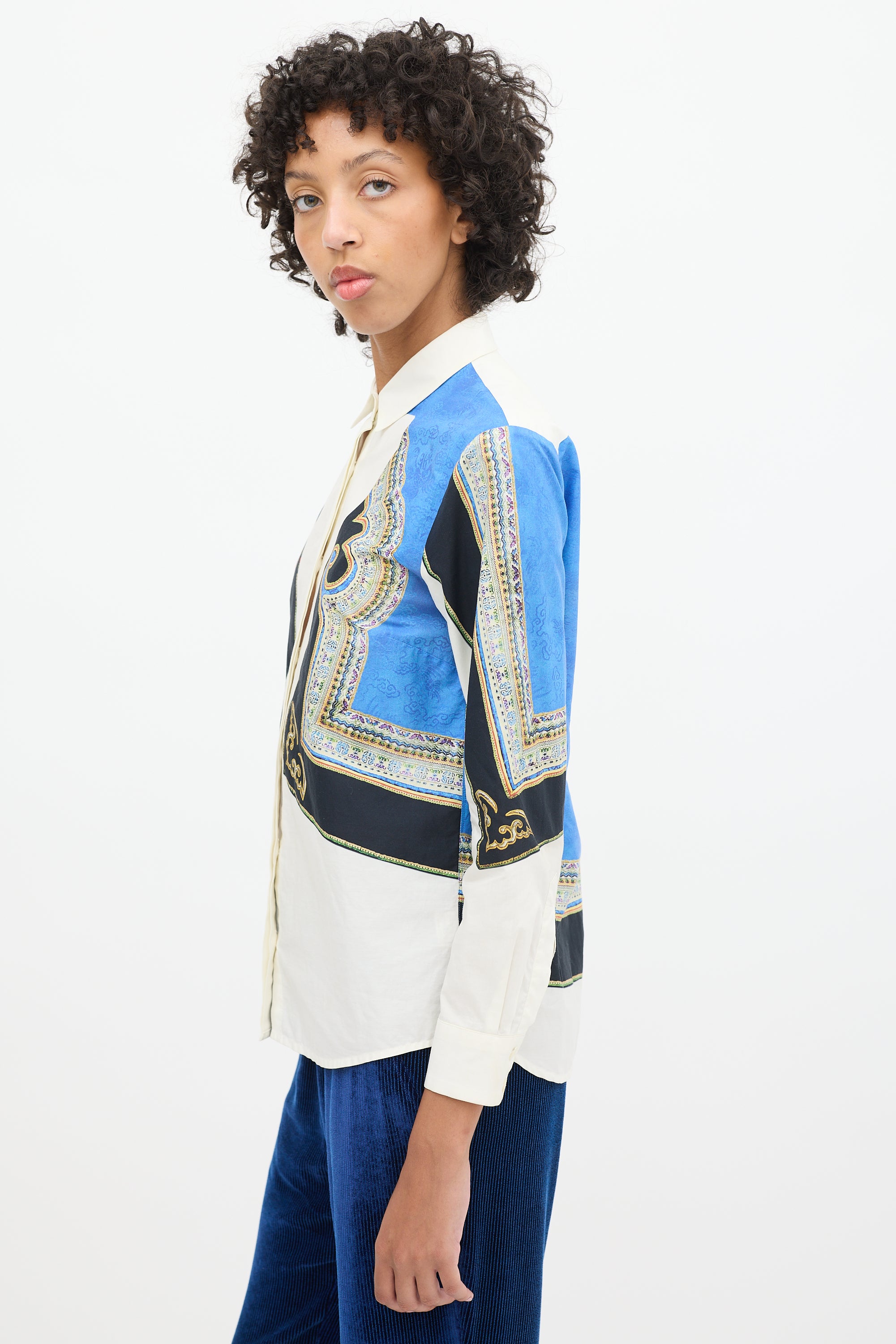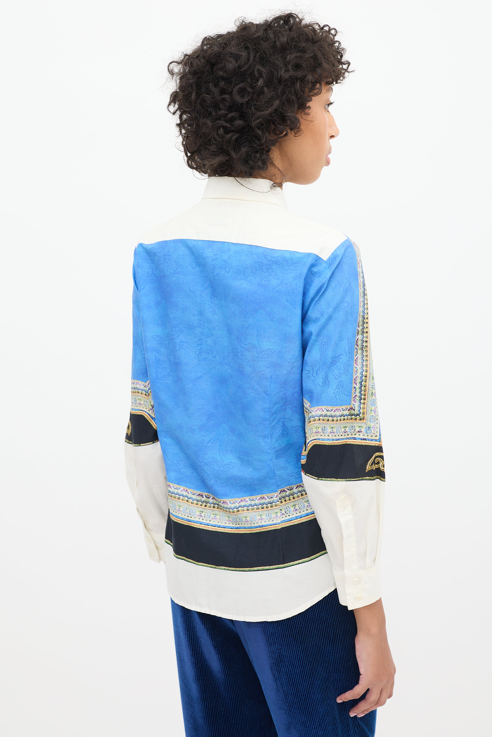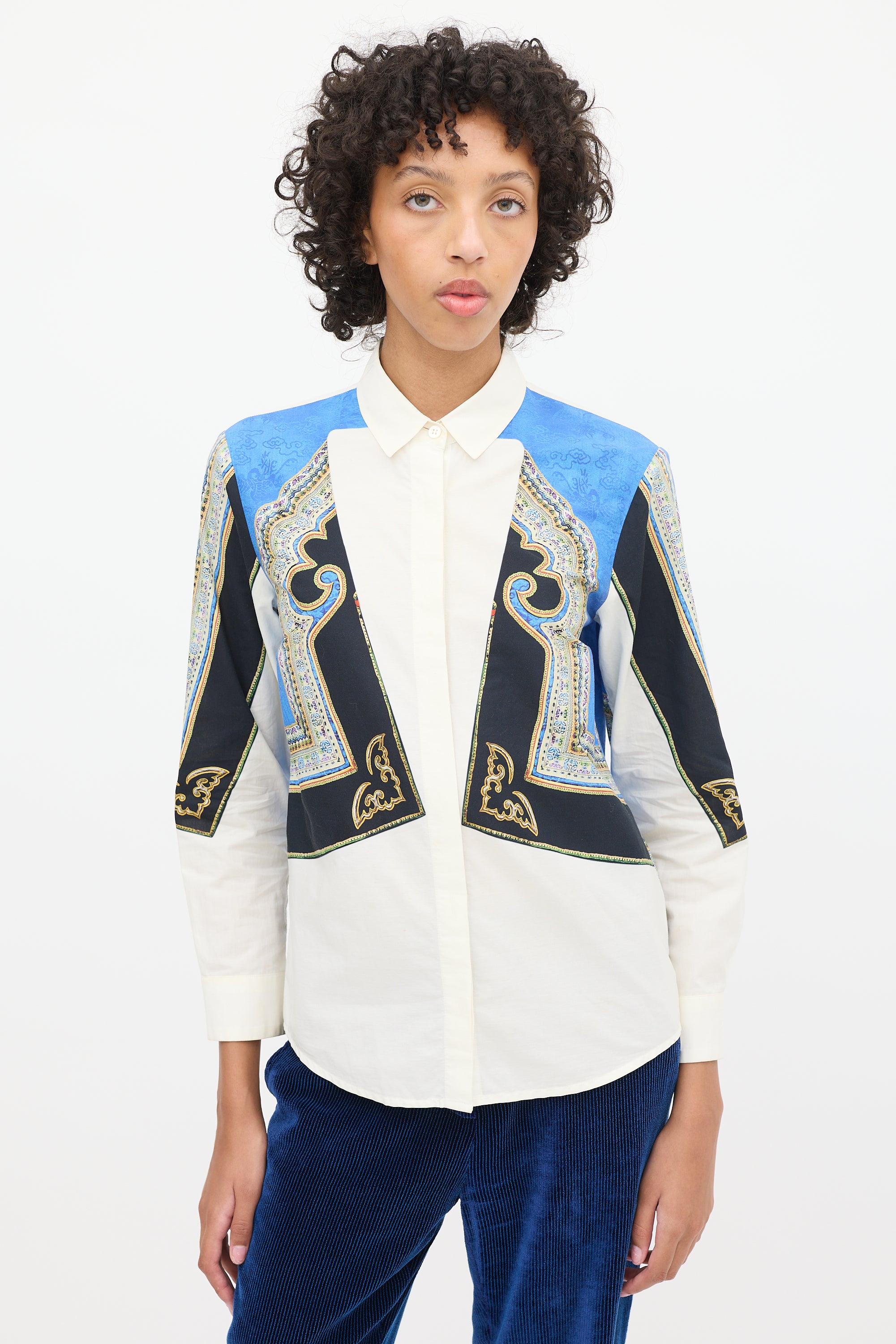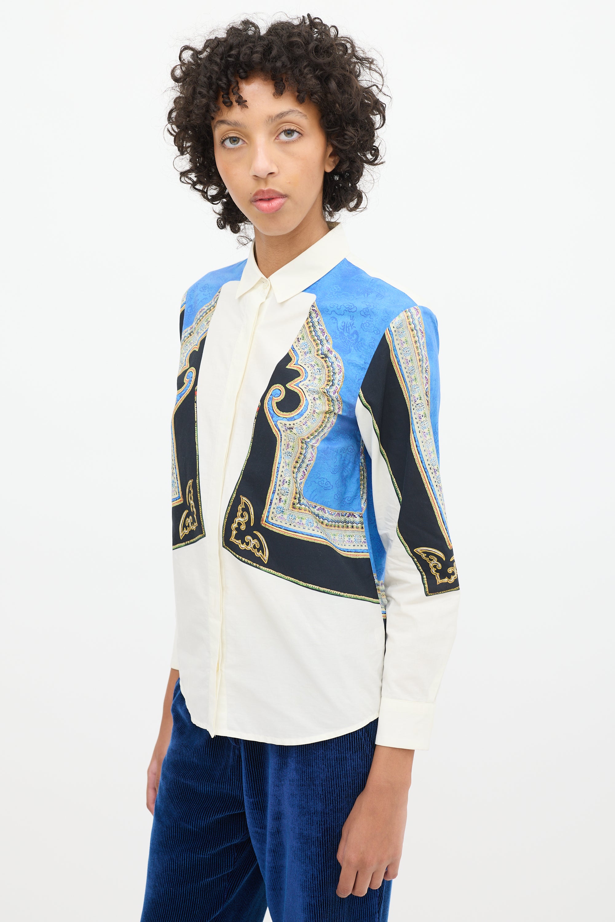 Pre-owned Dries Van Noten white, blue, and multicolour cotton shirt featuring a pointed collar, concealed button up front, ornate panelled print throughout, and long sleeves with buttoned cuffs.