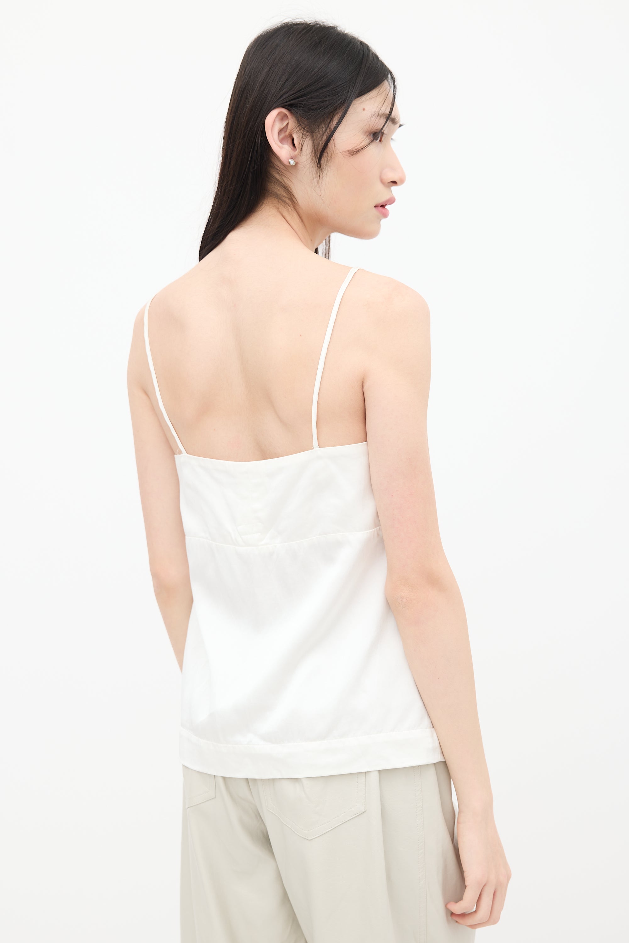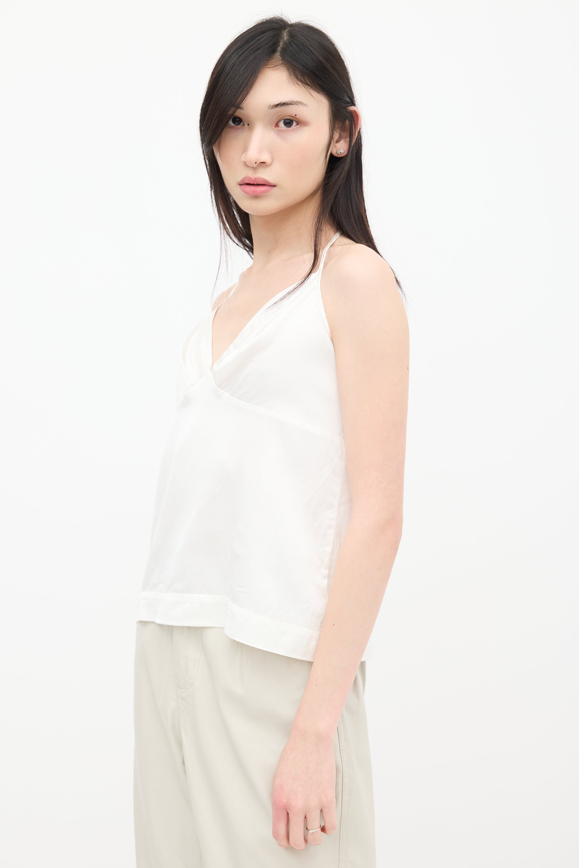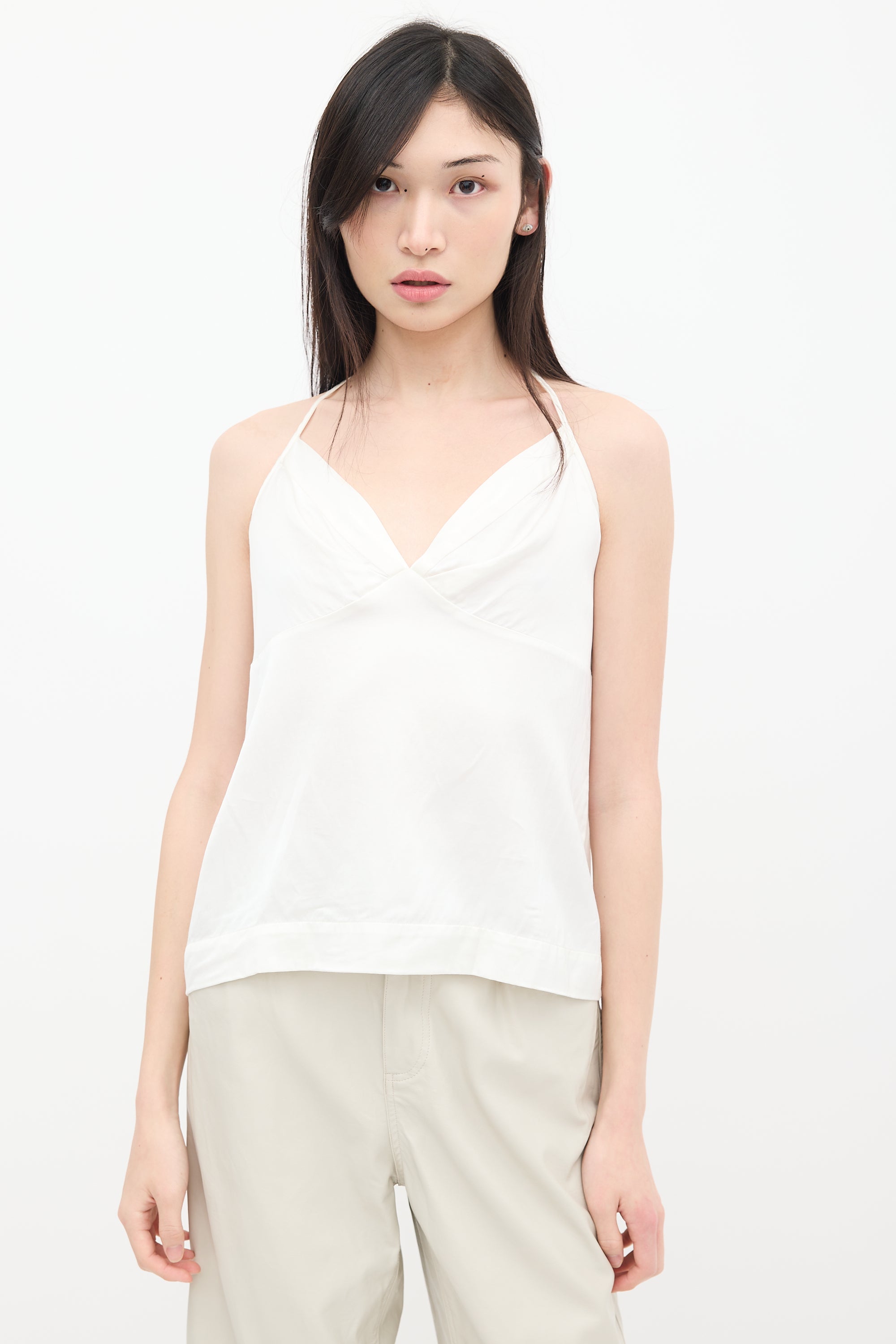 Pre-owned Dries Van Noten white top featuring a V-neckline, sleeveless styling, and pleated bust.