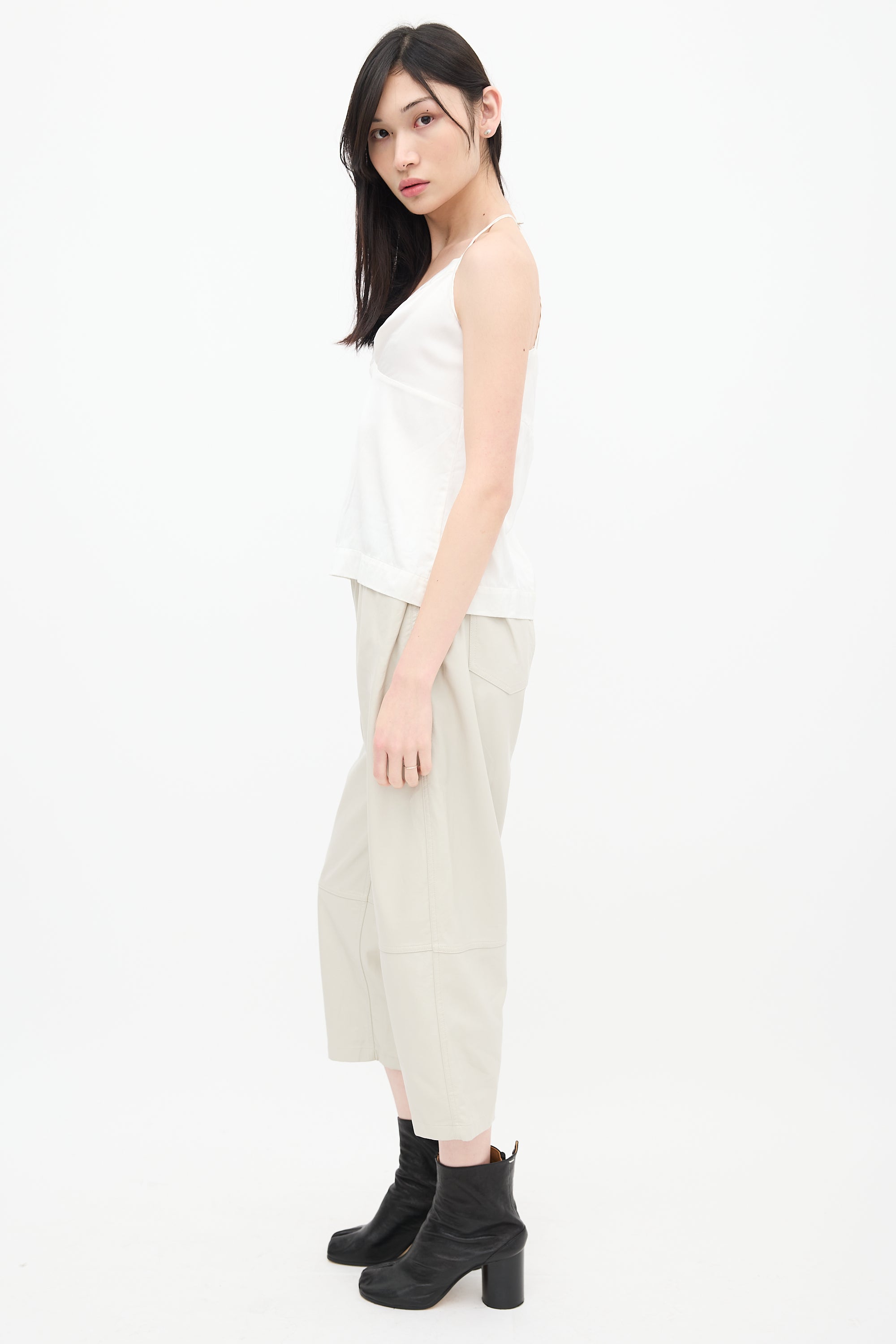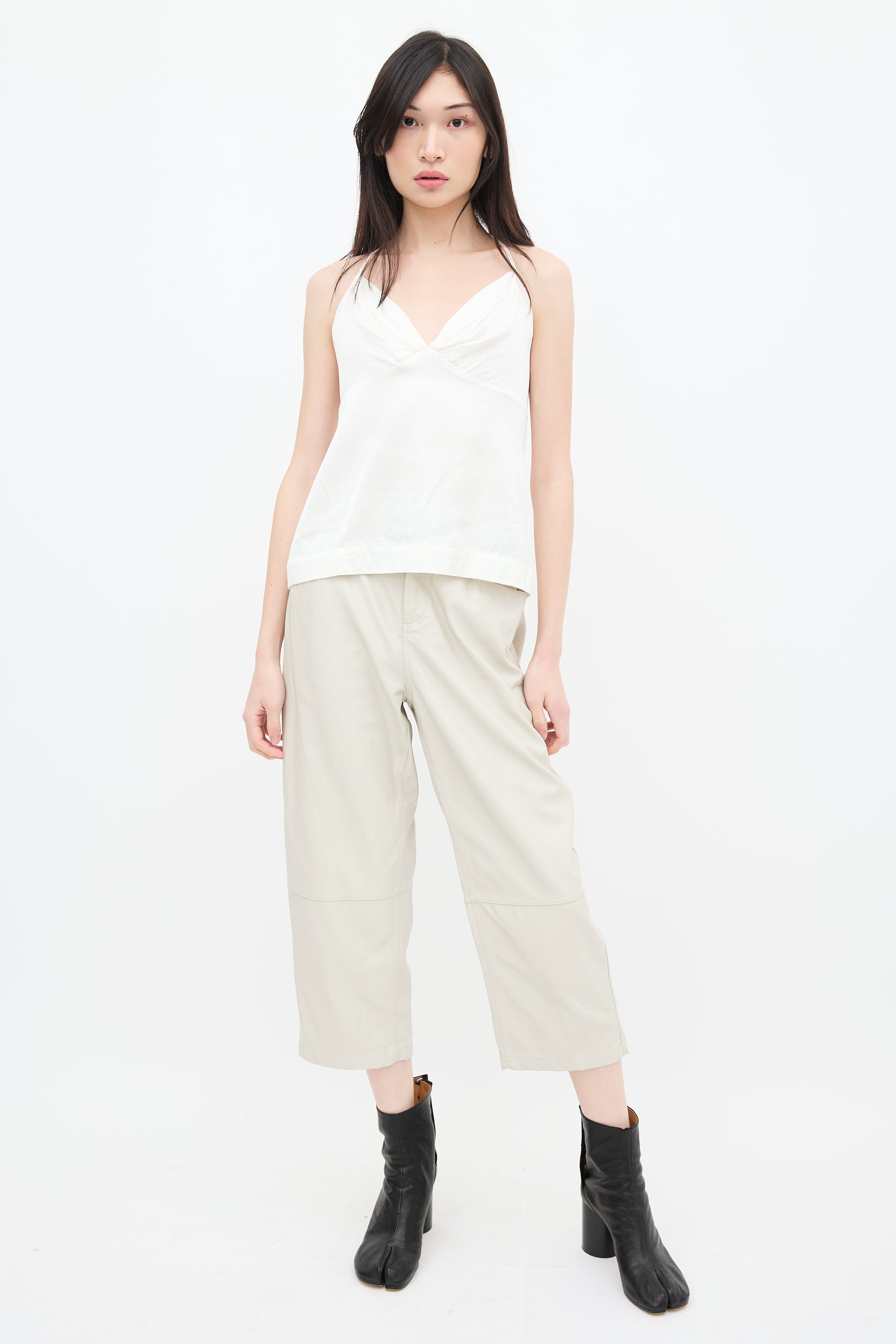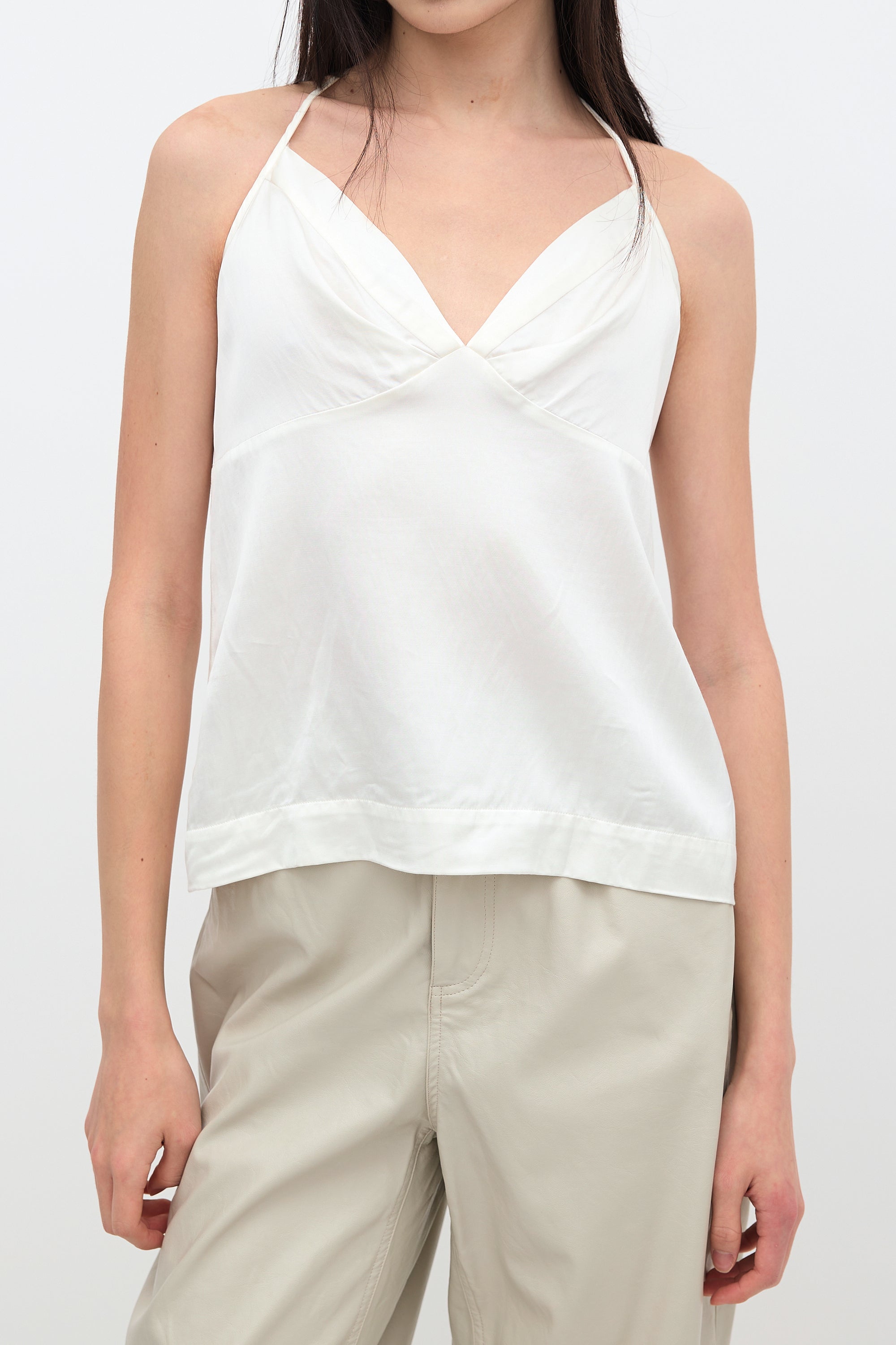 Pre-owned Dries Van Noten white top featuring a V-neckline, sleeveless styling, and pleated bust.
