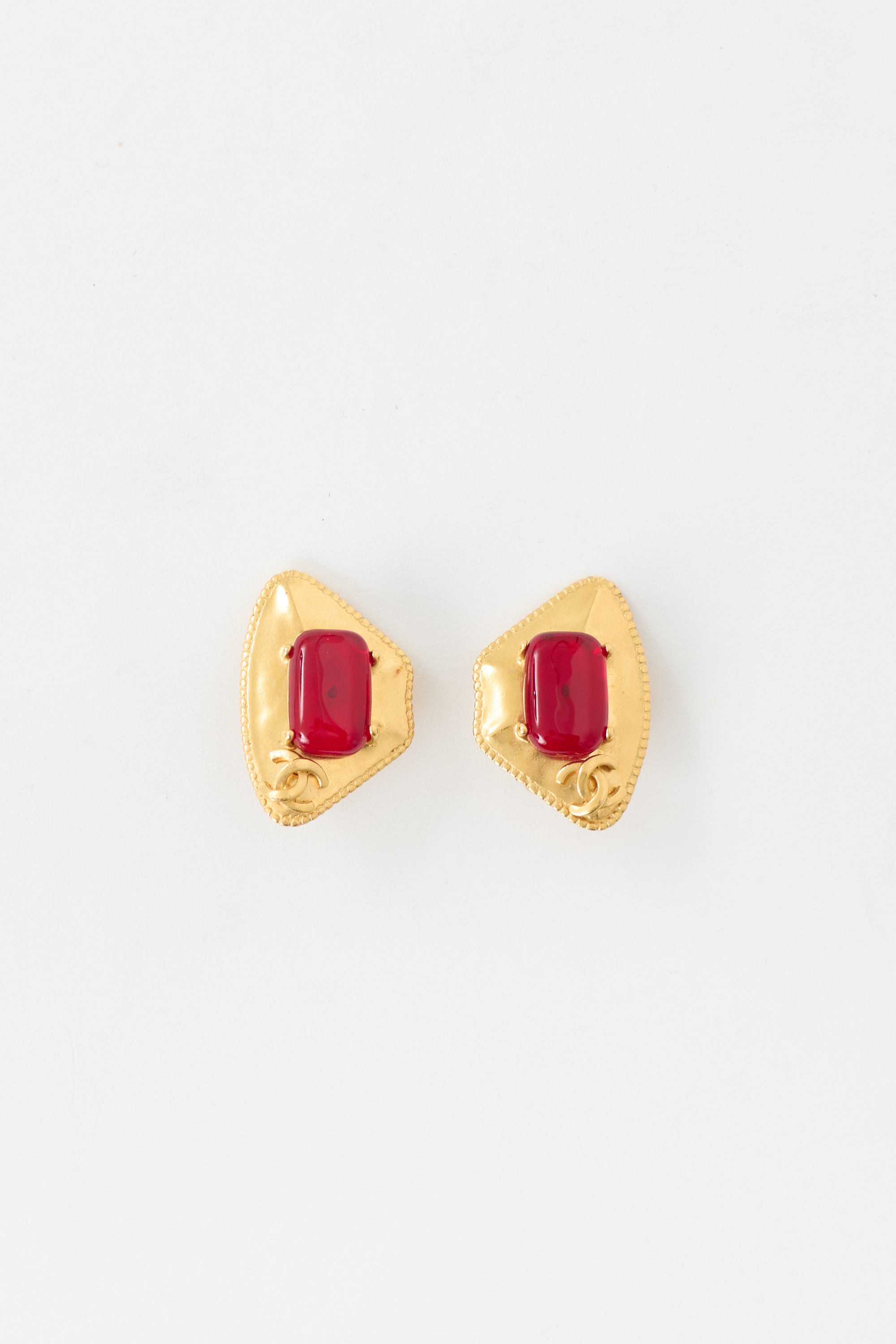 Pre-owned Chanel Fall 1997 gold tone earrings featuring geometric motif, red gem at centre, prong setting, interlocking CC logo, engraved logo at back, and clip on back.