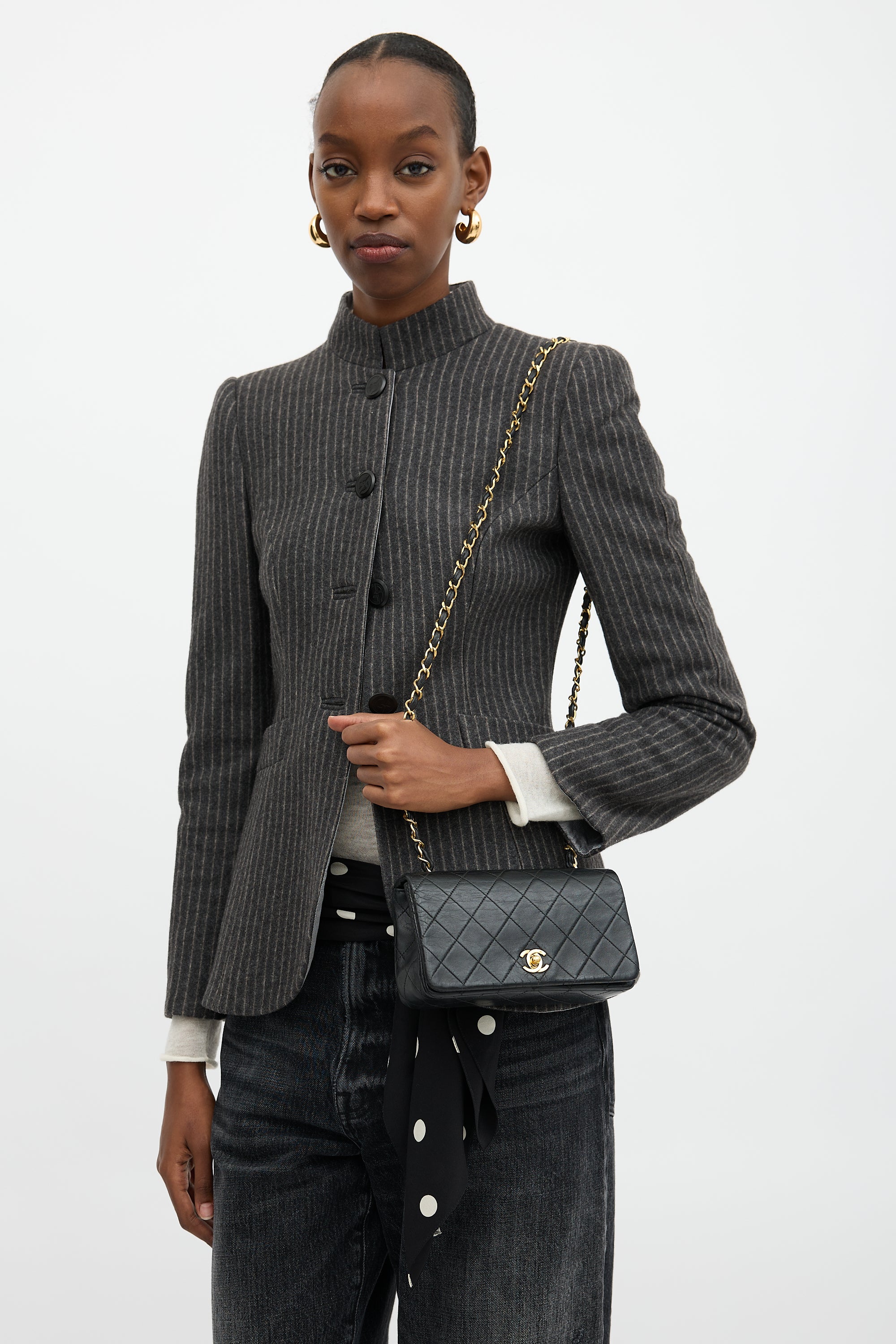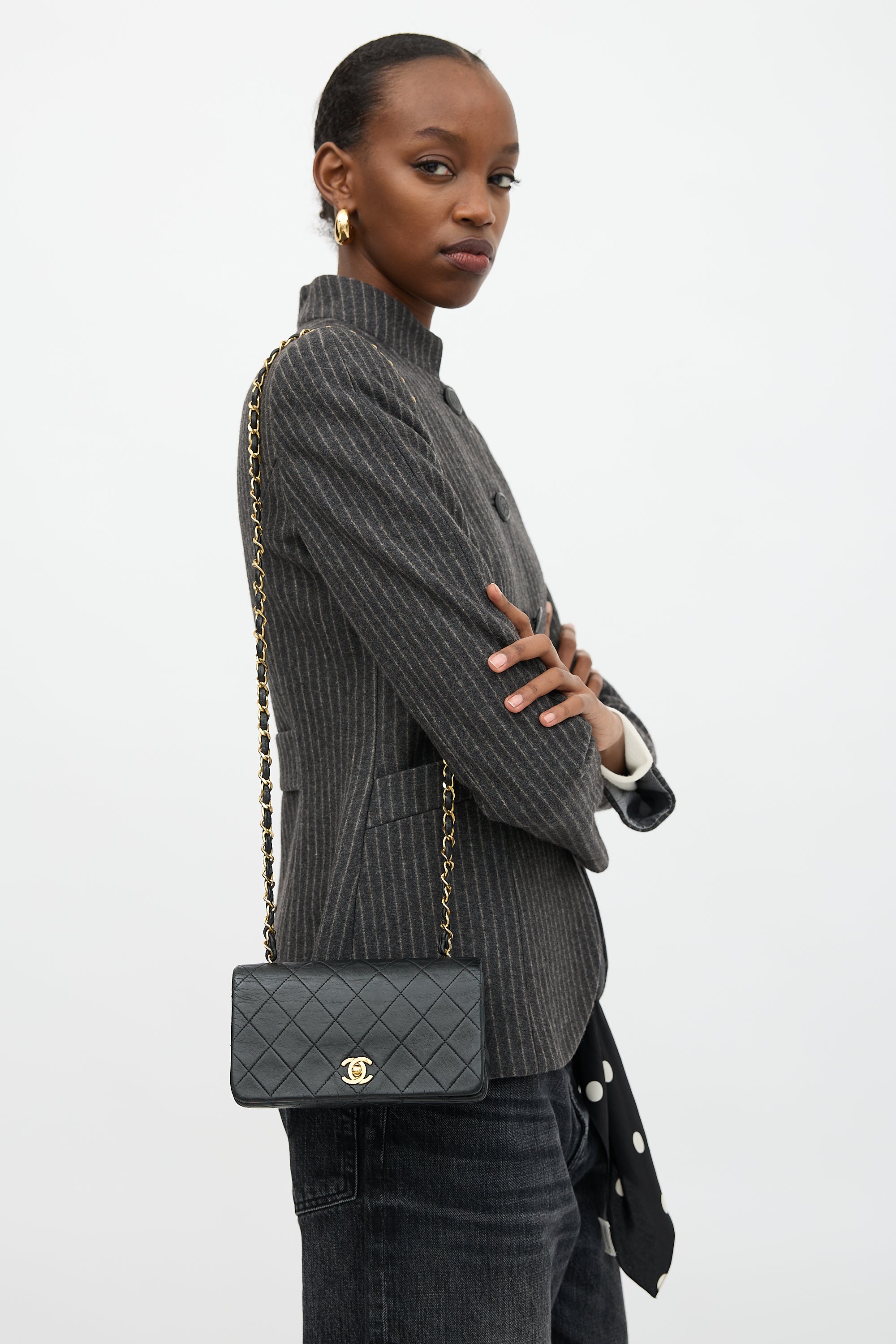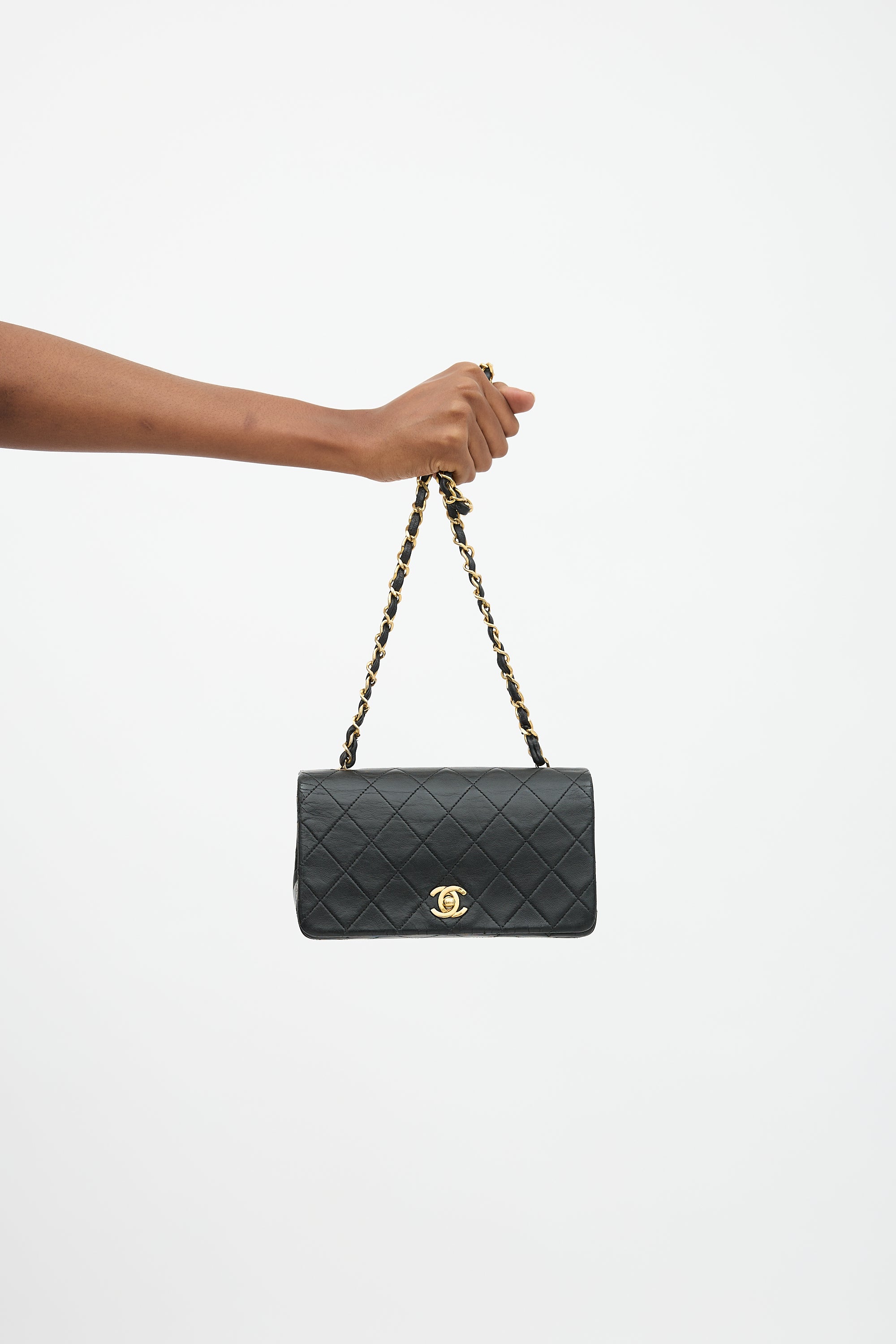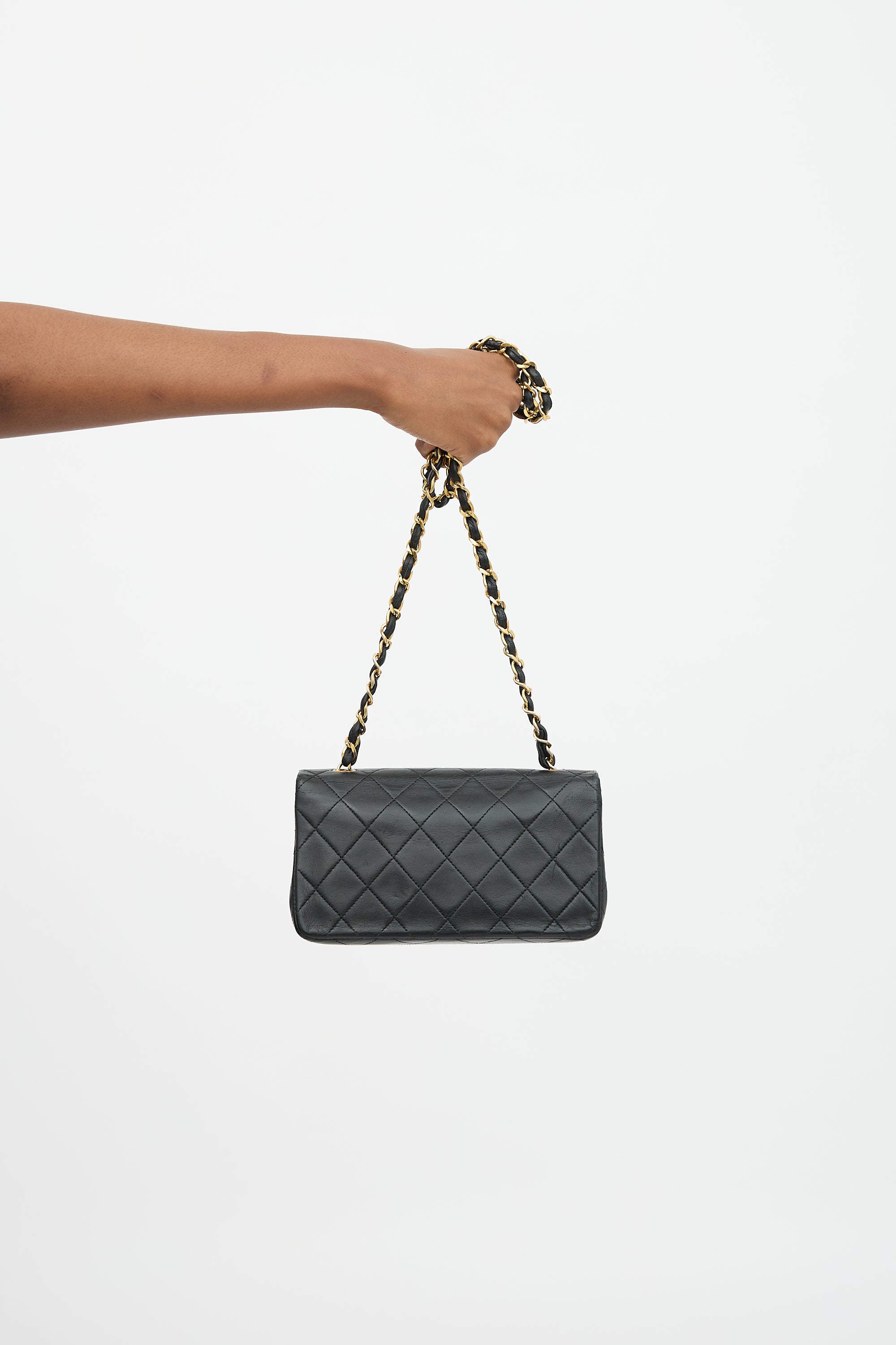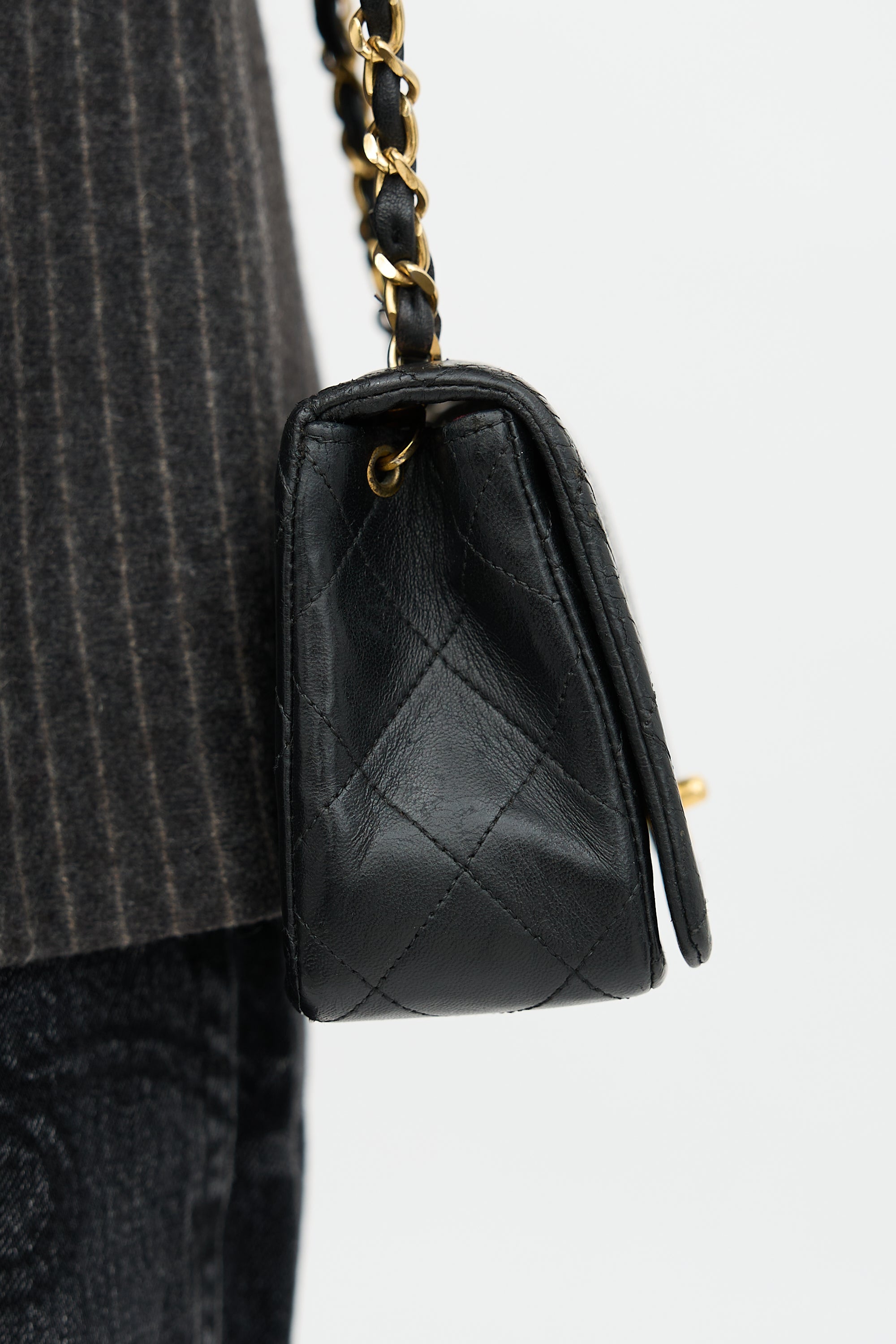 Pre-owned Chanel 1989-1991 black leather mini flap bag featuring diamond quilt stitching, gold tone hardware, removable braided leather and chain shoulder strap, front flap, interlocking CC turn lock closure, stitched CC and printed logos under flap, and one lined main compartment with two slip pockets.
