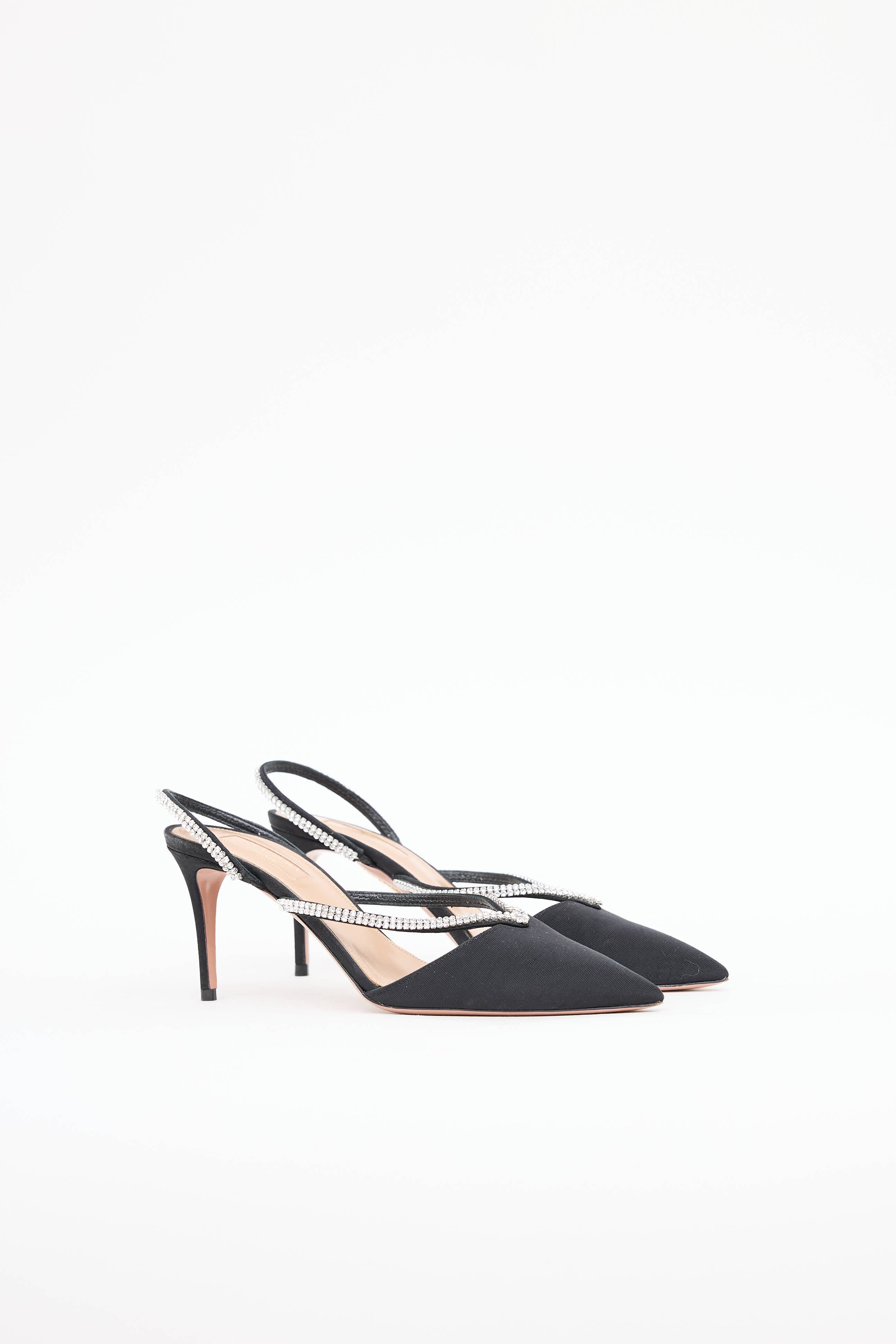 Pre-owned Aquazzura black Eden heels featuring a pointed toe, textile upper, crystal embellished straps, a covered heel and a partially elastic sling back strap.