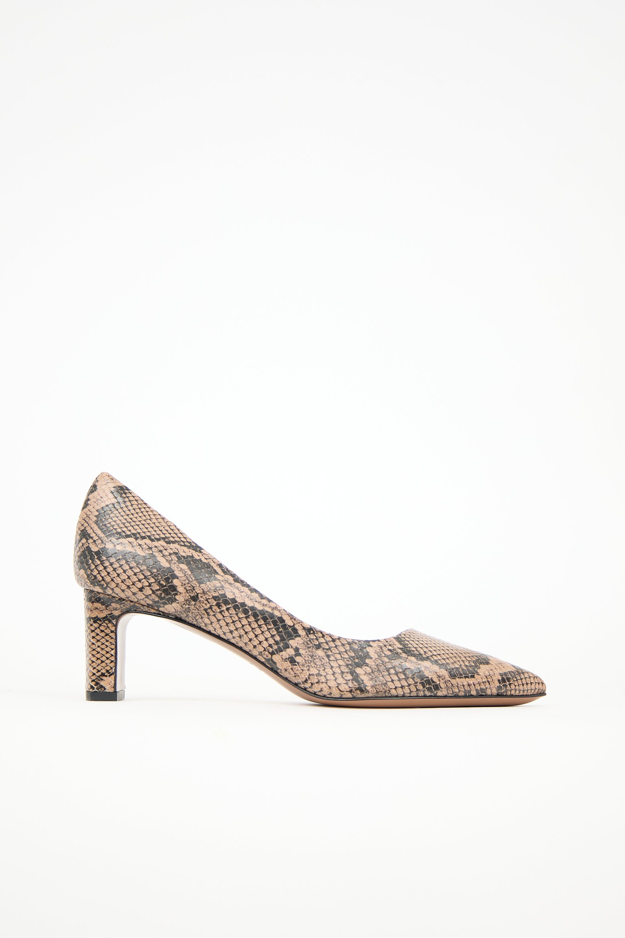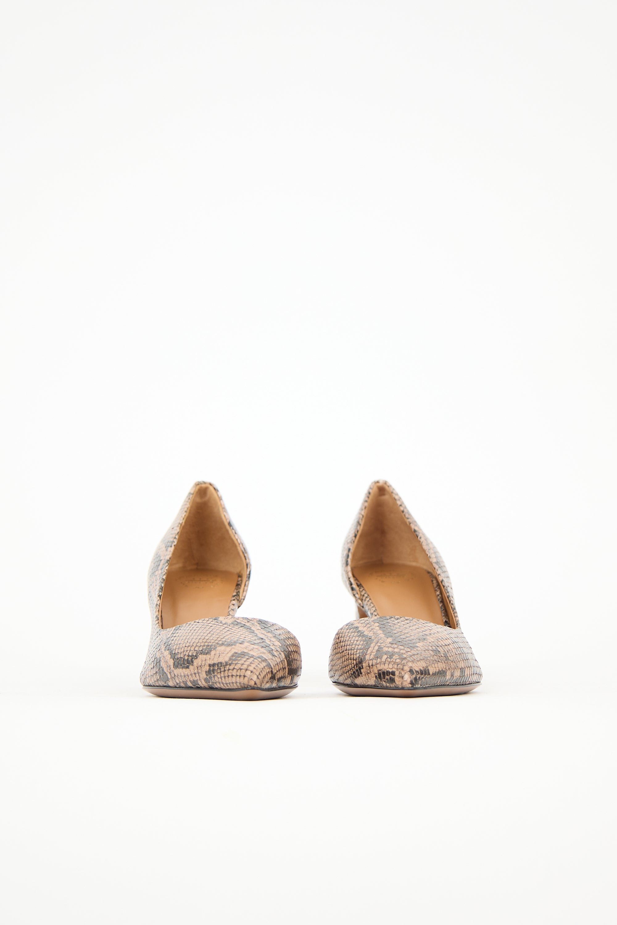 Pre-owned ATP Atelier brown and black embossed leather Carmiano pumps featuring pointed toe, printed upper, D'Orsay design, and covered block heel. Comes with original dust bag.