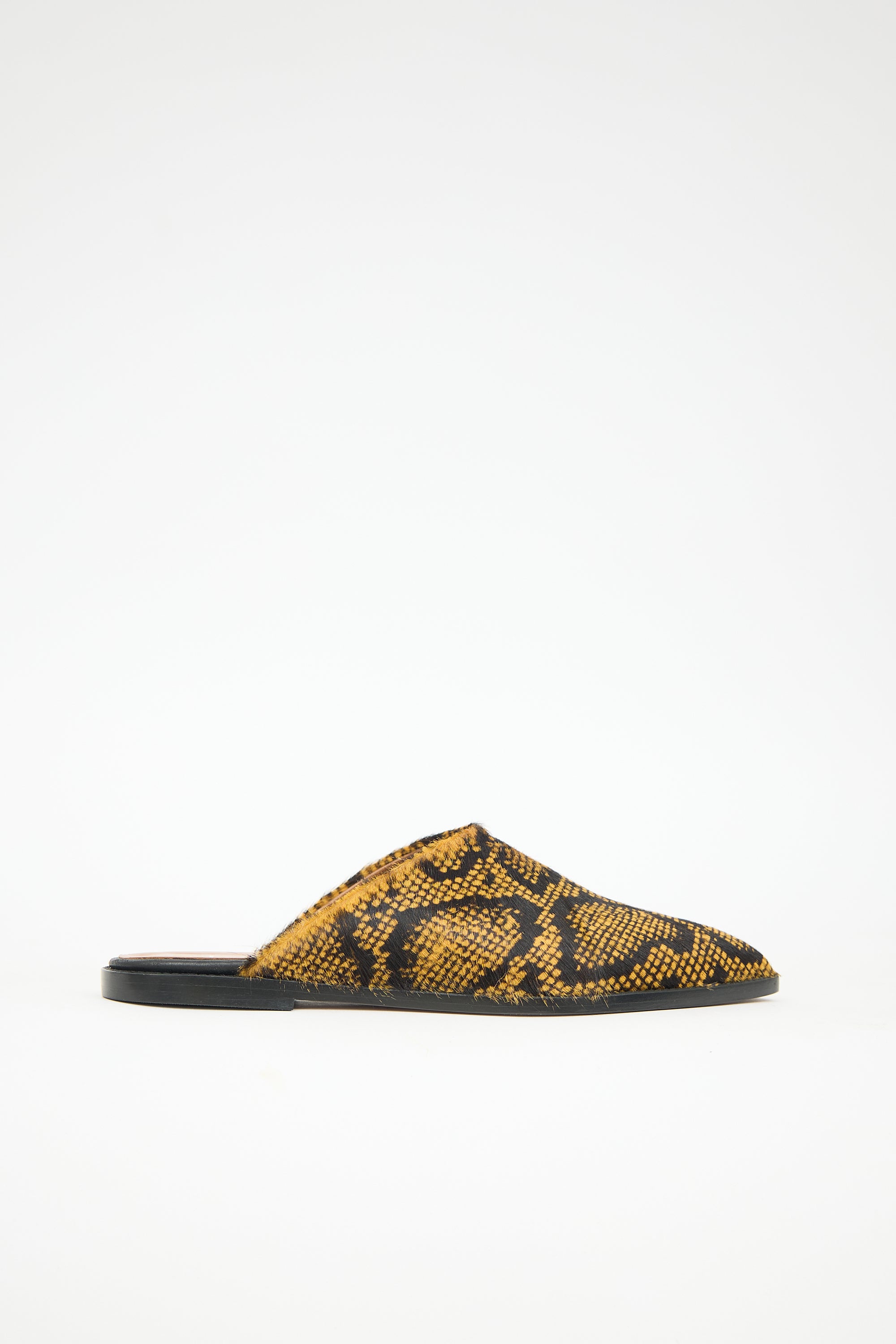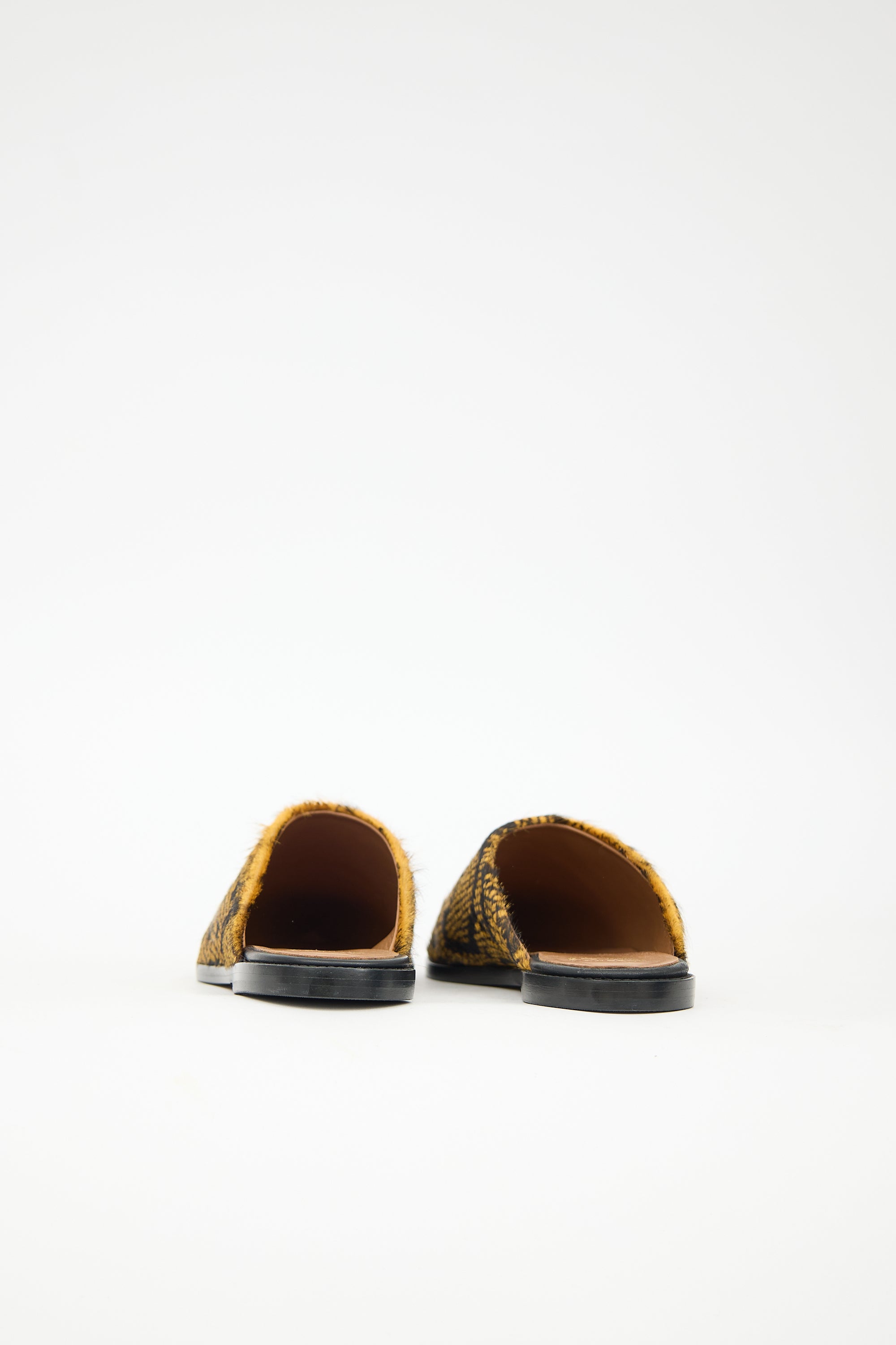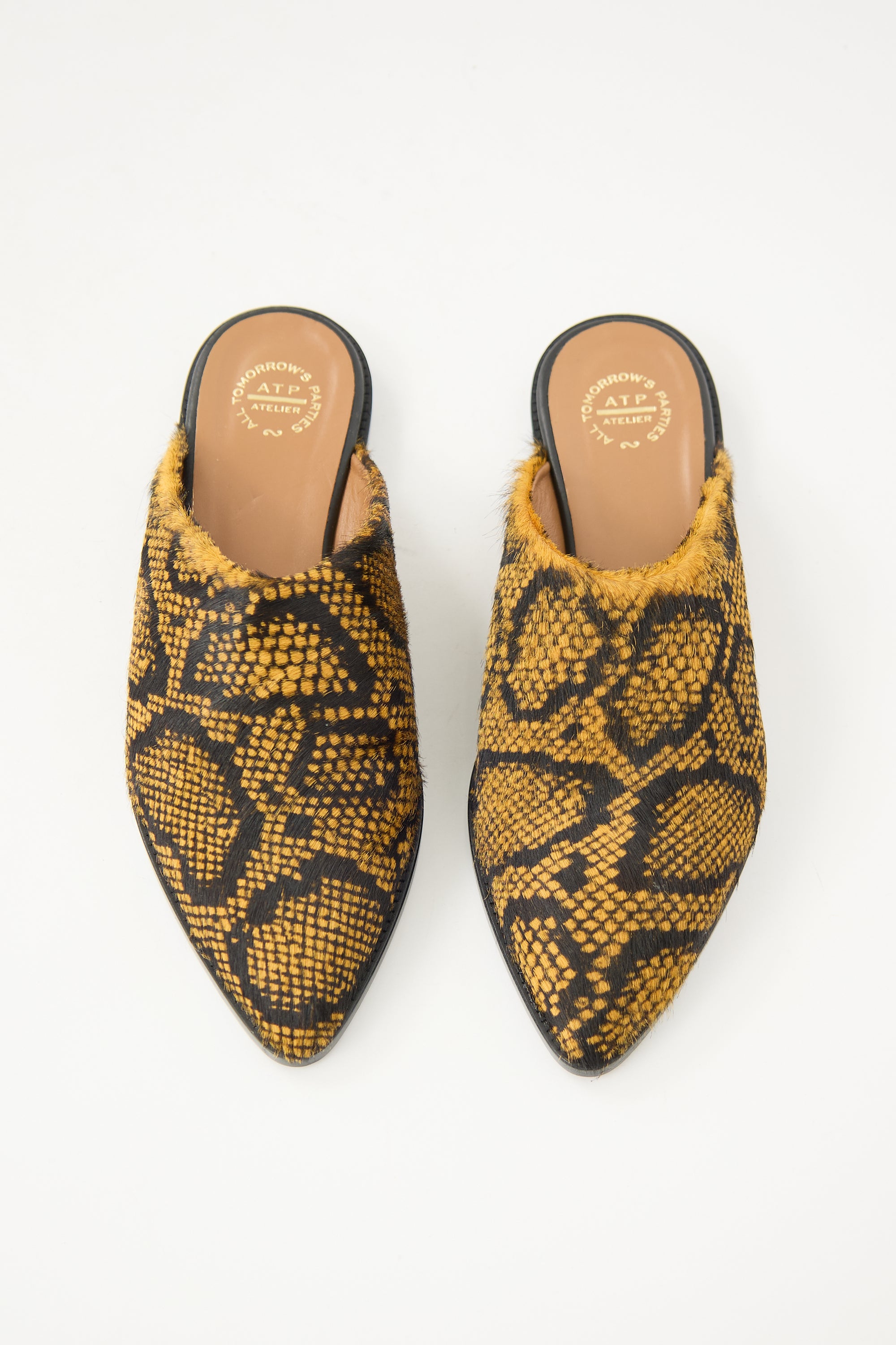 Pre-owned ATP Atelier yellow and black Anzi mules featuring almond toe, printed pony hair upper, and leather insole and outsole.