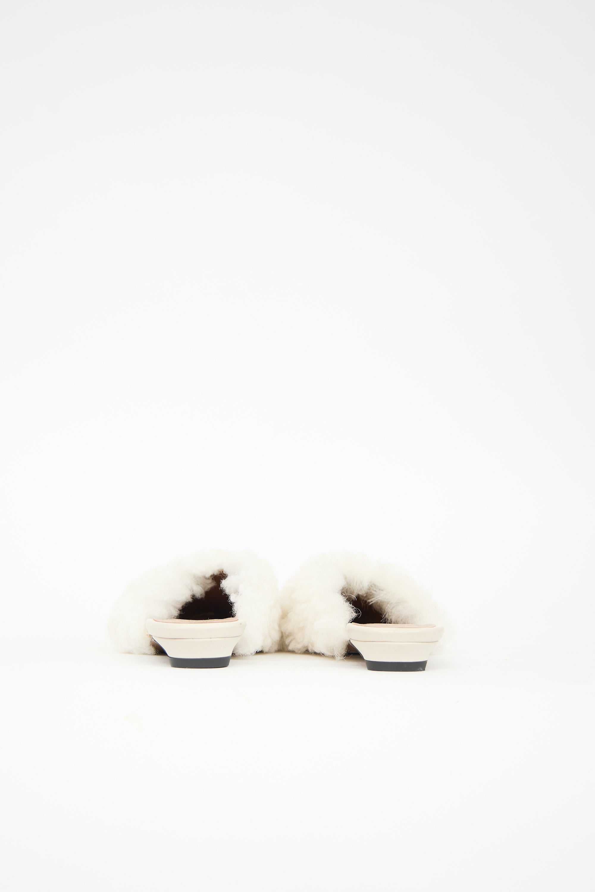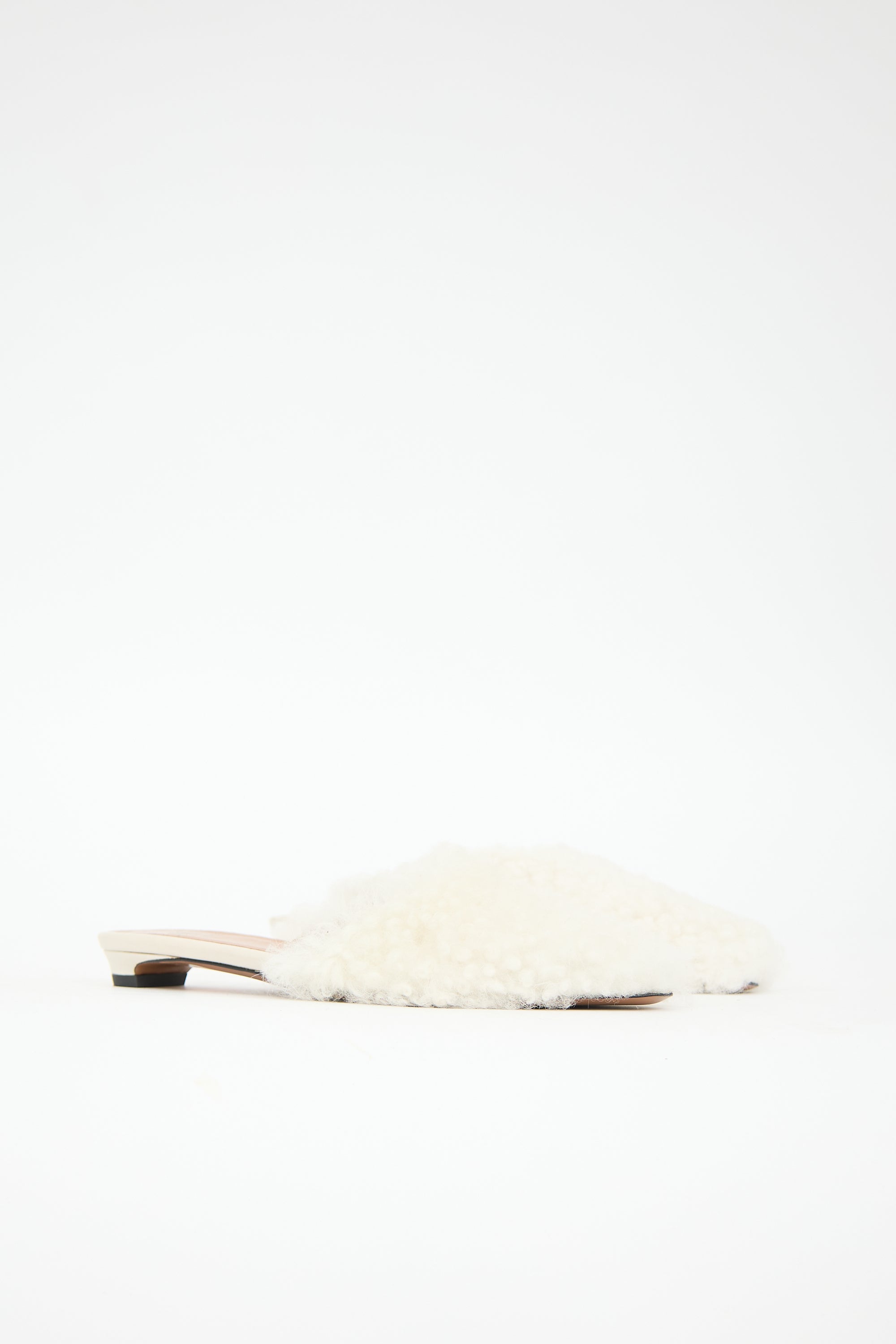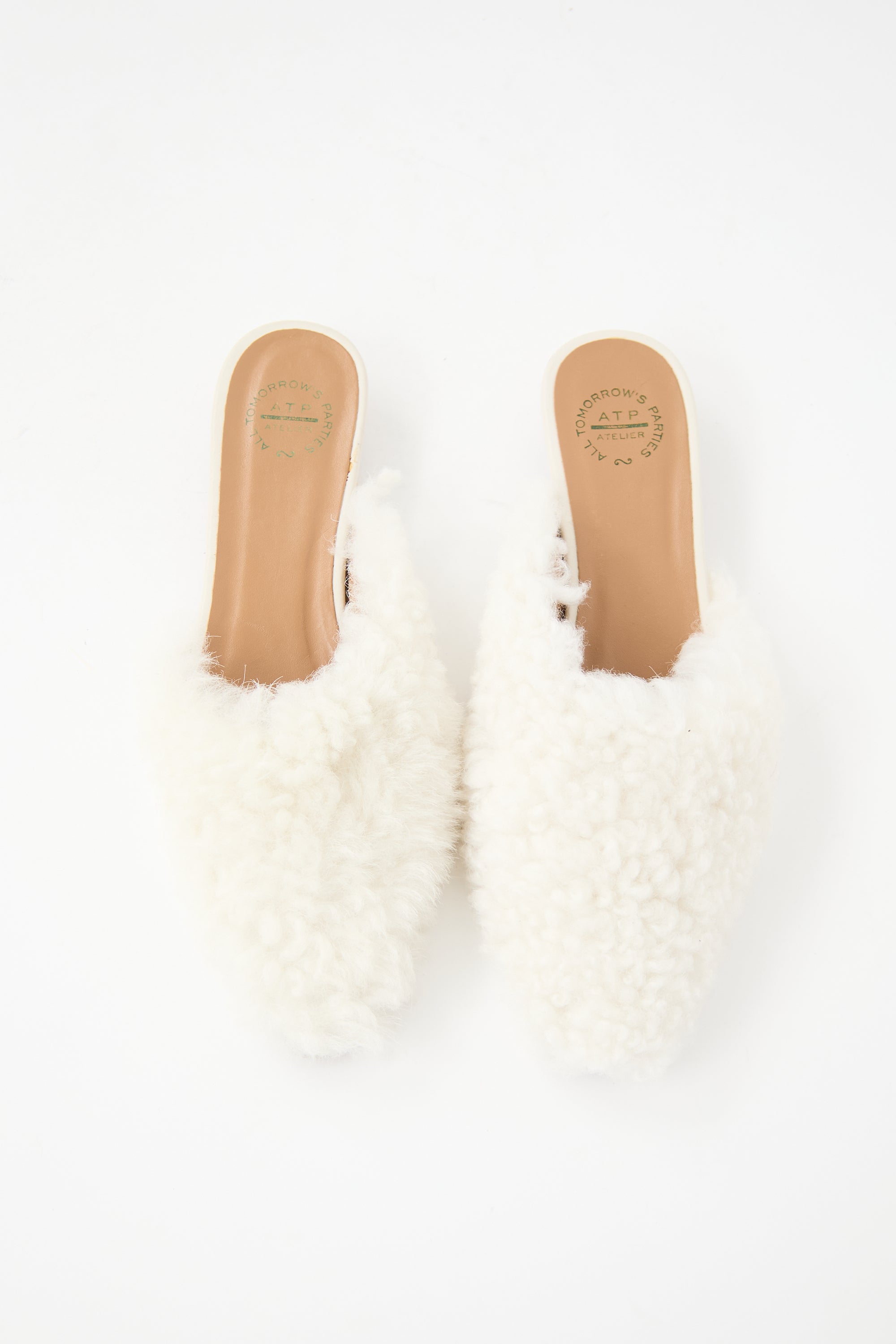 Pre-owned ATP Atelier white shearling Fioli mules featuring tapered square toe, asymmetrical topline, and covered kitten heel. Comes with original dust bag.