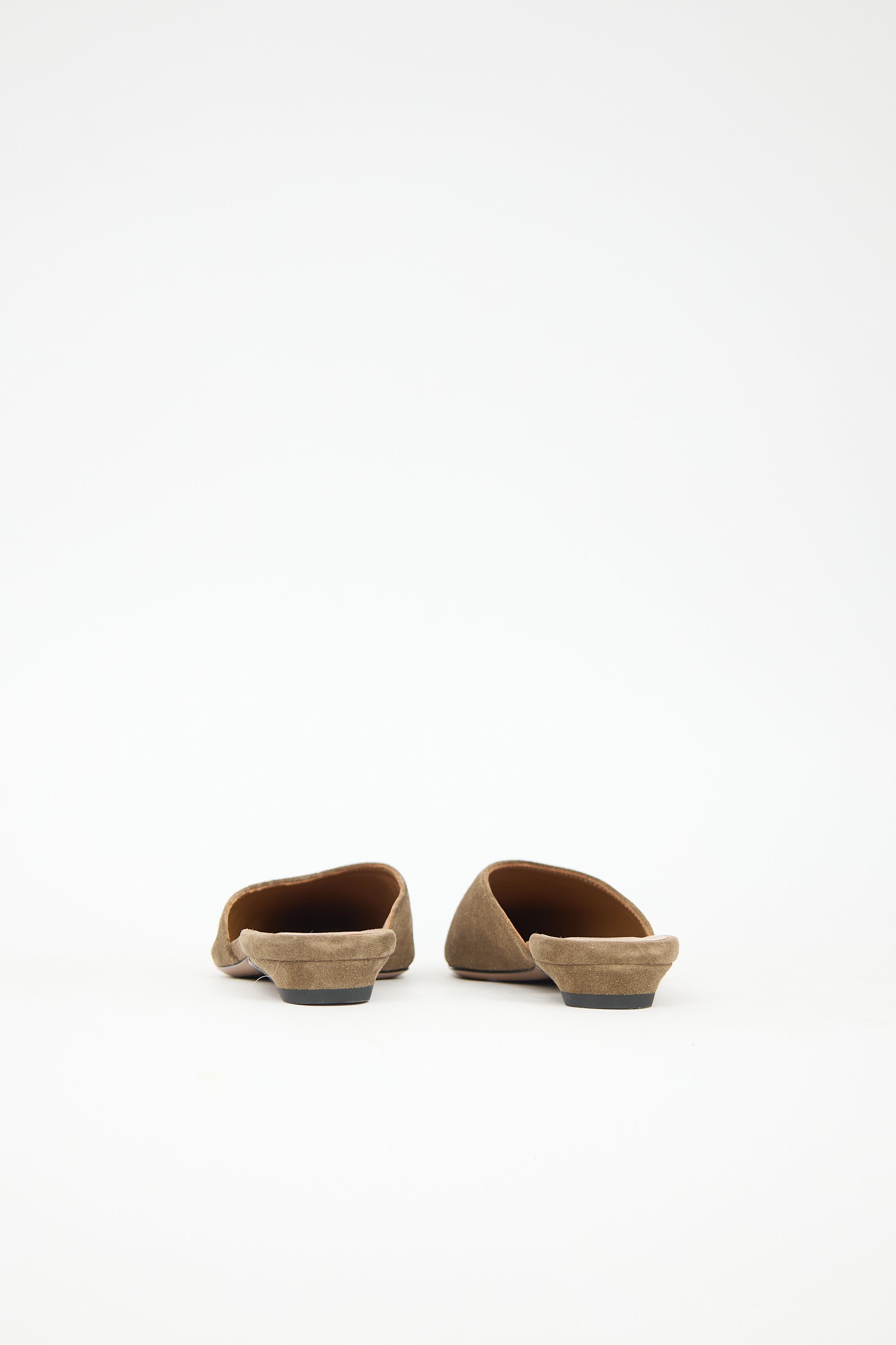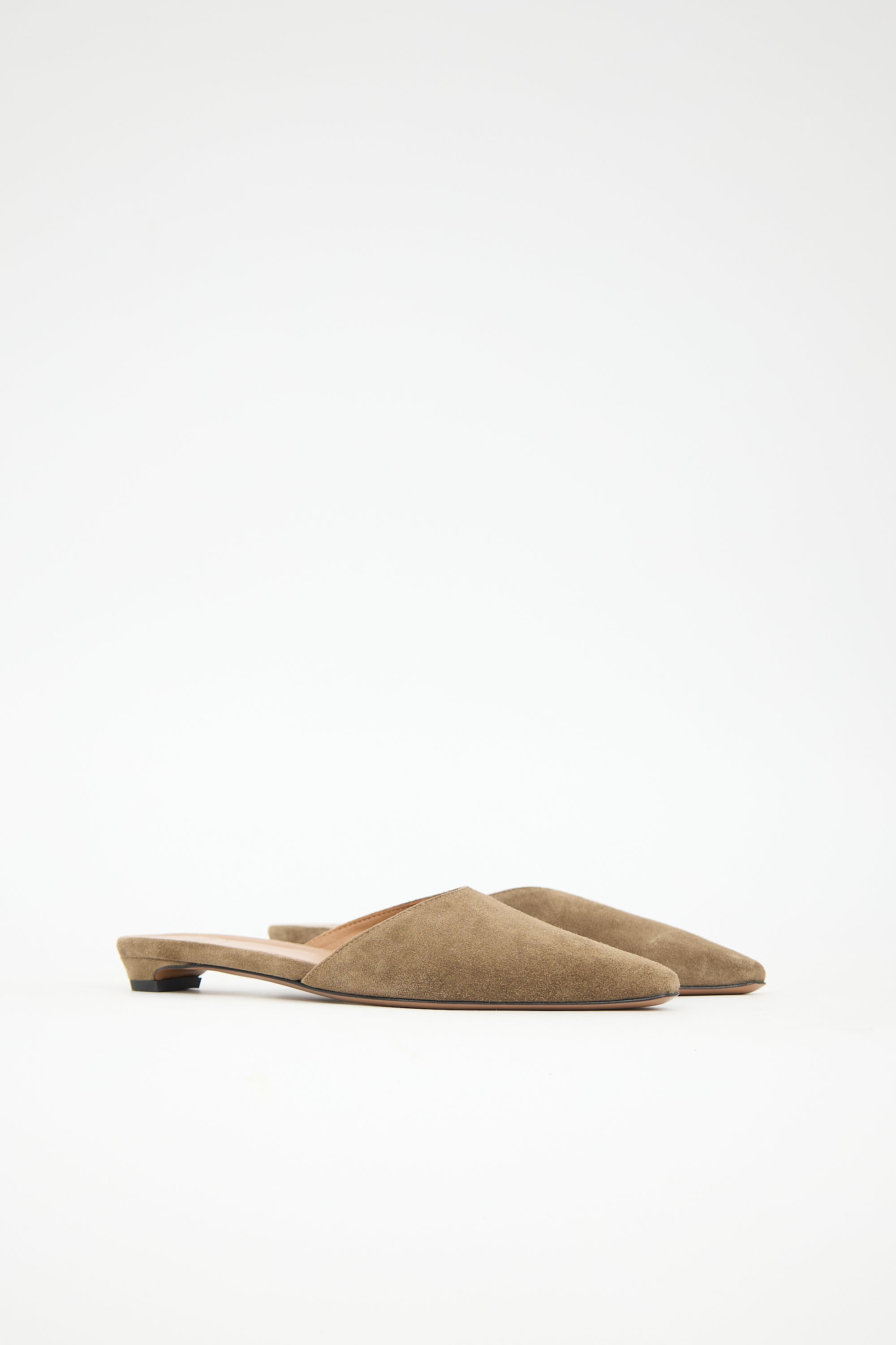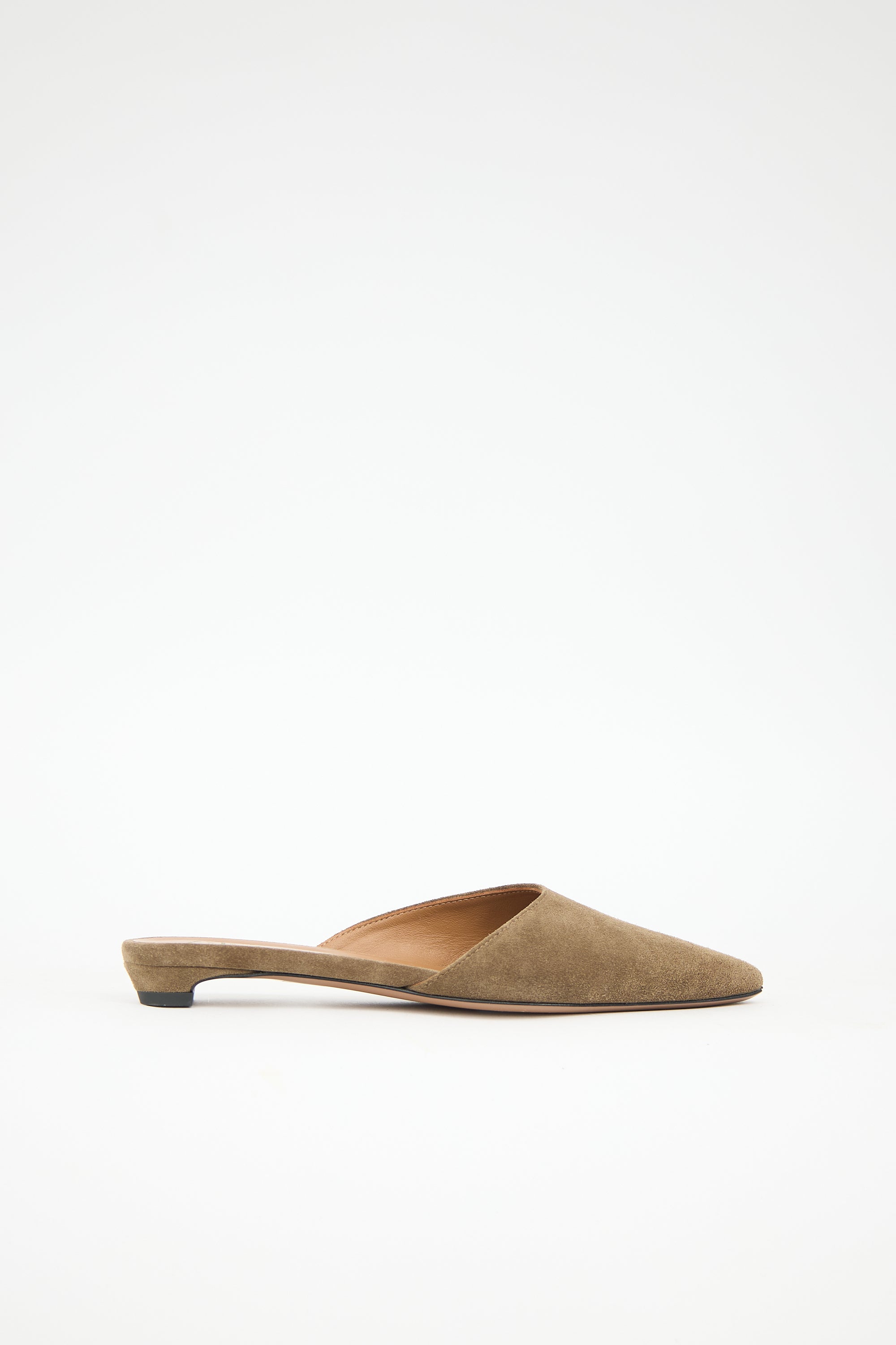 Pre-owned ATP Atelier khaki green suede Fioli mules featuring almond toe, short covered kitten heel, and leather insole and outsole.