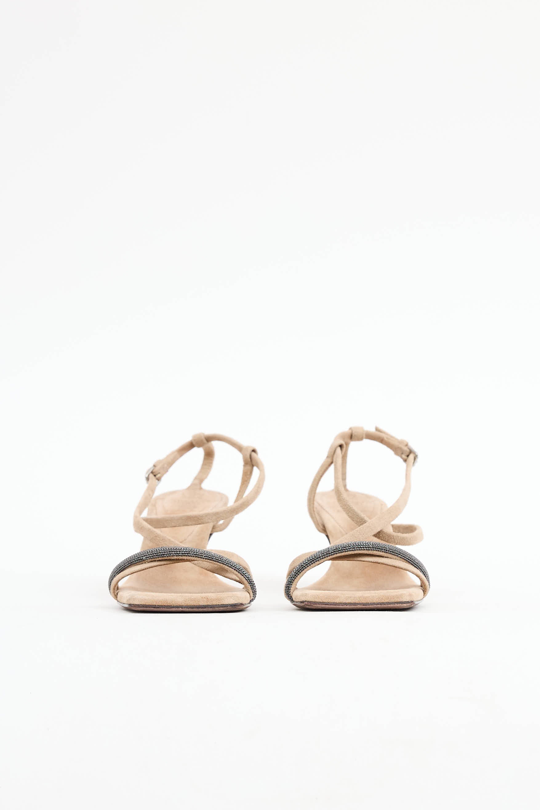Pre-owned Brunello Cucinelli beige suede sandals featuring square toe, strappy upper, Monili beaded strap at vamp, adjustable ankle strap, and covered kitten heel.