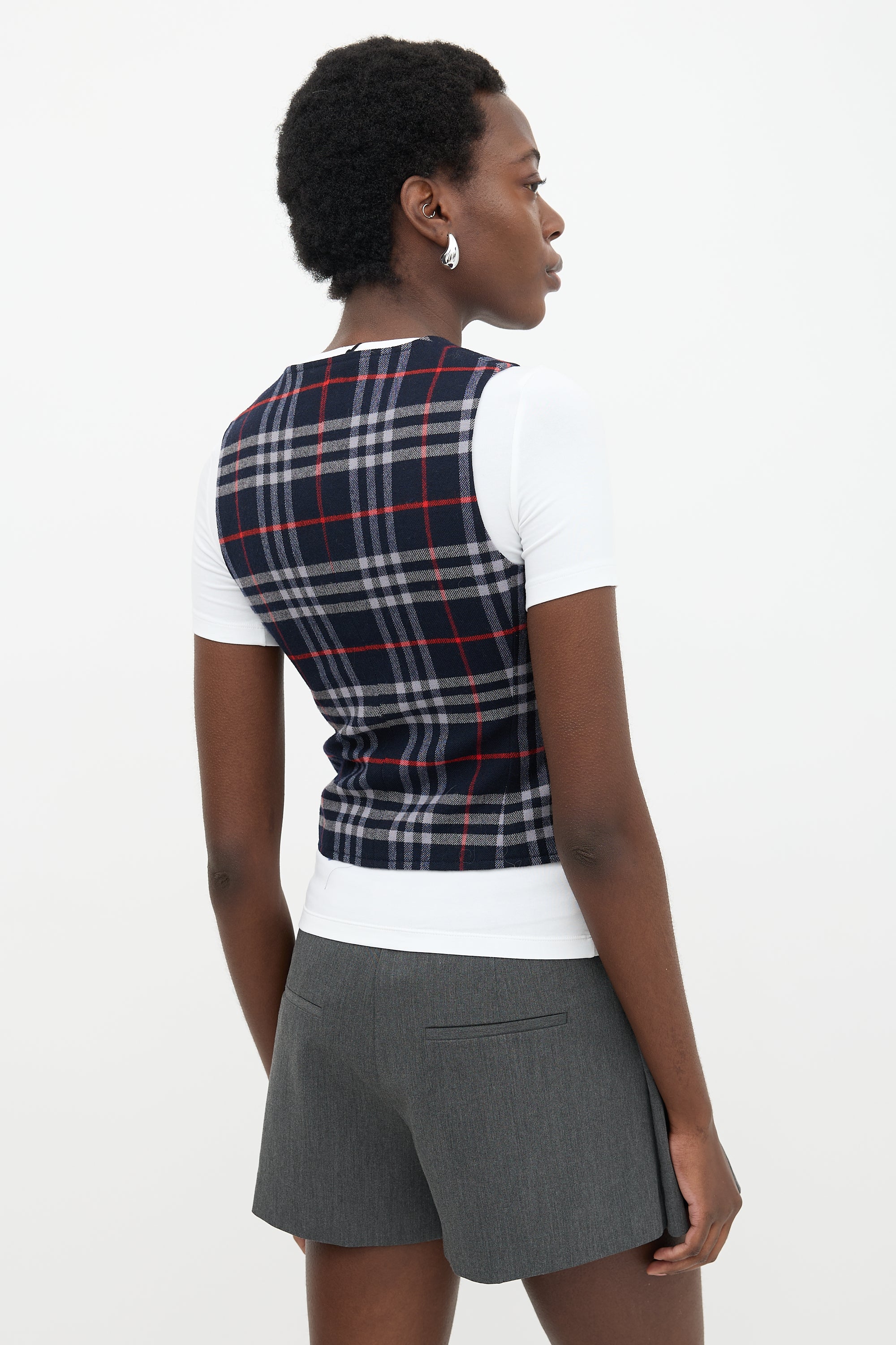 Pre-owned Burberry navy, grey, and red wool vest featuring signature check print, Y-neckline, button up front, and pointed ends. Lined.