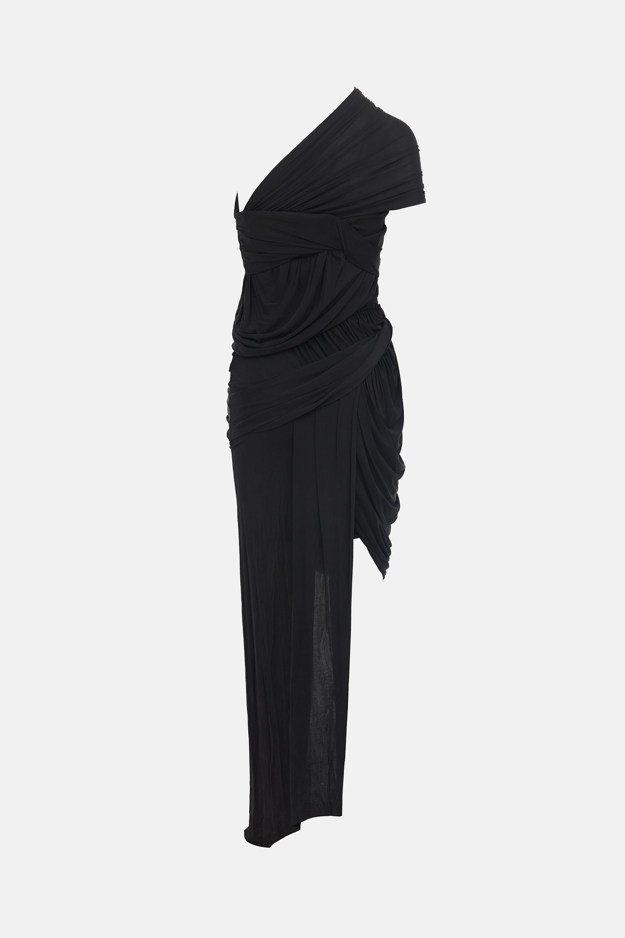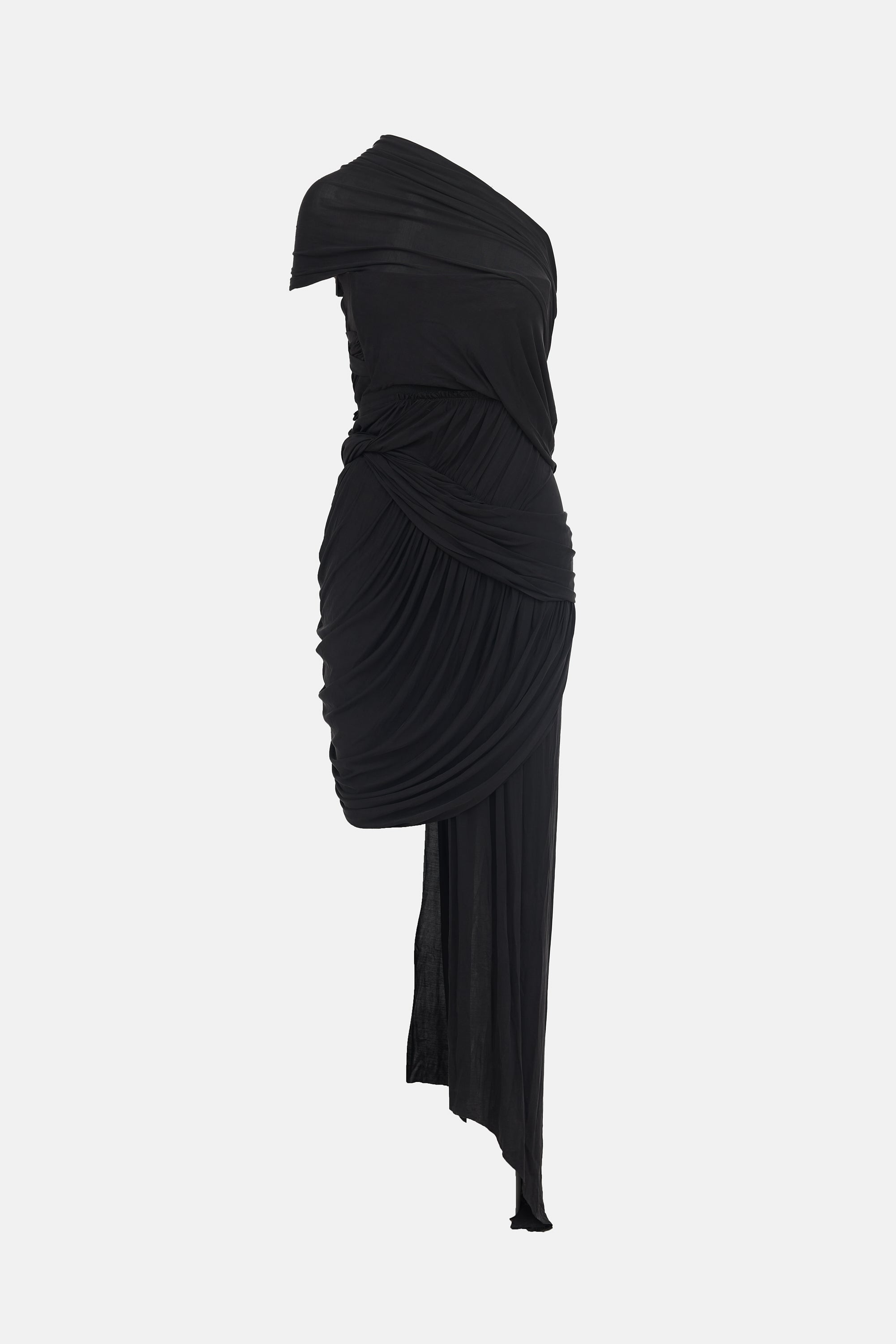 Pre-owned Carven black jersey draped dress featuring a one shoulder design, concealed side zip closure, interior boned bust, knotted detail at side, and an asymmetric hem.