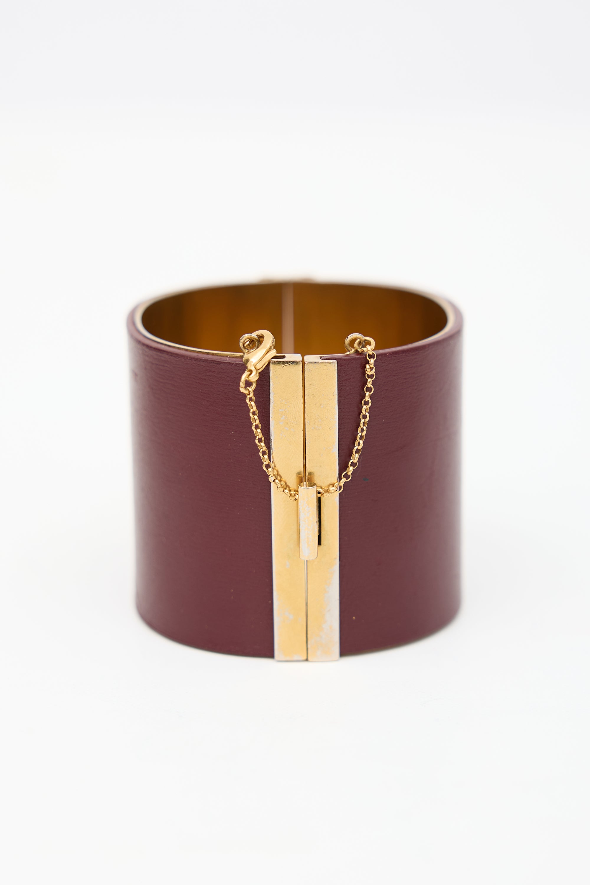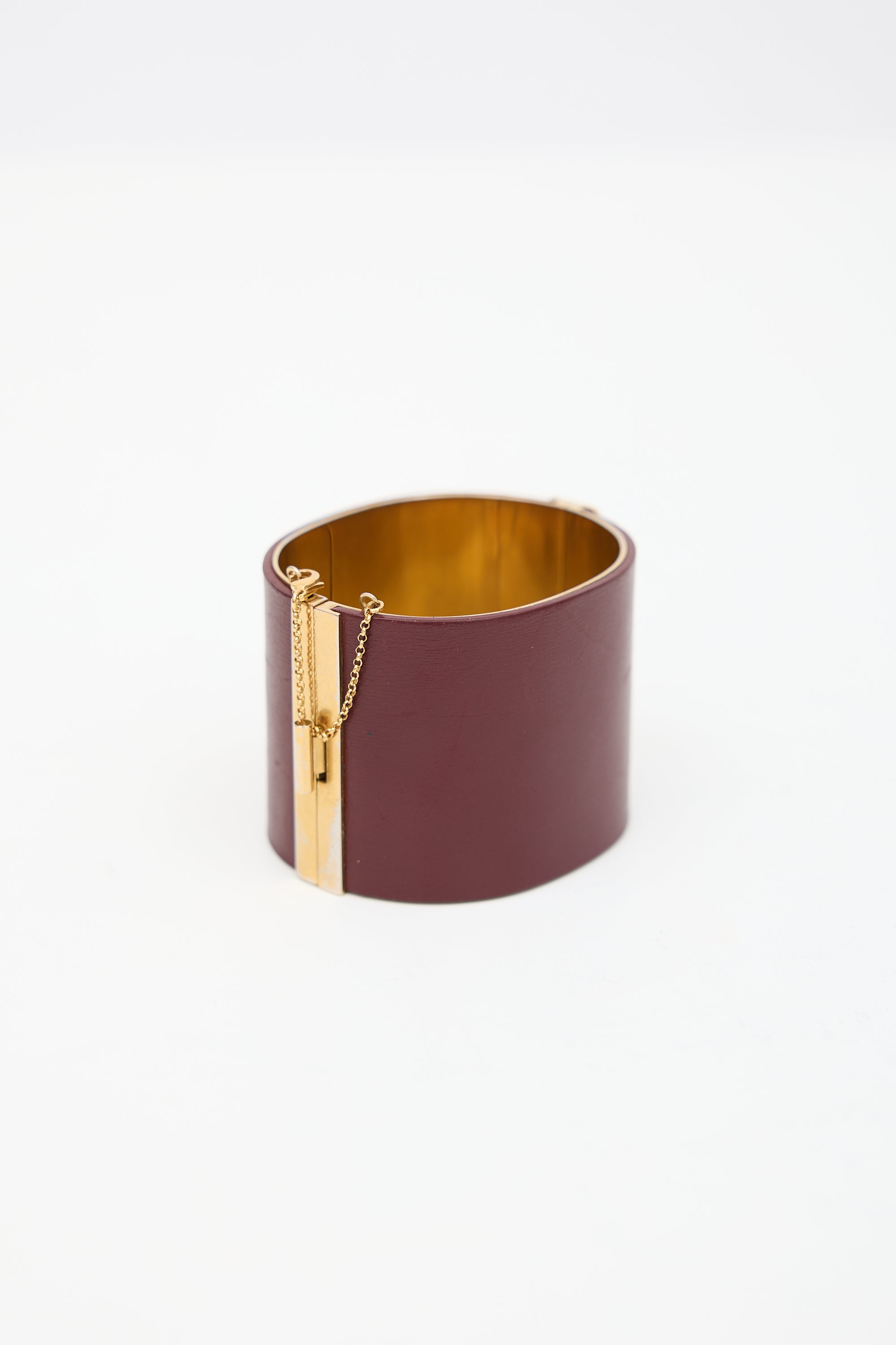 Pre-owned Celine burgundy leather cuff bracelet featuring gold tone trim and interior, hinge push lock closure with chain link fastening, and debossed logo at interior.