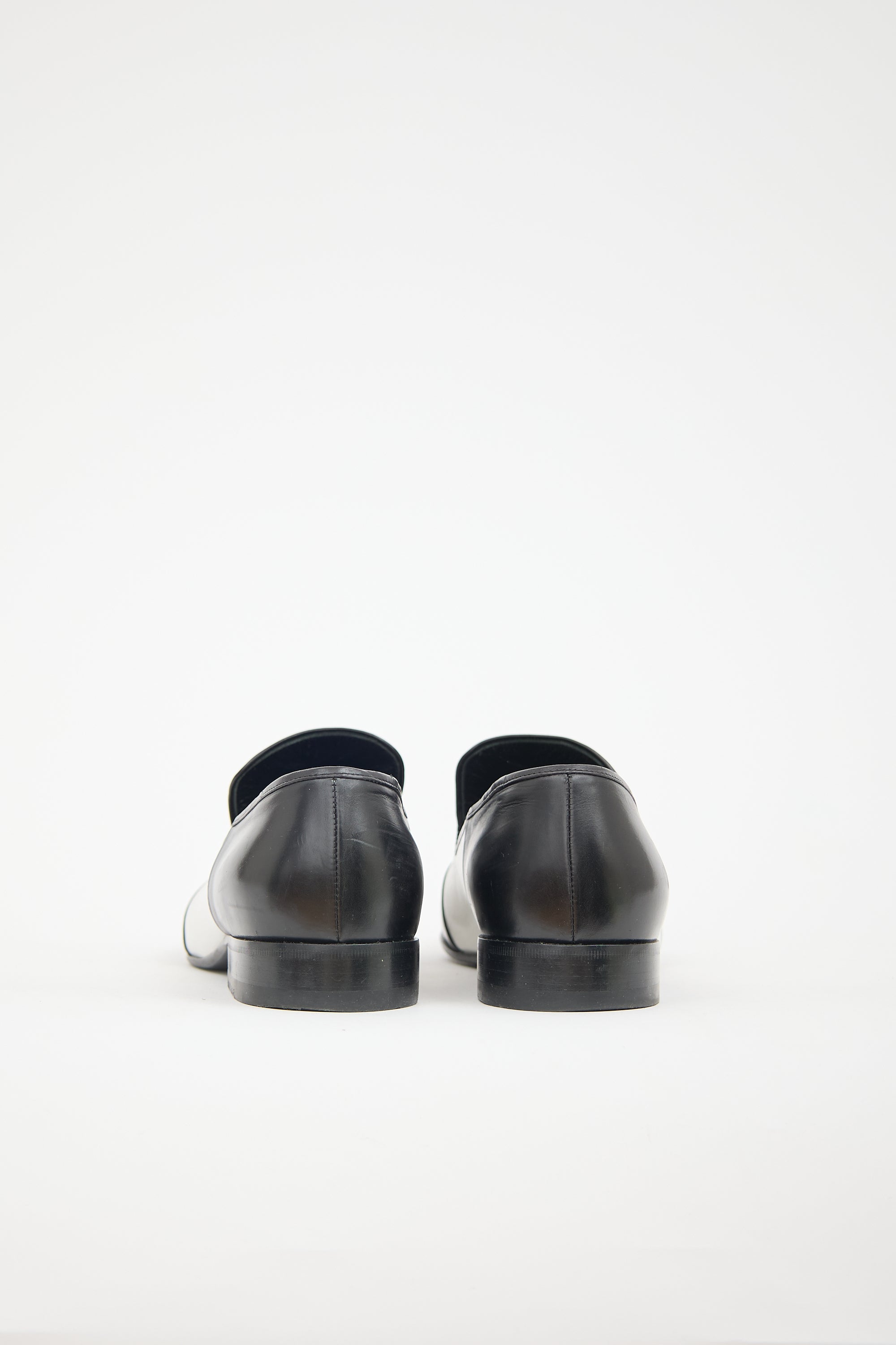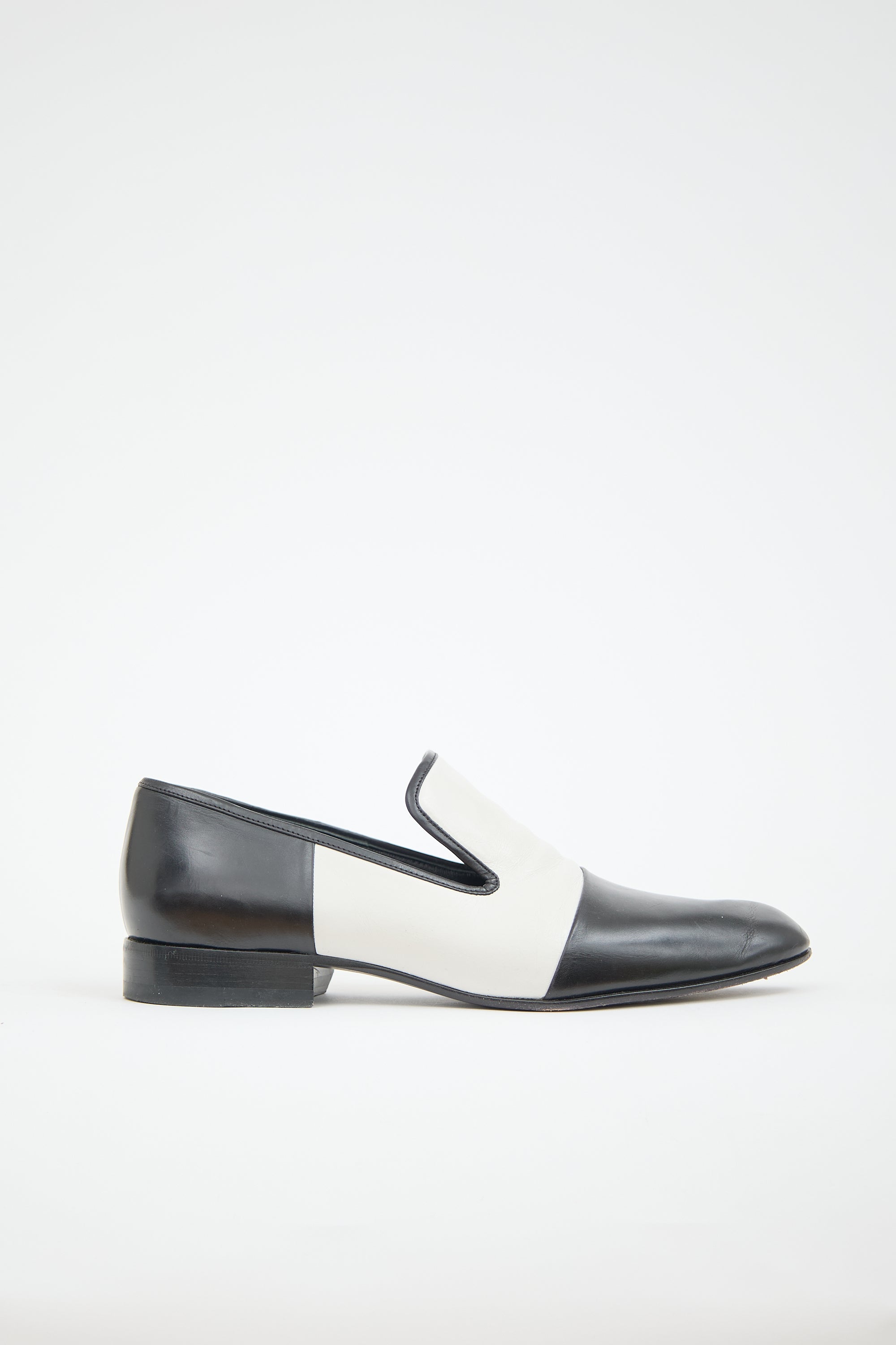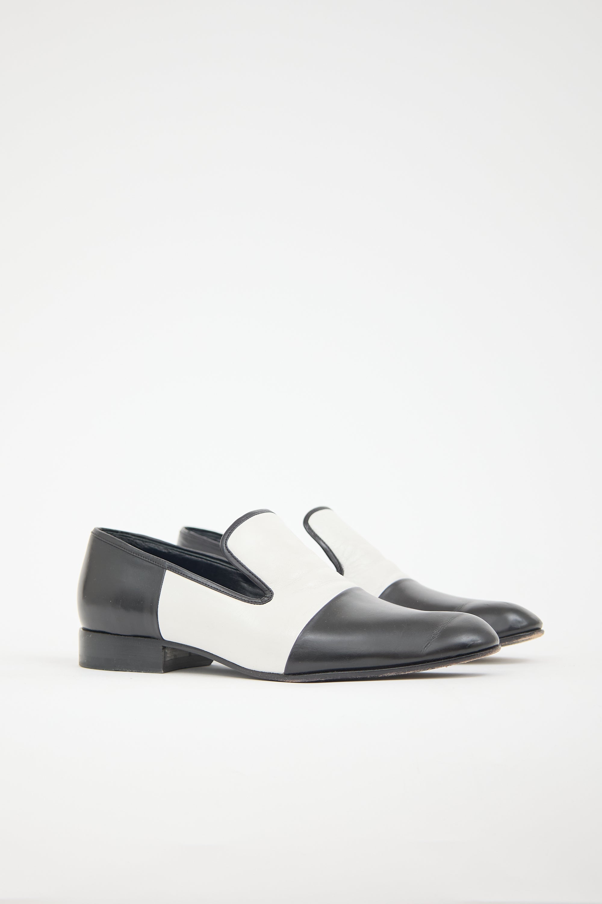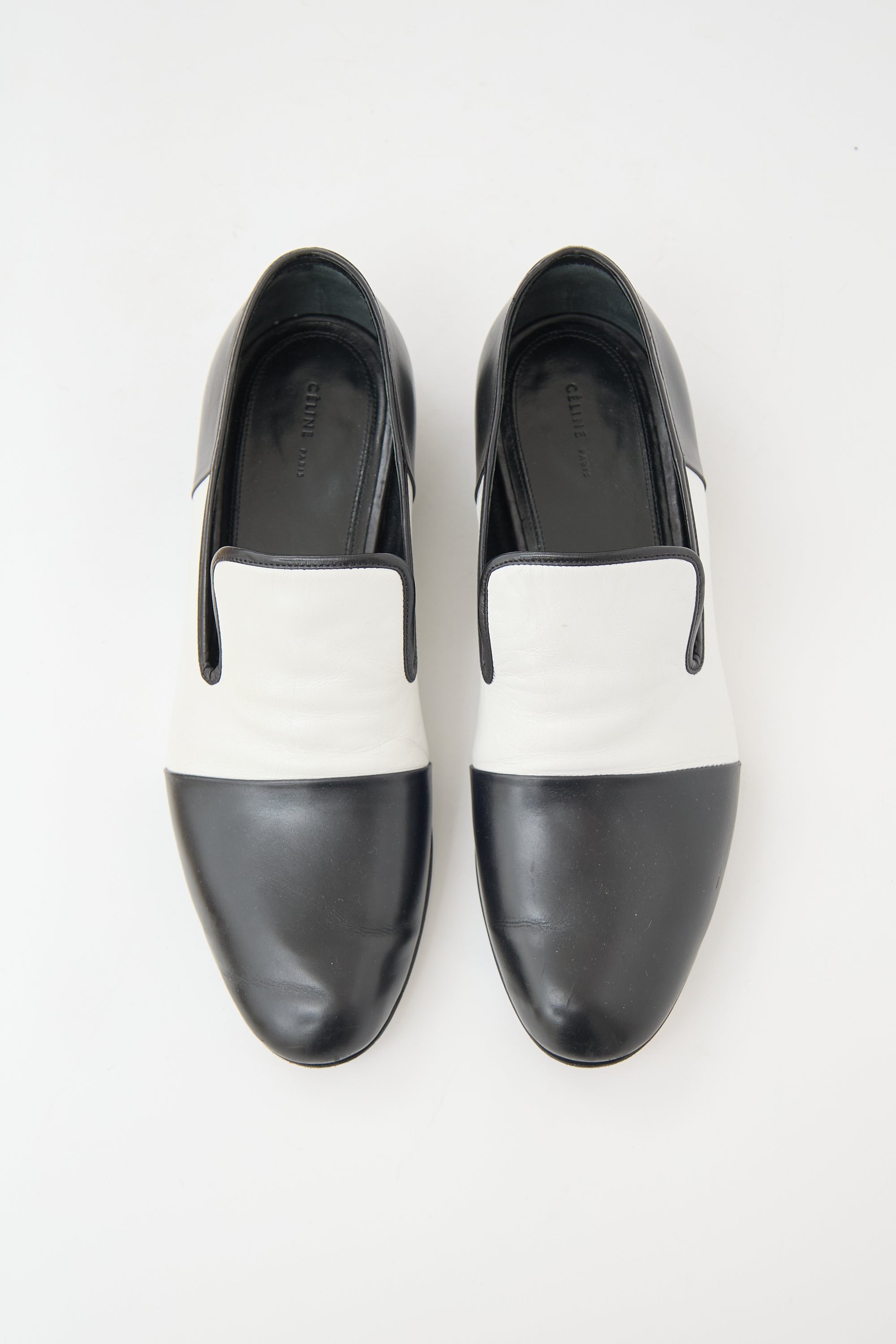 Pre-owned Celine black and white leather loafers featuring a rounded toe, slip on entry, and stacked heel.