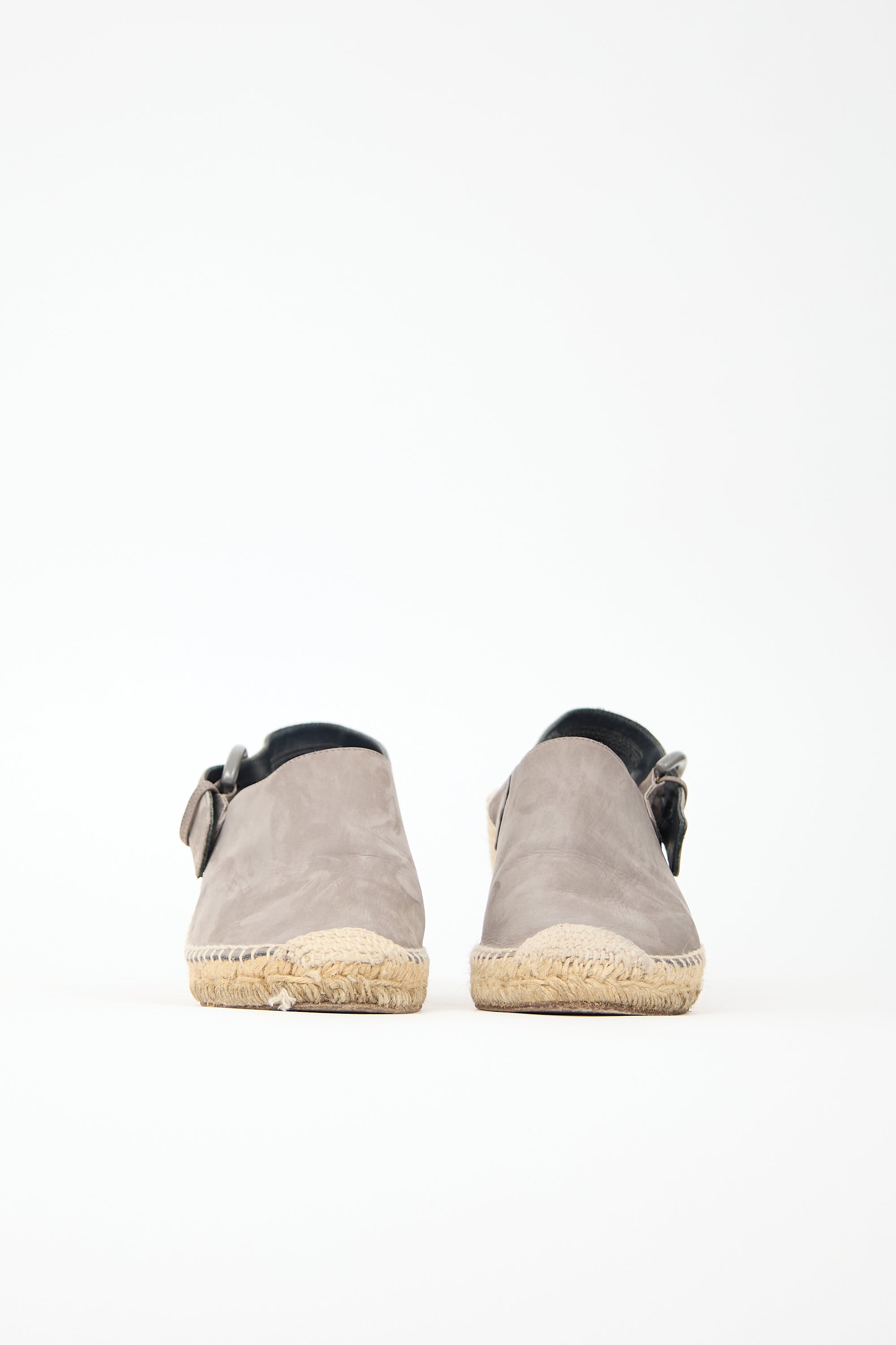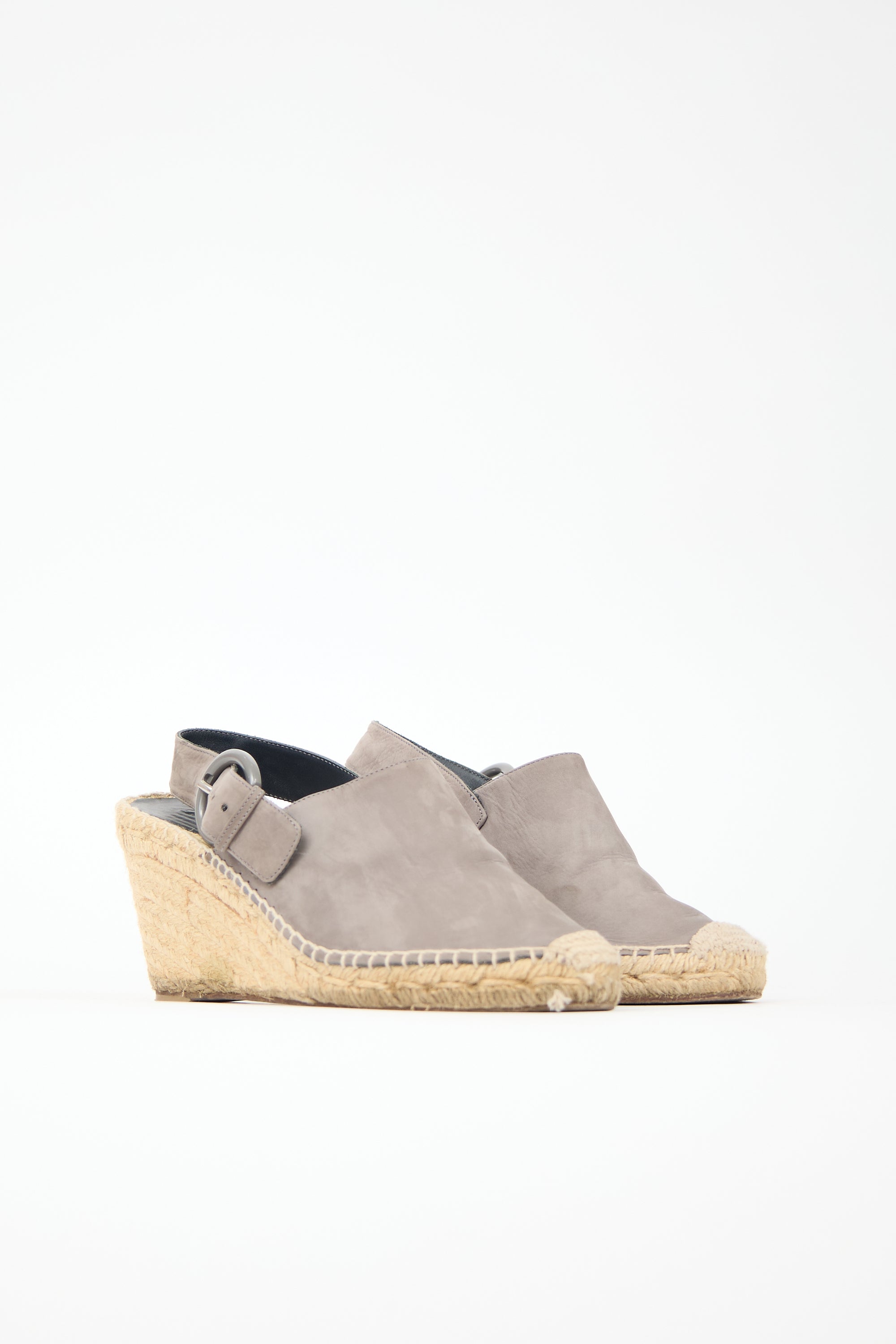 Pre-owned Celine grey suede sandals featuring rounded toe with crochet cap, adjustable slingback strap, and beige braided wedge.