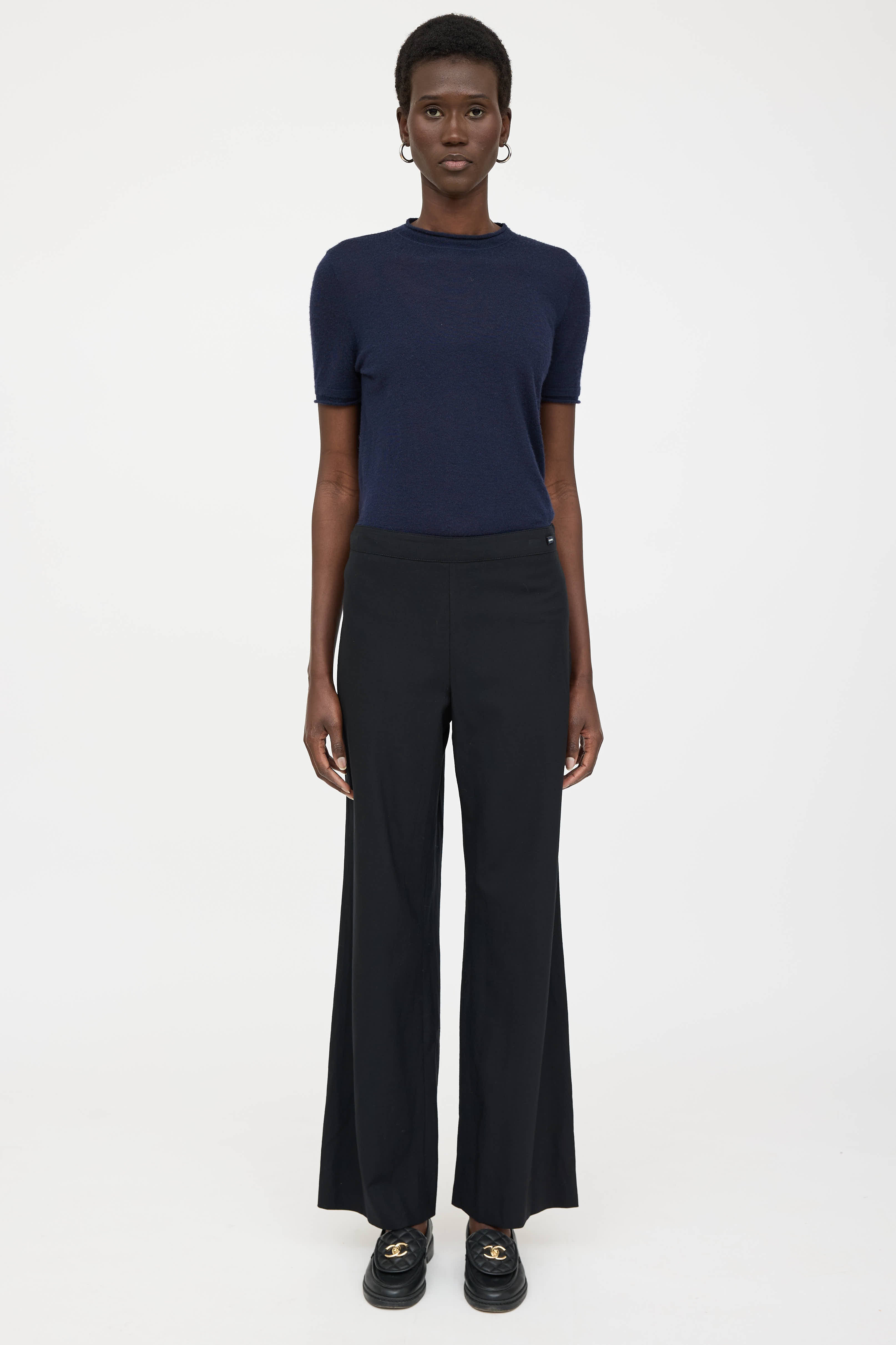 Pre-owned Chanel Cruise 2003 black wool trousers featuring tonal logo hardware at waist, straight leg, and zip at side with hook and eye closure.