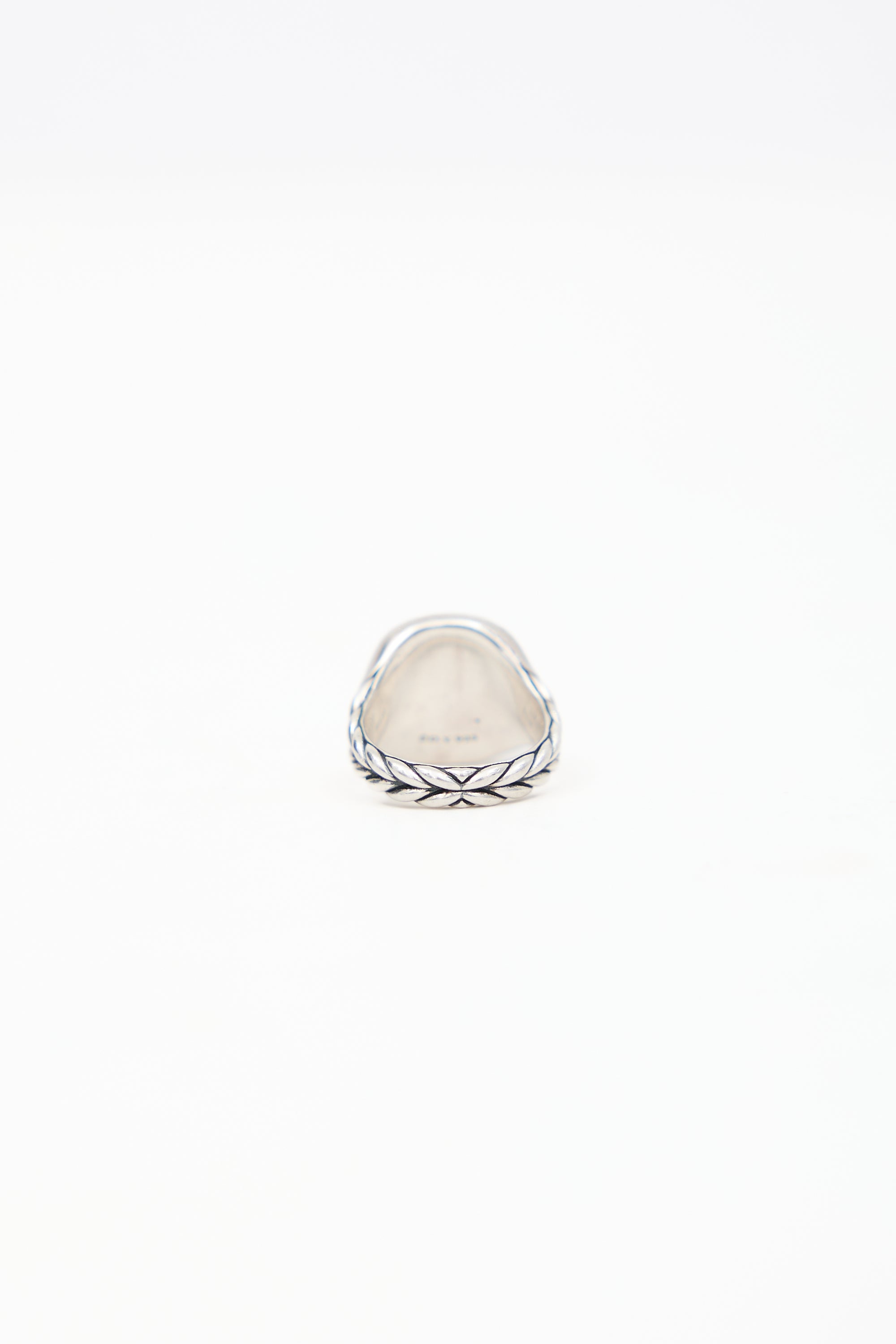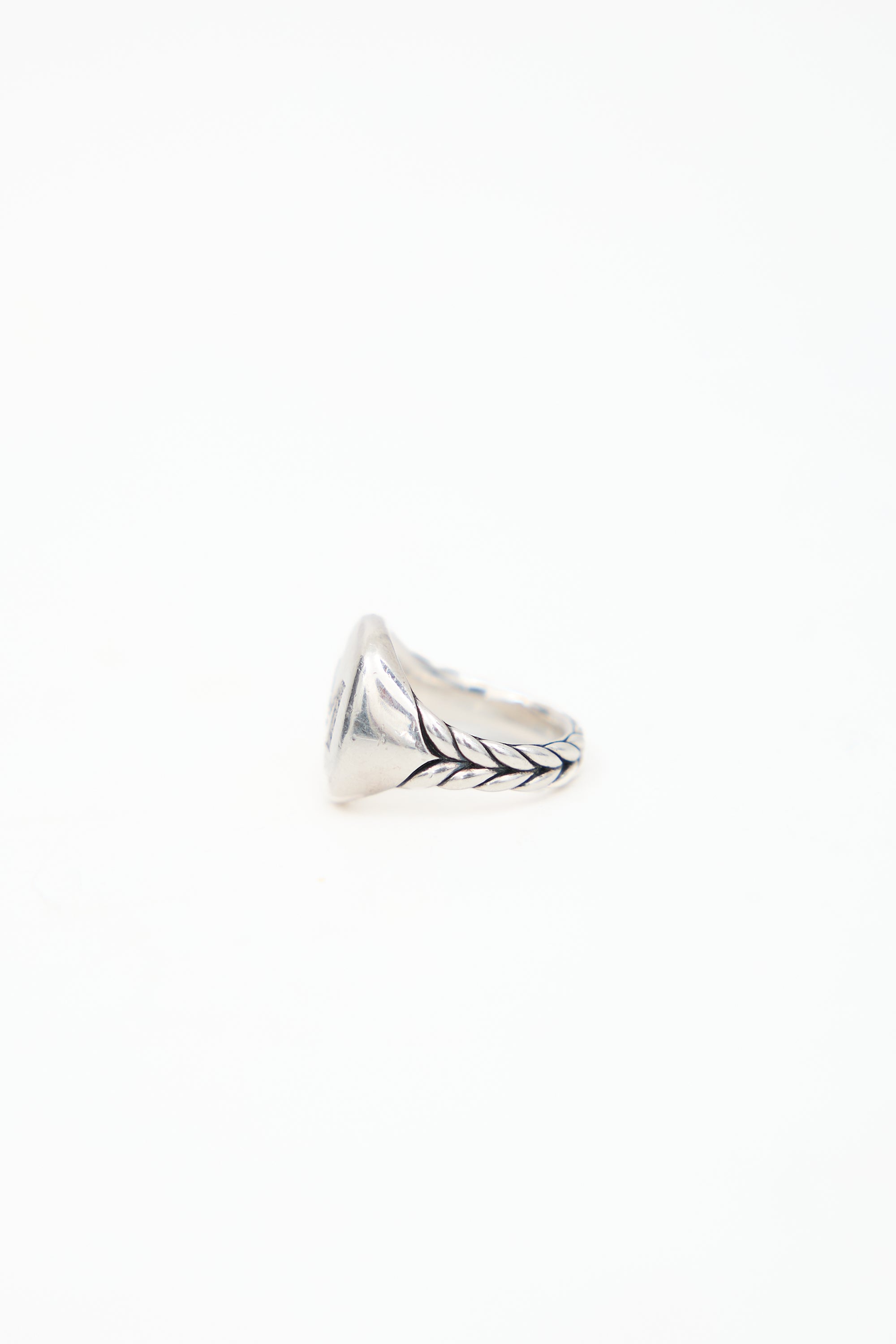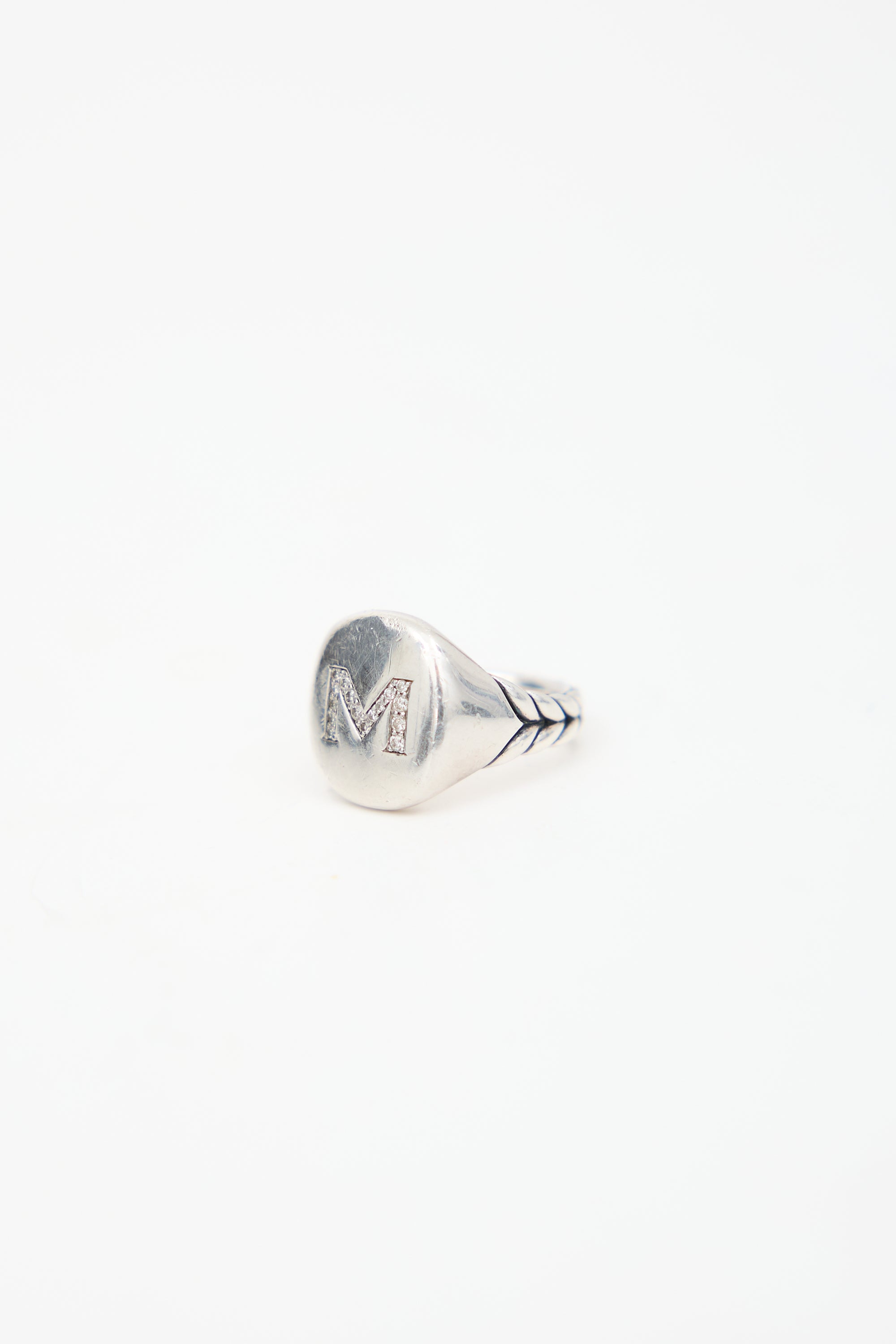 Pre-owned David Yurman M Initial pinky ring featuring a sterling silver band and debossed 'M' at face with inset diamonds.