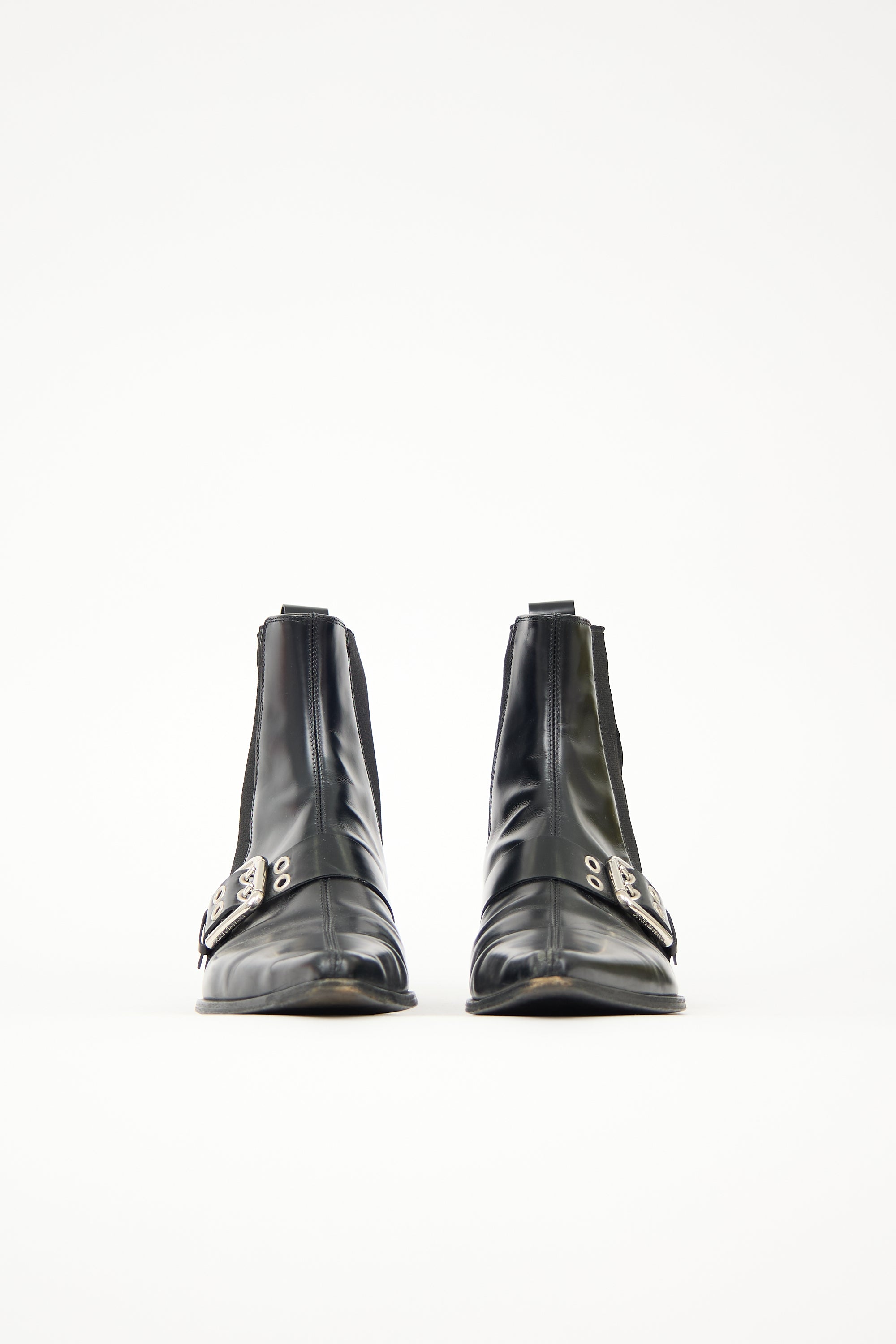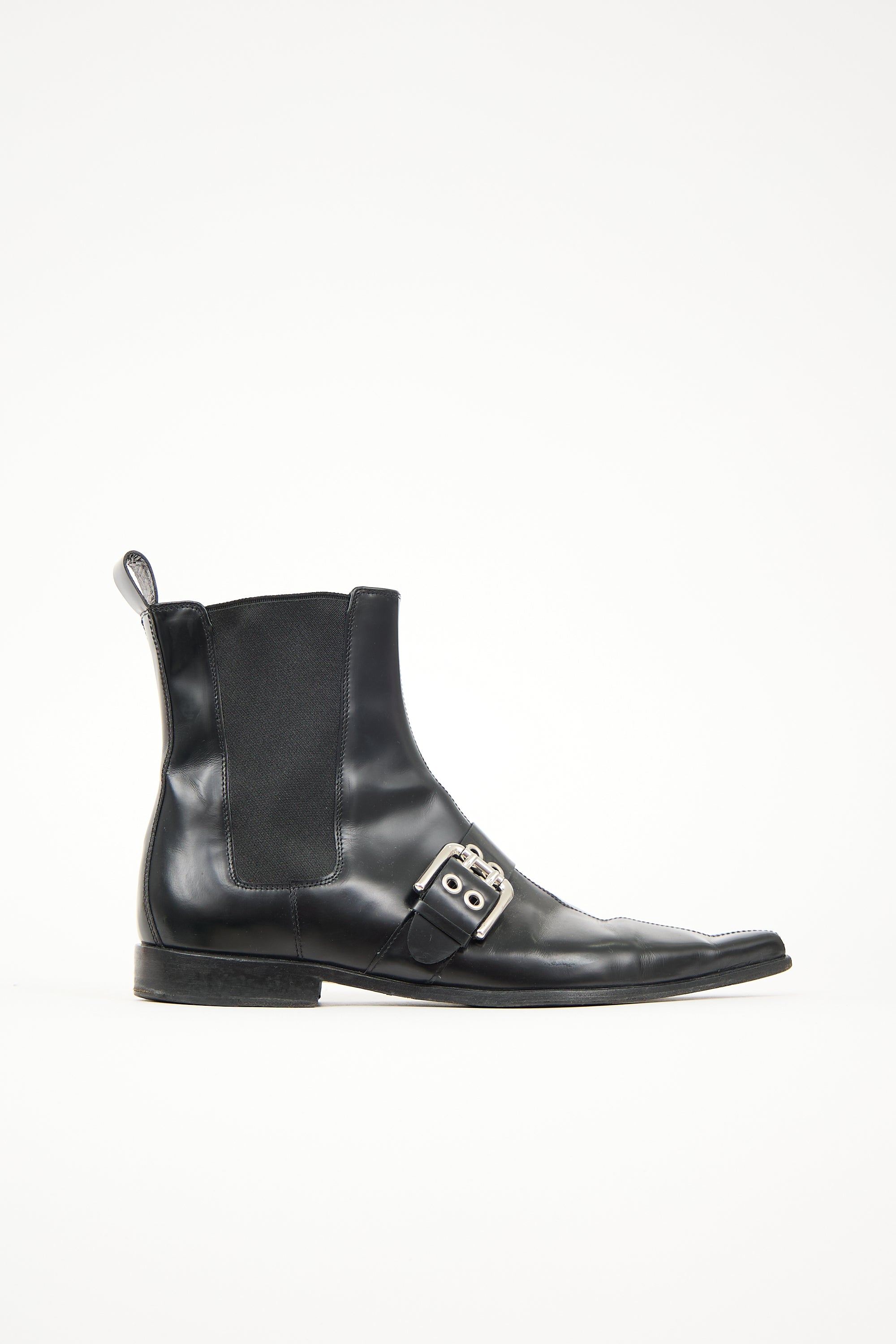 Pre-owned Dolce & Gabbana black leather boots featuring a pointed toe, strap detail at vamo, pull on entry, gore at sides, and pull tab at counter.