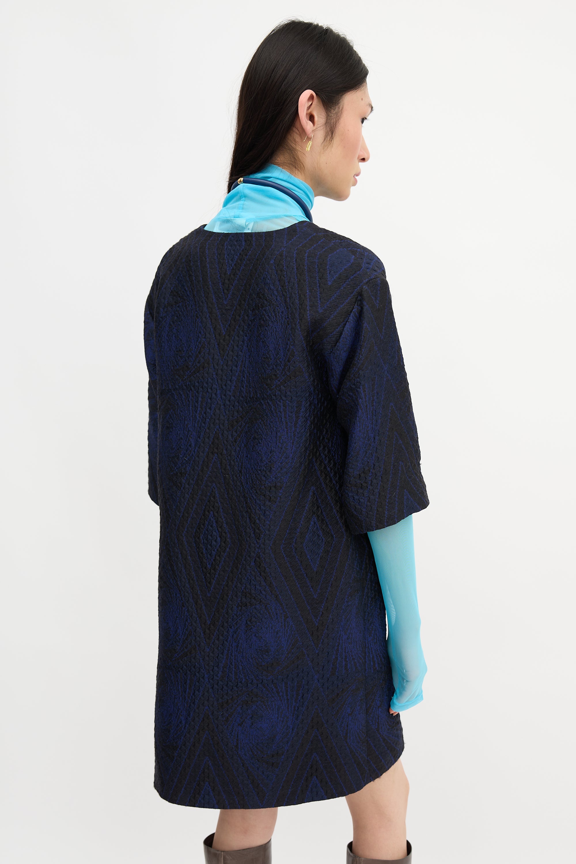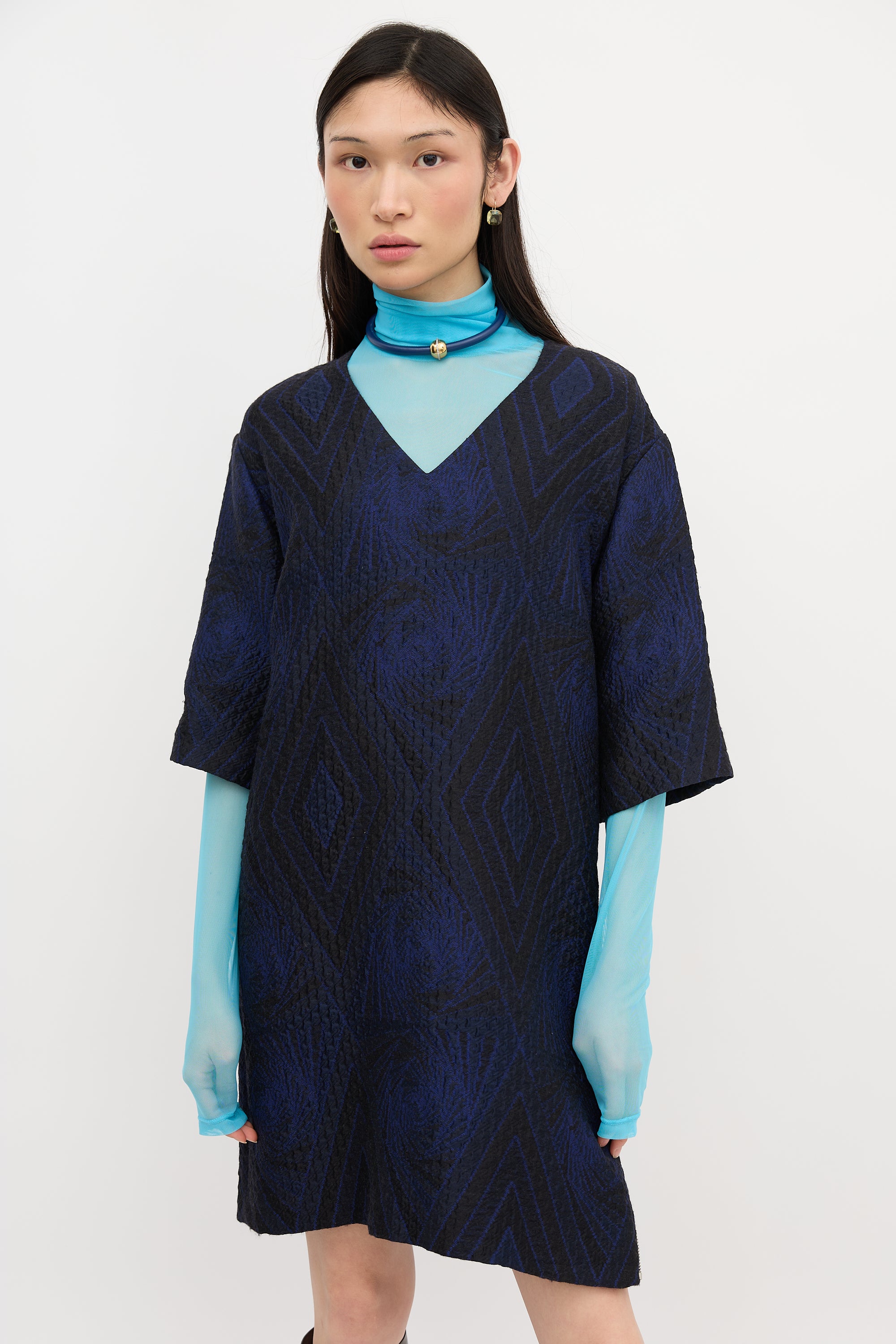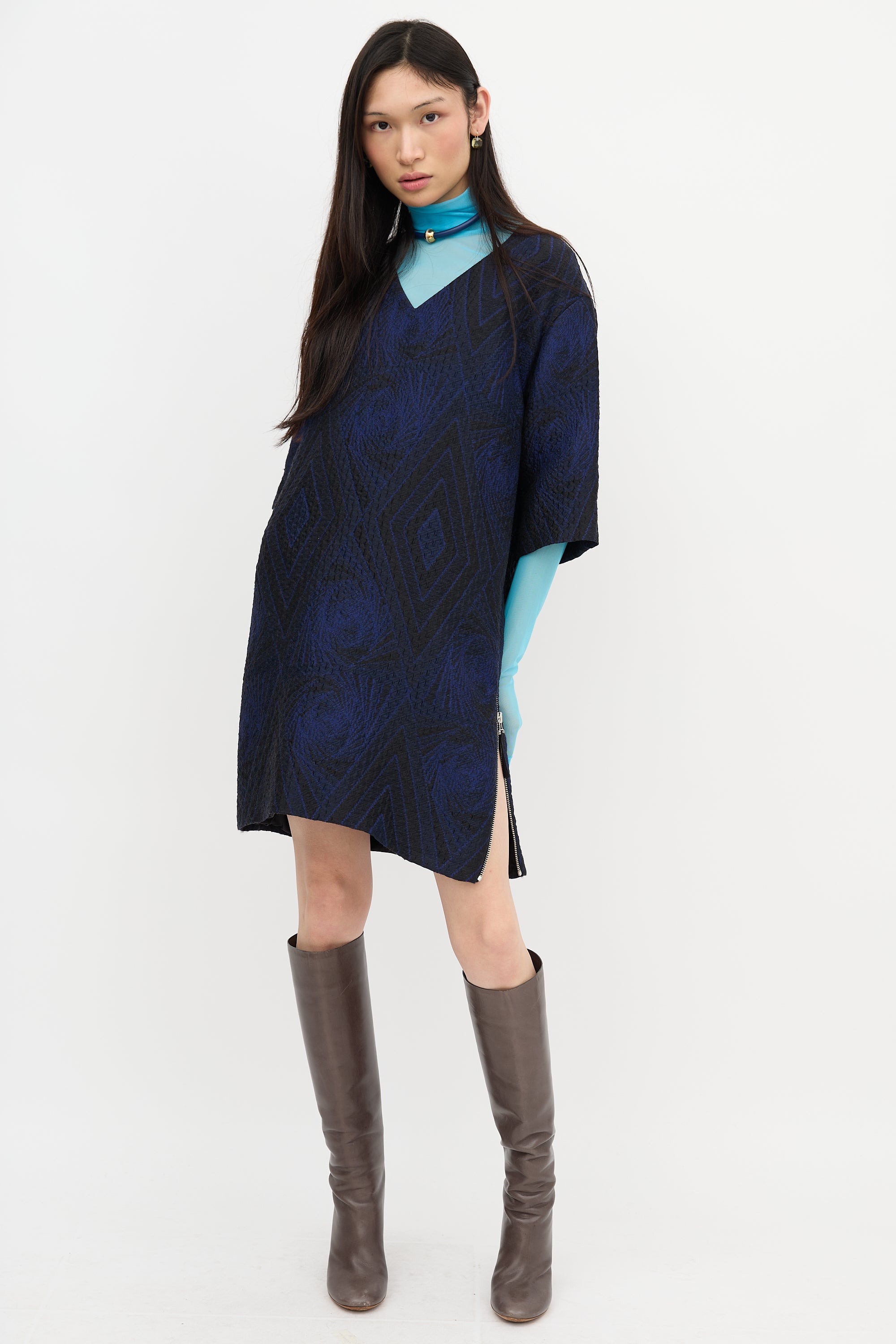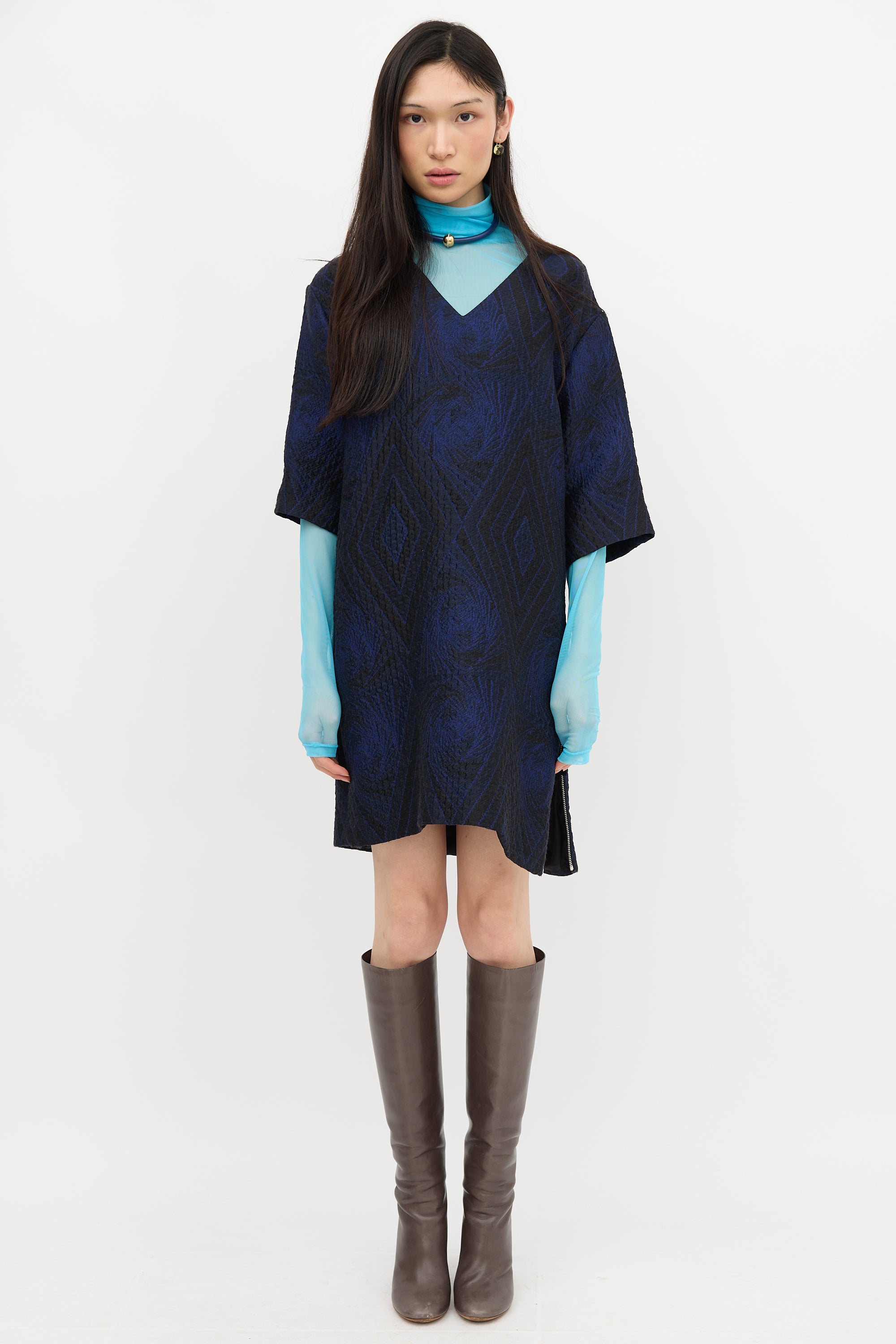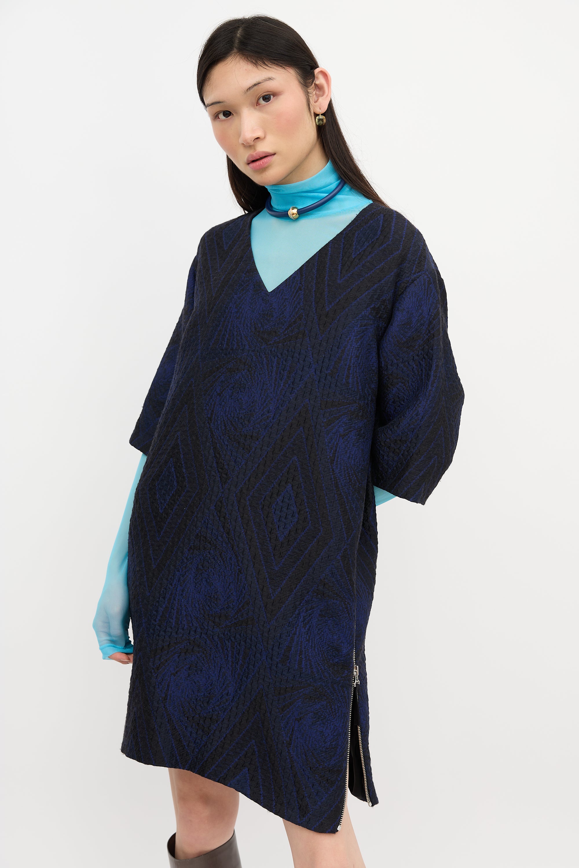 Pre-owned Dries Van Noten blue and black cloque midi dress featuring V-neckline, geometric pattern, and side zip closure. Lined.