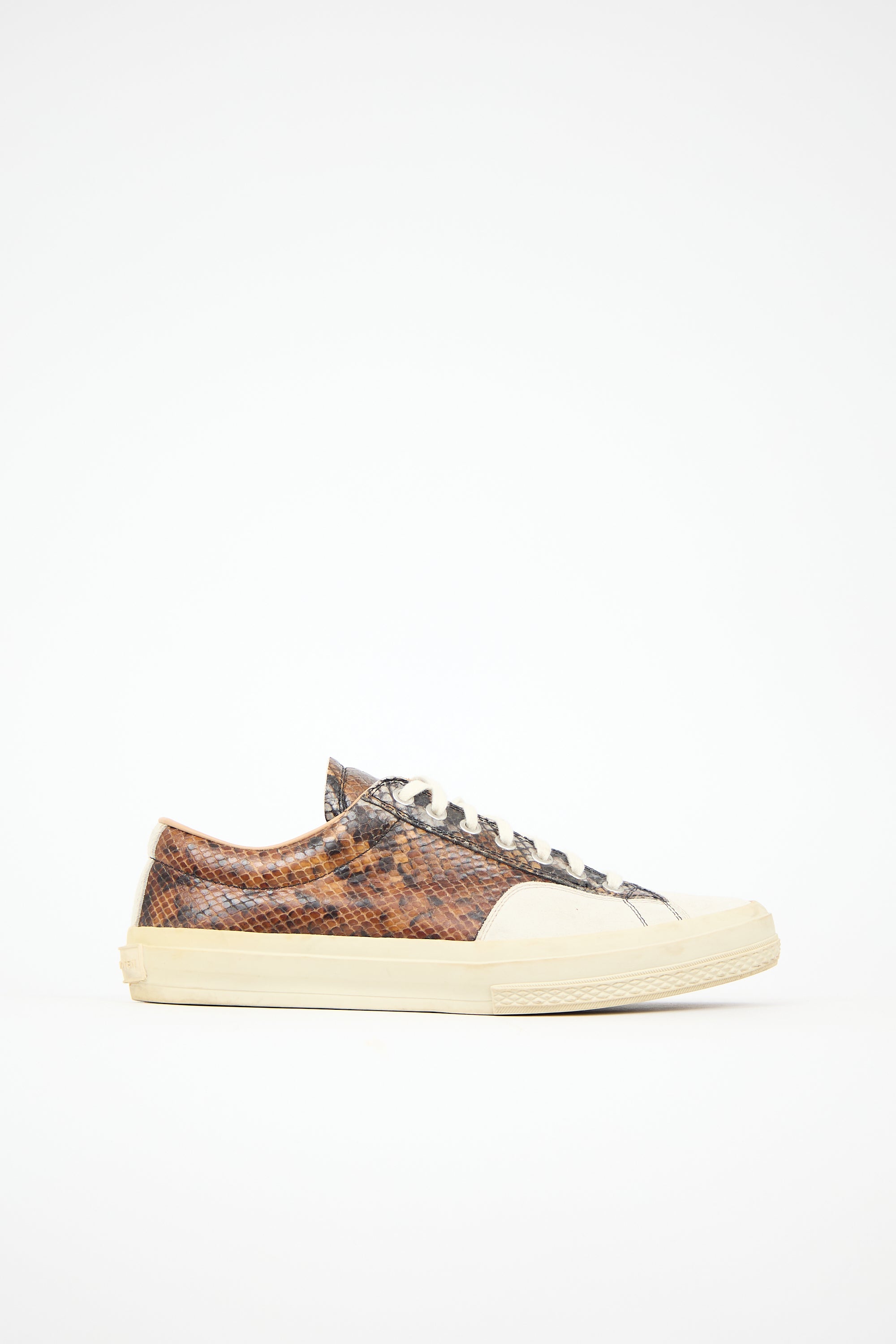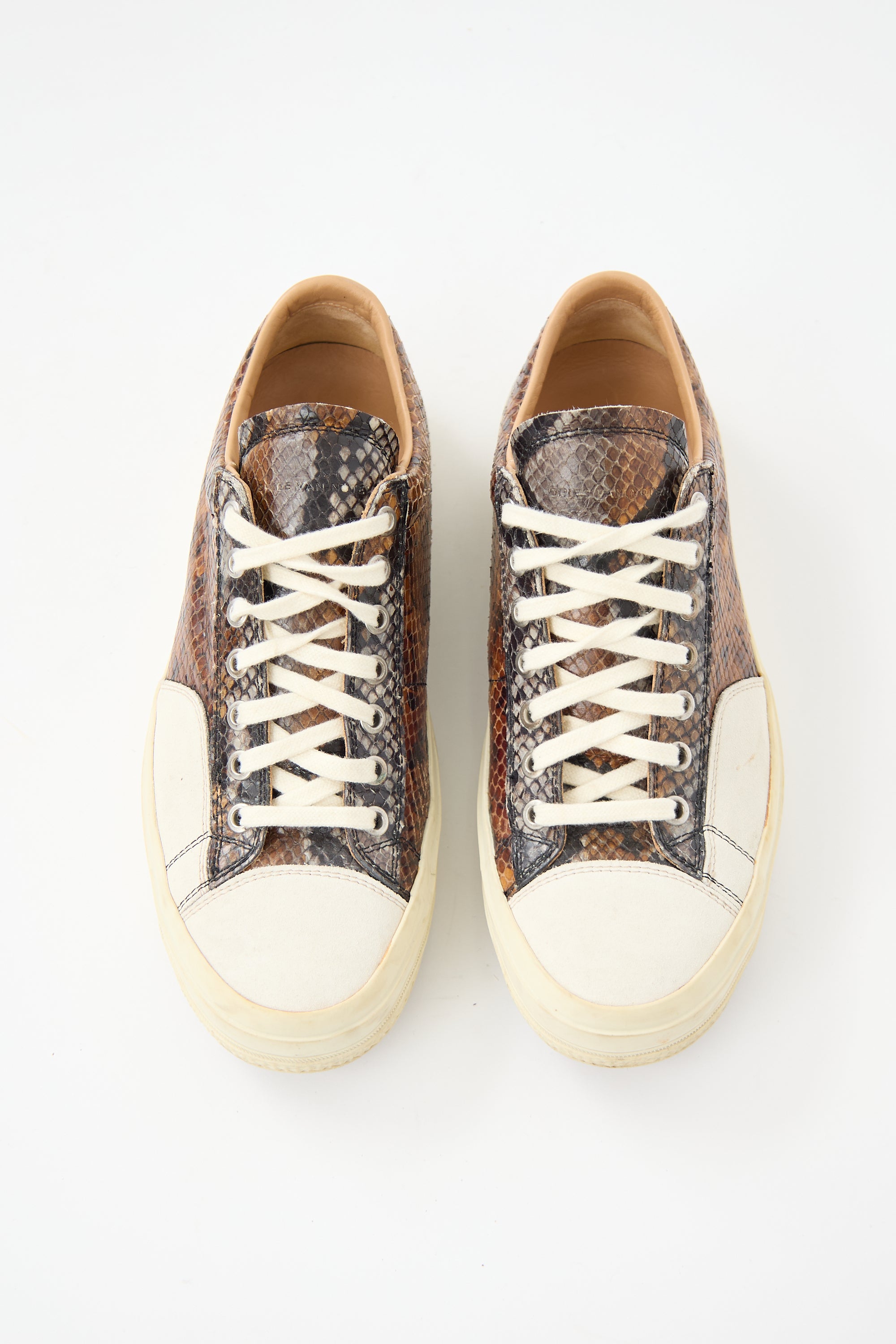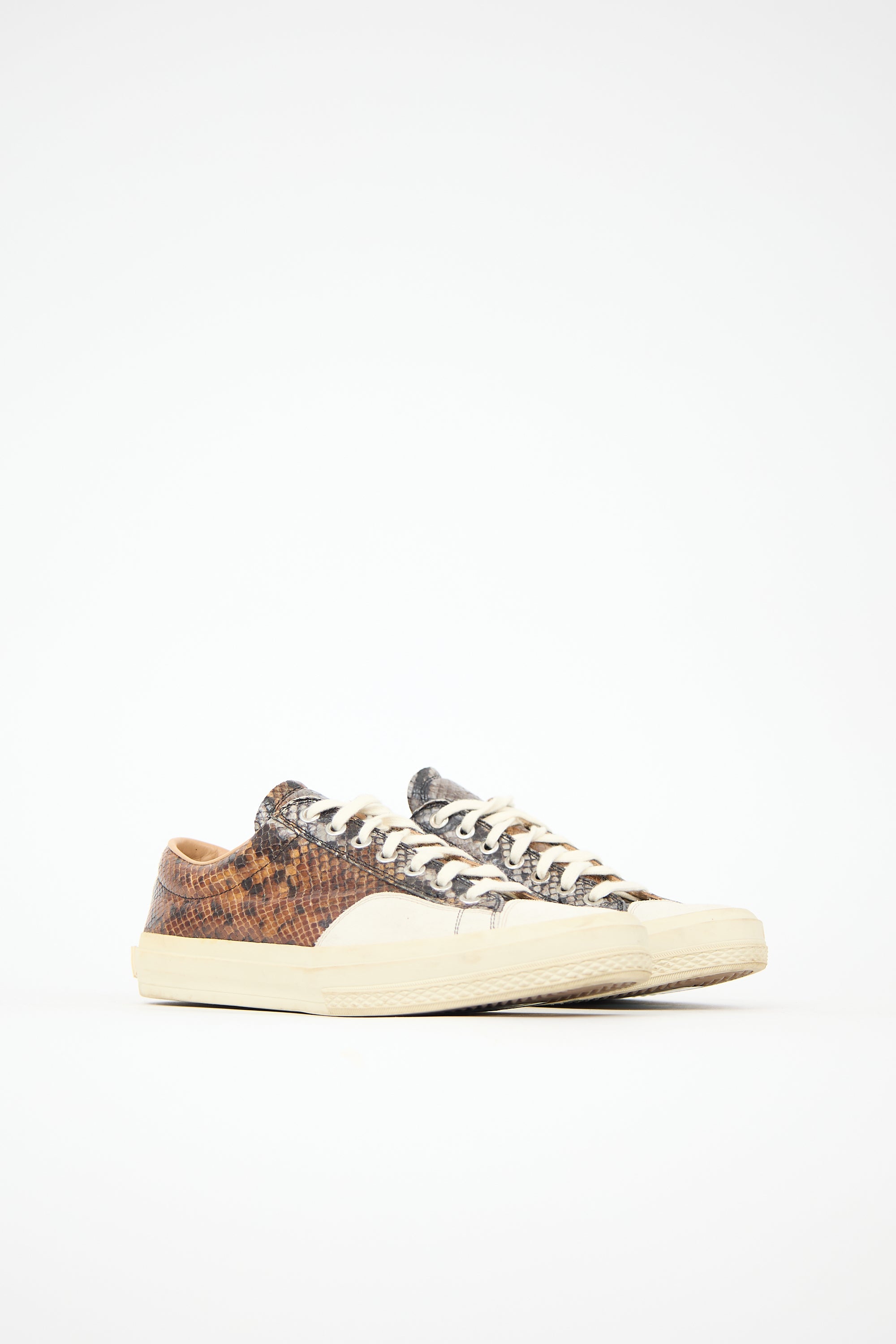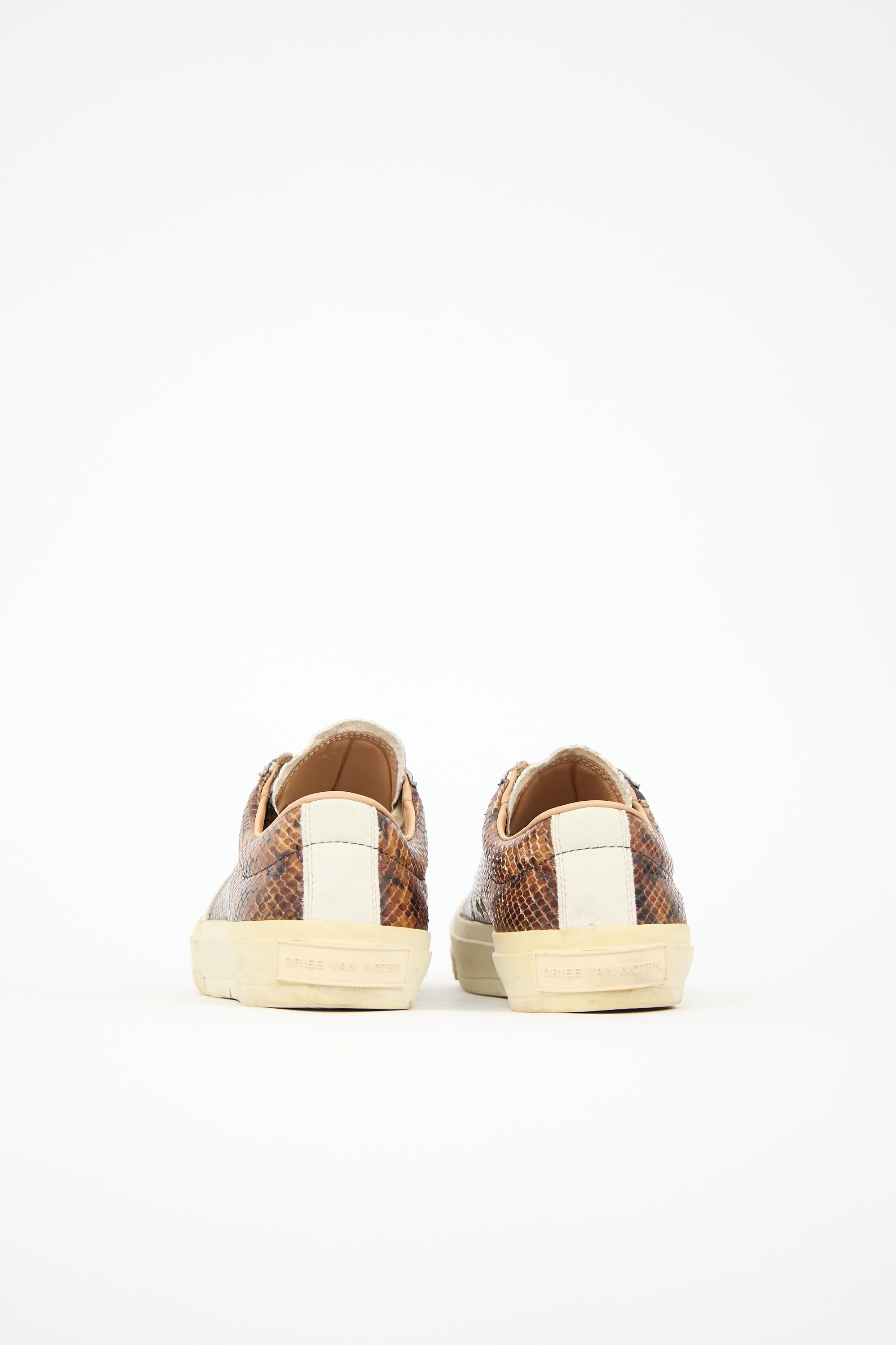 Pre-owned Dries Van Noten brown and multicolour embossed leather sneakers featuring rounded toe, snake print upper, suede panelling, lace up front, debossed logo at tongue, and cream rubber sole with embossed logo at heel.