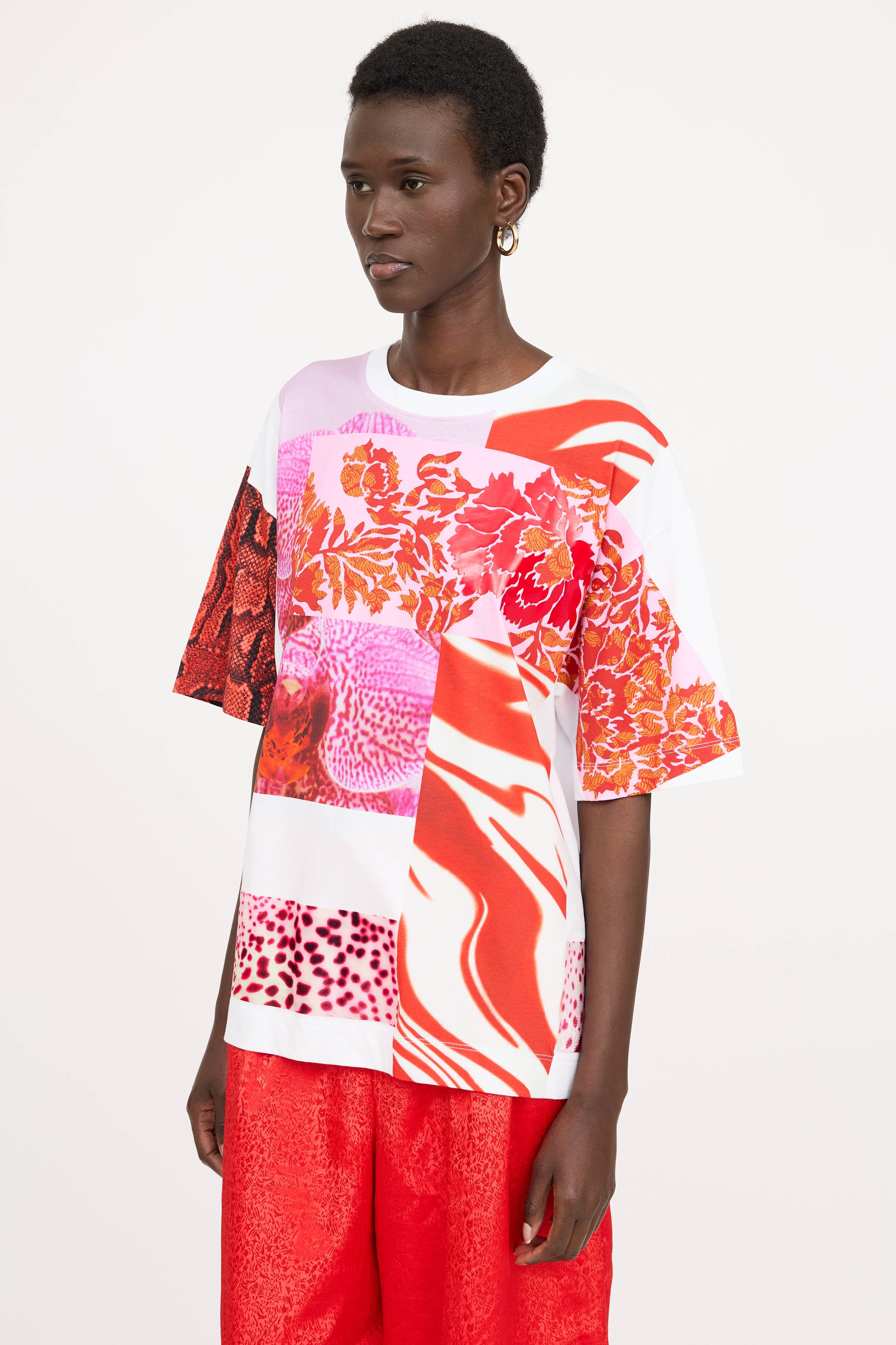 Pre-owned Dries Van Noten white and multicolour Hegels graphic top featuring a crew neckline, short sleeves, and variety of printed graphic throughout.