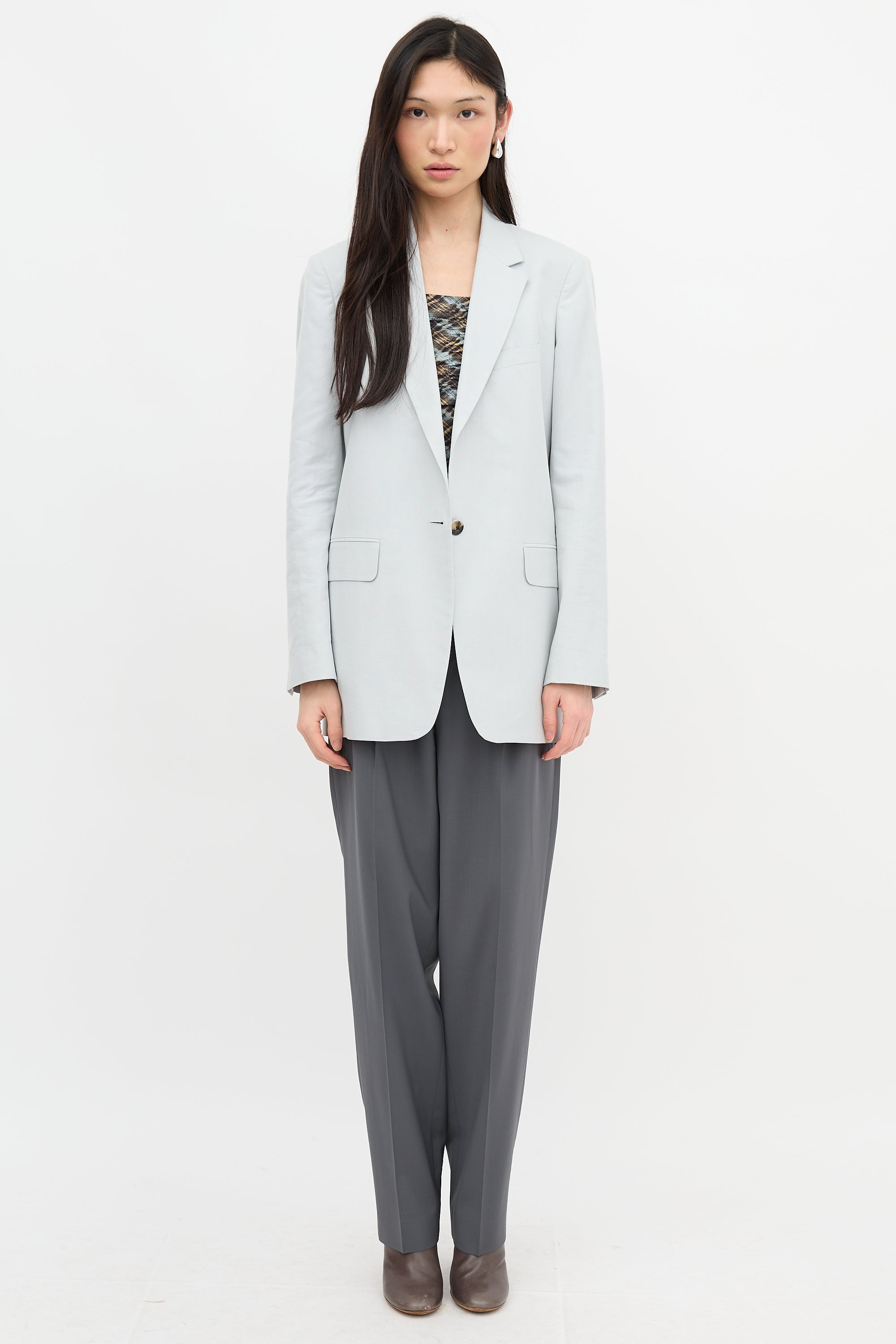 Pre-owned Dries Van Noten grey blazer featuring notched lapel, single front button closure, three front pockets, back vent, padded shoulders, and buttoned cuffs. Lined.
