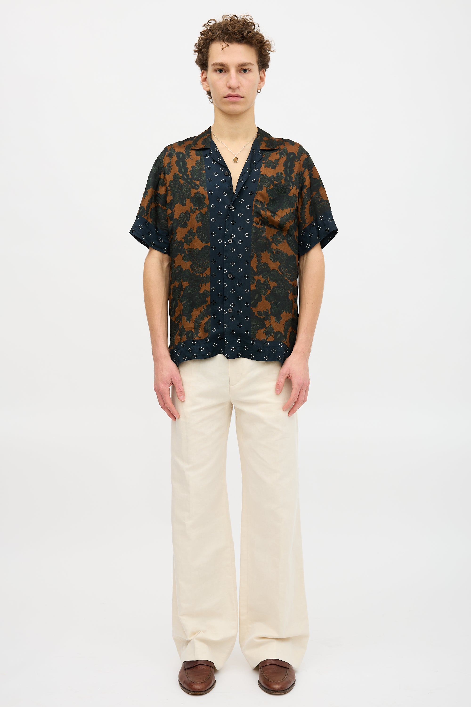 Pre-owned Dries Van Noten brown, green, and navy satin shirt featuring floral print, geometric patterned panels, convertible collar, button up front, patch pocket at left chest, and side vents.