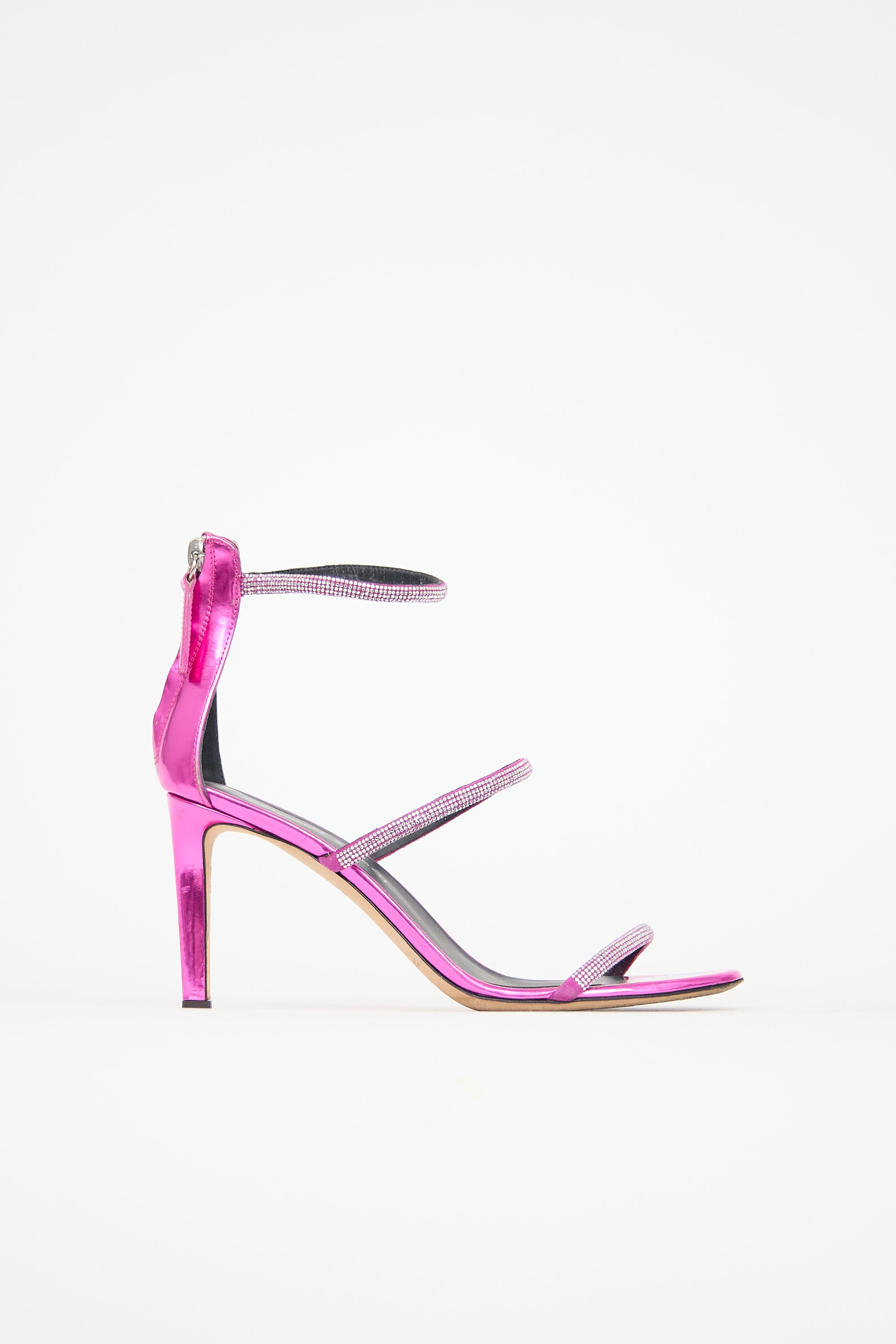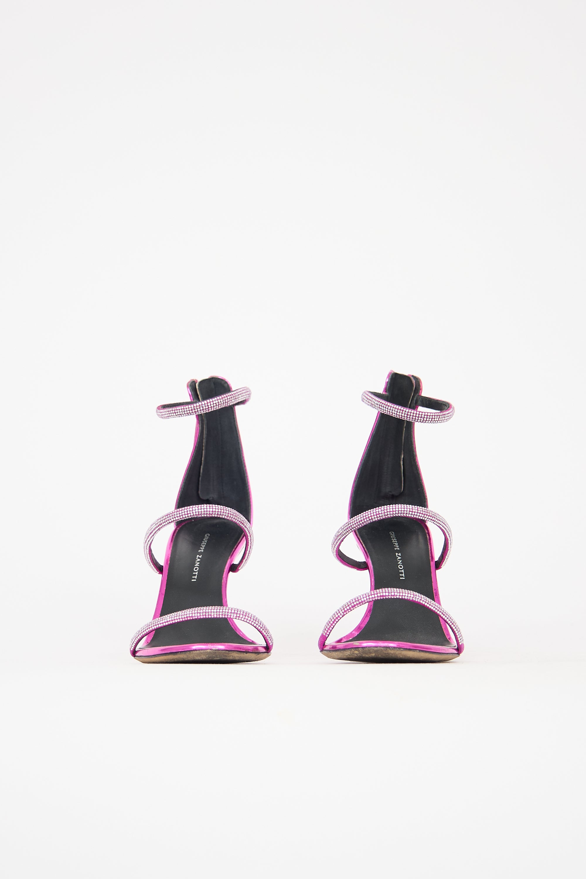 Pre-owned Giuseppe Zanotti pink metallic leather Kanda sandals featuring a rounded open toe, three straps with crystal embellishments, back zip closure, and a covered heel. Comes with original dust bag and box.