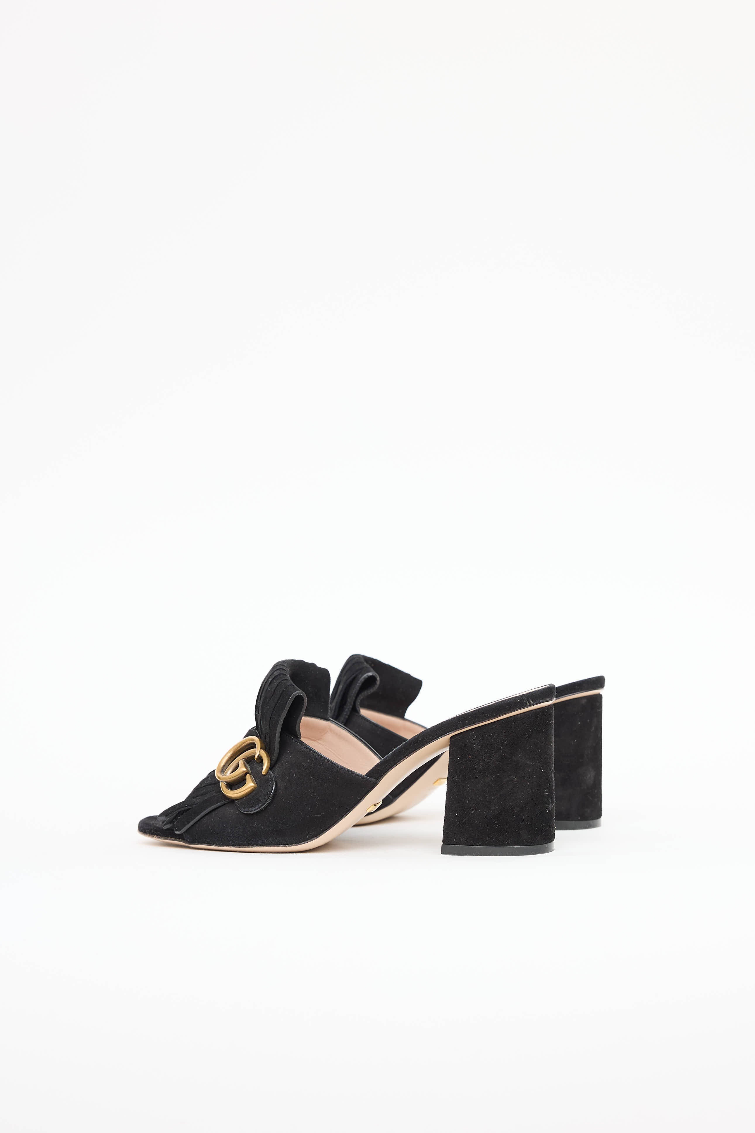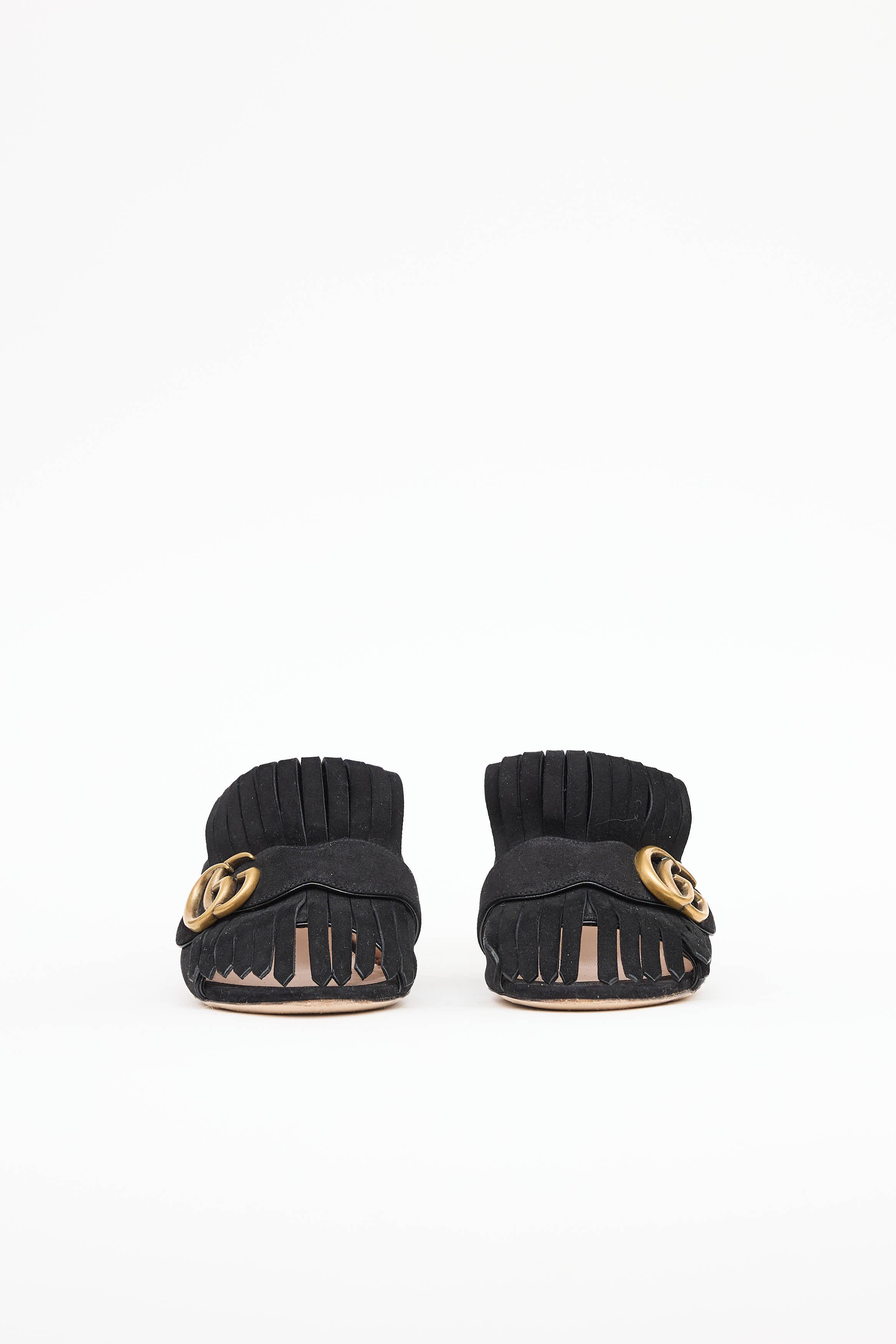 Pre-owned Gucci black suede Marmont mules featuring round toe, fringe upper, strap with gold tone GG hardware and covered block heel.