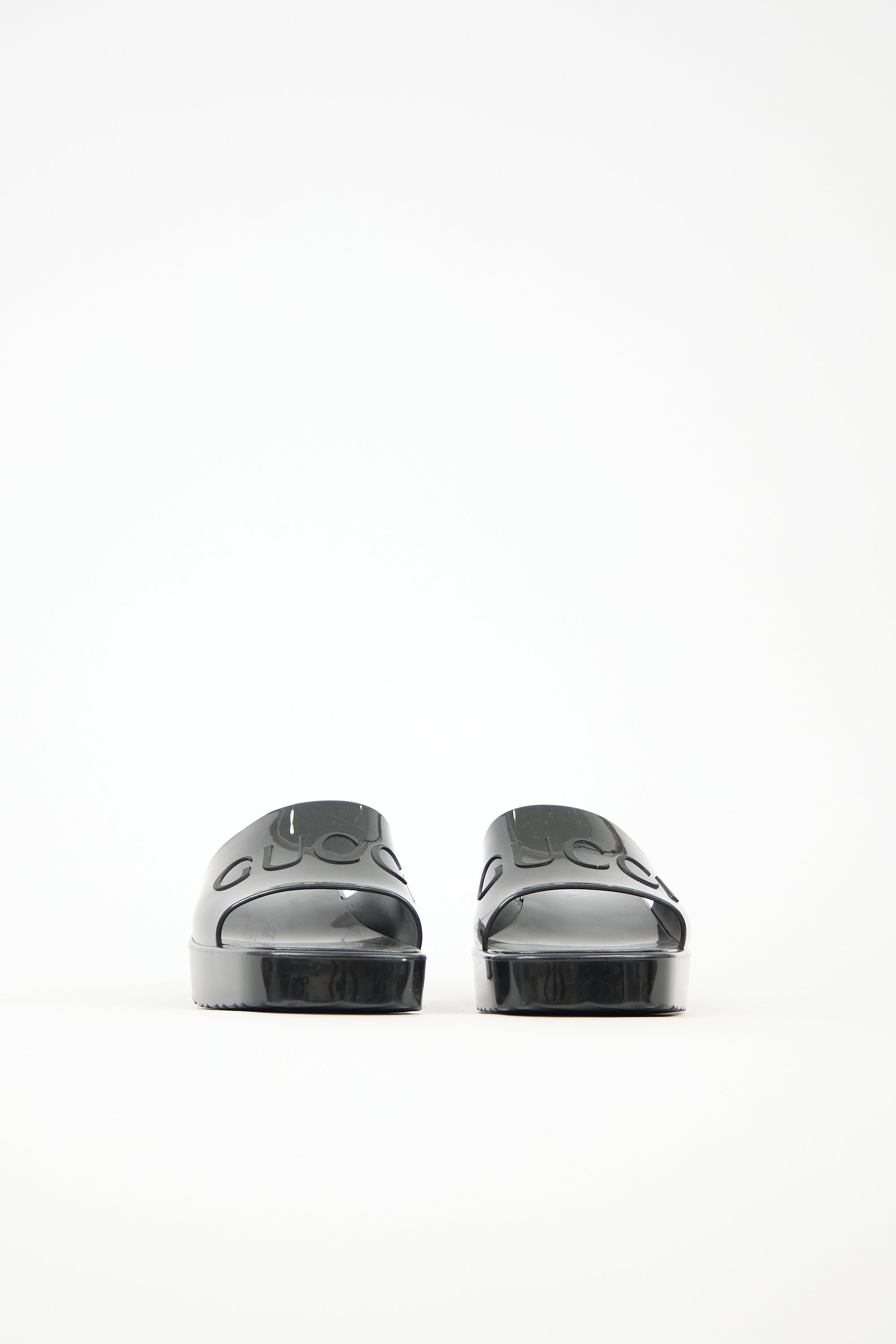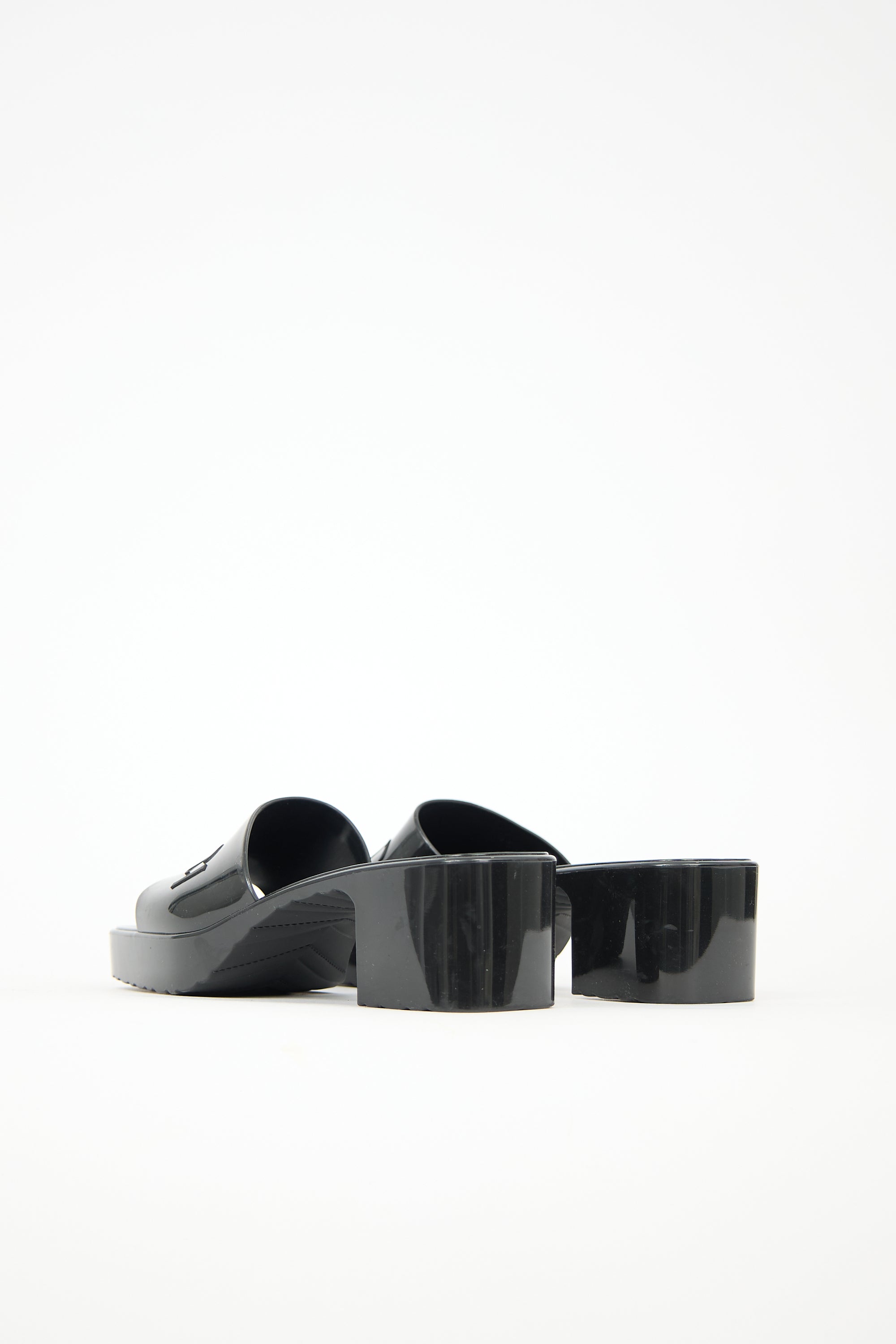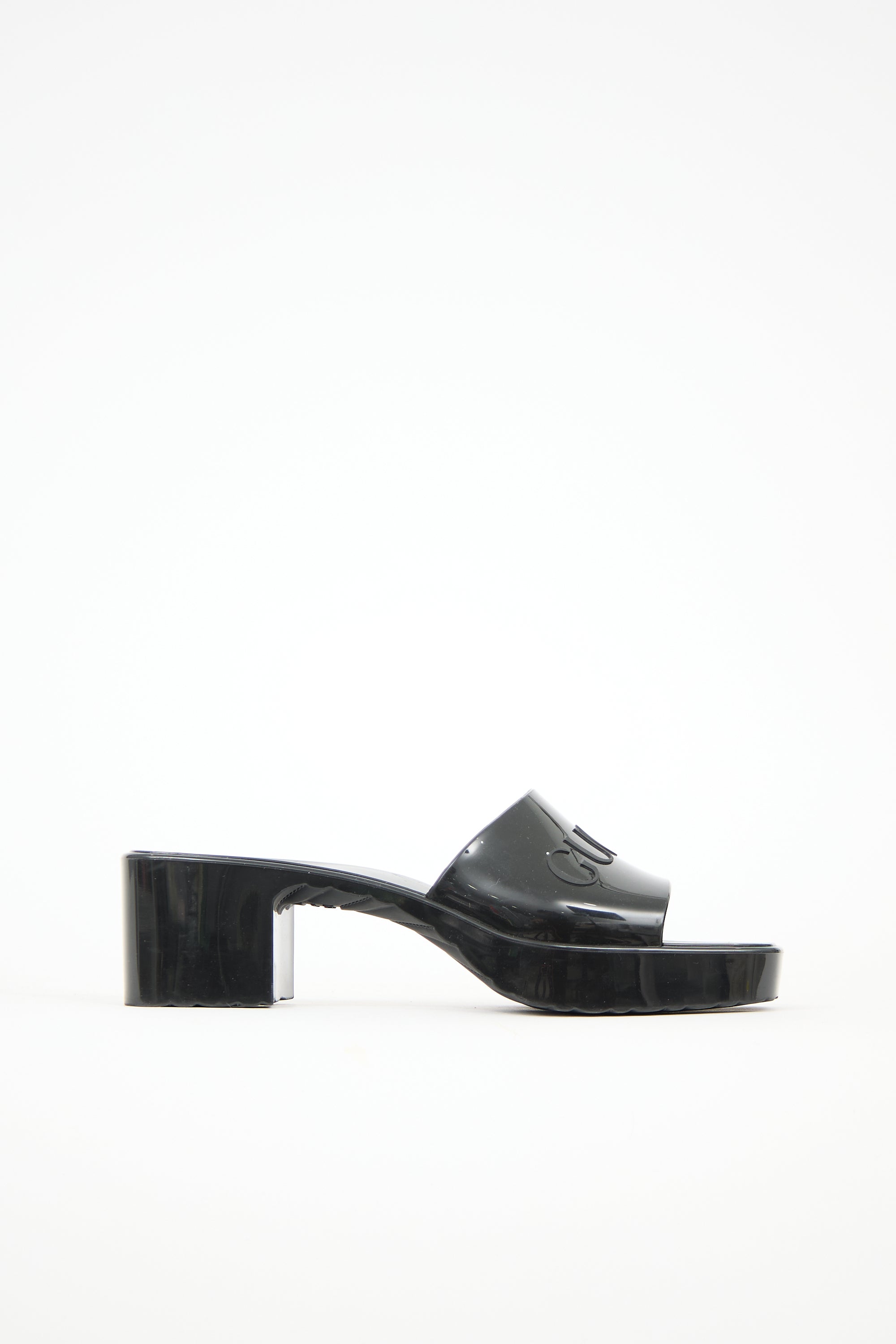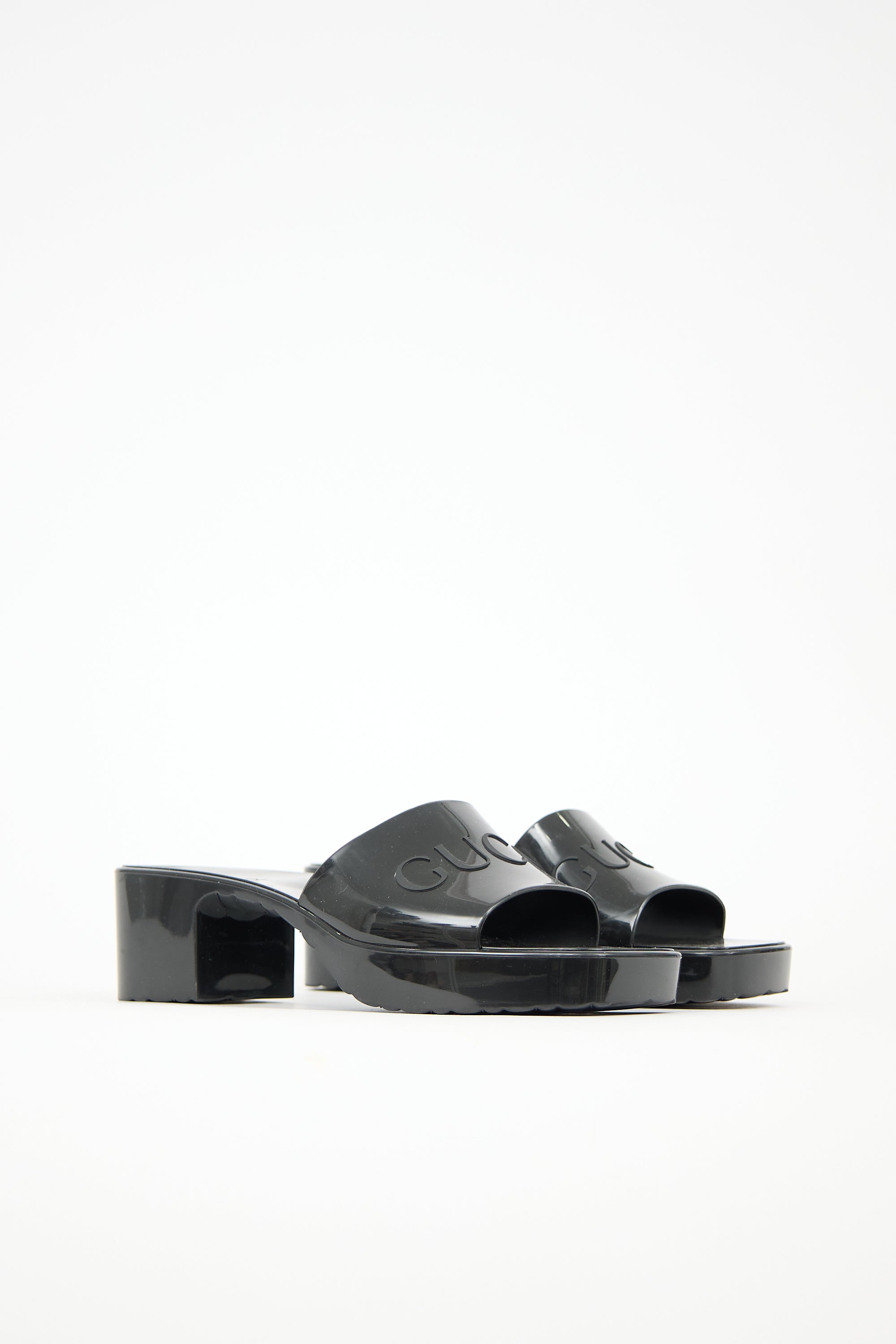 Pre-owned Gucci black rubber mules featuring square toe, embossed logo at vamp, and block heel.